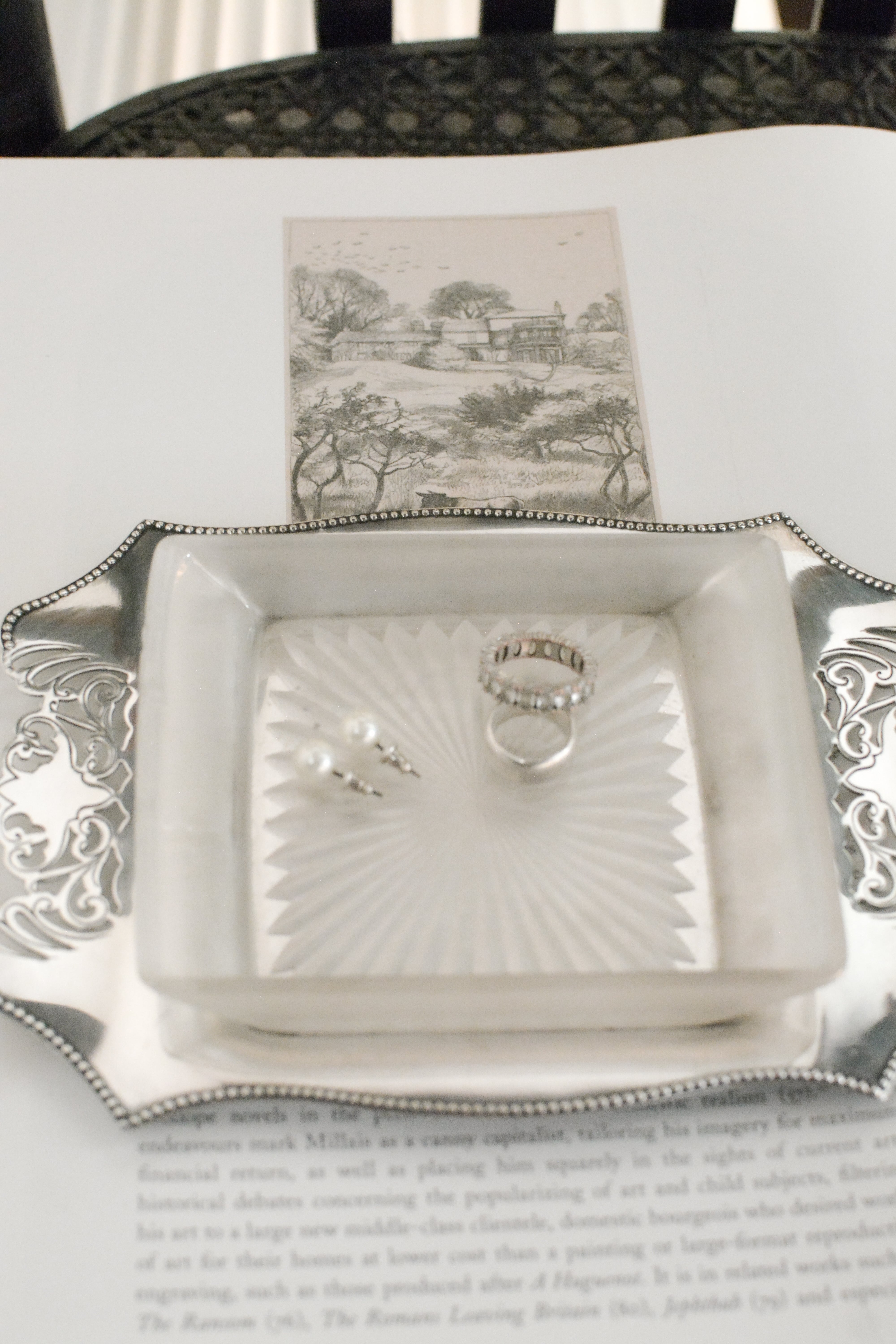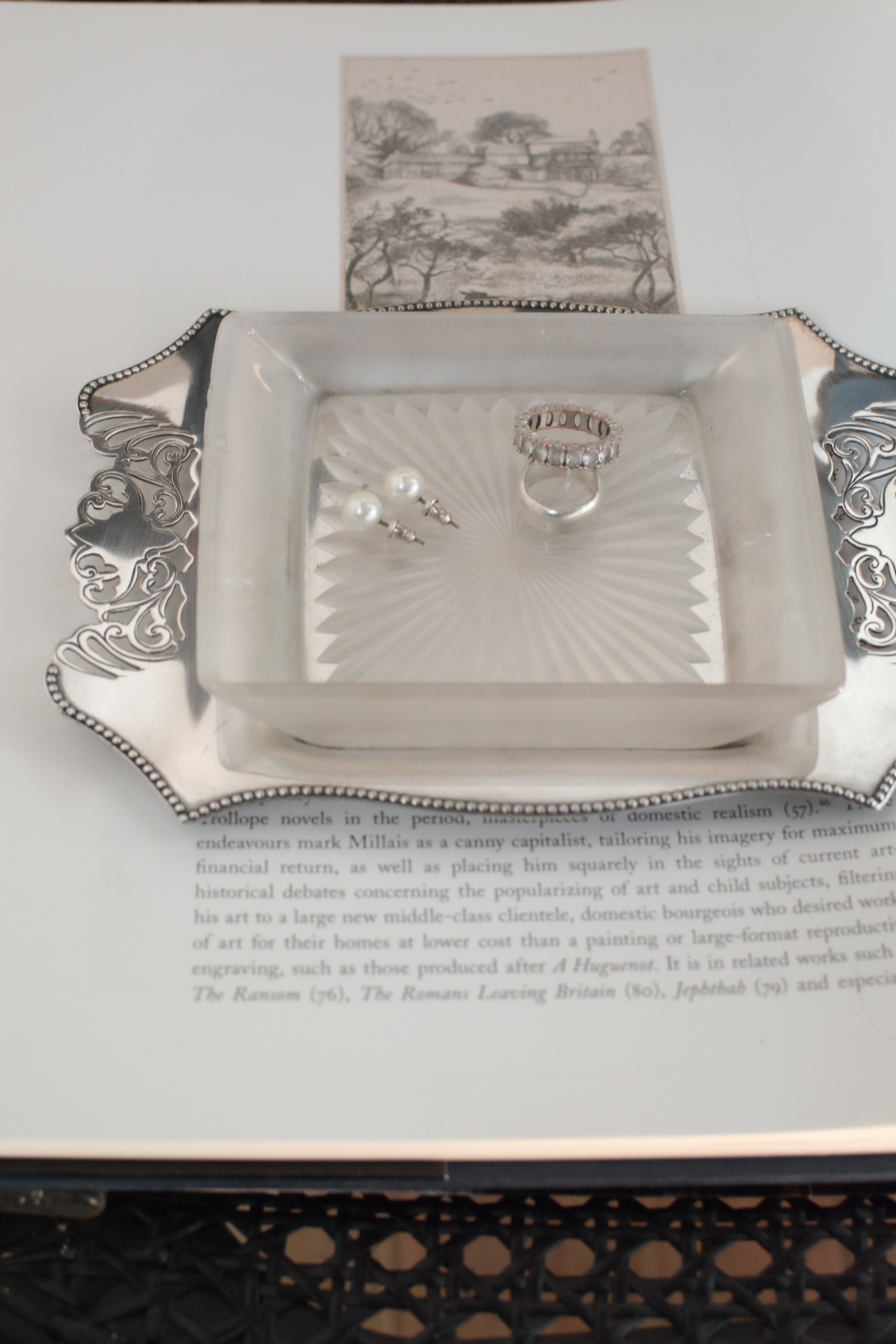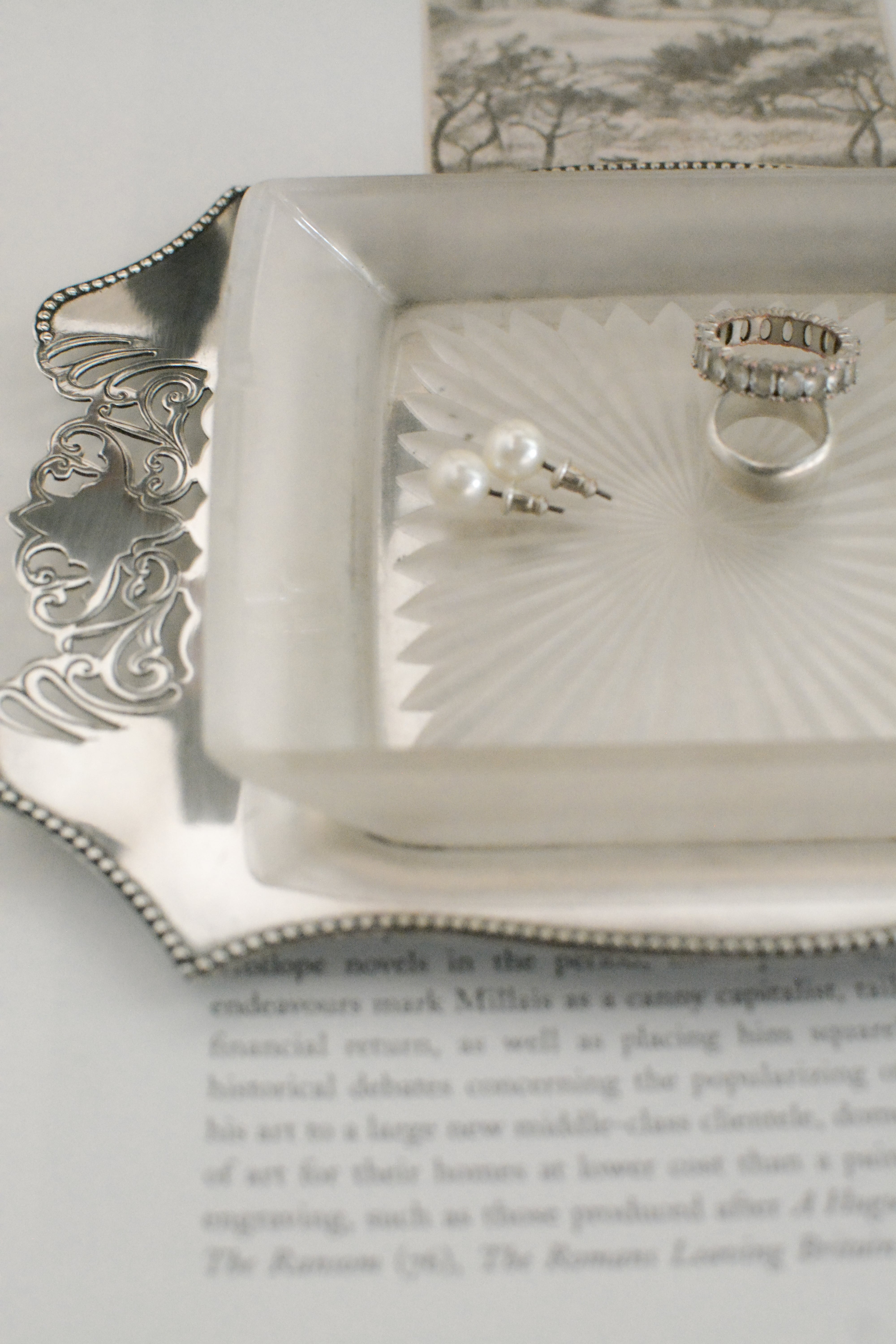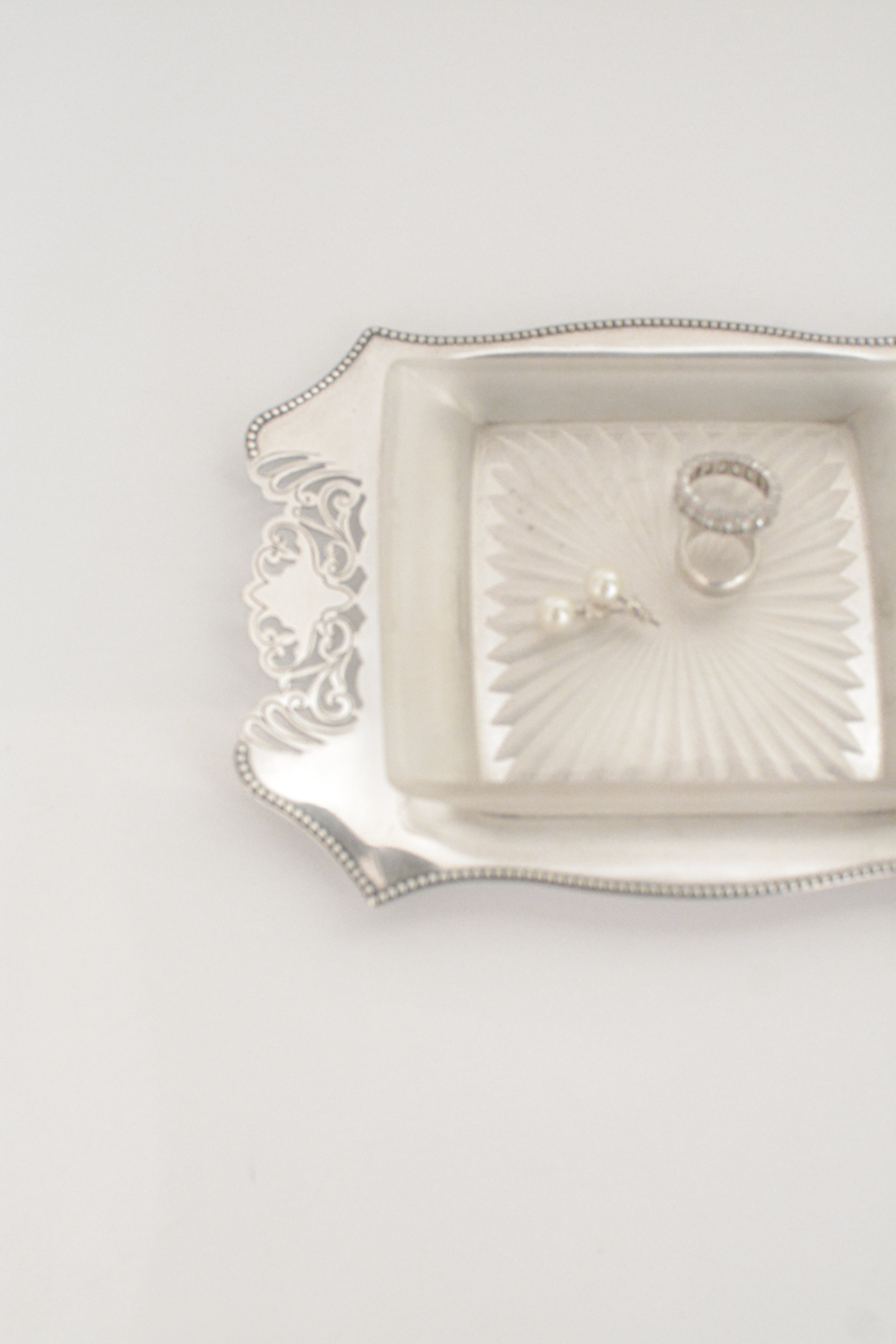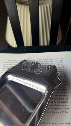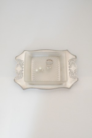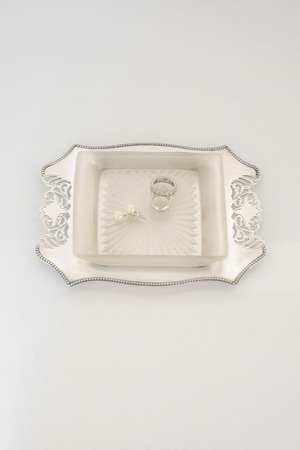 透かし彫りのシルバープレートに、光を受けて静かにきらめくカットガラス。ベースには 「HF&Co S EPNS A1」 の刻印、縁に連なる繊細な装飾が美しいですね。中央に収められたガラスディッシュには、放射状に広がるカットが施され、その一角に見られる小さな欠けは、長い年月を経てきた証のように、光の表情にわずかな揺らぎを添えています。バターやジャムをのせる食卓の道具として使われていたかと思いますが、指輪やピアスを休ませる場所としても、凛とした存在感を放つひと品。時を経たからこそ宿る、時の気配と奥行きをお楽しみいただけます。全体として、経年を重ねたヴィンテージならではの良好なコンディションです。