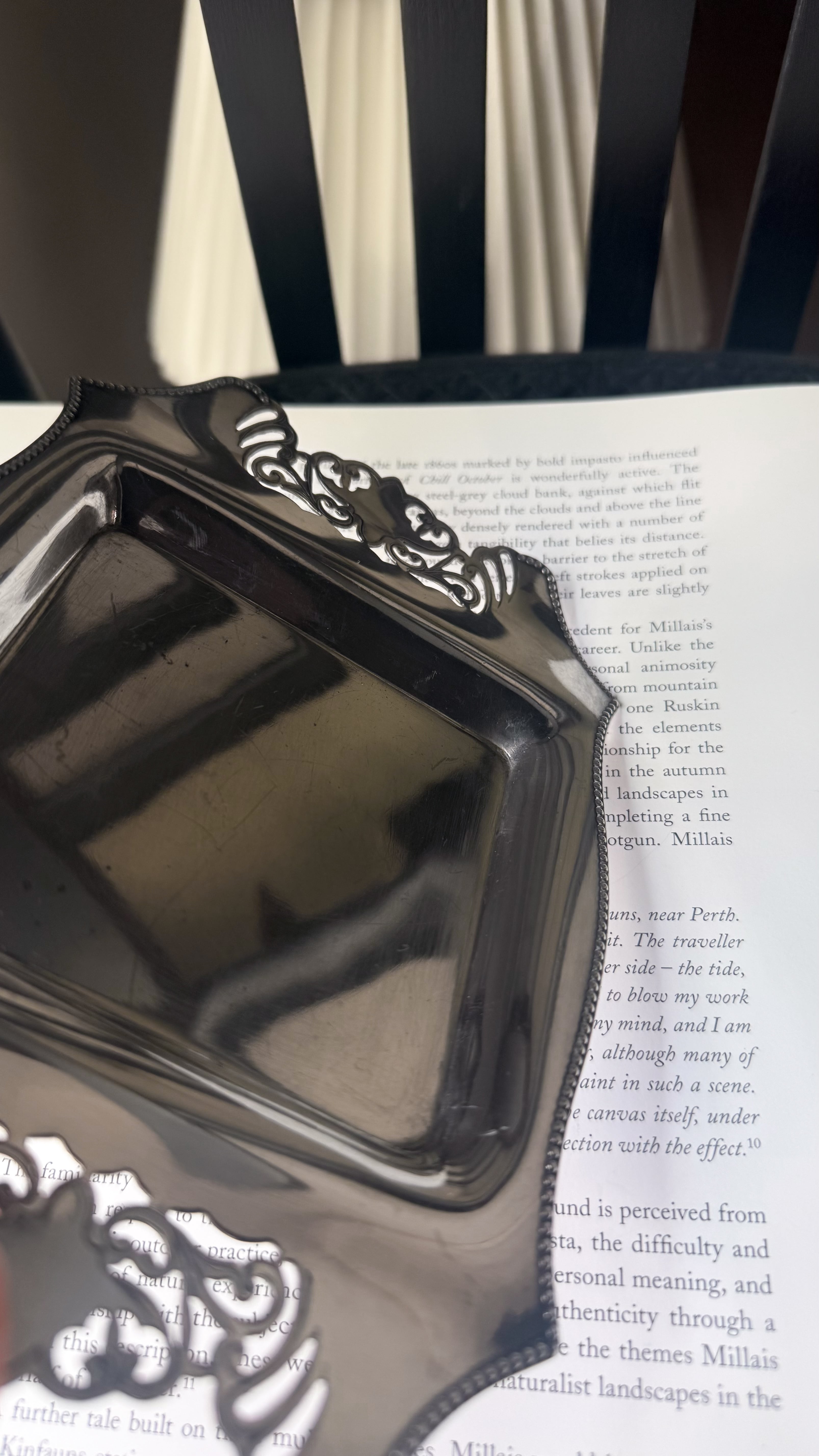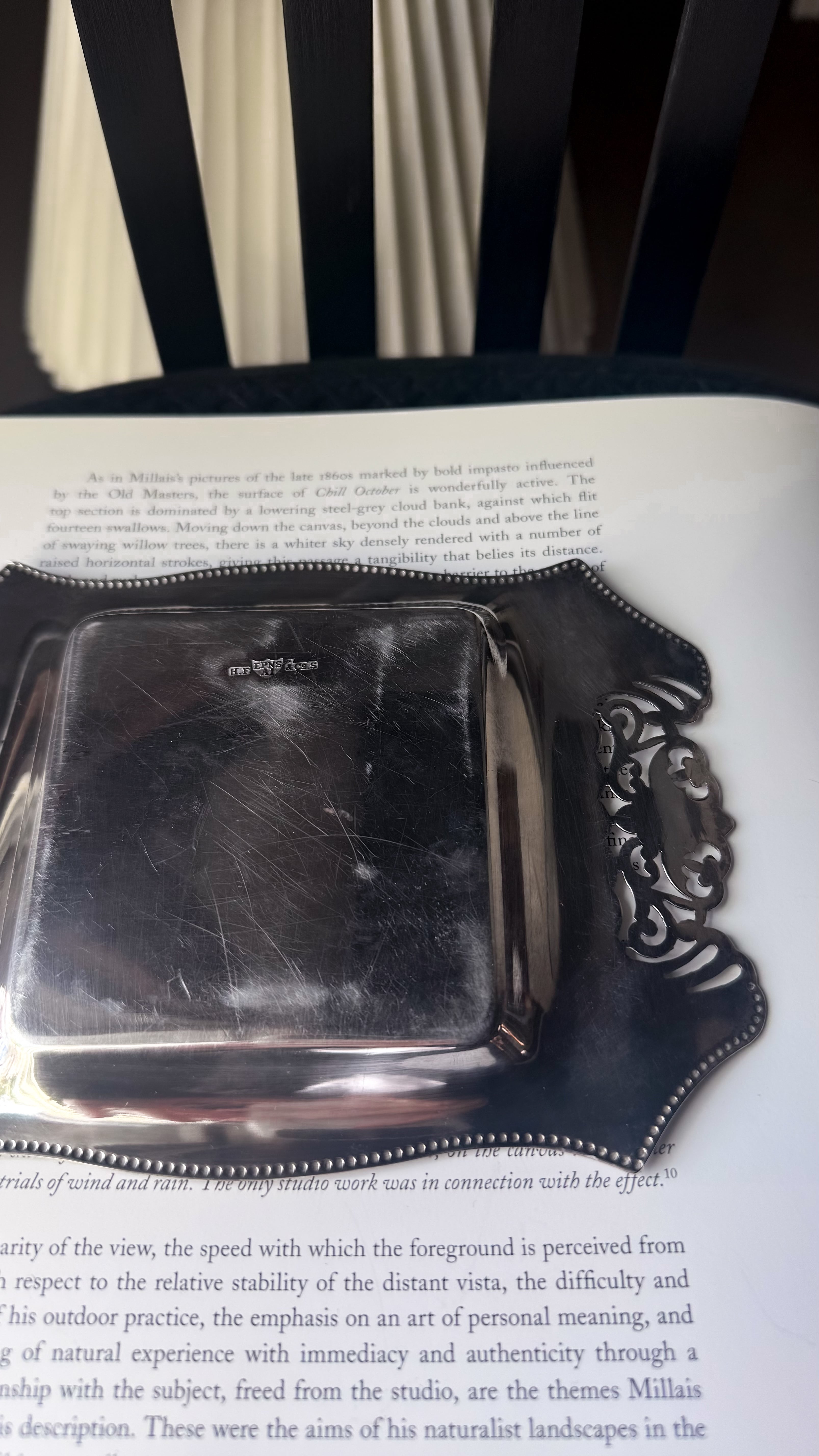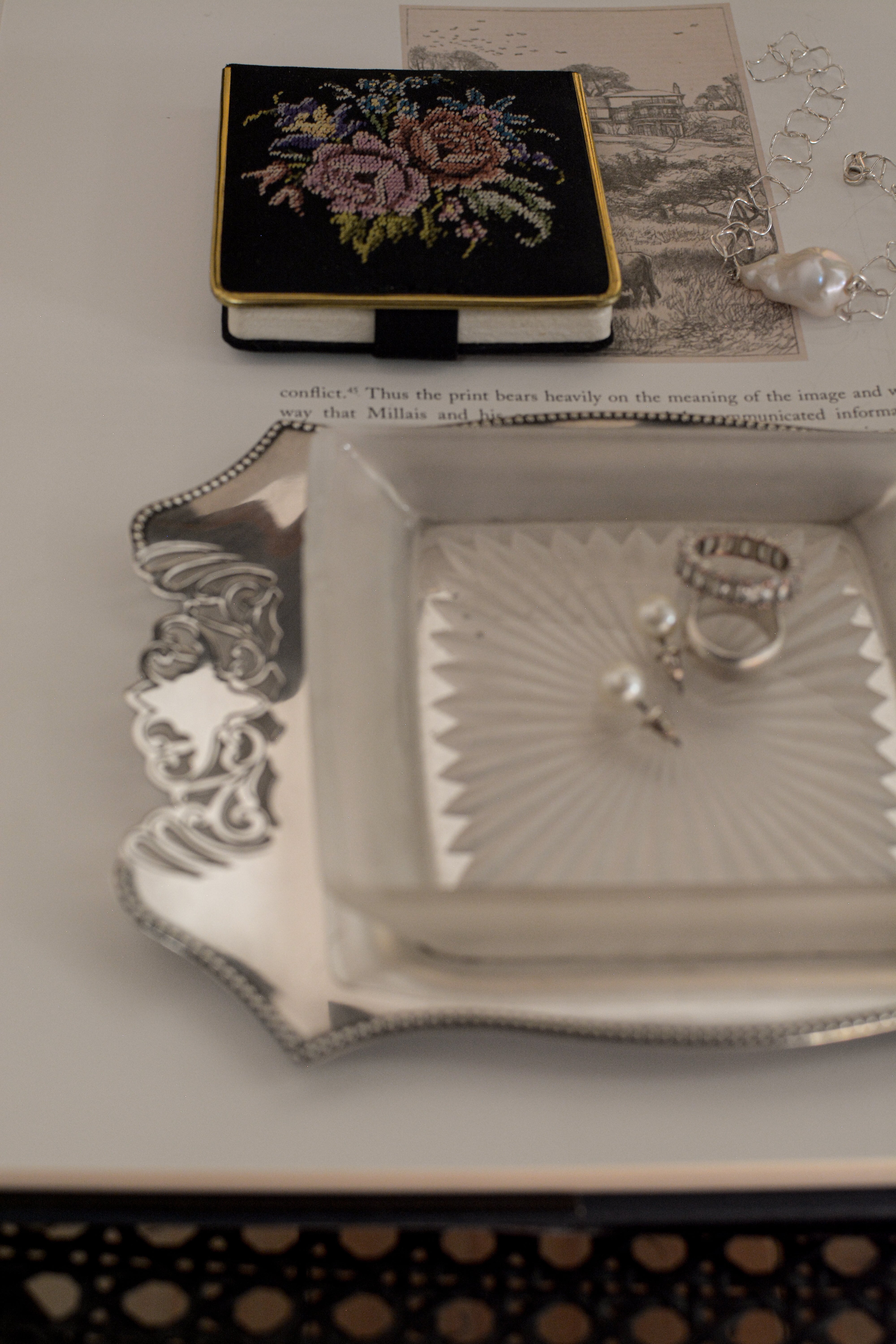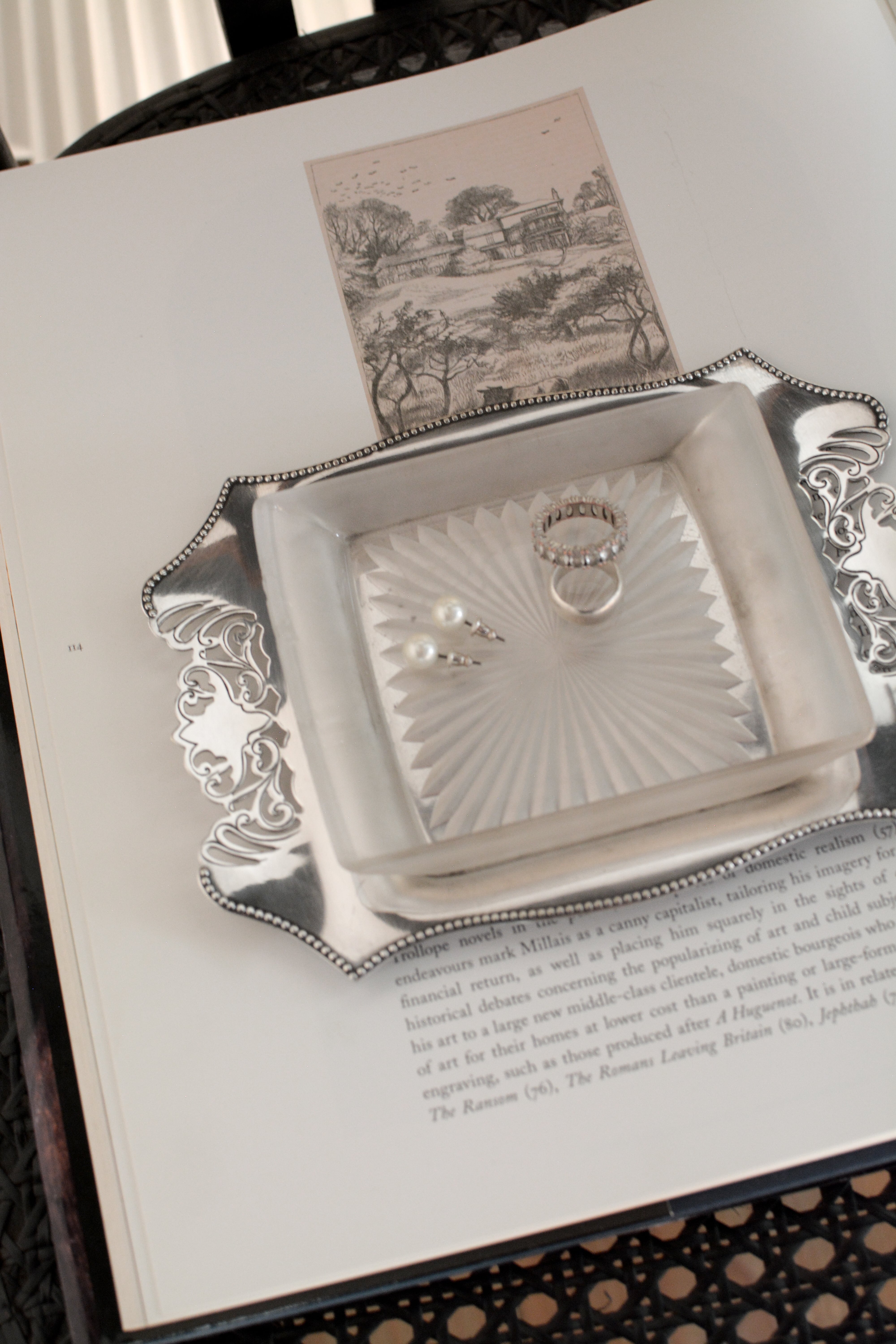 透かし彫りのシルバープレートに、光を受けて静かにきらめくカットガラス。ベースには 「HF&Co S EPNS A1」 の刻印、縁に連なる繊細な装飾が美しいですね。中央に収められたガラスディッシュには、放射状に広がるカットが施され、その一角に見られる小さな欠けは、長い年月を経てきた証のように、光の表情にわずかな揺らぎを添えています。バターやジャムをのせる食卓の道具として使われていたかと思いますが、指輪やピアスを休ませる場所としても、凛とした存在感を放つひと品。時を経たからこそ宿る、時の気配と奥行きをお楽しみいただけます。全体として、経年を重ねたヴィンテージならではの良好なコンディションです。