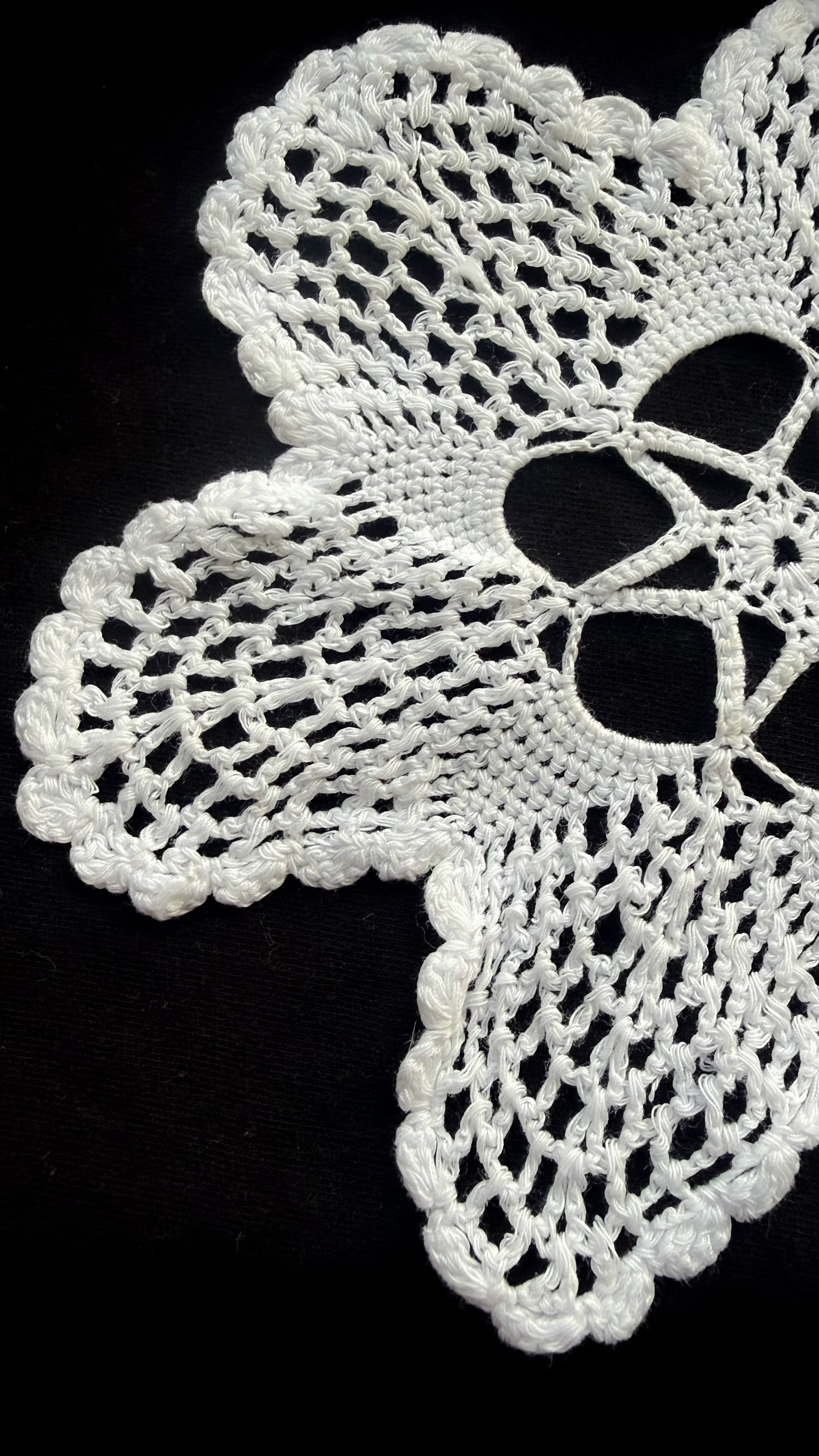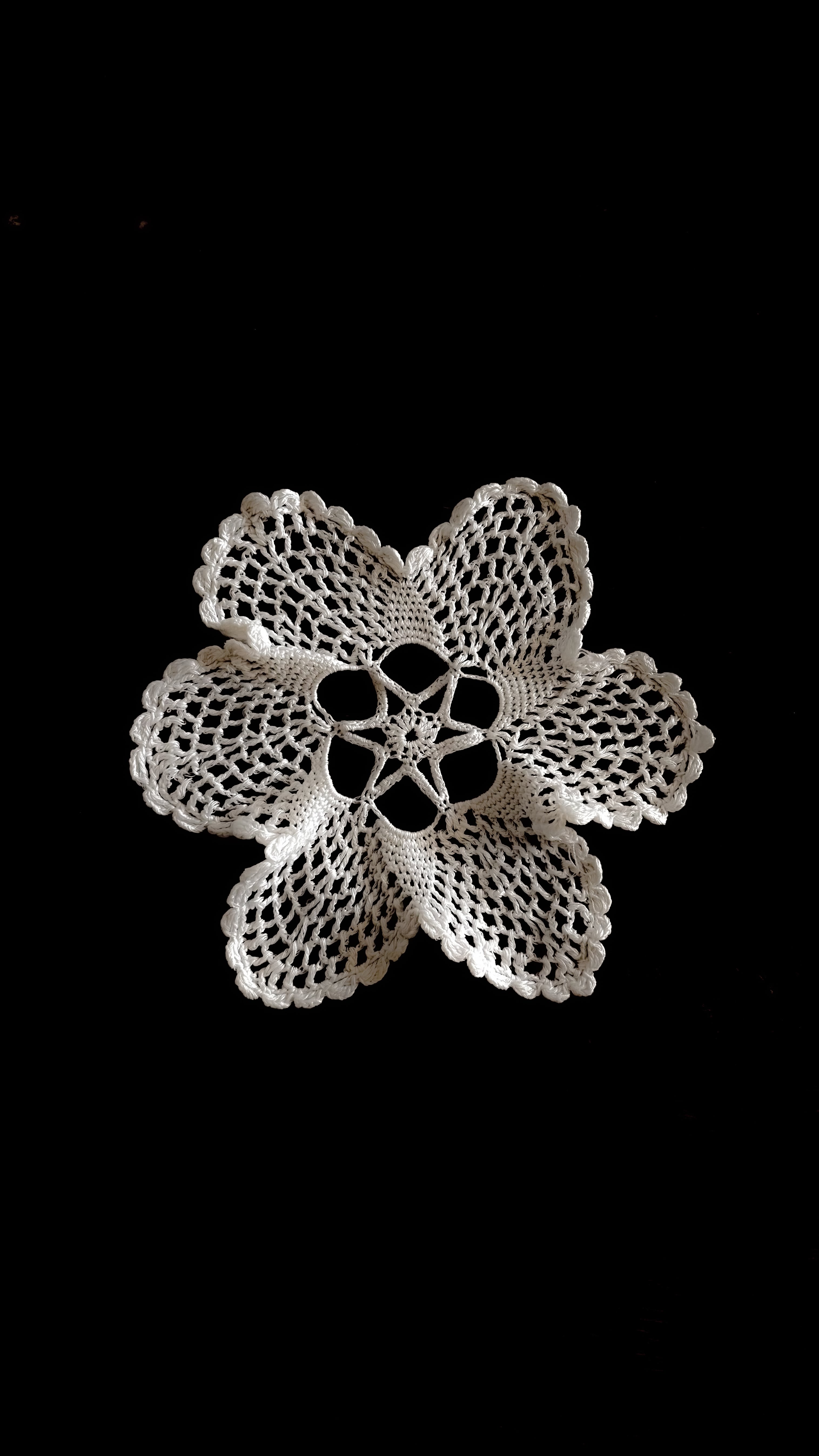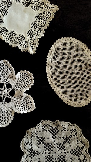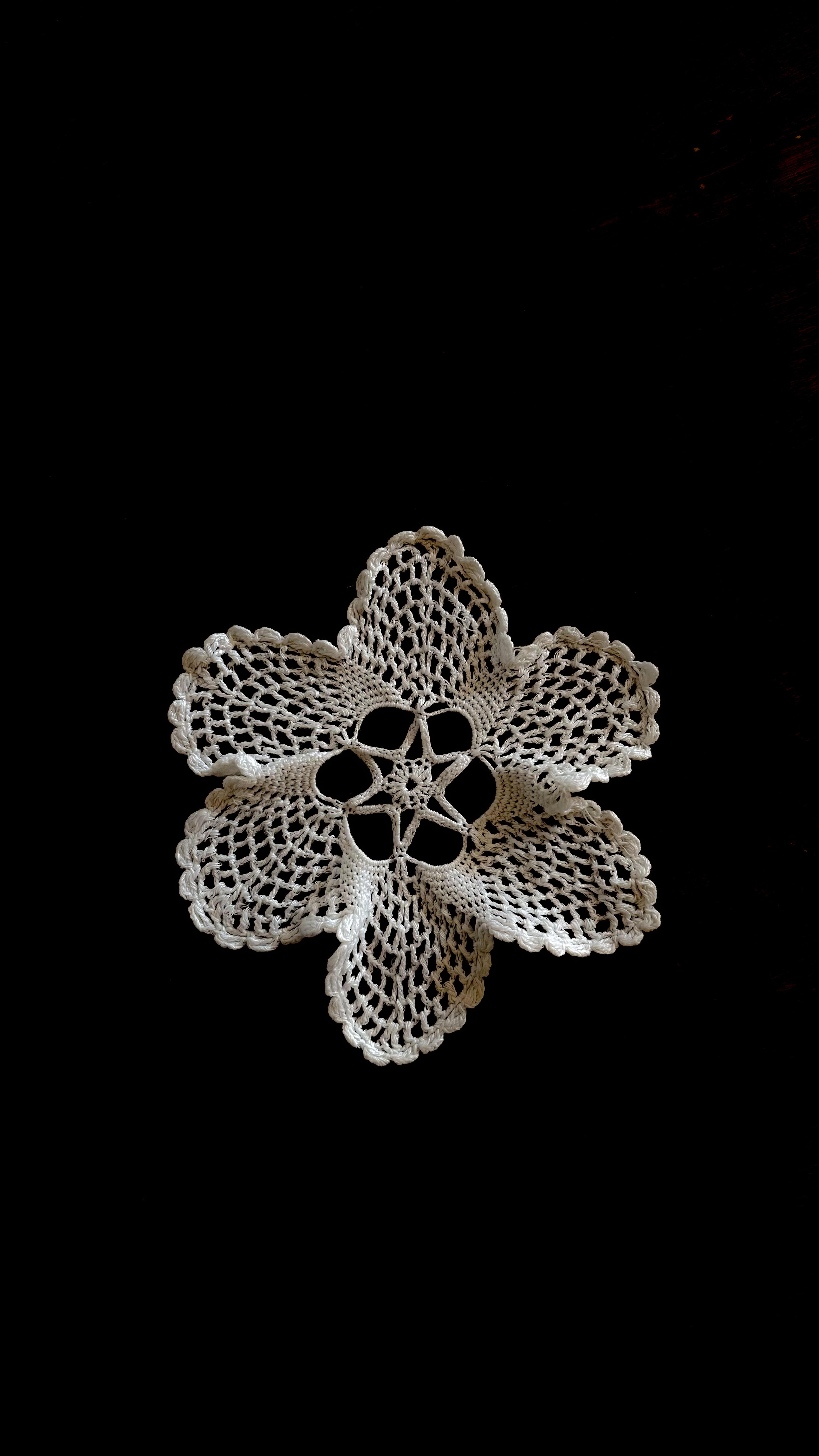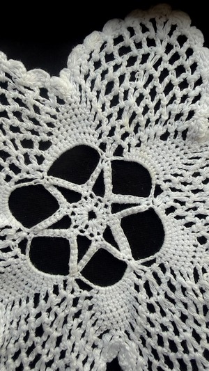 繊細な透かし模様が美しい、イギリスヴィンテージのフィレレースドイリー。中央から花がひらくように広がるデザインは、規則正しさの中にやわらかな表情があり、温もりを感じさせます。格子状の編み地と、花びらの縁を縁取るスカラップが、光を受けて軽やかな陰影を生み出し、一色でありながら、編みの密度やリズムによって奥行きが感じられる一枚です。花器やキャンドルの下に敷いたり、小さなトレイのアクセントとして使ったり。年月を重ねた布ものならではの、やさしい風合いをお楽しみいただけます。ヴィンテージ品のため、多少の歪みや経年による表情の変化が見られる場合がありますが、それもまた、このドイリーが歩んできた時間の一部としてお楽しみください。