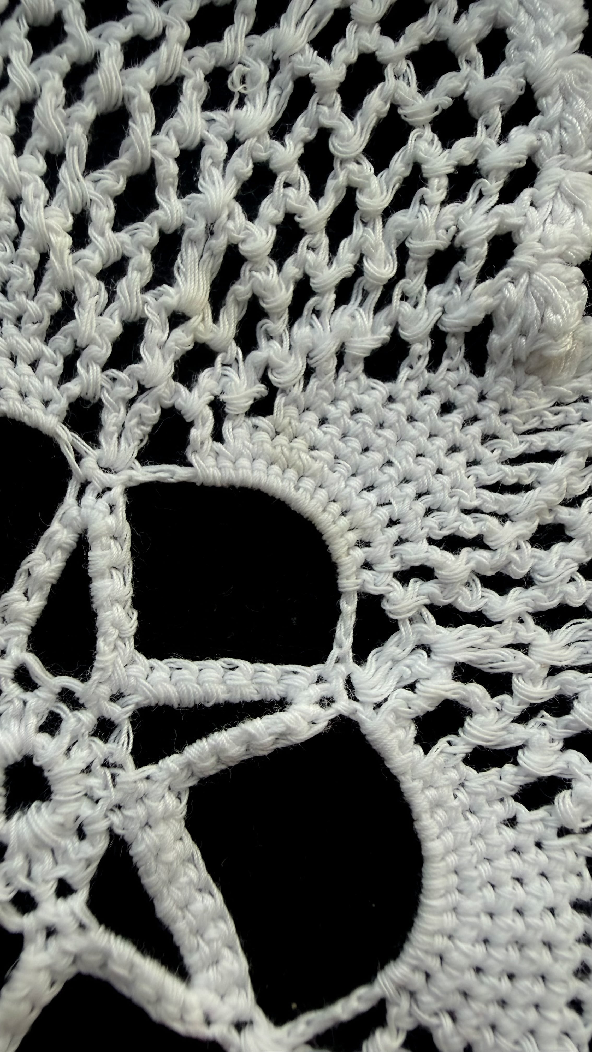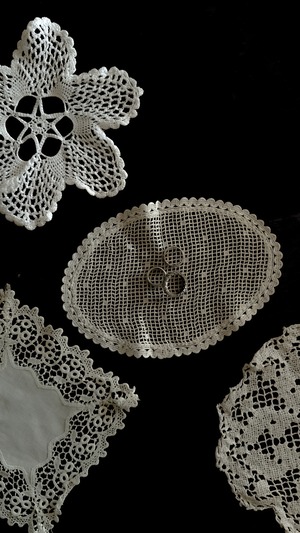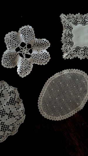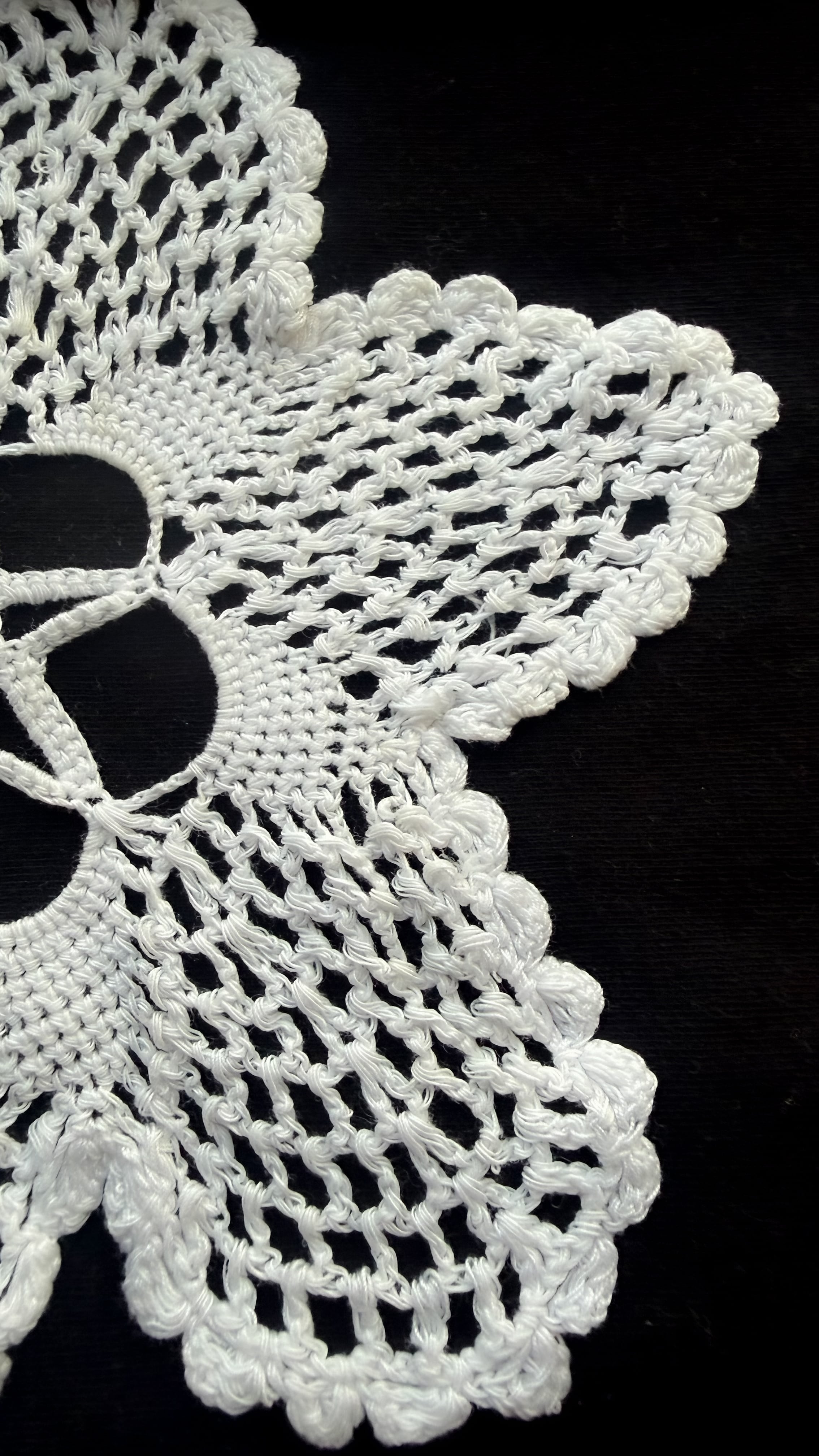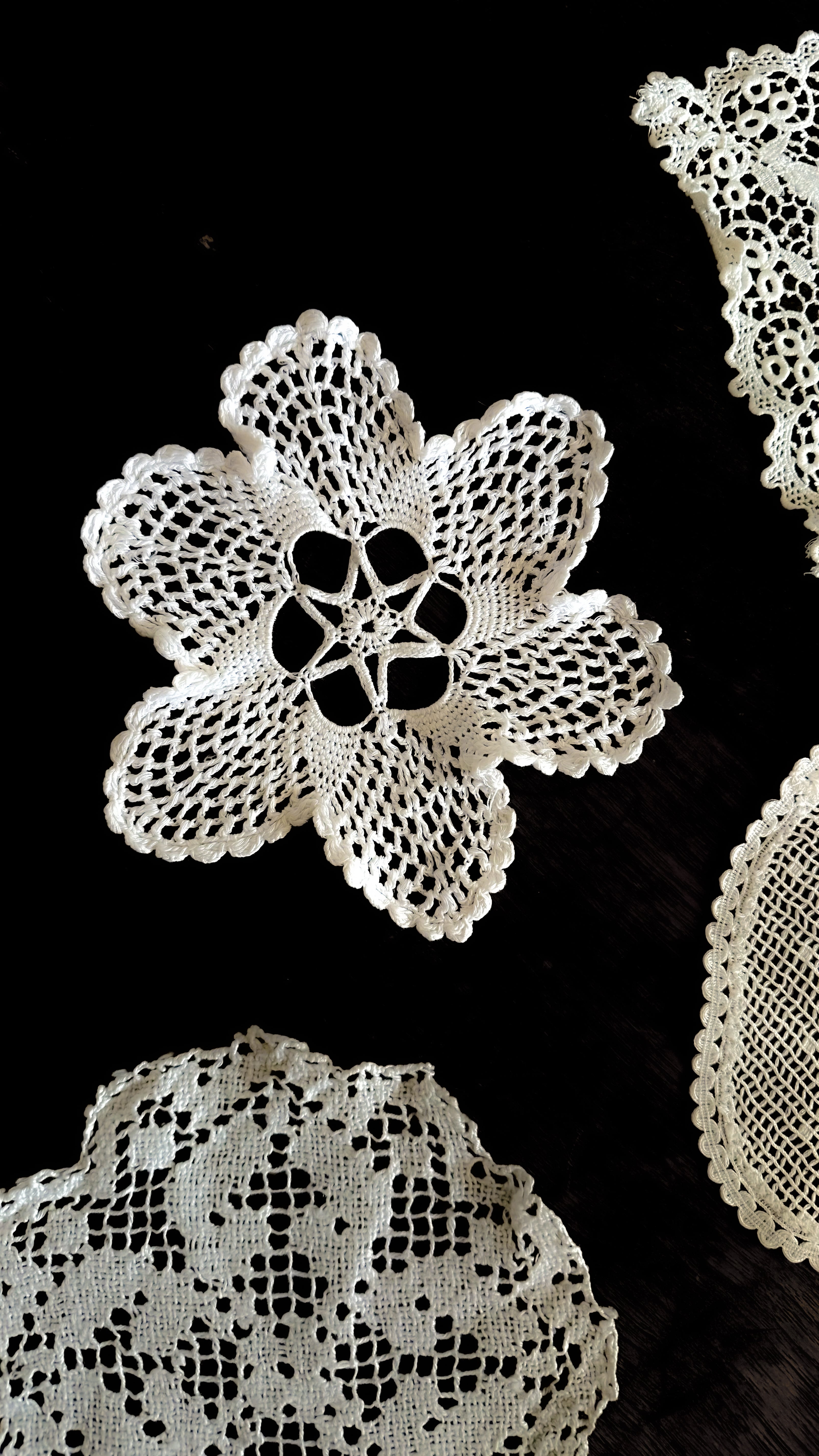 繊細な透かし模様が美しい、イギリスヴィンテージのフィレレースドイリー。中央から花がひらくように広がるデザインは、規則正しさの中にやわらかな表情があり、温もりを感じさせます。格子状の編み地と、花びらの縁を縁取るスカラップが、光を受けて軽やかな陰影を生み出し、一色でありながら、編みの密度やリズムによって奥行きが感じられる一枚です。花器やキャンドルの下に敷いたり、小さなトレイのアクセントとして使ったり。年月を重ねた布ものならではの、やさしい風合いをお楽しみいただけます。ヴィンテージ品のため、多少の歪みや経年による表情の変化が見られる場合がありますが、それもまた、このドイリーが歩んできた時間の一部としてお楽しみください。
