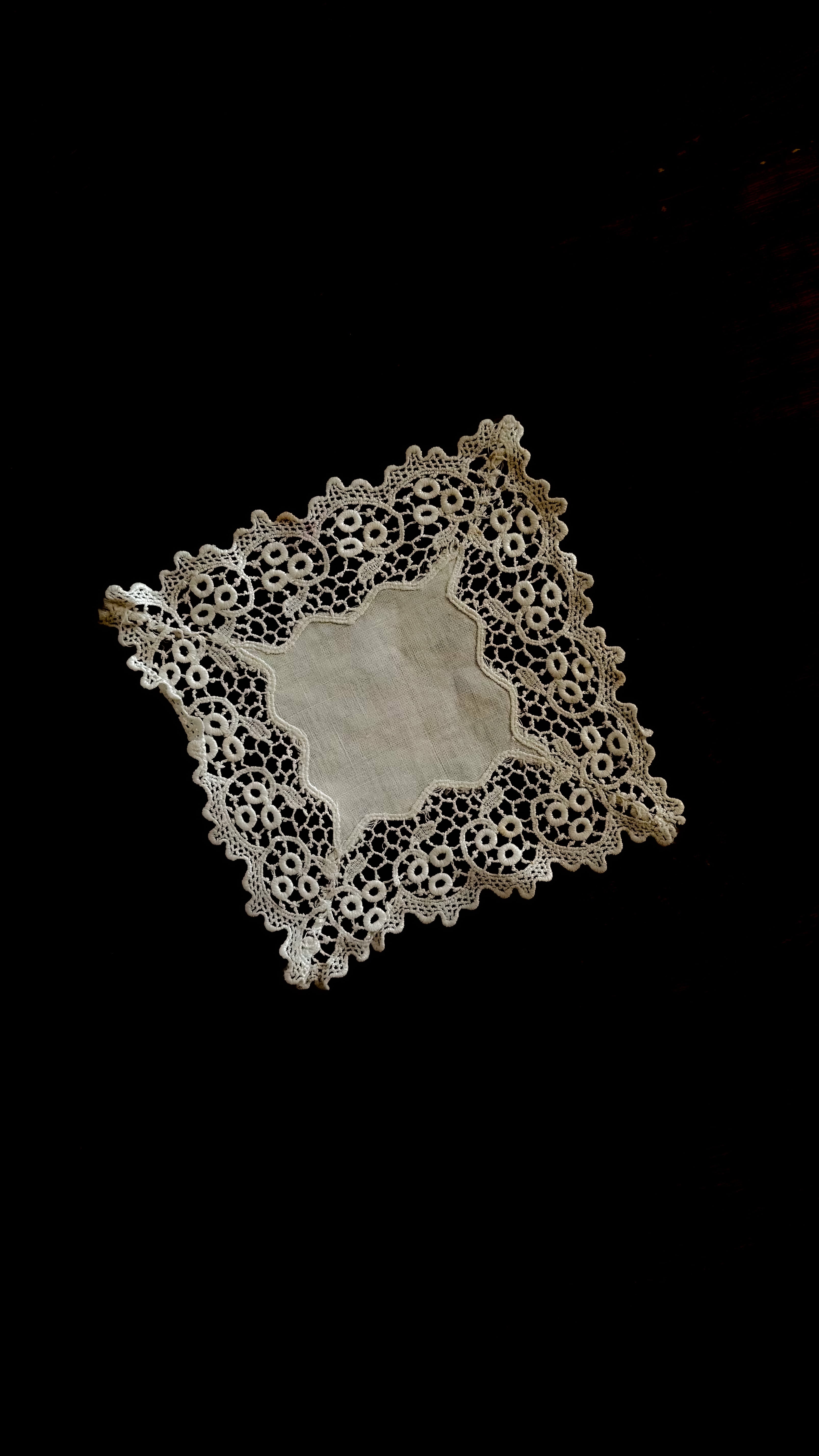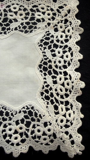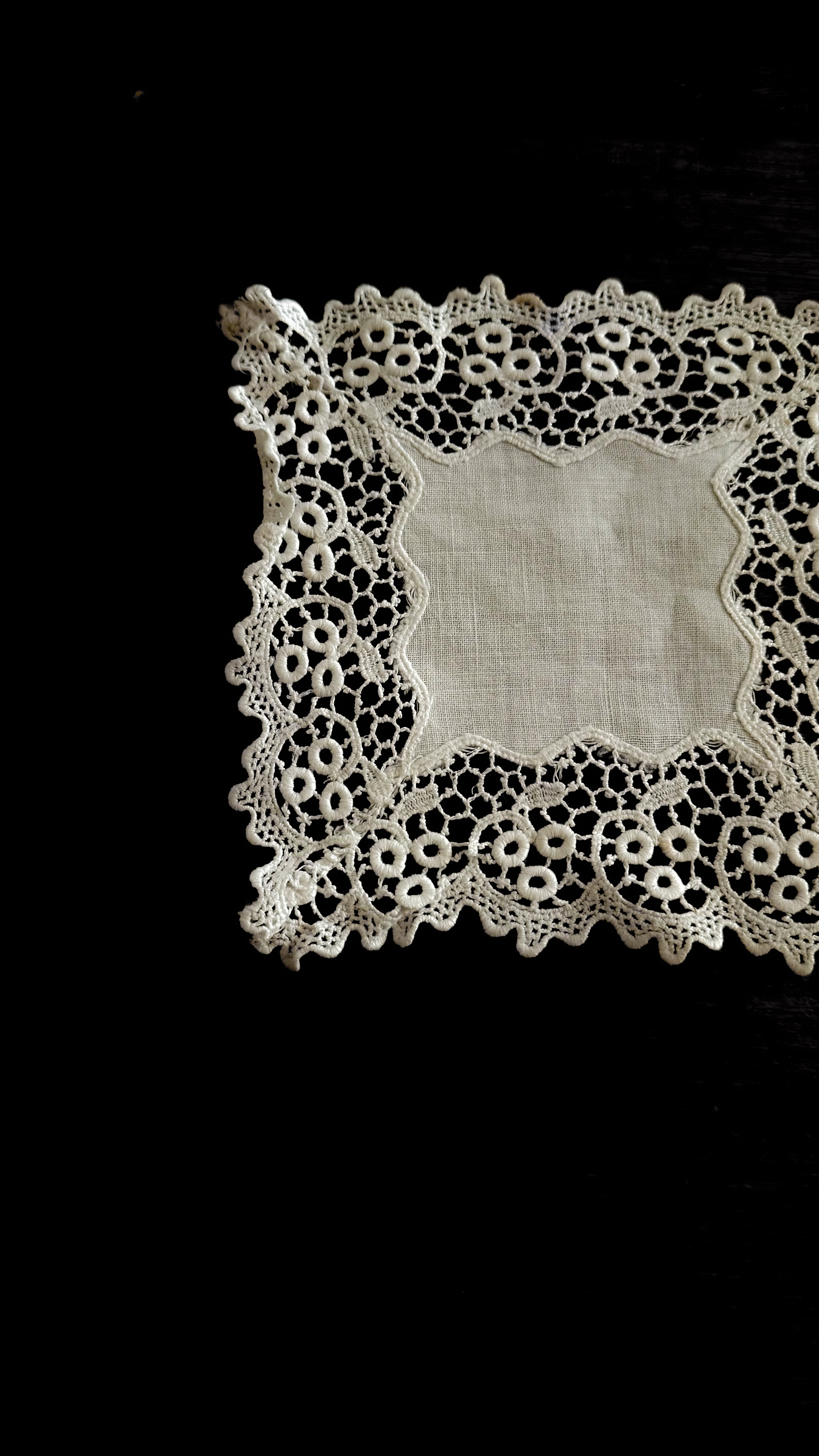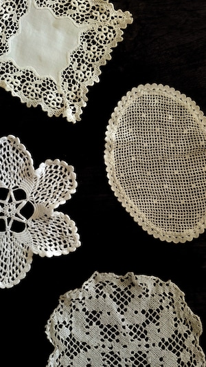 繊細な模様と、やわらかなアイボリーカラーの美しいイギリスヴィンテージのフィレレースドイリー。円を描くようなモチーフが連なり、縁には穏やかなスカラップ。中央部分はあえて装飾を抑えた生地で、レースの存在感を静かに引き立てています。時を重ねたレースならではの、真っ白ではない落ち着いた色合い。テーブルの上にそっと敷くだけで、雰囲気のでる佇まいです。小さな花器やキャンドル、アクセサリーの下に。家具の一角やトレイの上に添えても、日常の風景にさりげない奥行きを与えてくれます。ヴィンテージ品のため、多少の歪みやシミなど経年による表情の変化が見られる場合がありますが、それもまた、このドイリーが歩んできた時間の一部としてお楽しみください。