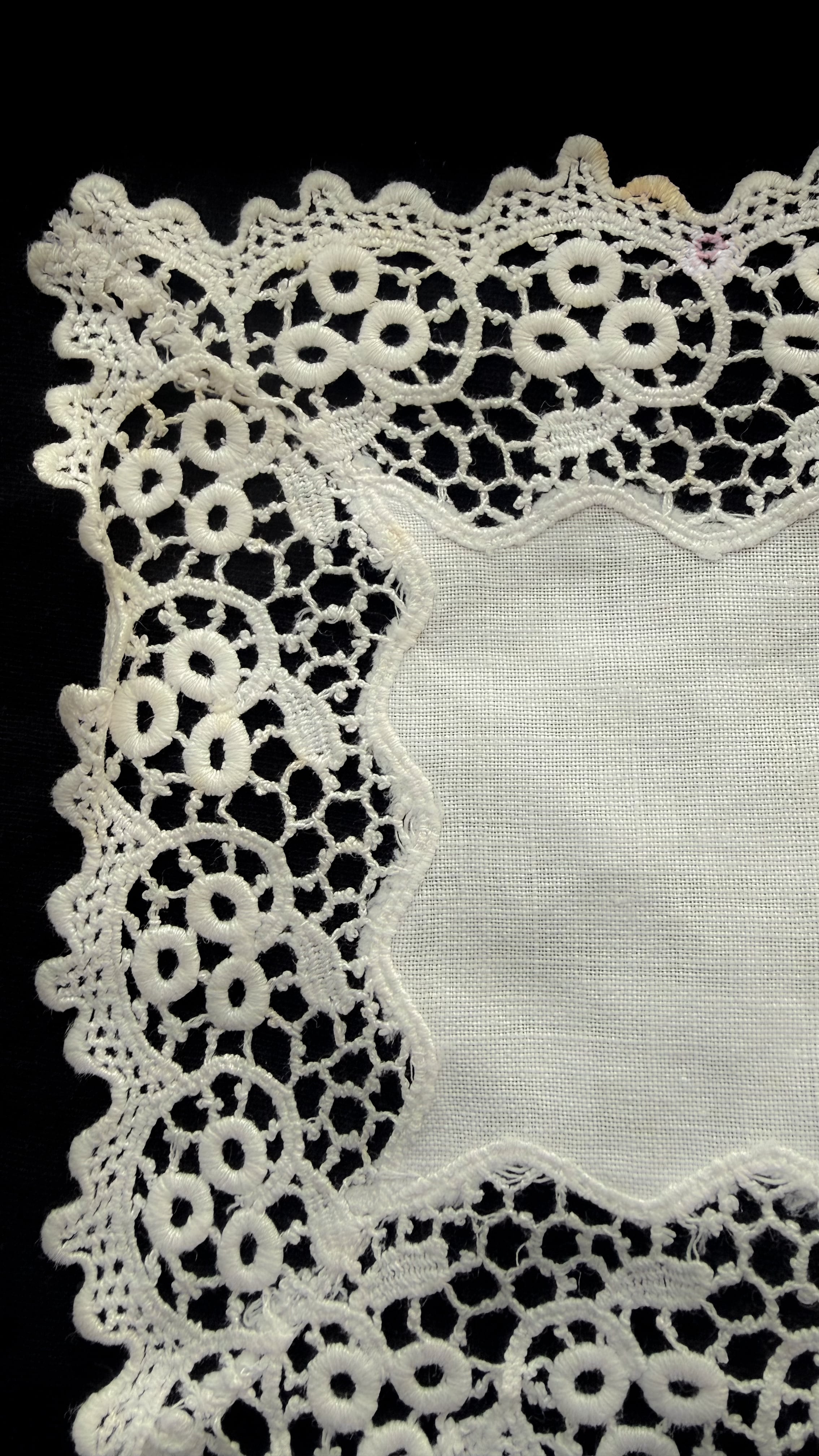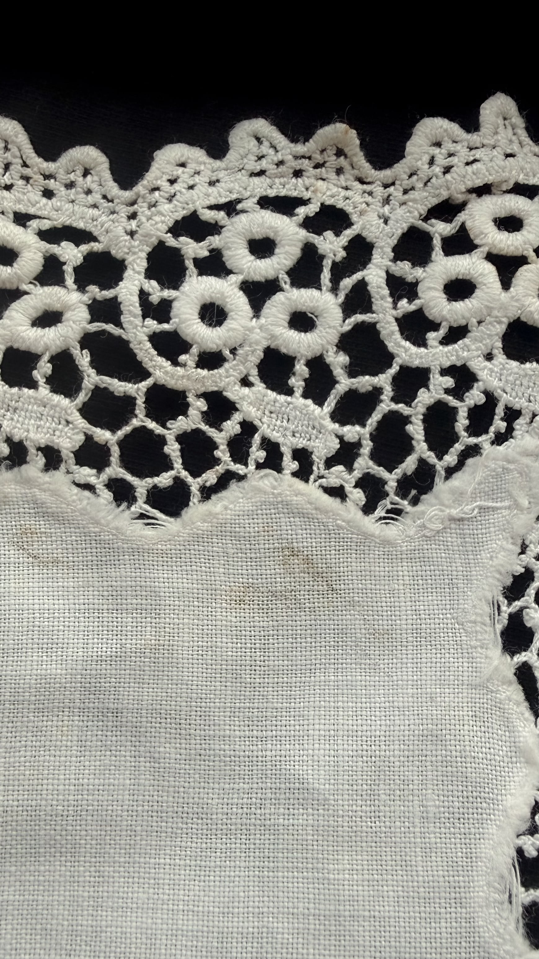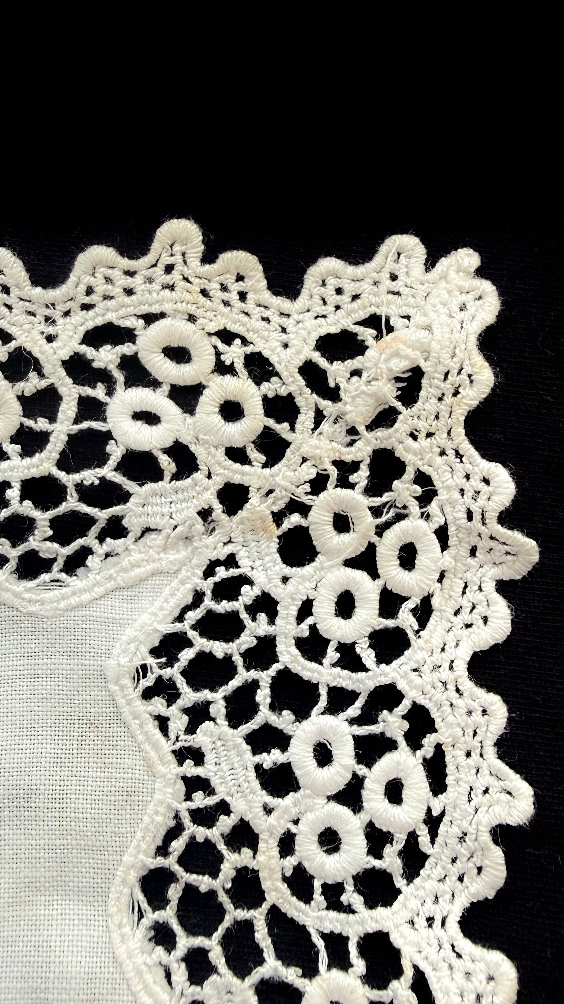 繊細な模様と、やわらかなアイボリーカラーの美しいイギリスヴィンテージのフィレレースドイリー。円を描くようなモチーフが連なり、縁には穏やかなスカラップ。中央部分はあえて装飾を抑えた生地で、レースの存在感を静かに引き立てています。時を重ねたレースならではの、真っ白ではない落ち着いた色合い。テーブルの上にそっと敷くだけで、雰囲気のでる佇まいです。小さな花器やキャンドル、アクセサリーの下に。家具の一角やトレイの上に添えても、日常の風景にさりげない奥行きを与えてくれます。ヴィンテージ品のため、多少の歪みやシミなど経年による表情の変化が見られる場合がありますが、それもまた、このドイリーが歩んできた時間の一部としてお楽しみください。