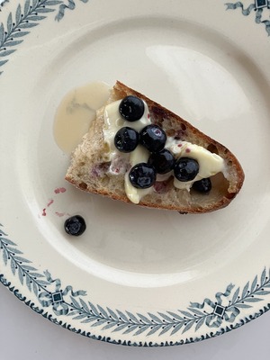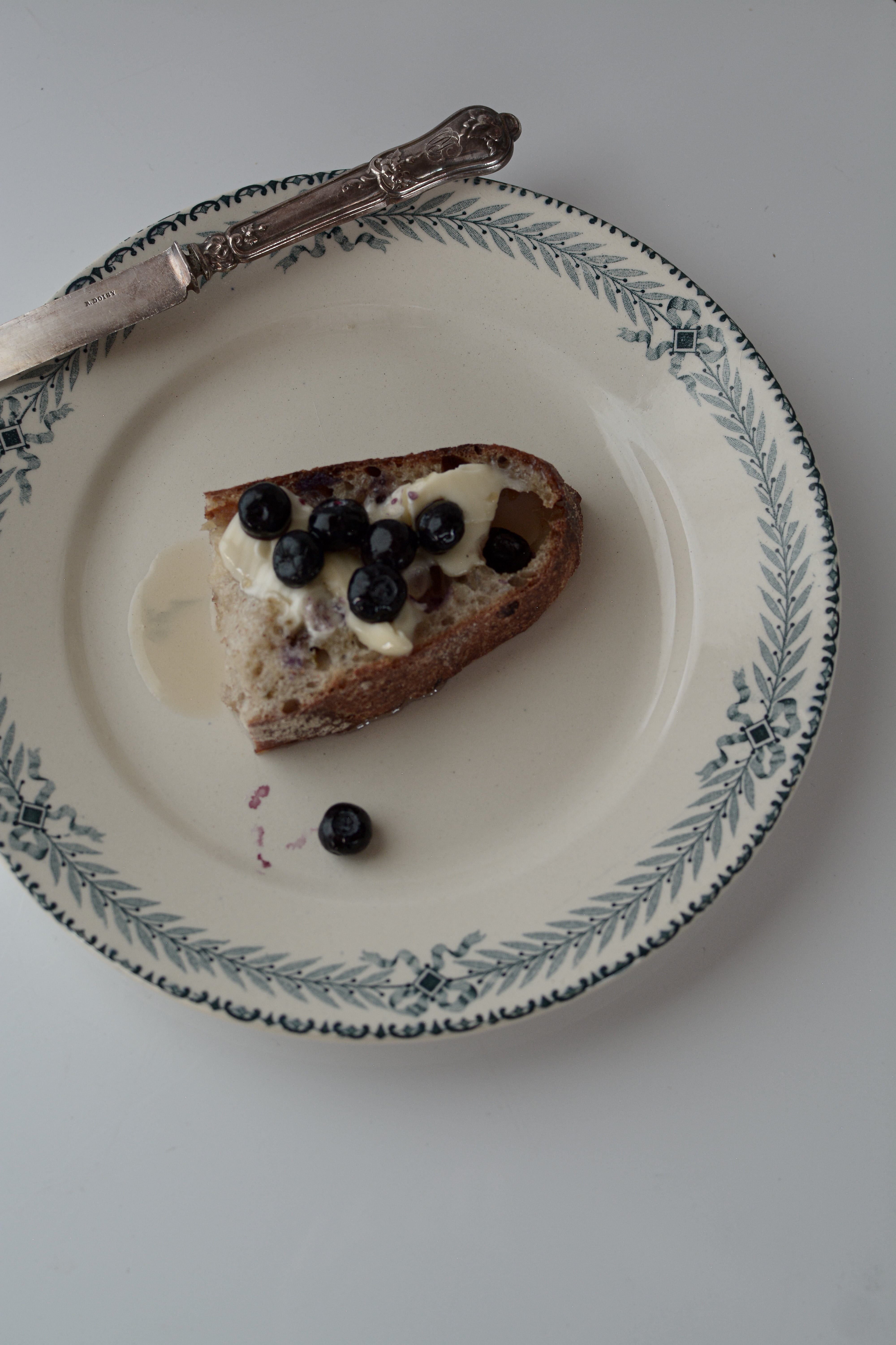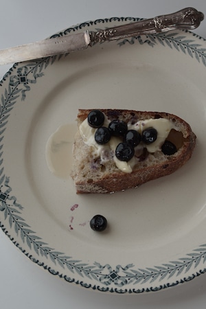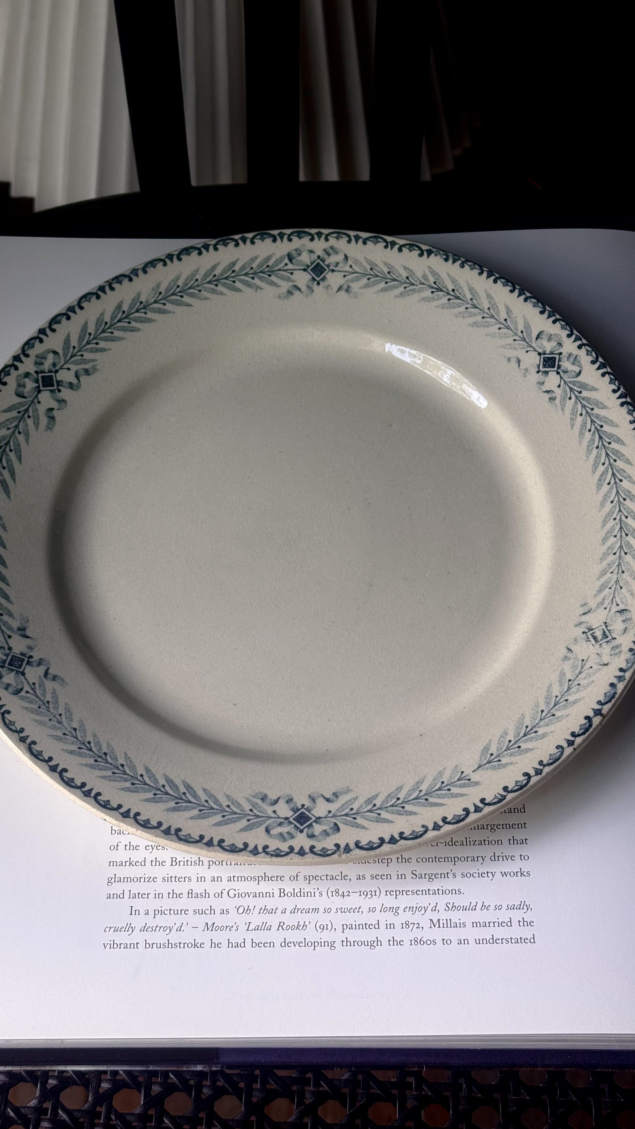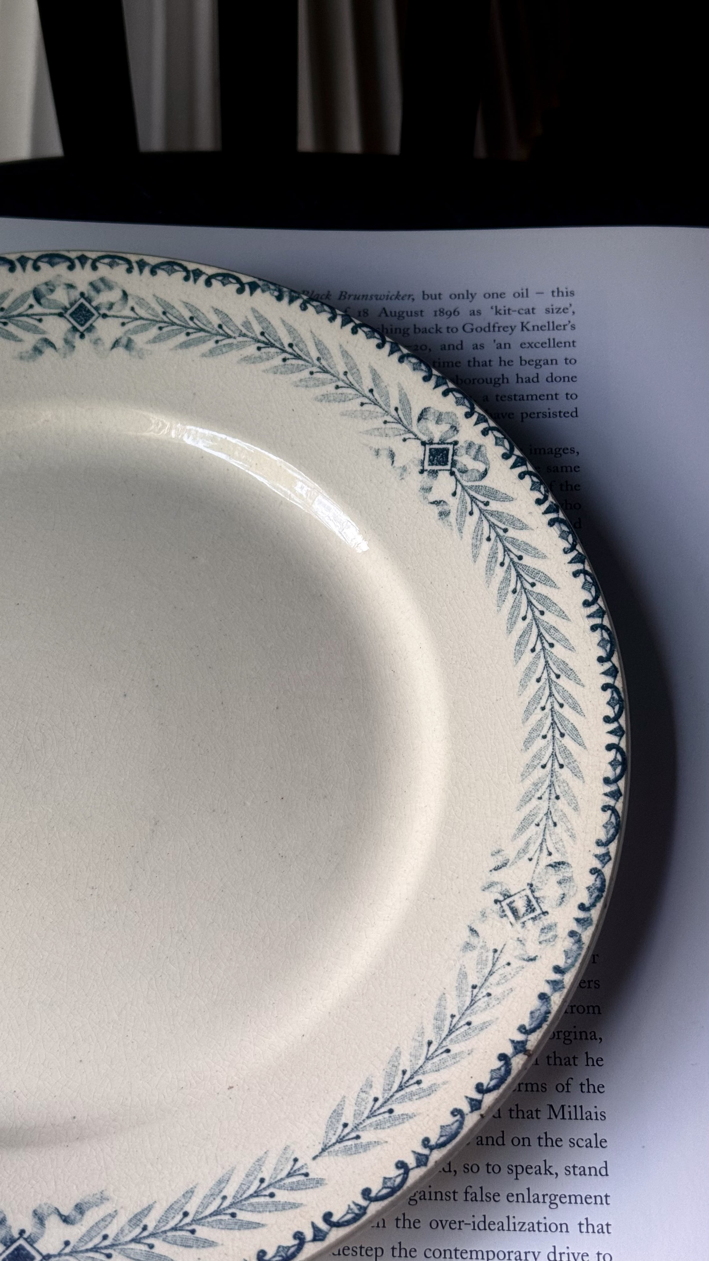 月桂樹の葉が飾られたChoisy-le-Roiのアンティークプレート。整いすぎないやさしいラインが、どこか自然体で、気取らず上品な印象。ロワール渓谷の町Chinonの名が由来のプレートだそうで、豊かな歴史の気配を感じます。真新しい器にはない、やわらかく落ち着いた佇まい。光の当たり方や角度によって、貫入の表情がふと現れ、また静かに溶け込んでいく様子は、年月を重ねた器ならではの美しさです。趣深い器はふとした日常のシーンに、良い空気を運んできてくれそうですね。