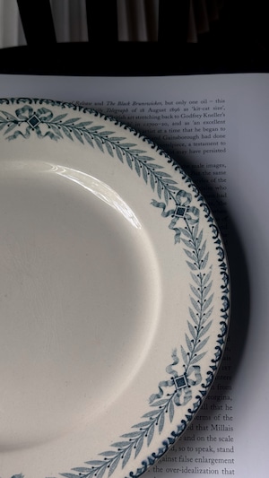 月桂樹の葉が飾られたChoisy-le-Roiのアンティークプレート。整いすぎないやさしいラインが、どこか自然体で、気取らず上品な印象。ロワール渓谷の町Chinonの名が由来のプレートだそうで、豊かな歴史の気配を感じます。真新しい器にはない、やわらかく落ち着いた佇まい。光の当たり方や角度によって、貫入の表情がふと現れ、また静かに溶け込んでいく様子は、年月を重ねた器ならではの美しさです。趣深い器はふとした日常のシーンに、良い空気を運んできてくれそうですね。