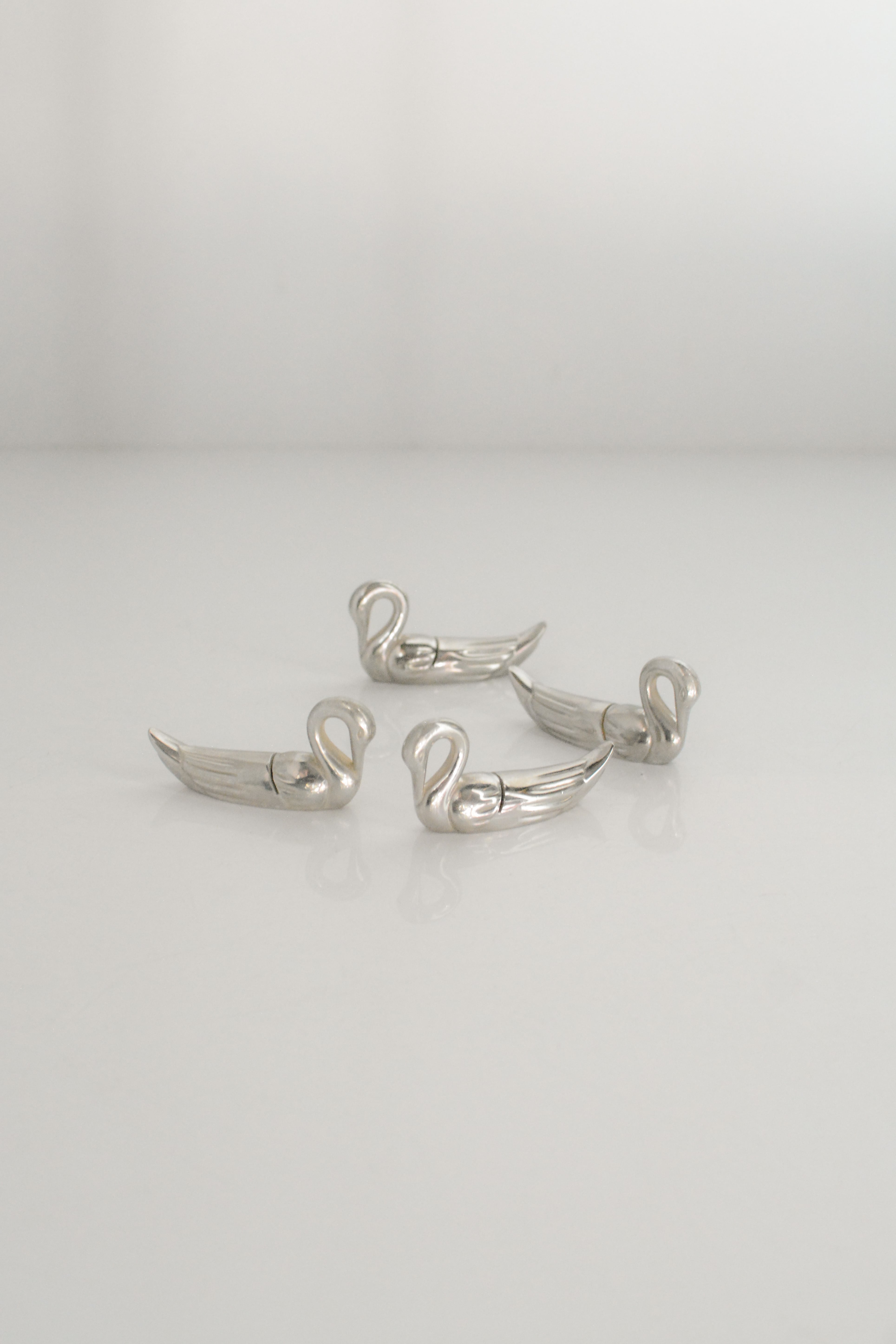 静かな湖面に寄り添うように並ぶ白鳥、羽をすっと伸ばしたその姿をかたどった、ヴィンテージのカードホルダーです。なめらかな曲線で表現された首元や、羽根の一本一本まで感じられる立体的な造形。年月を重ねたものならではのやわらかな艶があり、所々経年変化で白くなったり均一ではない表面は、光を受けるたびに穏やかな表情を見せてくれます。名刺やショップカード、メモカードを挟んで、デスクやカウンター、イベント時のプライススタンドとしても。実用性がありながらも、置いておくだけで空間に静かな物語を添えてくれるオブジェのような美しさです。複数在庫ございますが差異はほぼございませんので、セレクトしてのお届けとなります。