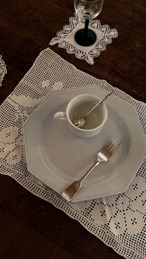 繊細な模様と、やわらかなアイボリーカラーの美しいイギリスヴィンテージのフィレレースドイリー。縁にスカラップ、中央部分はあえて装飾を抑えた生地で、レースの存在感を静かに引き立てています。時を重ねたレースならではの、真っ白ではない落ち着いた色合い。テーブルの上にそっと敷くだけで、雰囲気のでる佇まいです。小さな花器やキャンドル、アクセサリーの下に。家具の一角やトレイの上に添えても、日常の風景にさりげない奥行きを与えてくれます。ヴィンテージ品のため、多少の歪みなど経年による表情の変化が見られる場合がありますが、それもまた、このドイリーが歩んできた時間の一部としてお楽しみください。