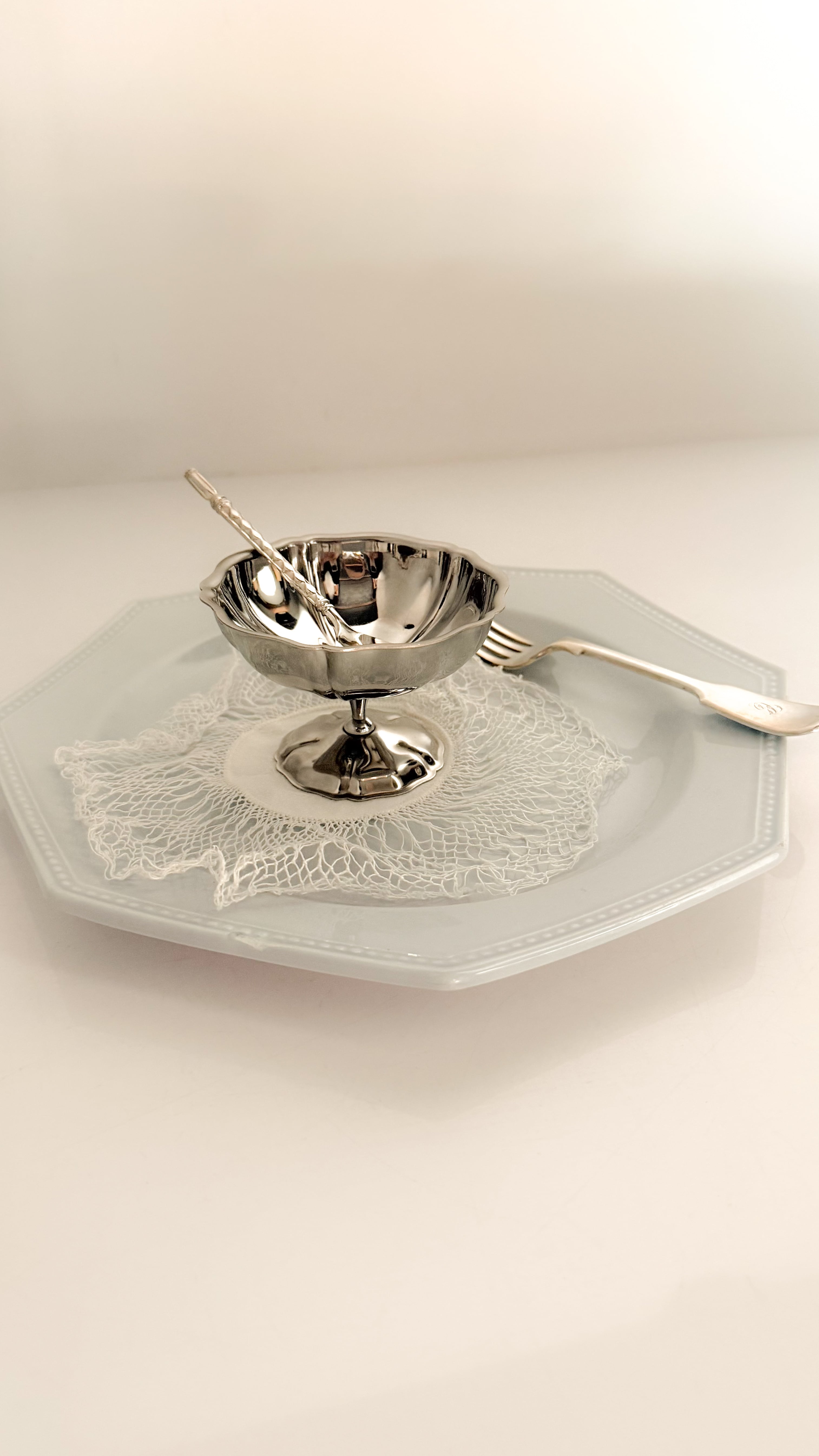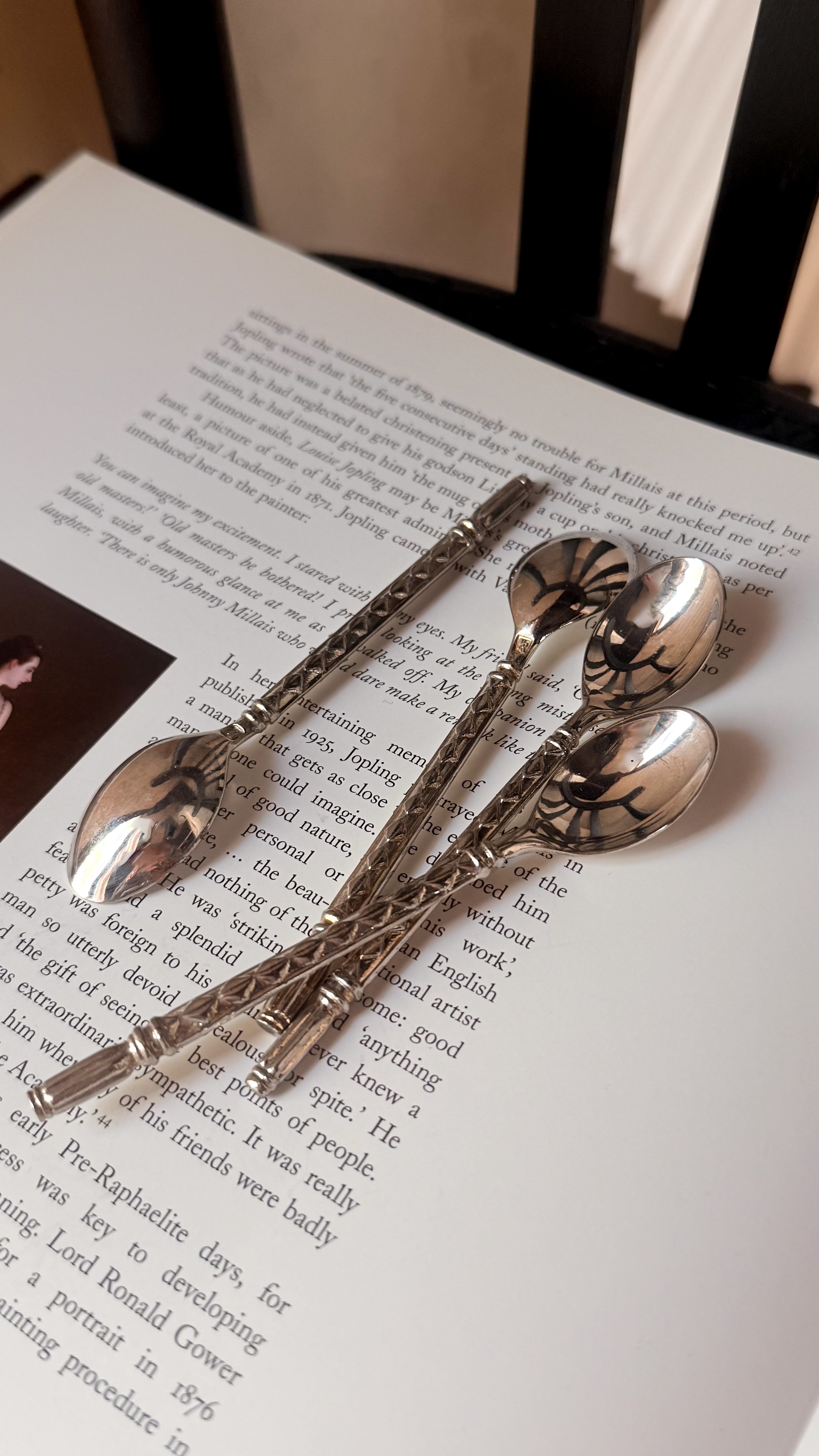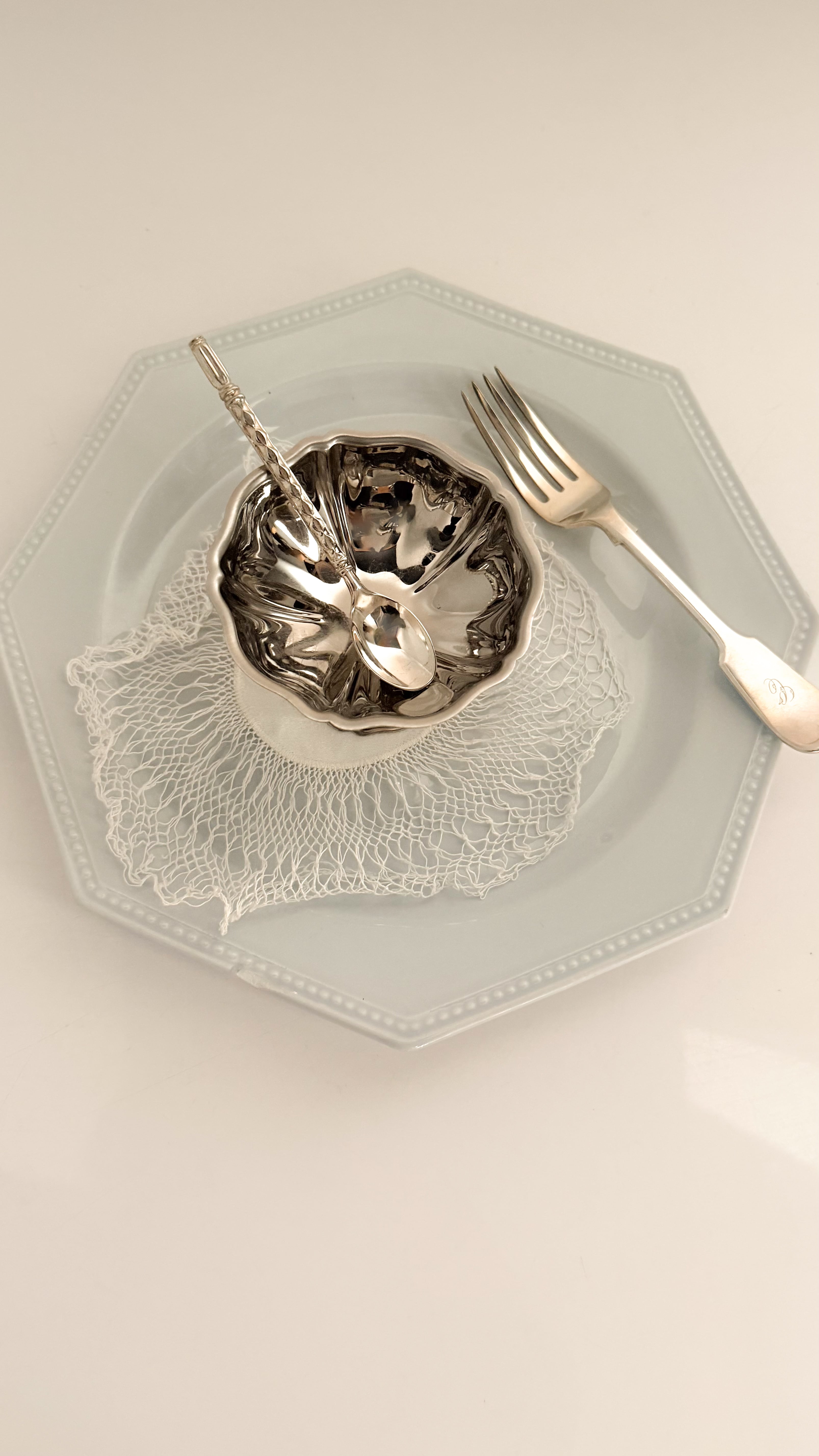 静かな光をまとった、ヴィンテージスプーン。ハンドルには、ダイヤモンドモチーフがリズムよく刻まれ、手に取るたび、ささやかな装飾美を感じさせます。派手さはなく、語りすぎない佇まい。金属の冷たさと、やわらかな表情が、日常の中に静かな余白を生み出します。時を重ねたものならではの小さな擦れや陰影も、このスプーンの一部としてお楽しみください。ささやかなテーブルでの休息のひとときに、あるいは、引き出しの中の小さなコレクションとして。小傷などございますが、ヴィンテージとしては比較的綺麗な状態です。