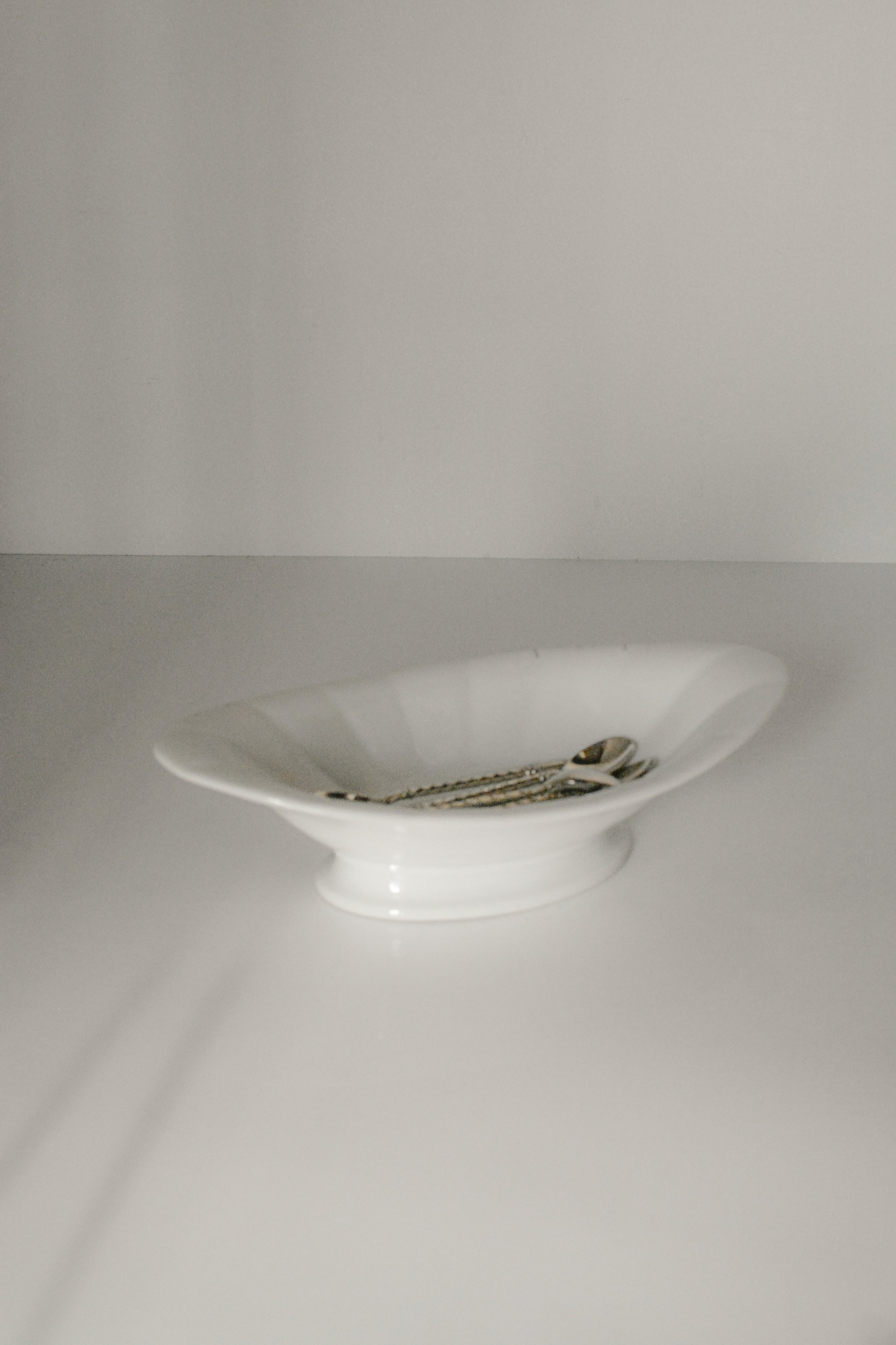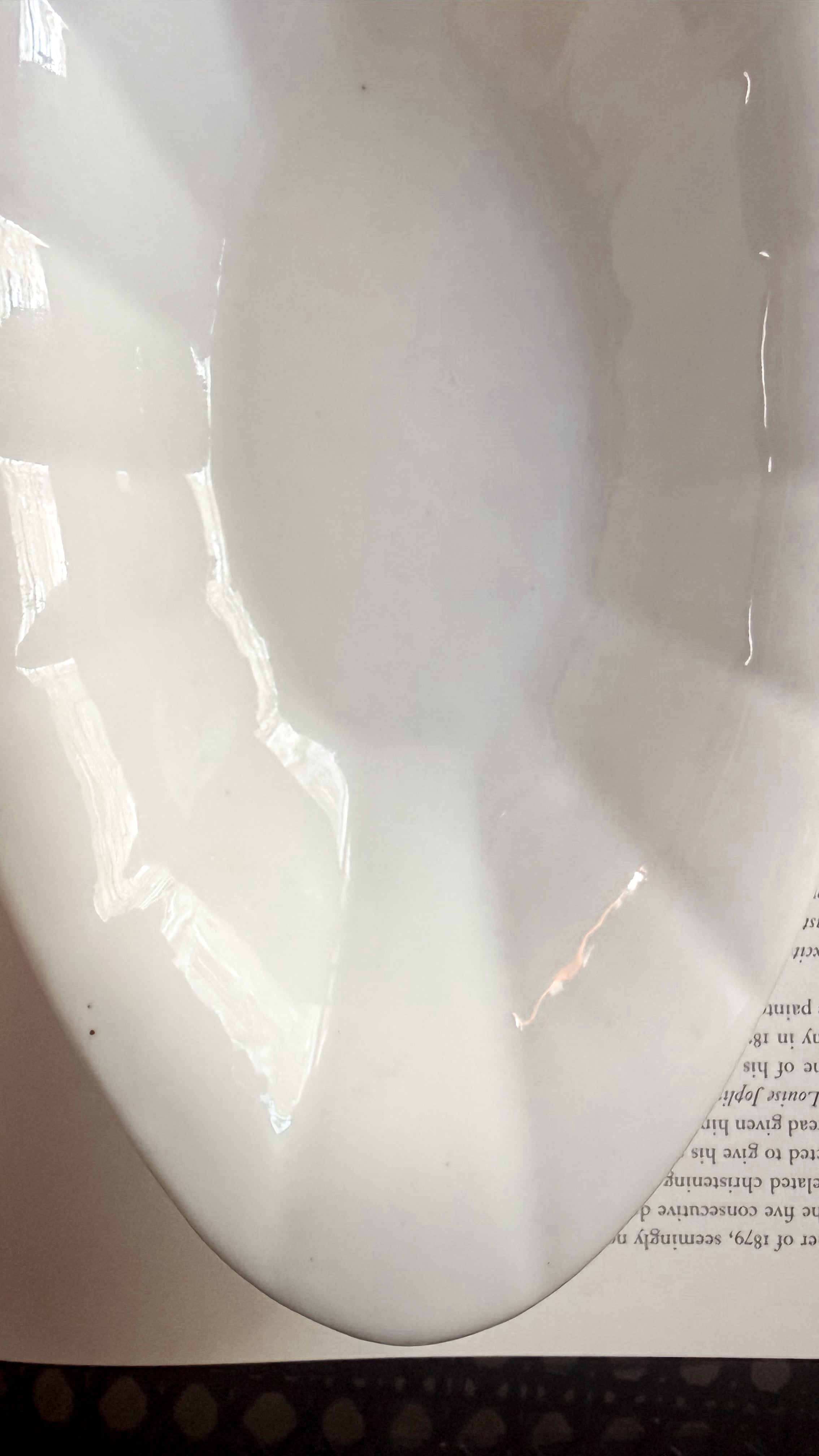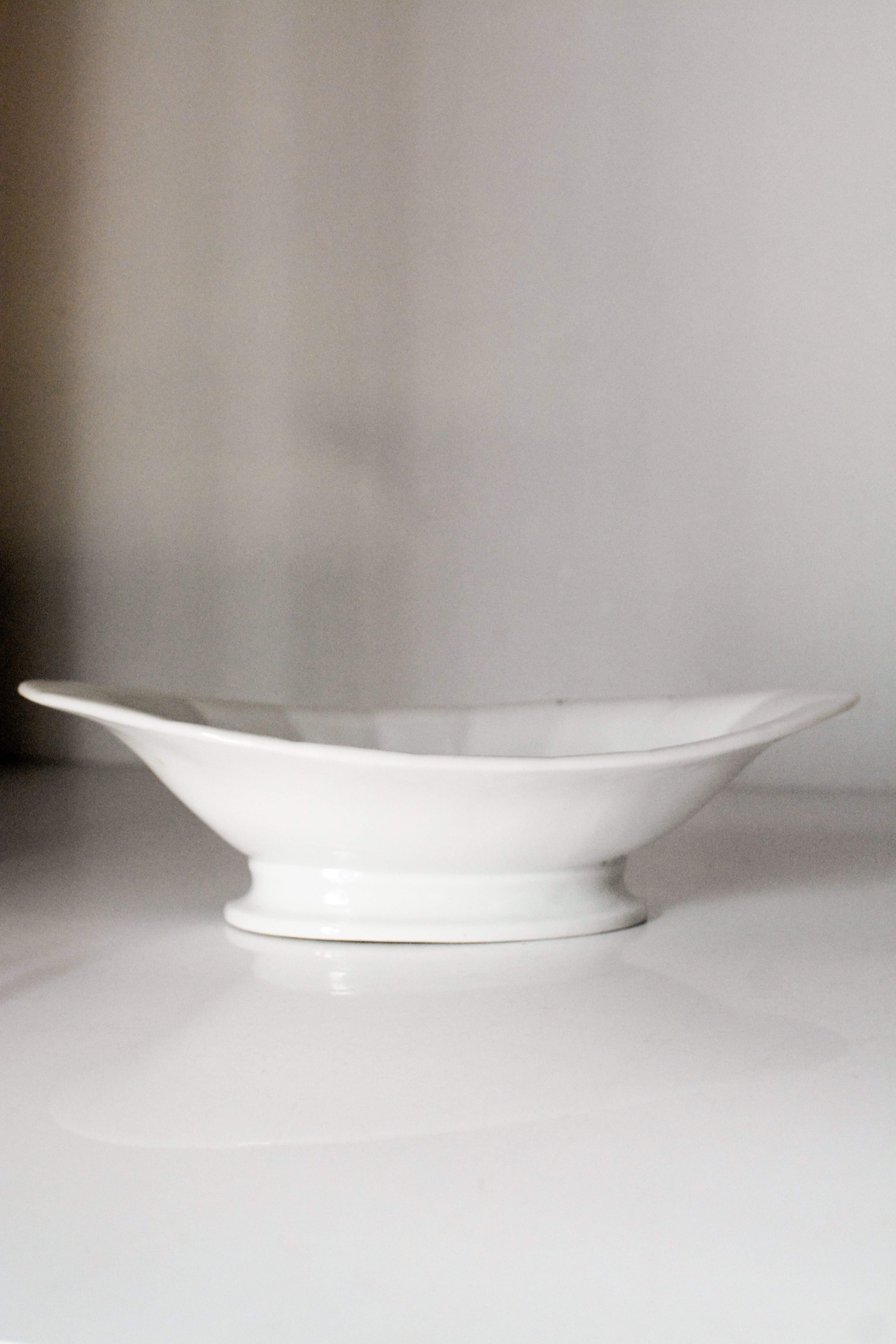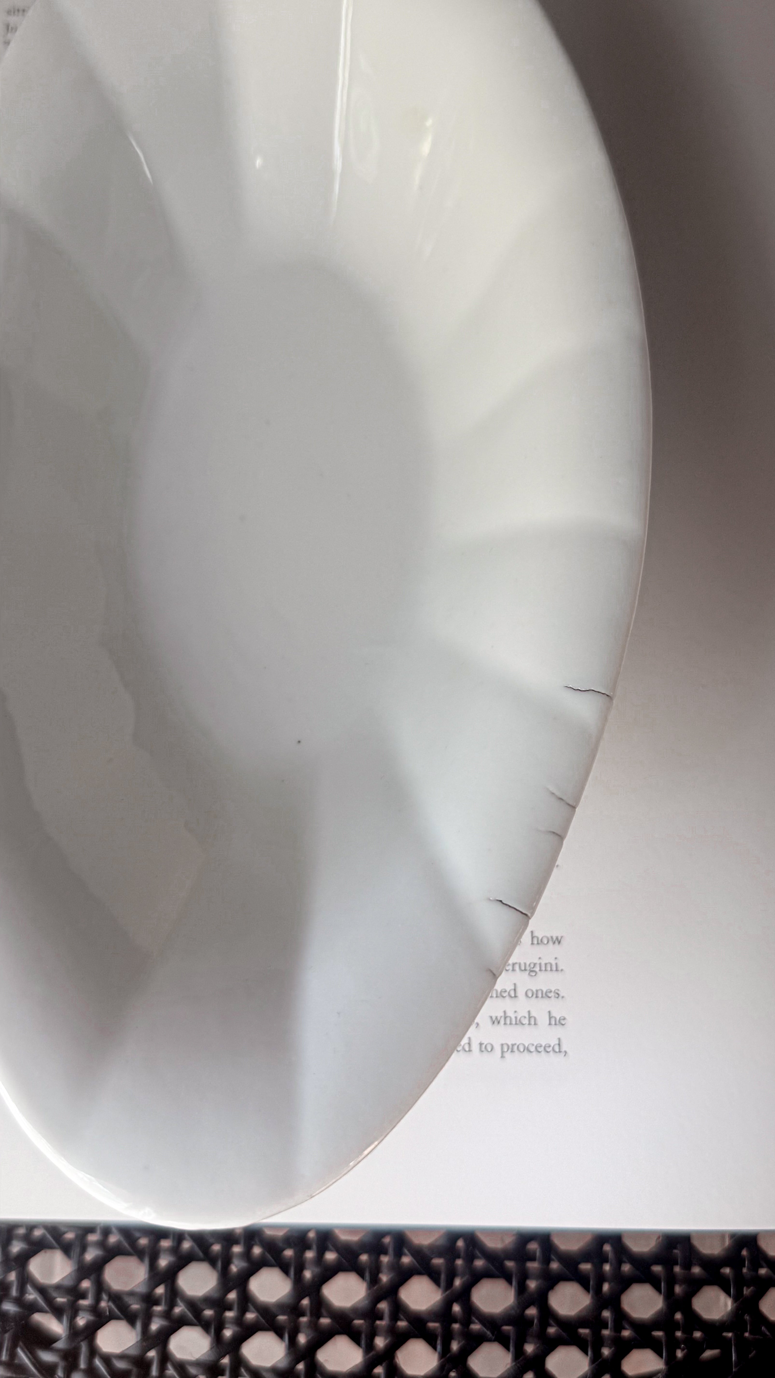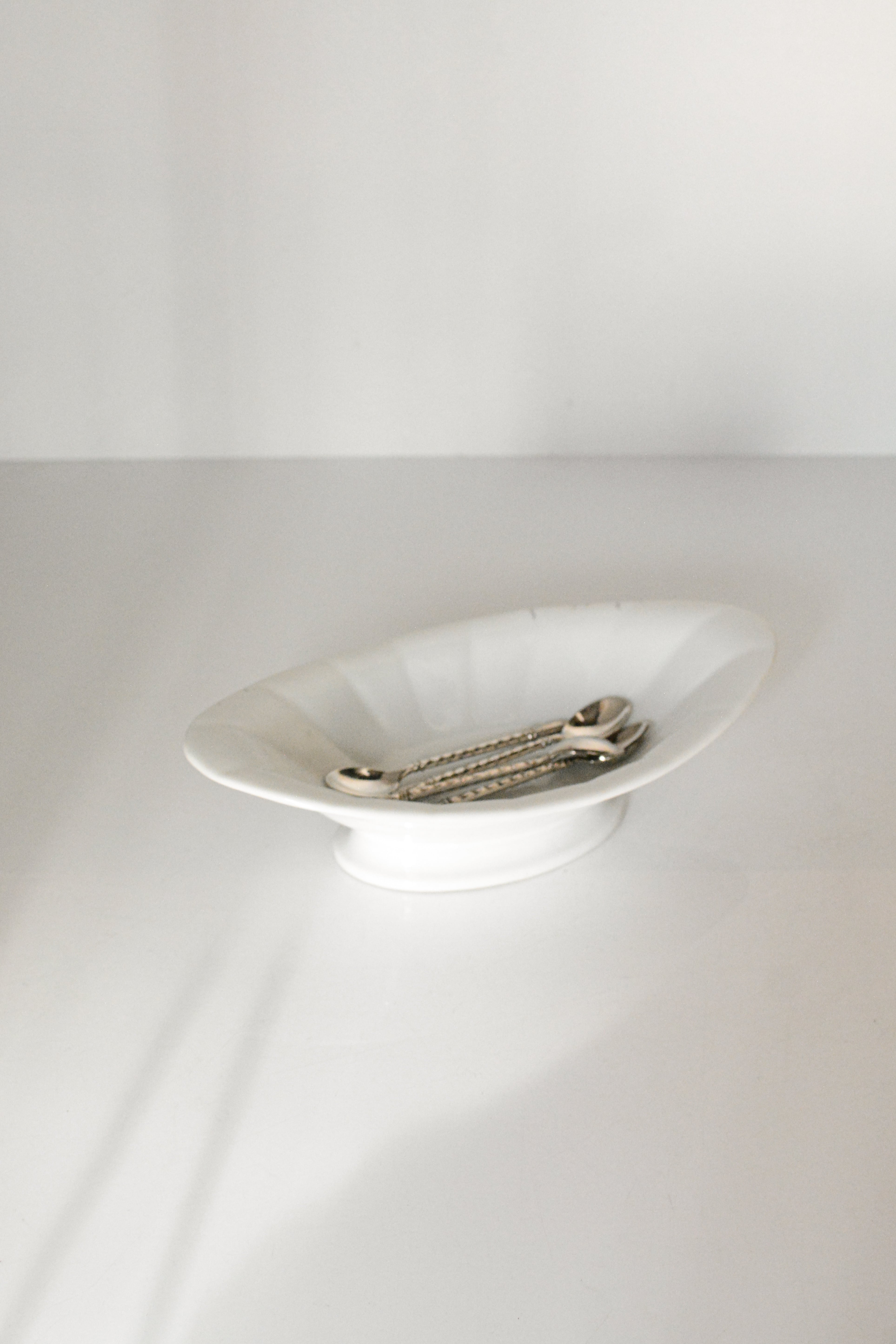 フランスの古い白磁でつくられた、足付きのプレート。凛とした白の中に、どこかやわらかな空気を含んだ佇まいが印象的です。縁には、放物線を描くようなレリーフが静かにめぐり、光の当たり方で陰影が生まれ、主張しすぎない装飾が盛り付けるものや空間にすっと寄り添ってくれる一枚です。縁の一部には、歪みや焼成時に生まれた傷があり、器が生まれた瞬間からそこにあった個性、表情として、不均一な美しさが魅力的。完璧ではないからこそ残ってきた、時間の層を感じるアイテムです。