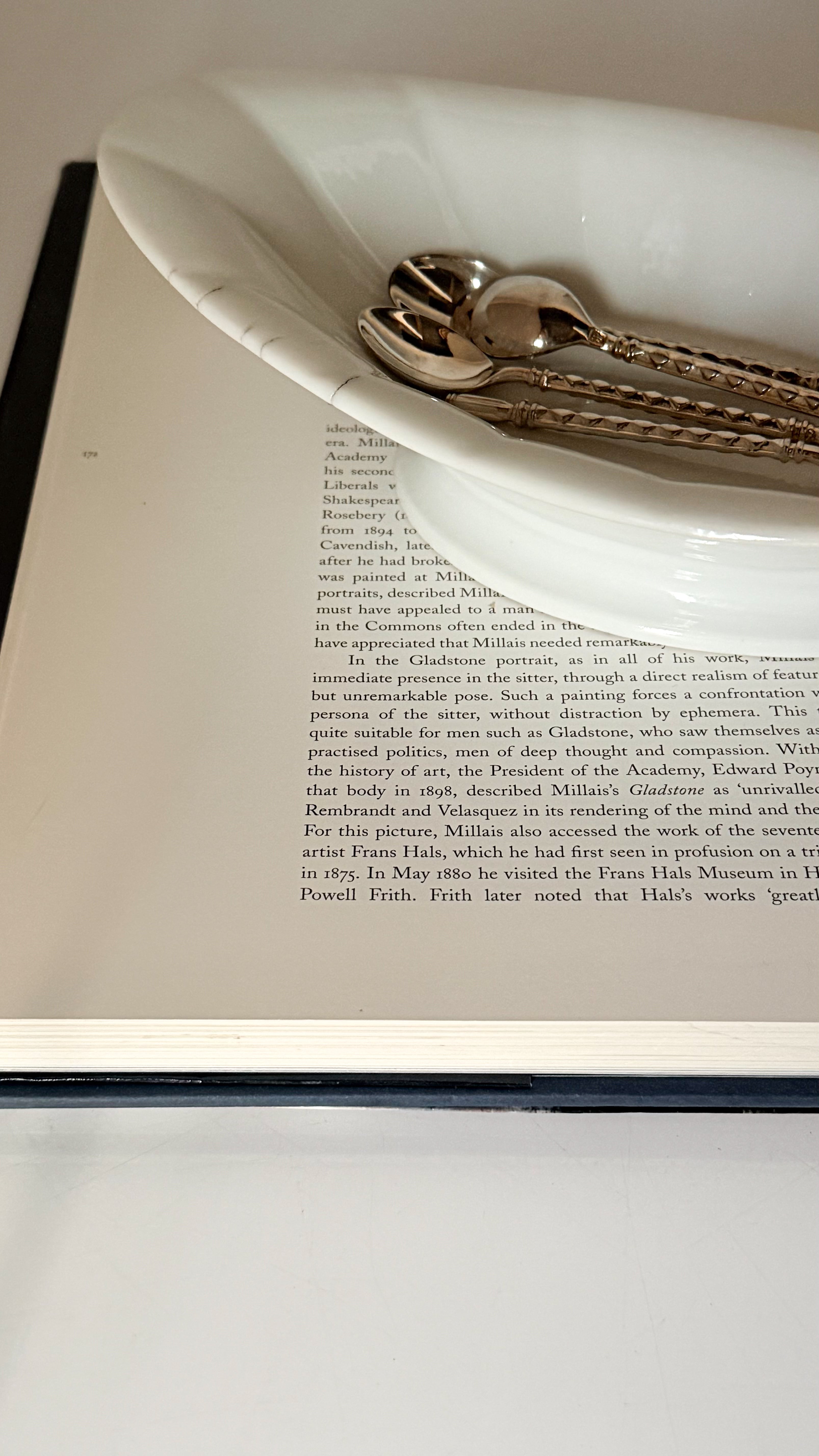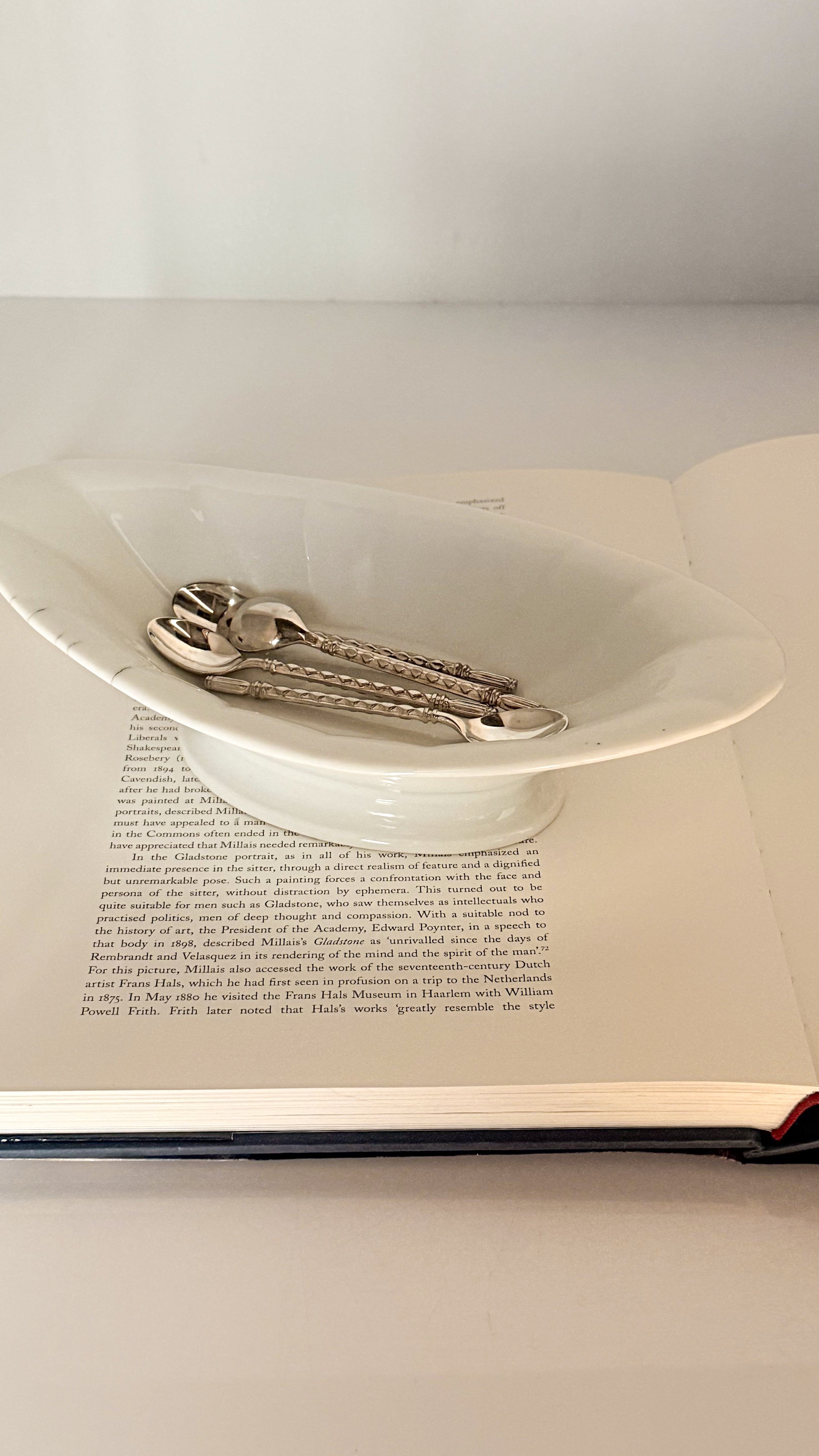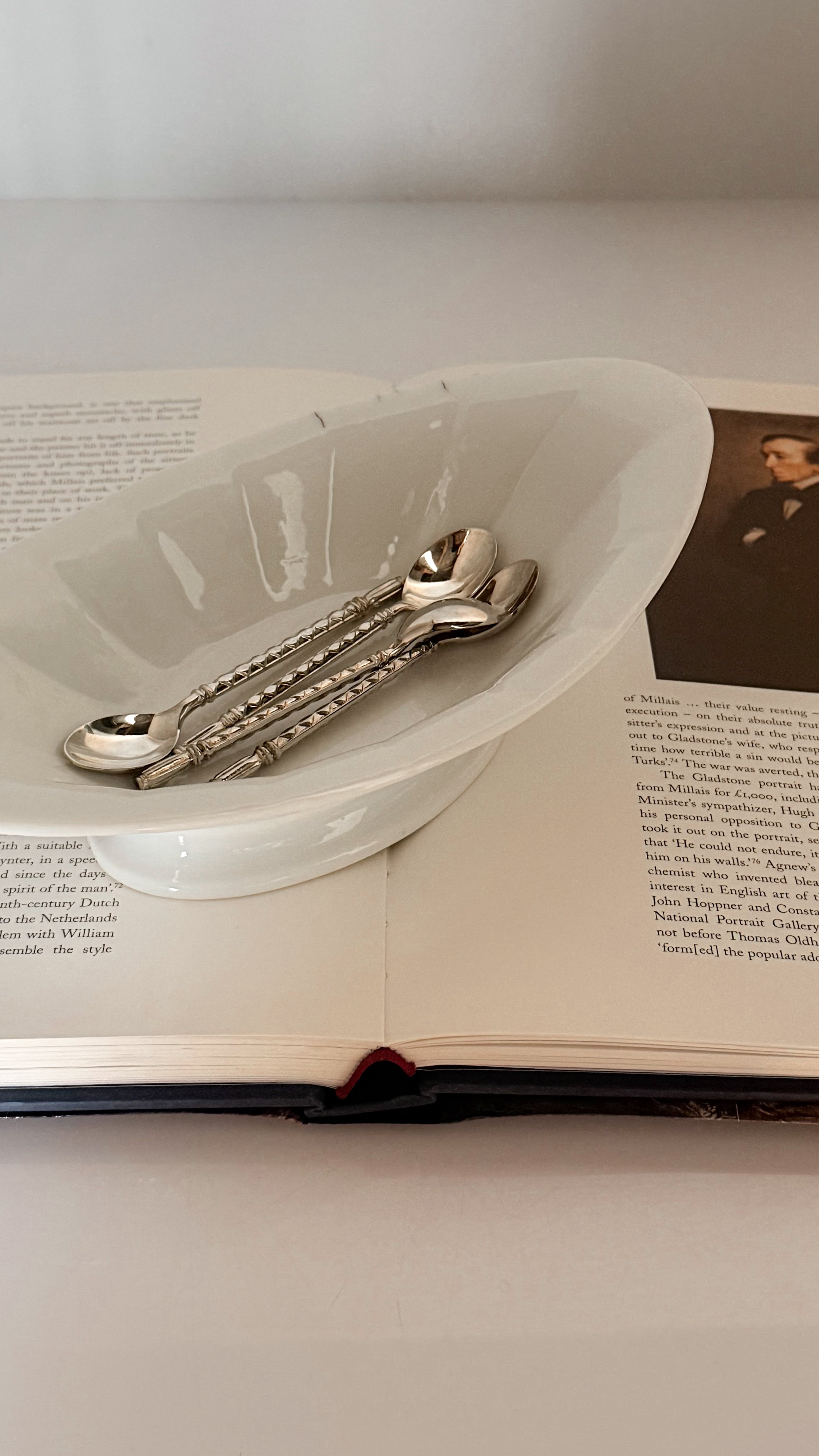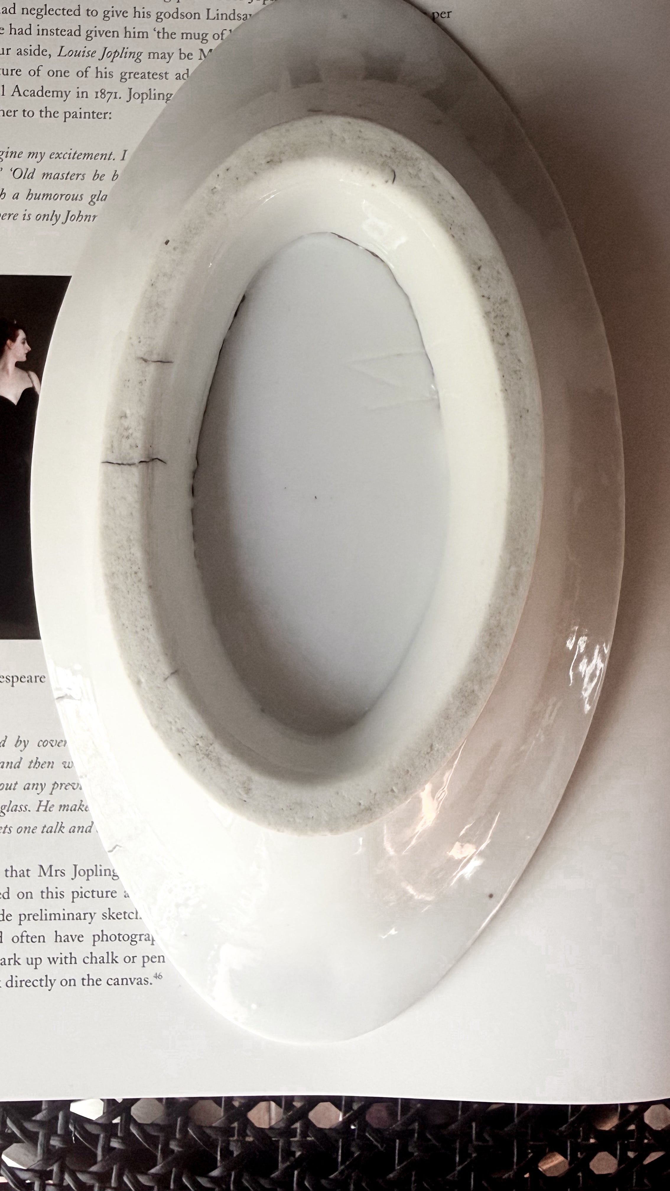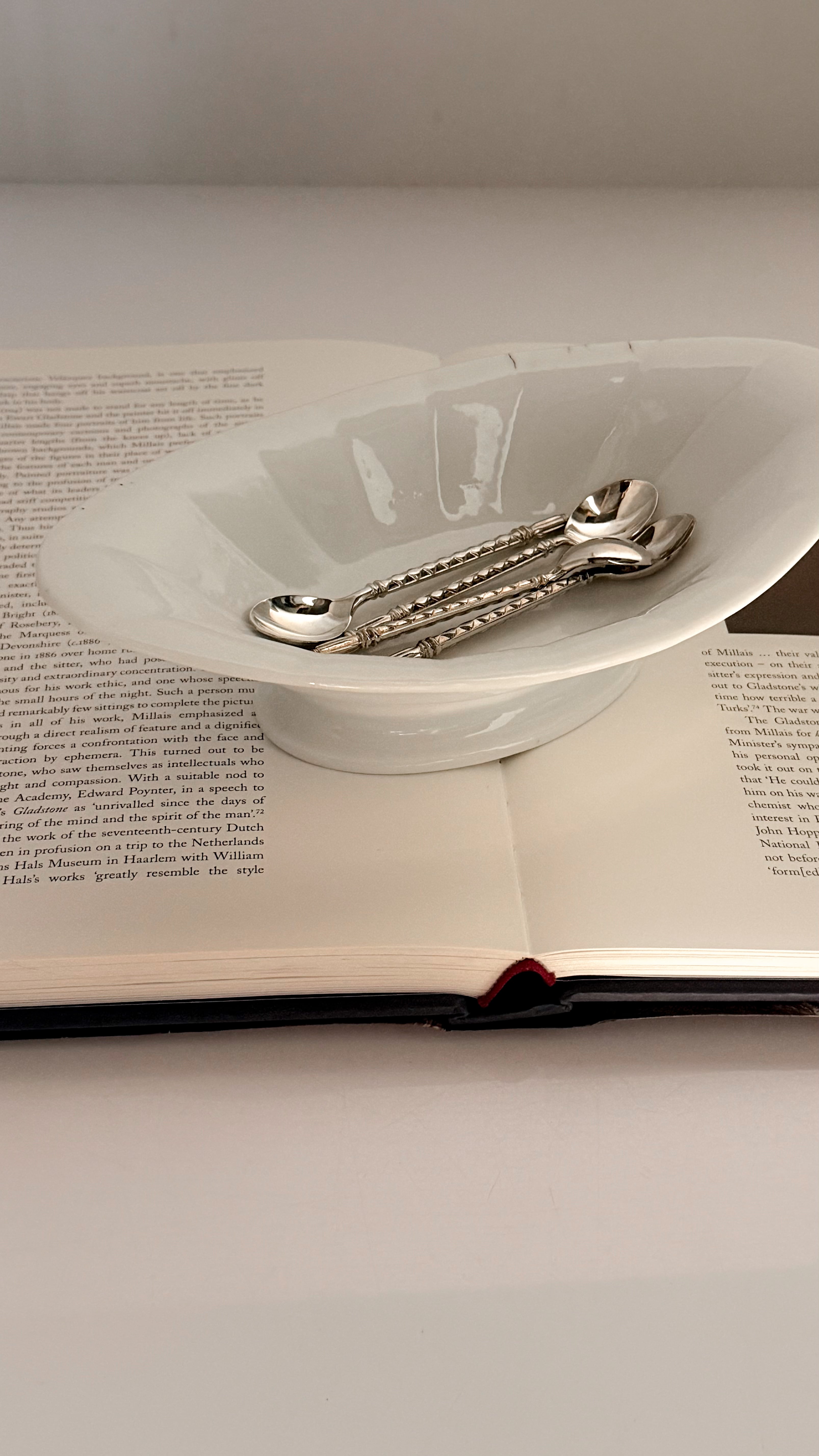 フランスの古い白磁でつくられた、足付きのプレート。凛とした白の中に、どこかやわらかな空気を含んだ佇まいが印象的です。縁には、放物線を描くようなレリーフが静かにめぐり、光の当たり方で陰影が生まれ、主張しすぎない装飾が盛り付けるものや空間にすっと寄り添ってくれる一枚です。縁の一部には、歪みや焼成時に生まれた傷があり、器が生まれた瞬間からそこにあった個性、表情として、不均一な美しさが魅力的。完璧ではないからこそ残ってきた、時間の層を感じるアイテムです。