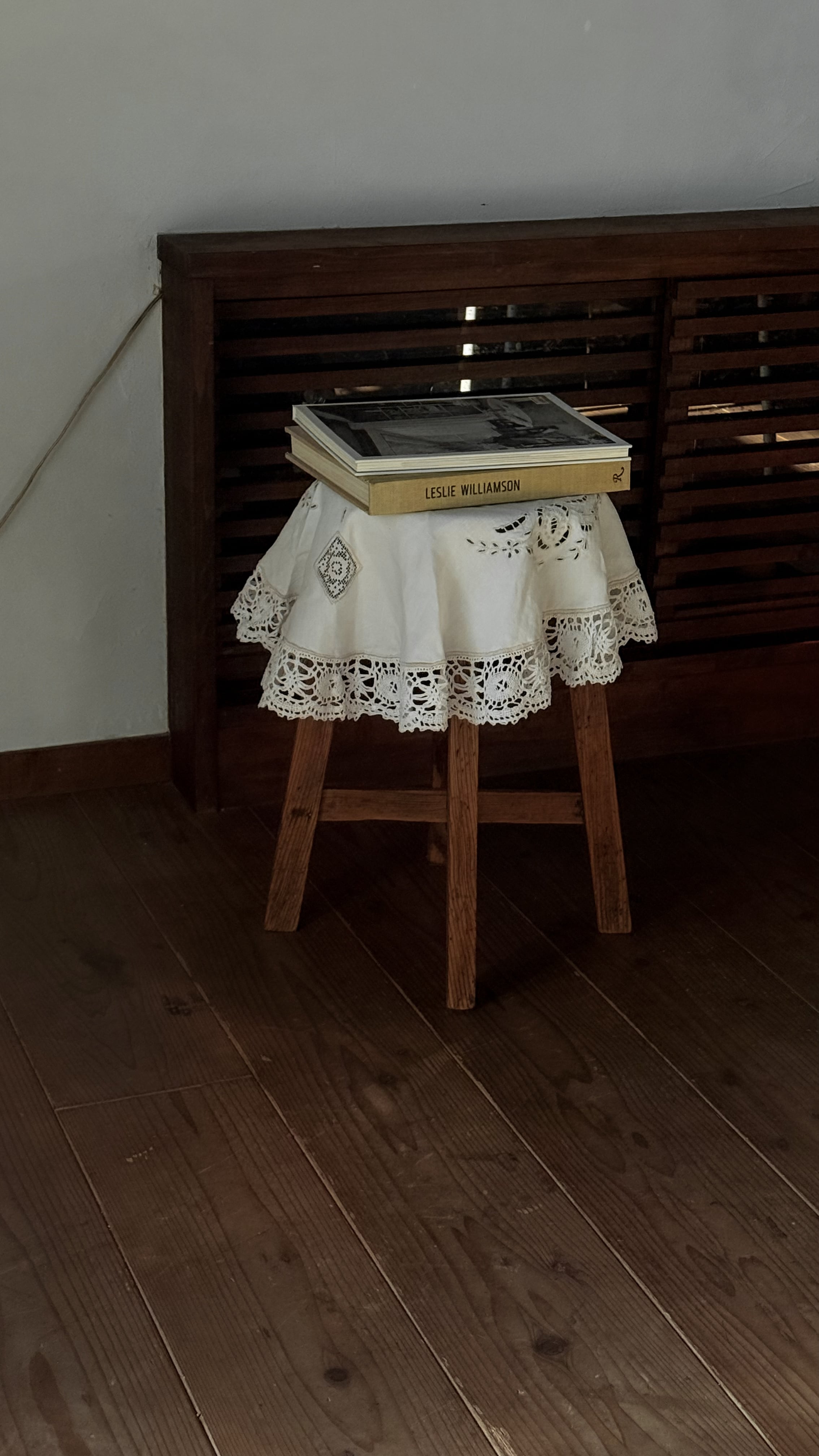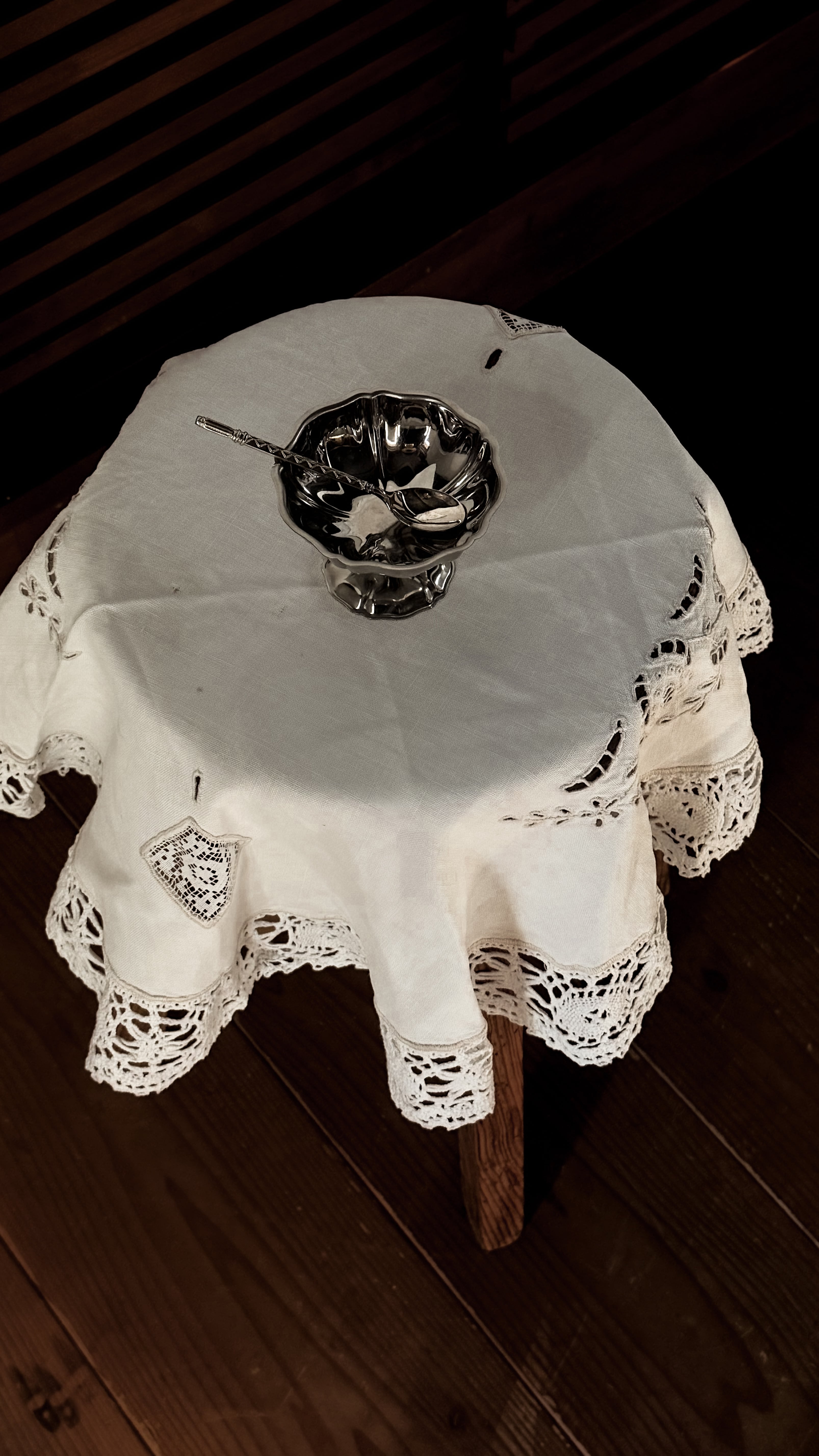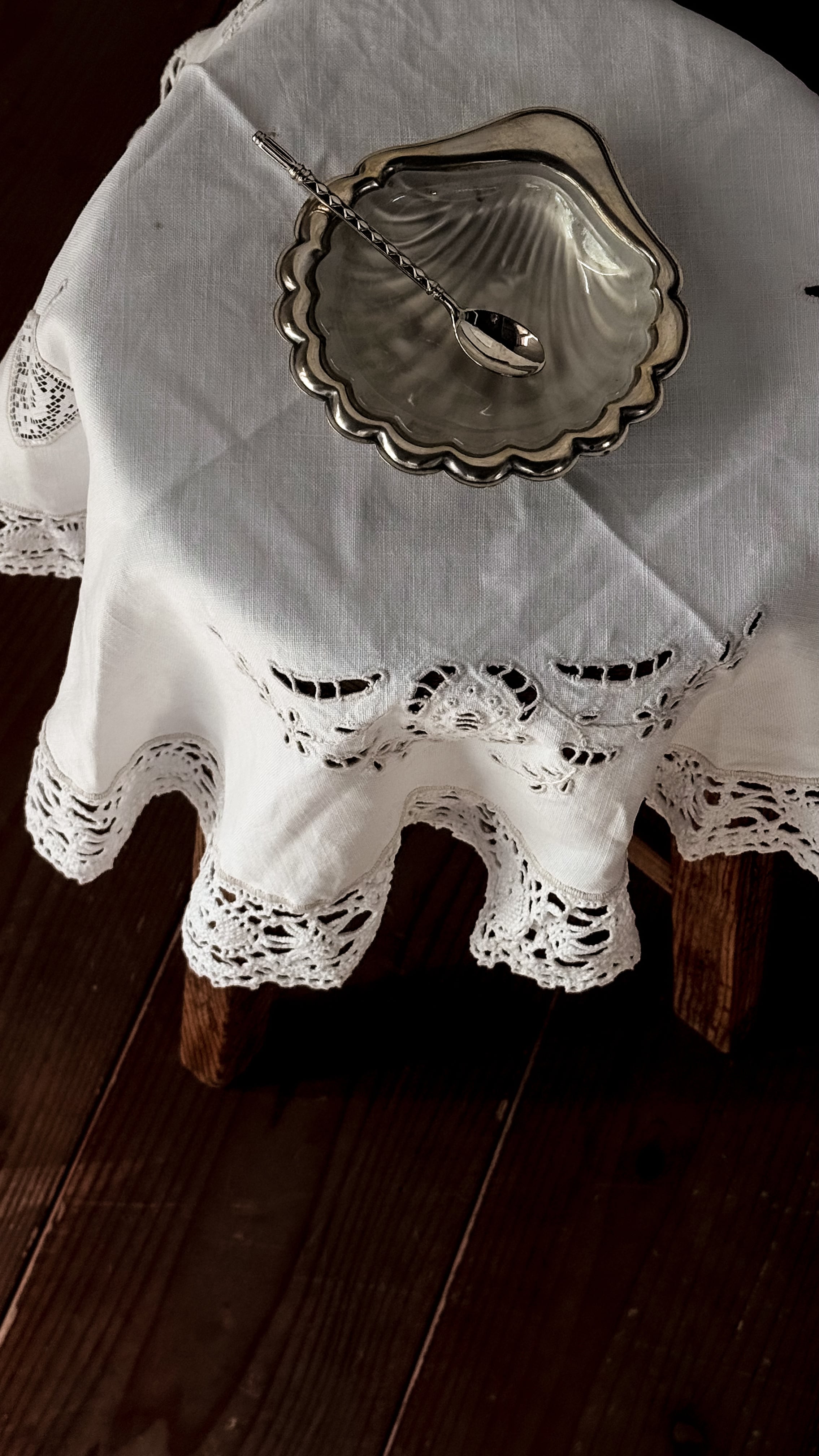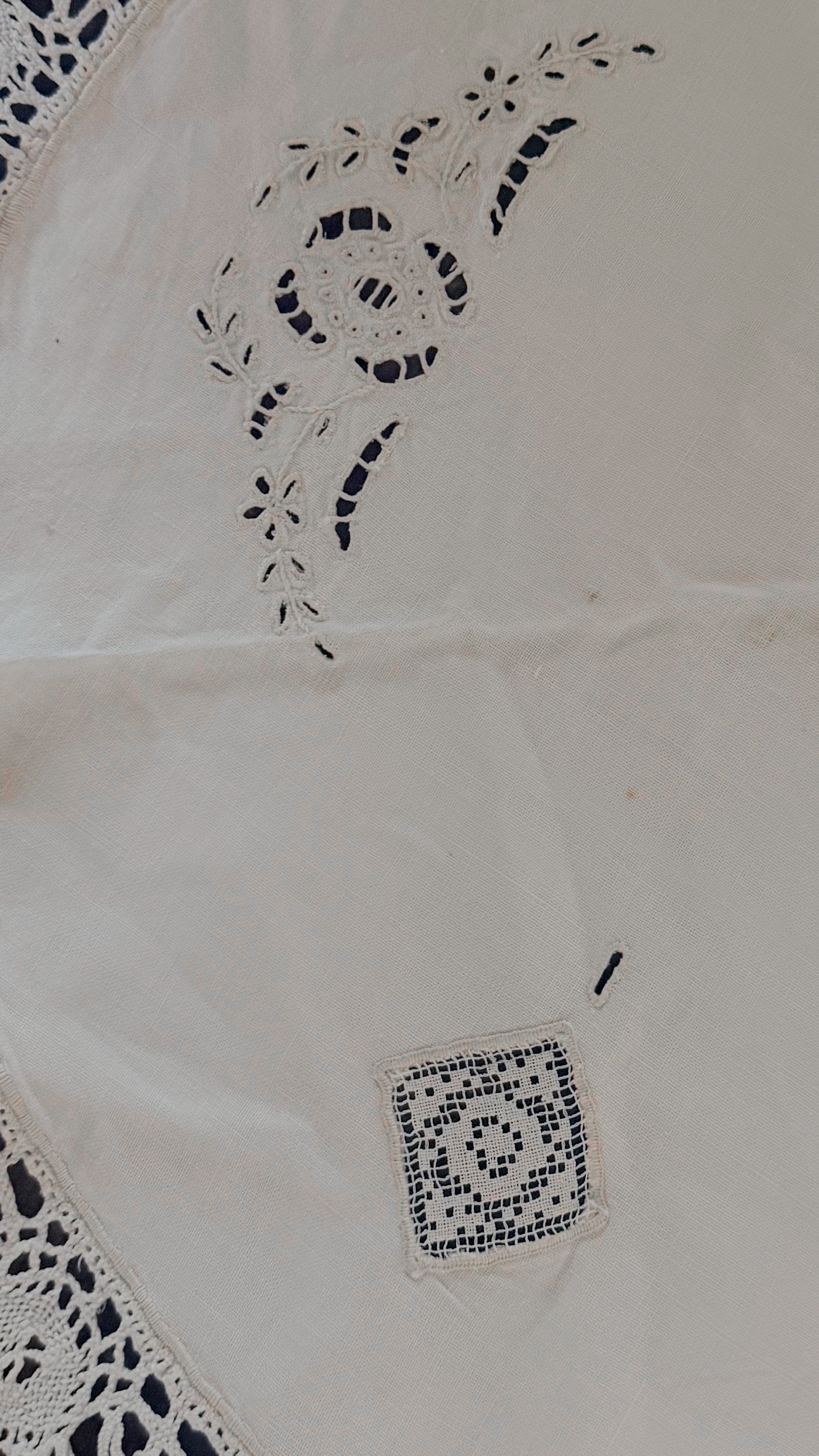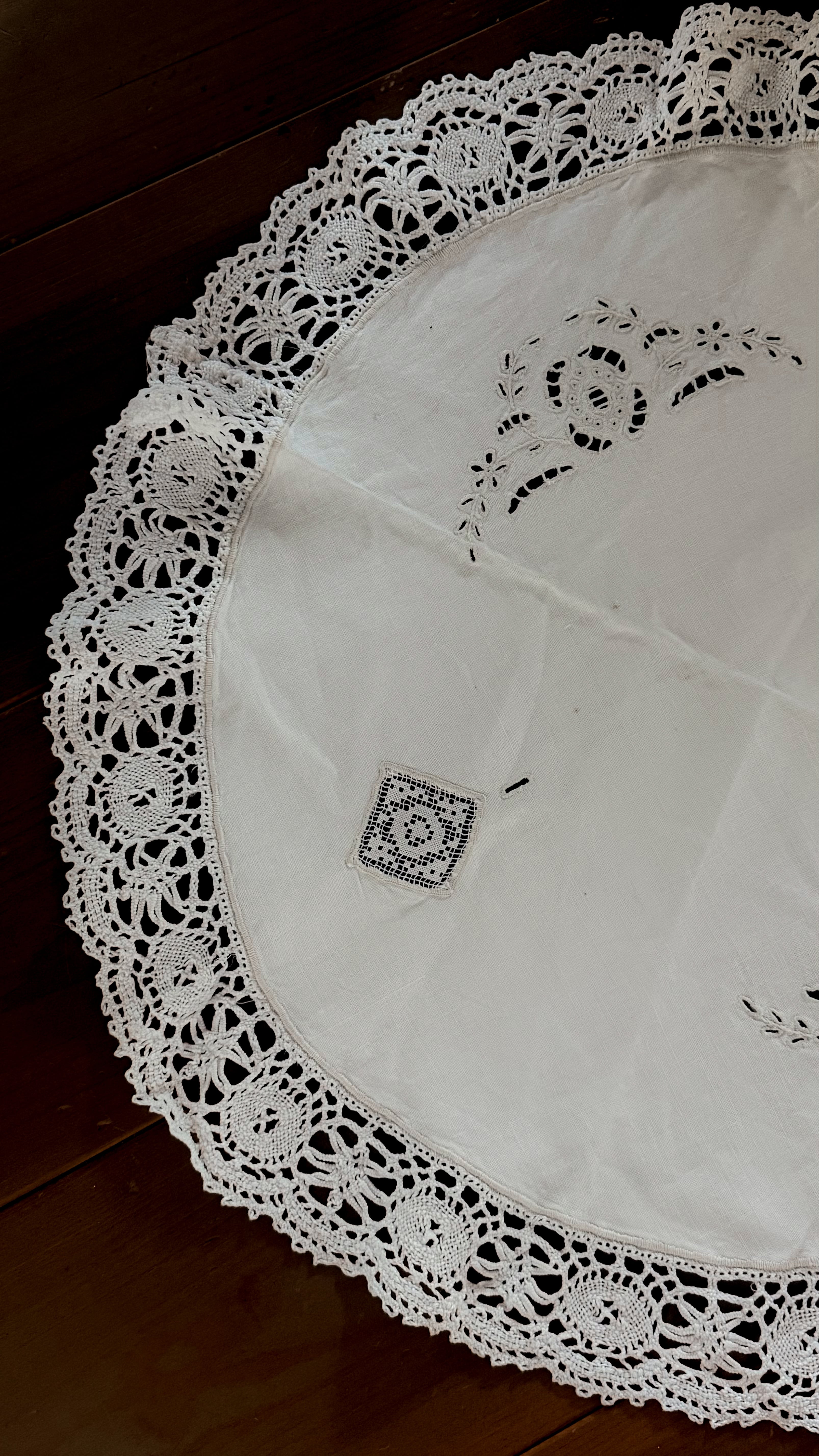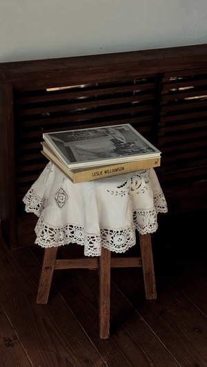 繊細なレースエッジがぐるりと縁取られた、イギリスのヴィンテージテーブルセンター。リズムある模様が、白一色の中にやさかな陰影を生み出しています。中央部分はシンプルに、縁に向かって表情が広がるデザインは、小さなテーブルやスツール、チェストの上などにさらりと敷くだけでとても可愛いです。カゴヤバスケットの上にバサっとかけて目隠しにしても良さそうですね。長い年月を経てきたため、シミや色の揺らぎが見られます。日々の暮らしの中で時を重ねてきた証。ヴィンテージならではの柔らかな雰囲気があり、アンティークのアイテムと自然に馴染みます。時間の跡も含めて愛おしい、と感じてくださる方に。