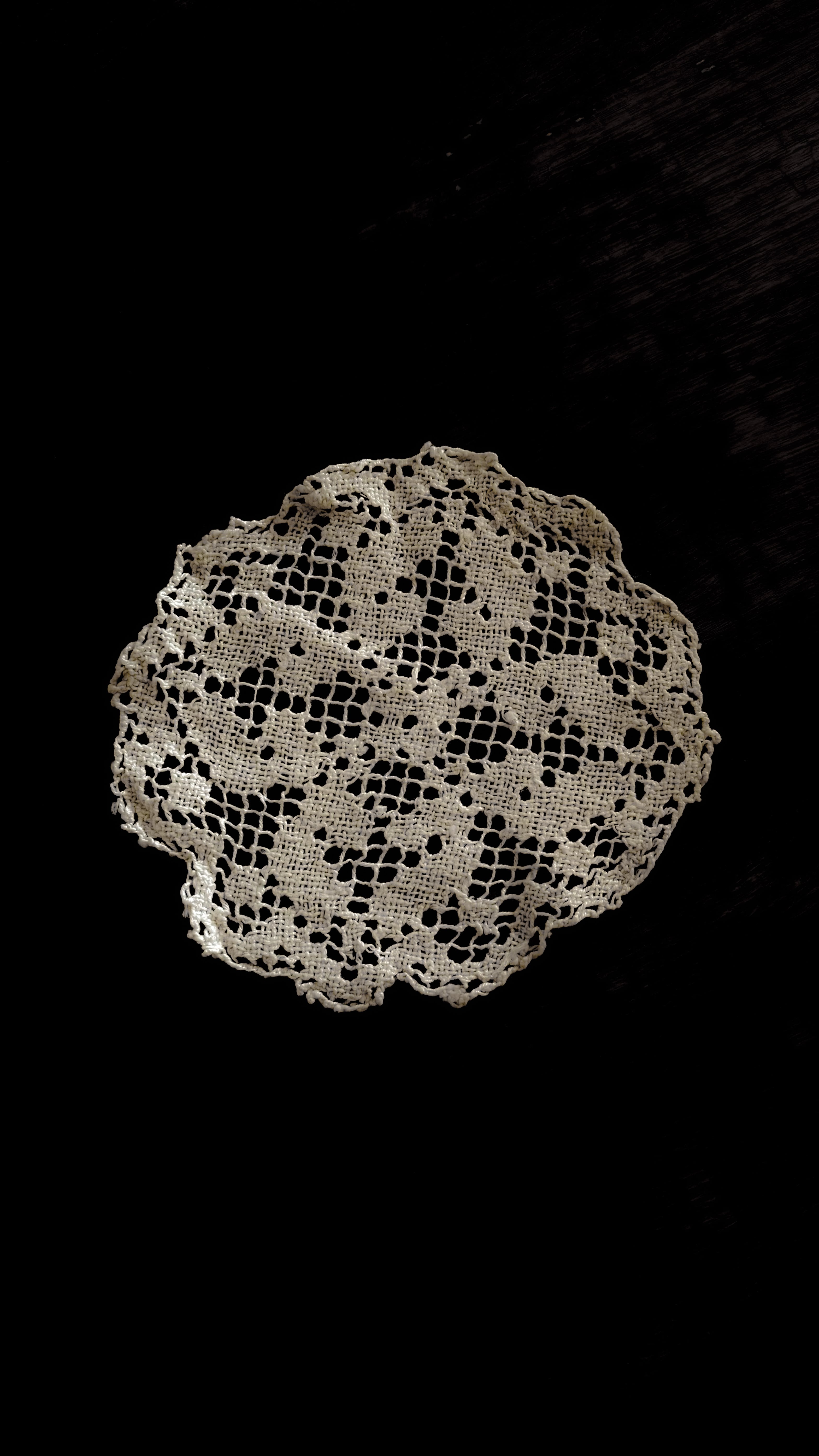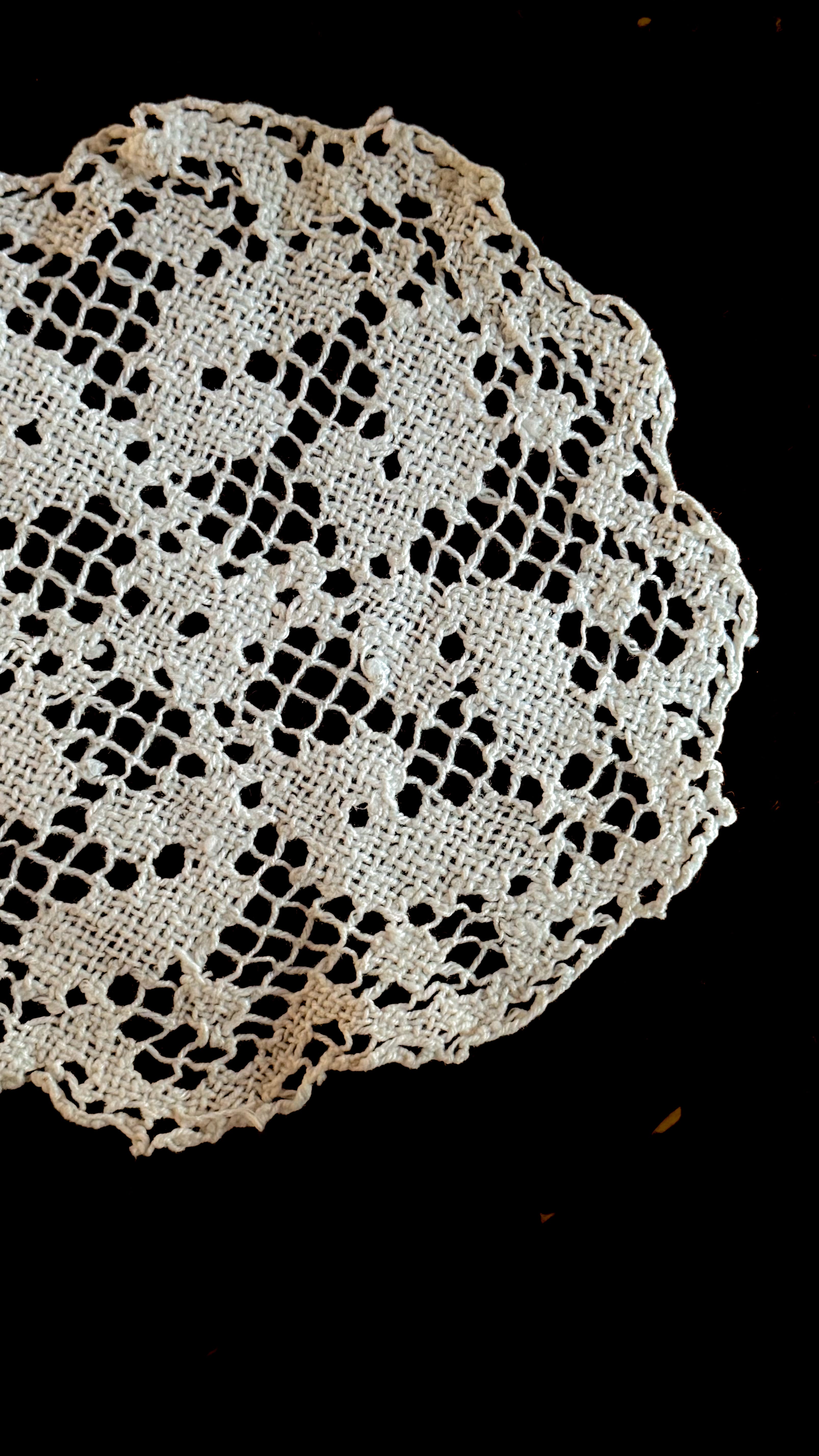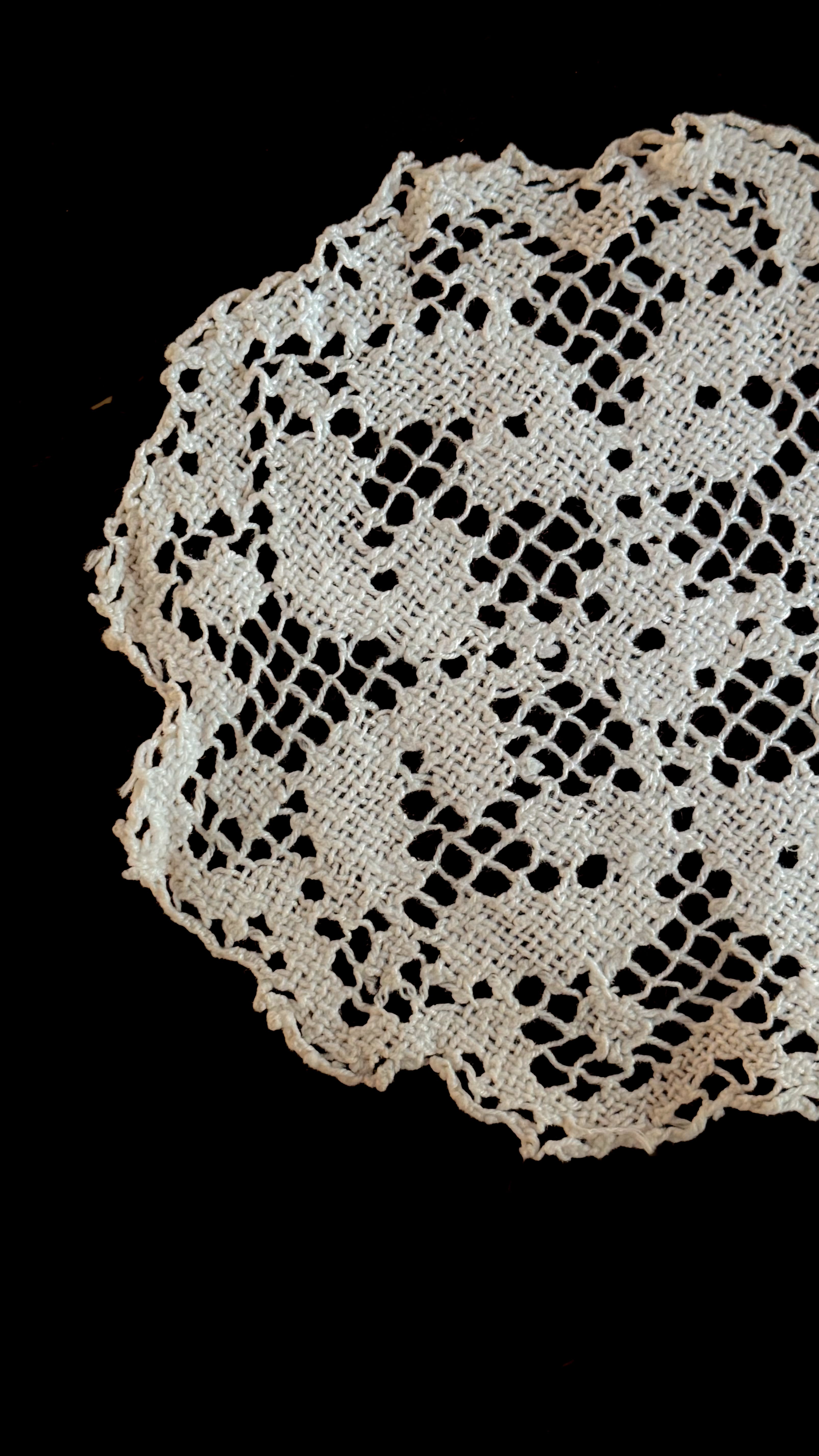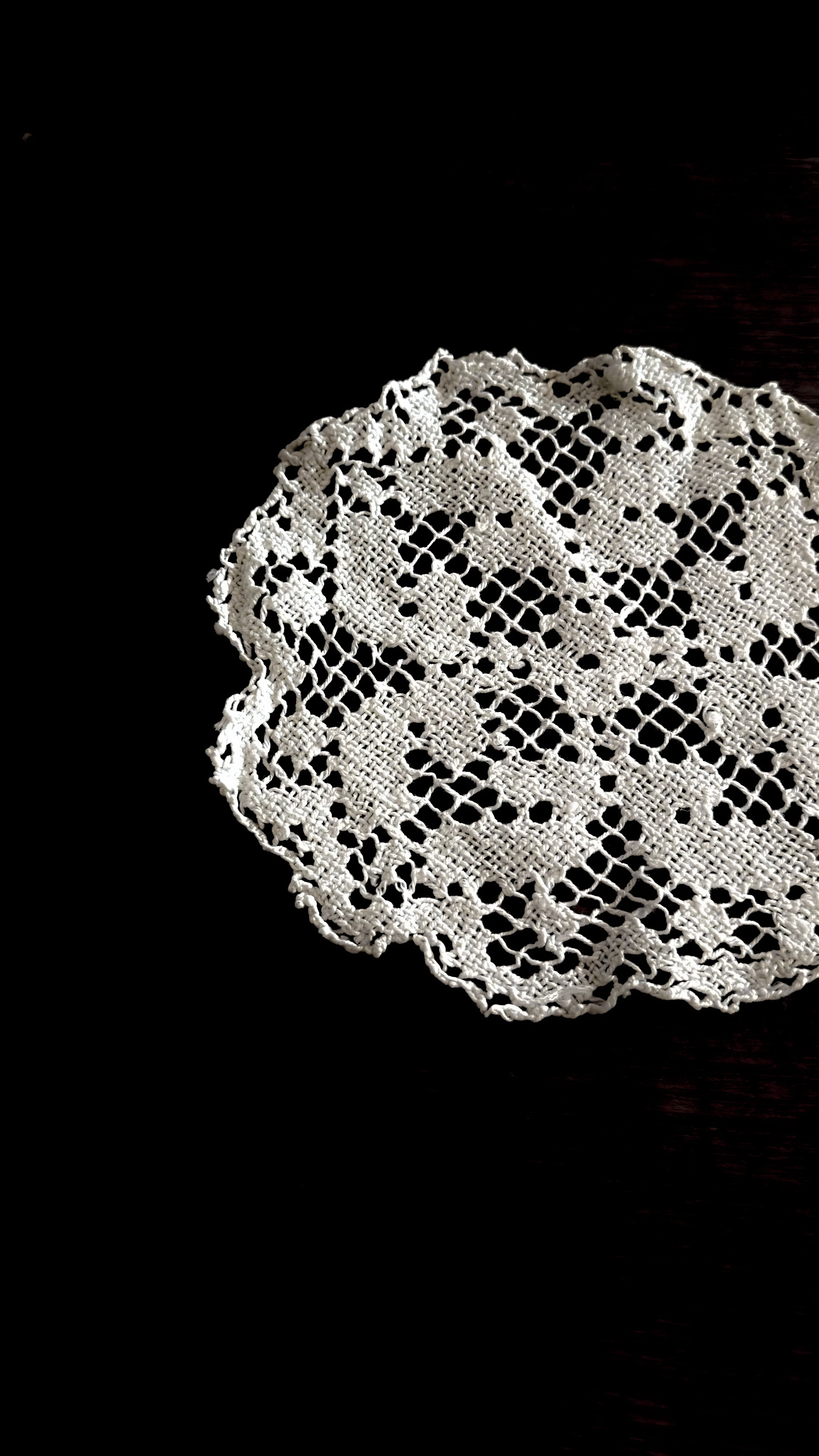 細い糸を一目一目結び、格子状に編み上げられたフィレレースのドイリー。規則正しく並ぶ幾何学的な文様の中に、少しの揺らぎが感じられ、やわらかな表情があります。真っ白ではない薄いアイボリーの色合いも、年月を経たレースならではの落ち着いた美しさ。小さなテーブルやサイドボードの上に敷いたり、花器やオブジェの下に重ねたり。空間にそっと余白と静けさを添えてくれる存在。日常の中で、さりげなく時を重ねた美しさを感じていただけたら嬉しい一枚です。ヴィンテージ品のため、多少の歪みや経年による表情の変化が見られる場合がありますが、それもまた、このドイリーが歩んできた時間の一部としてお楽しみください。