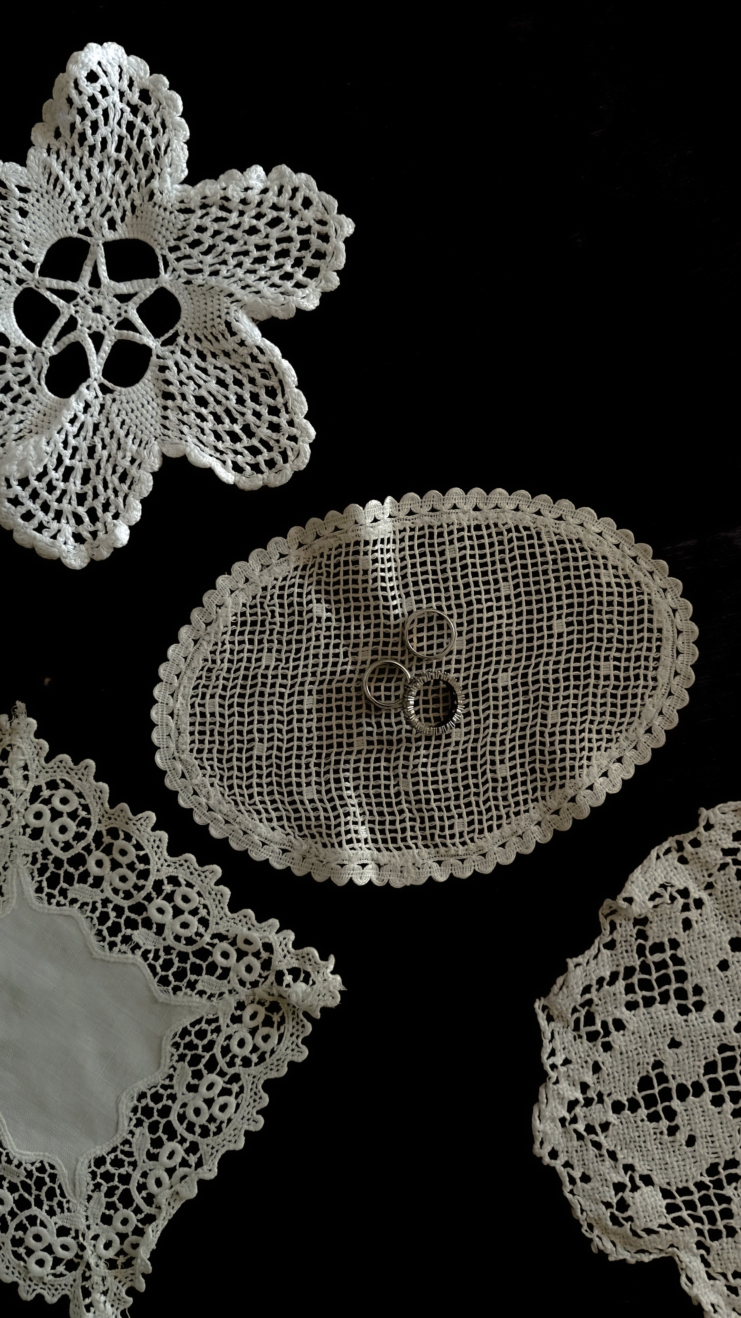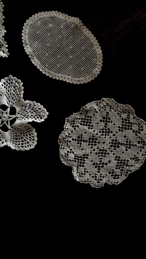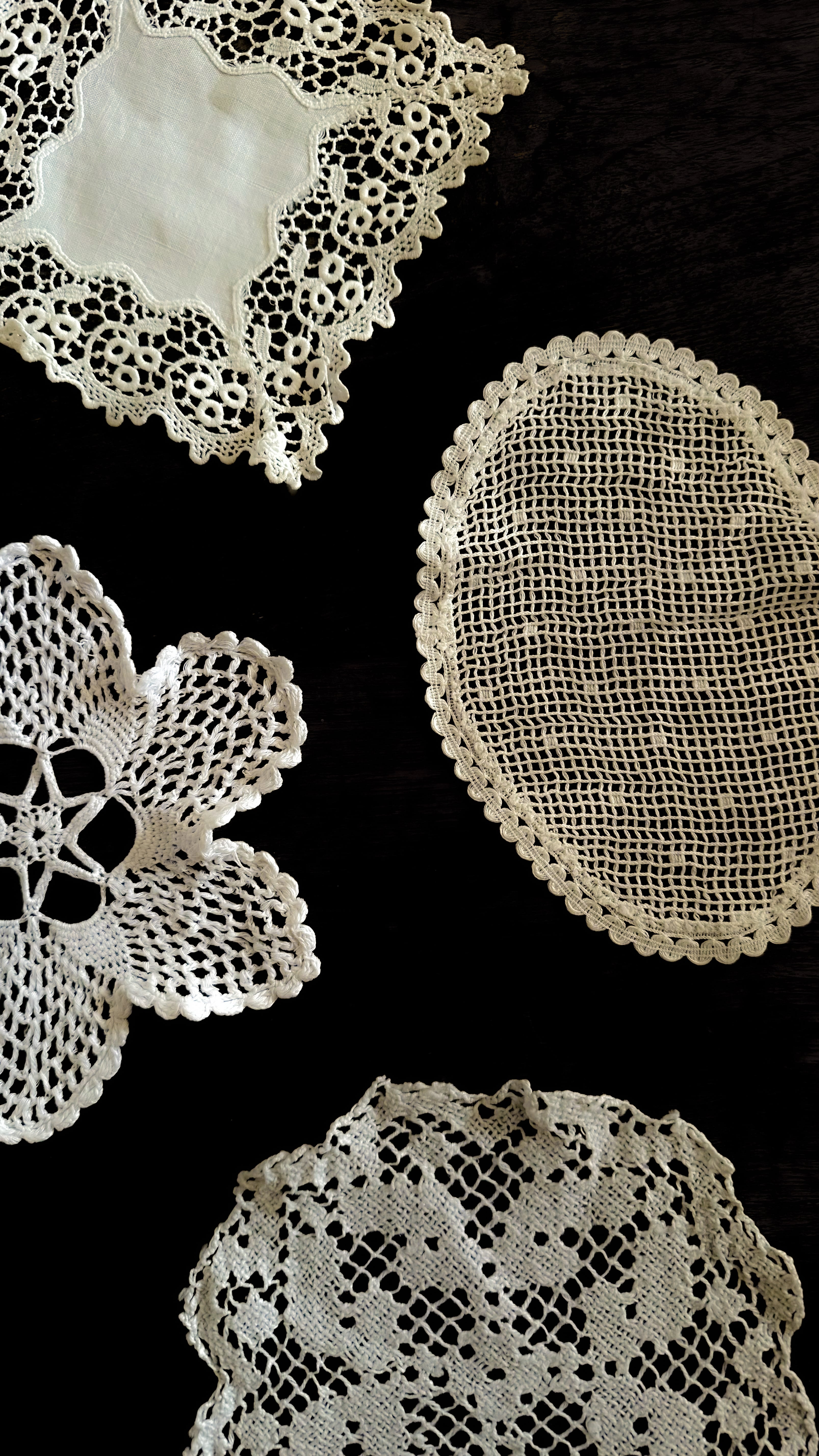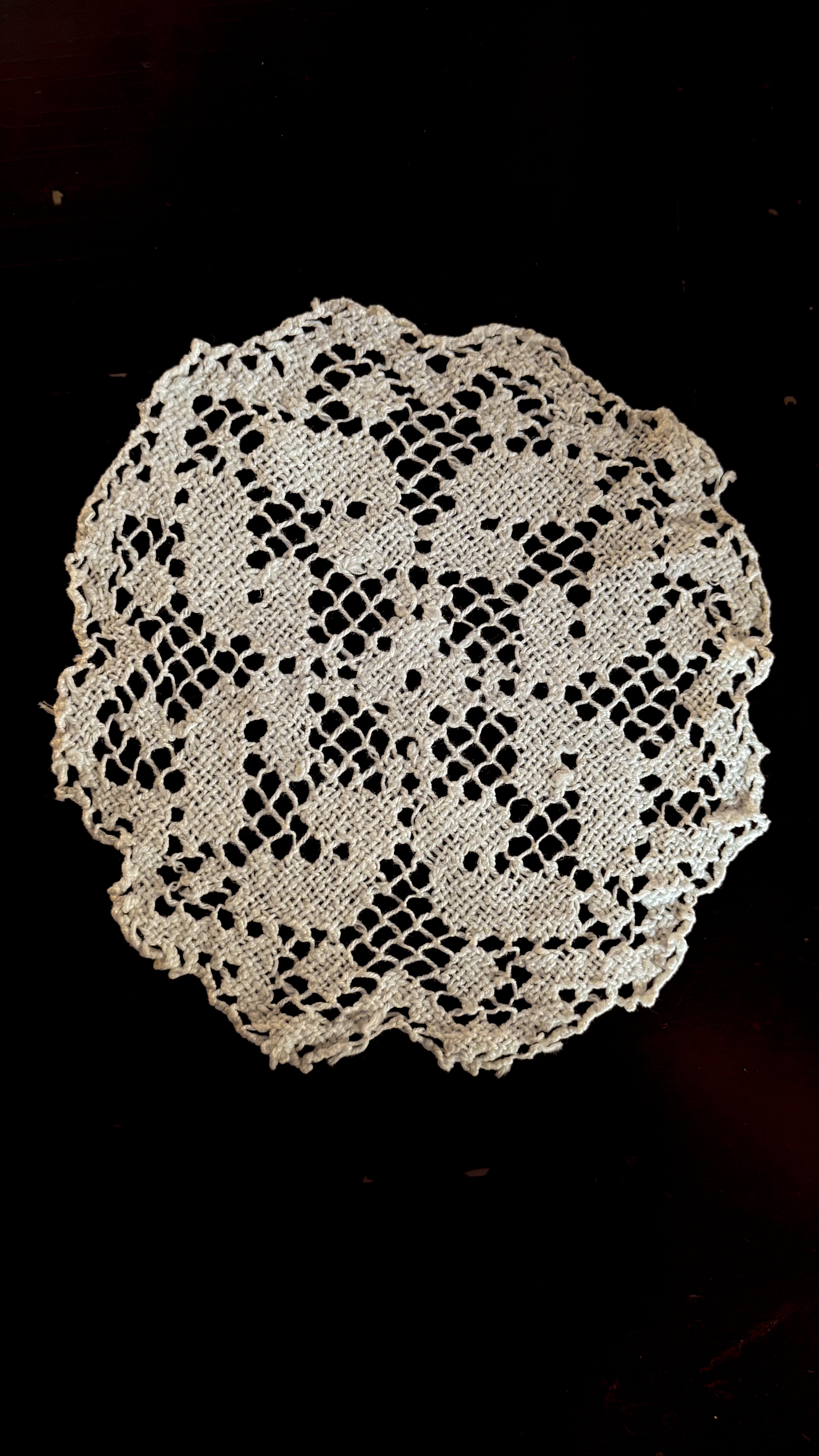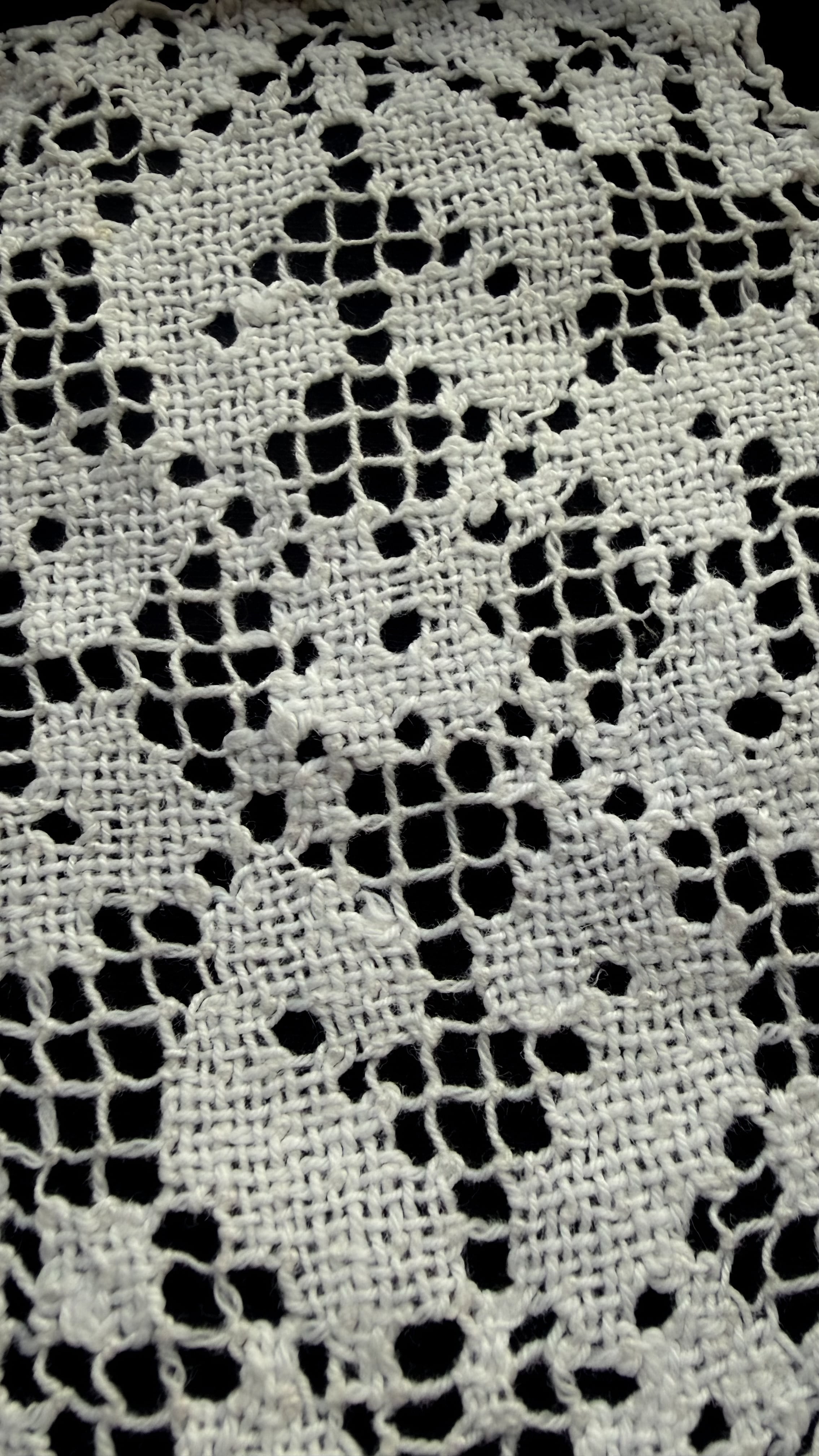 細い糸を一目一目結び、格子状に編み上げられたフィレレースのドイリー。規則正しく並ぶ幾何学的な文様の中に、少しの揺らぎが感じられ、やわらかな表情があります。真っ白ではない薄いアイボリーの色合いも、年月を経たレースならではの落ち着いた美しさ。小さなテーブルやサイドボードの上に敷いたり、花器やオブジェの下に重ねたり。空間にそっと余白と静けさを添えてくれる存在。日常の中で、さりげなく時を重ねた美しさを感じていただけたら嬉しい一枚です。ヴィンテージ品のため、多少の歪みや経年による表情の変化が見られる場合がありますが、それもまた、このドイリーが歩んできた時間の一部としてお楽しみください。