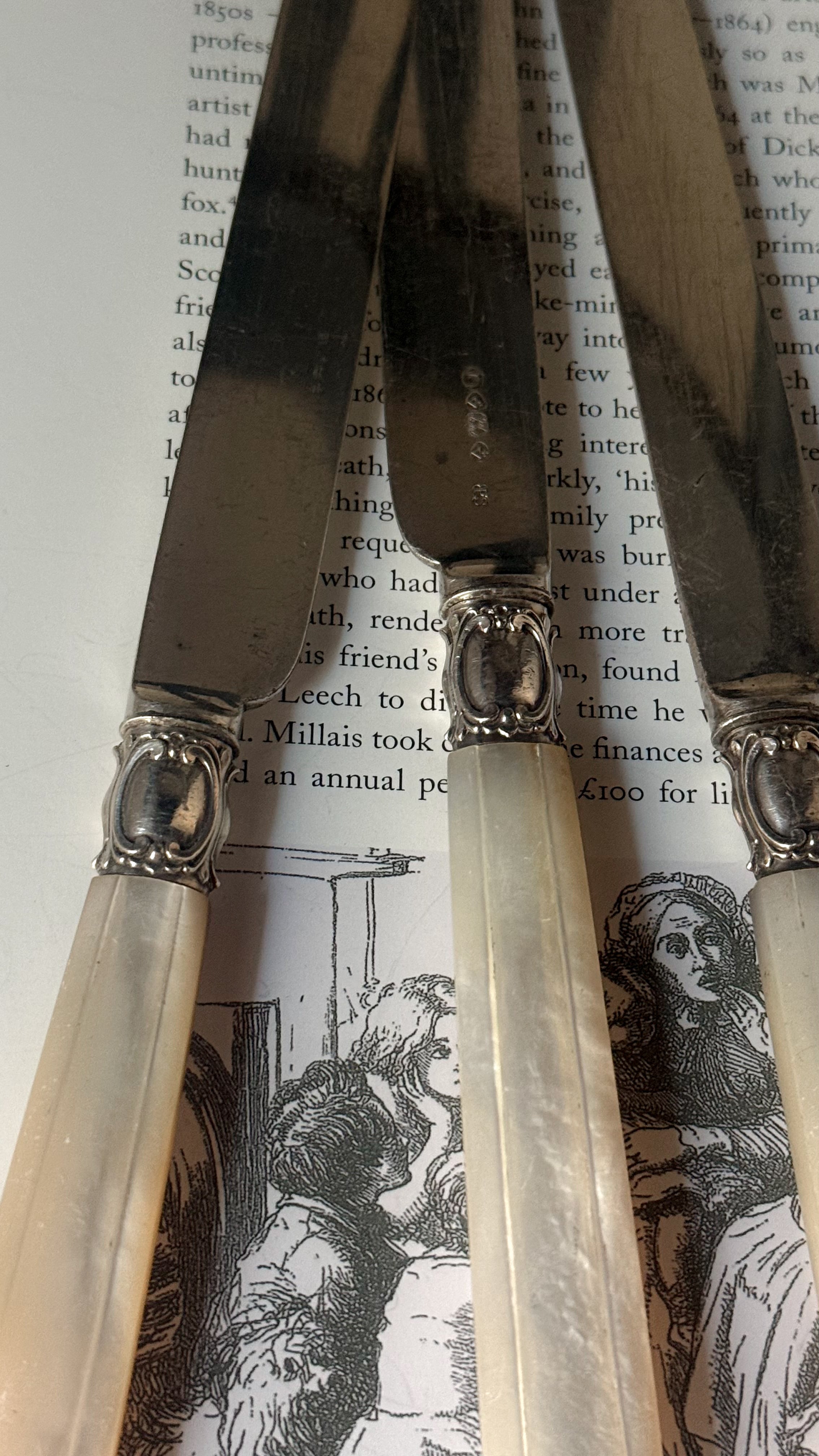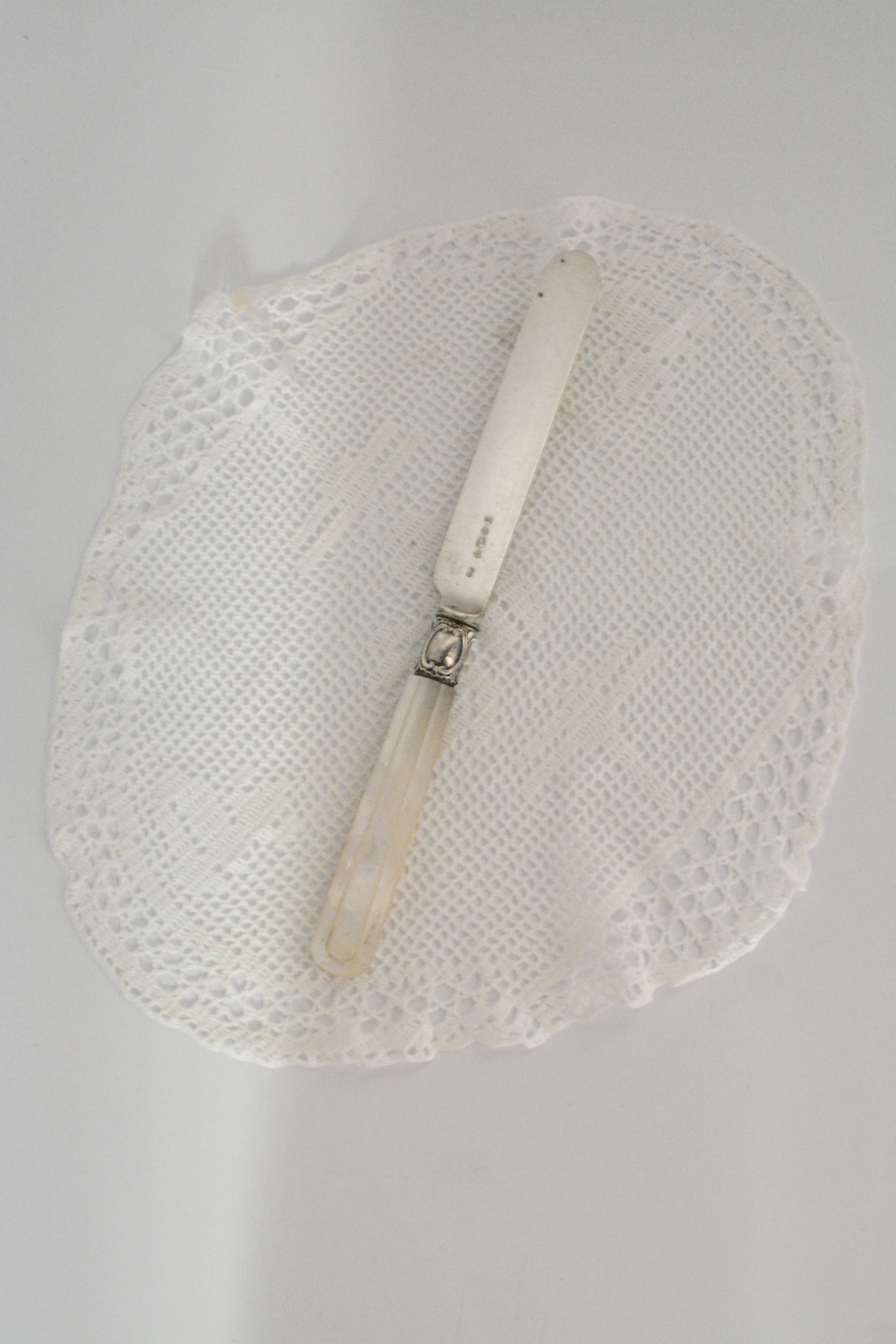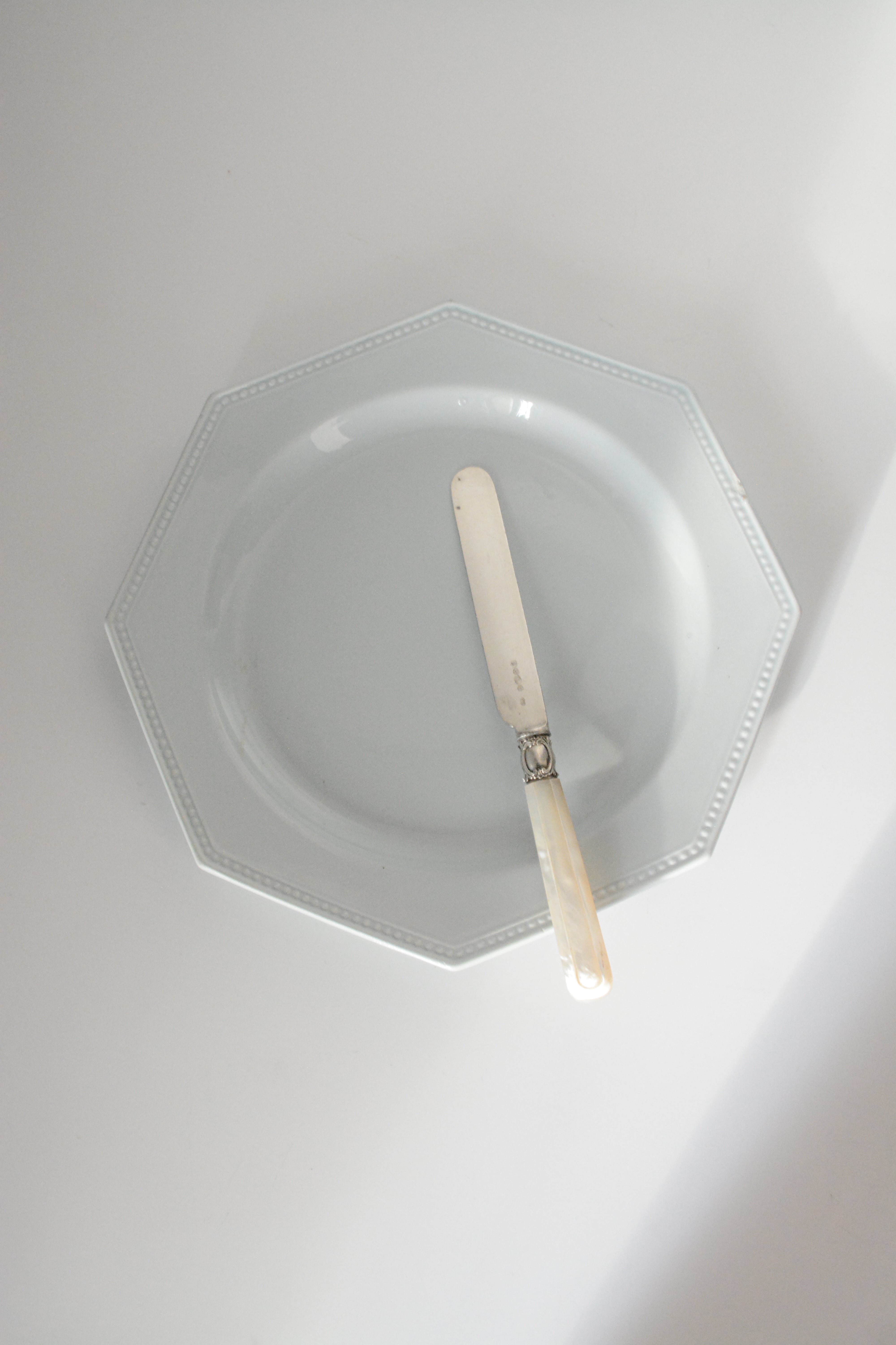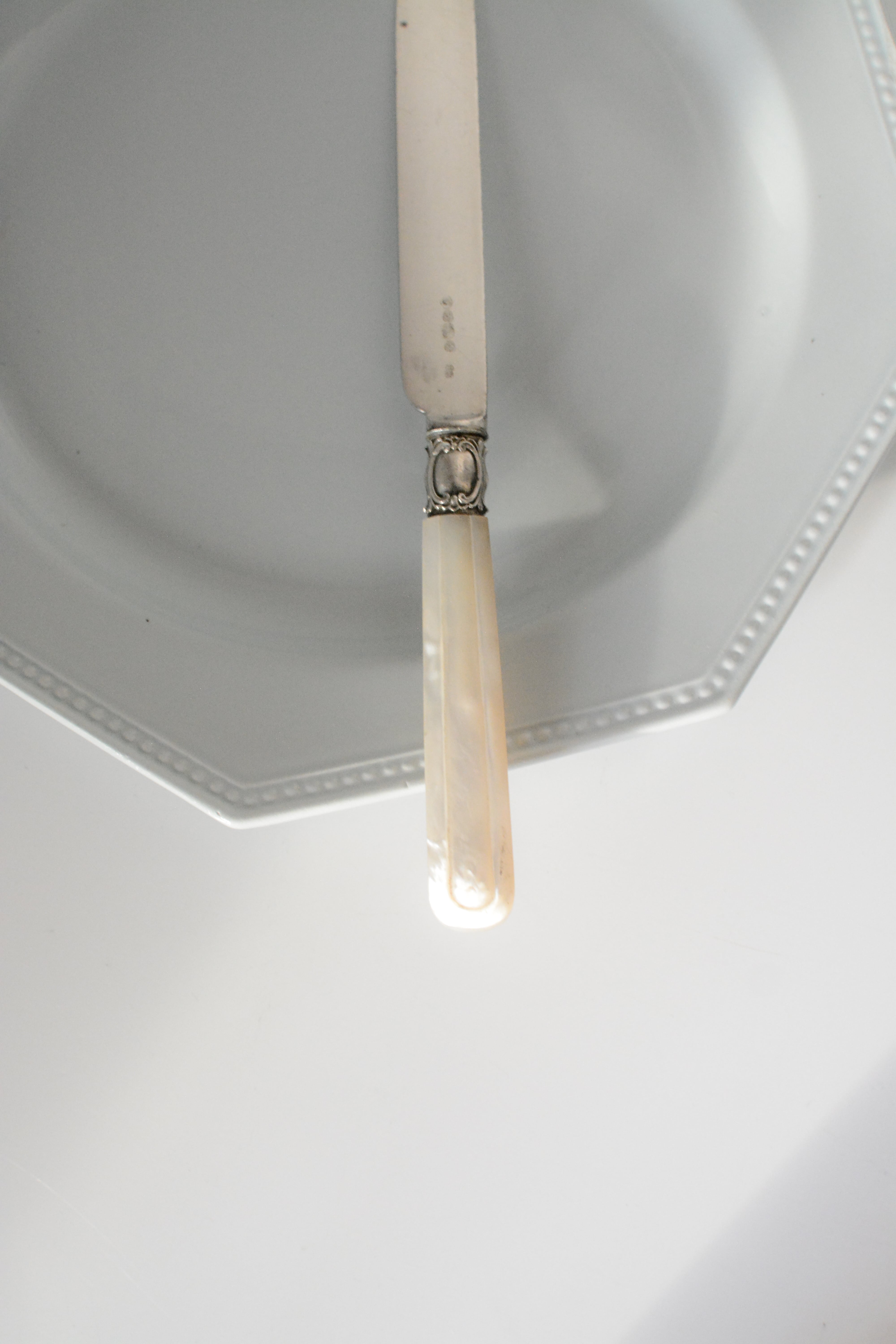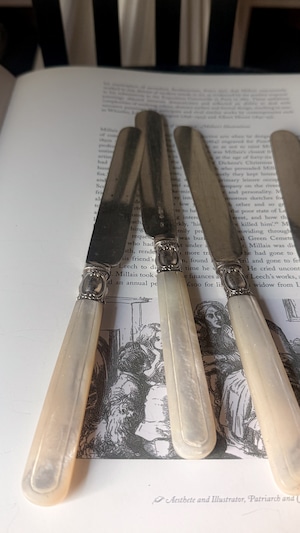 19世紀後期頃のイギリス製のナイフ。やわらかな虹色の光を含んだマザーオブパールのハンドルは、一点ずつ丁寧に彫りが施され、上品で静かな佇まいを感じさせます。ケーキや果物、アフタヌーンティーの時間などでかつて使われていたのでしょうか、華美すぎず、それでいて手元を美しく見せてくれる美しいデザインで、テーブルスタイリングやディスプレイにもおすすめです。経年変化がみられ、使われながら受け継がれてきた時間の痕跡を、そのまま愉しんでいただける一本です。複数在庫ございますので、セレクトしてのお届けとなります。