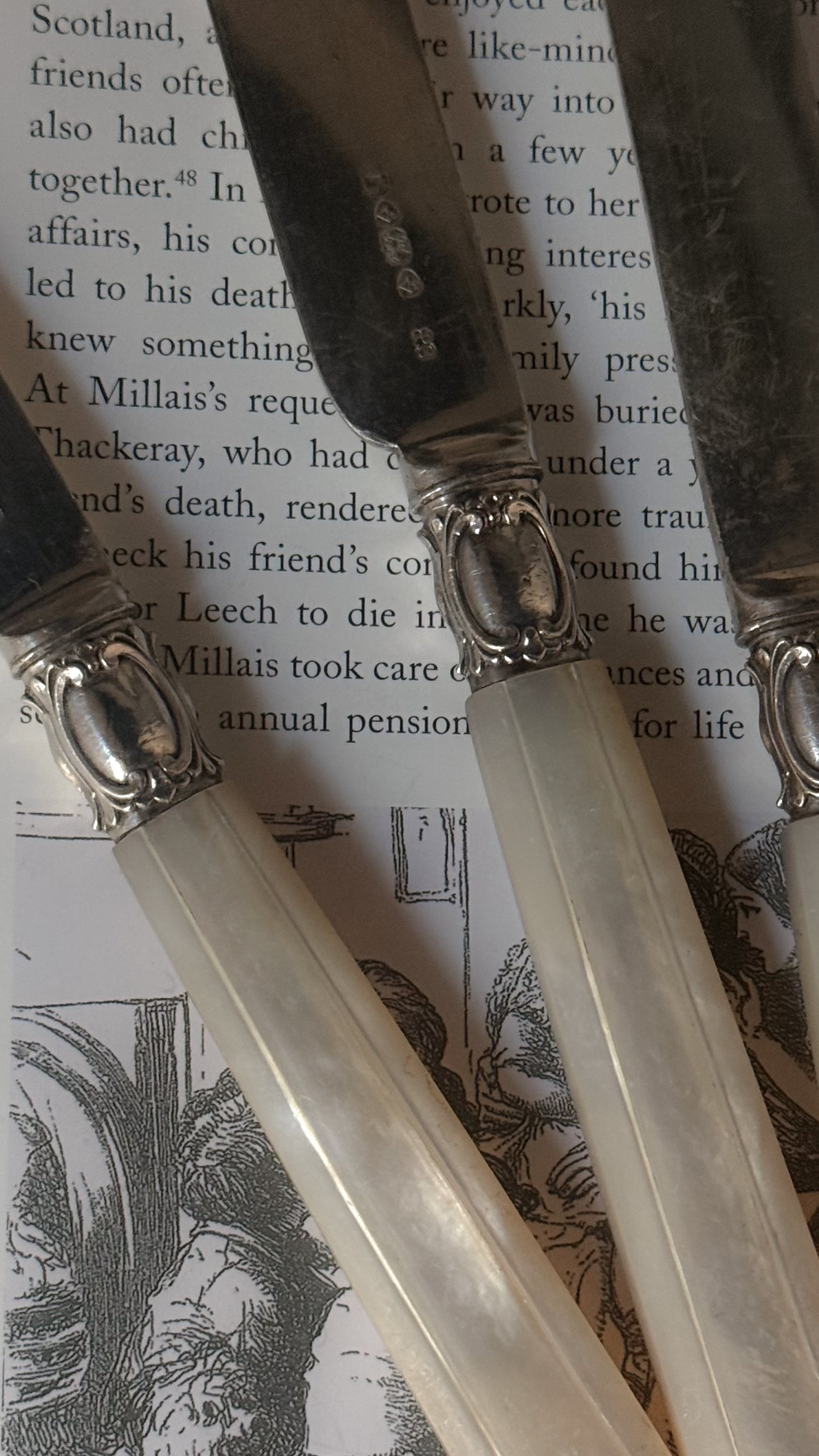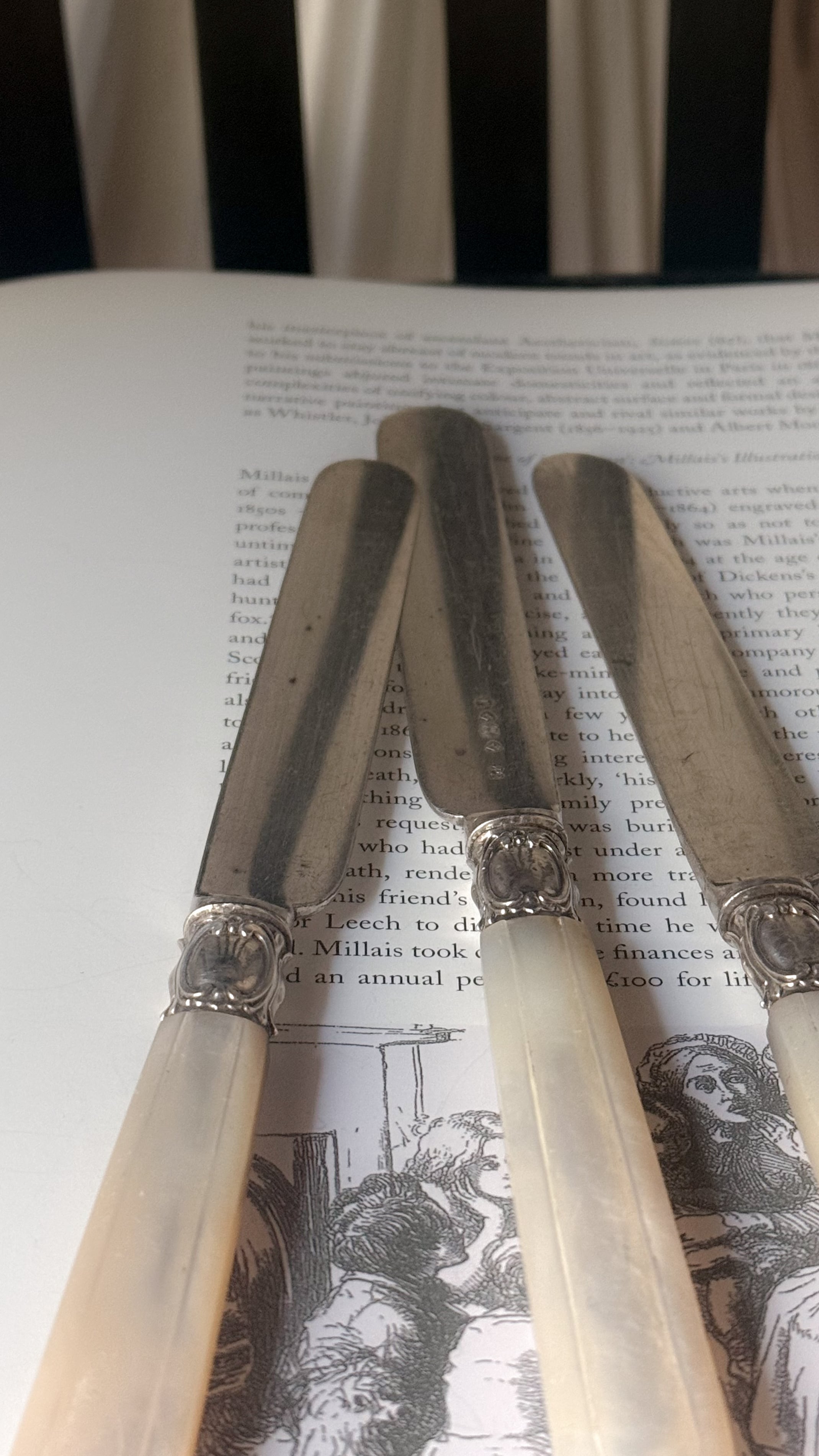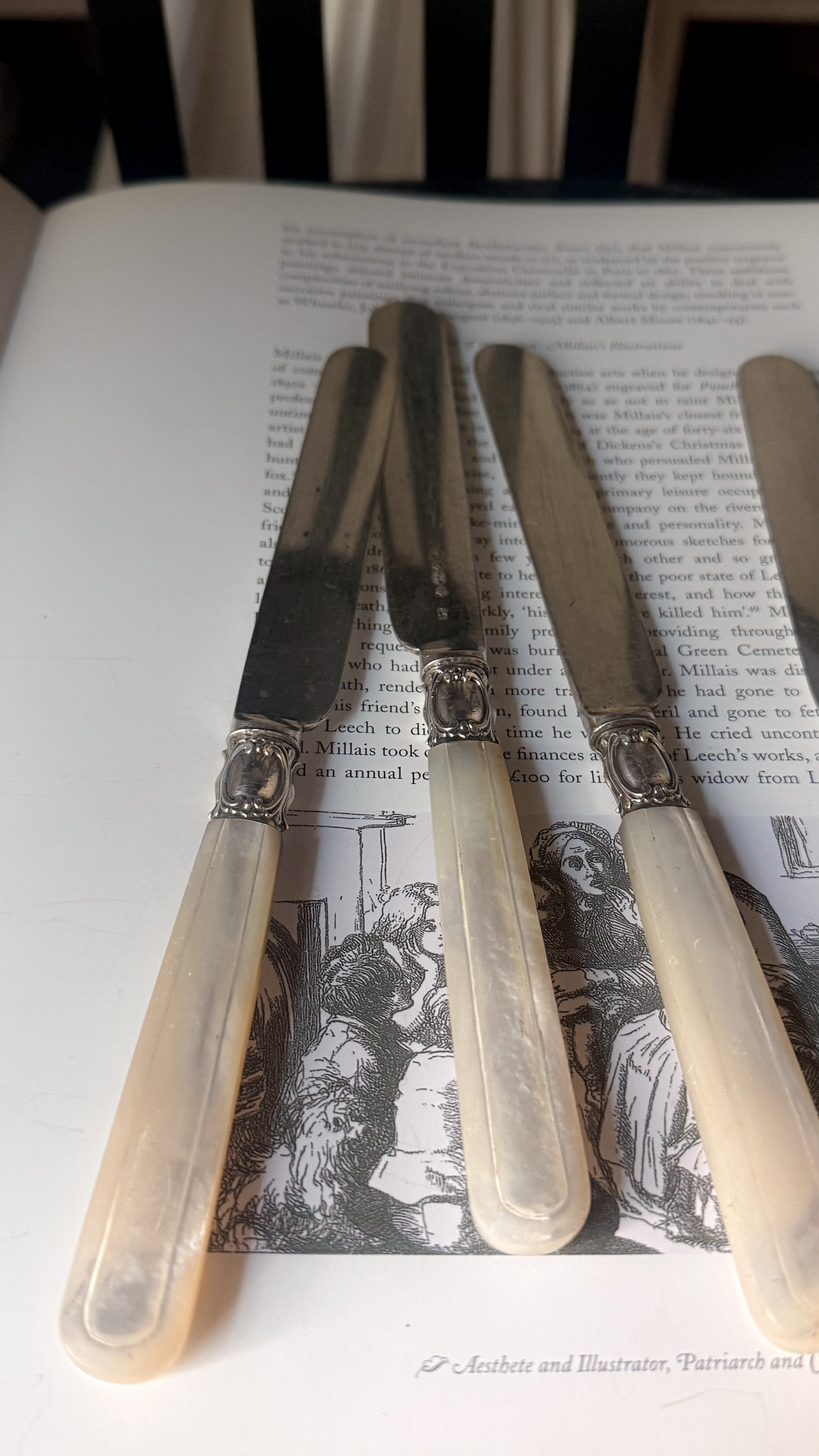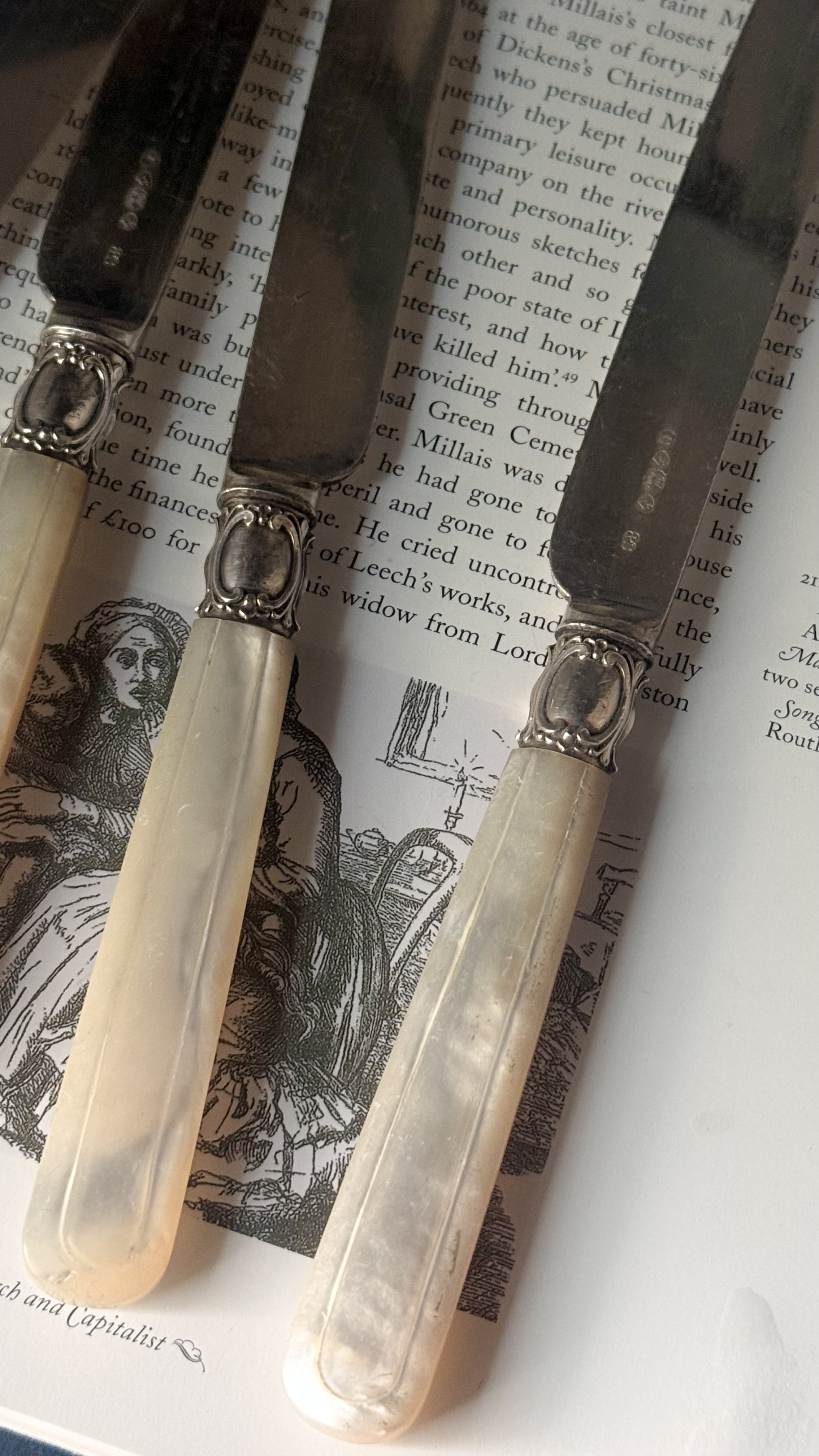 19世紀後期頃のイギリス製のナイフ。やわらかな虹色の光を含んだマザーオブパールのハンドルは、一点ずつ丁寧に彫りが施され、上品で静かな佇まいを感じさせます。ケーキや果物、アフタヌーンティーの時間などでかつて使われていたのでしょうか、華美すぎず、それでいて手元を美しく見せてくれる美しいデザインで、テーブルスタイリングやディスプレイにもおすすめです。経年変化がみられ、使われながら受け継がれてきた時間の痕跡を、そのまま愉しんでいただける一本です。複数在庫ございますので、セレクトしてのお届けとなります。