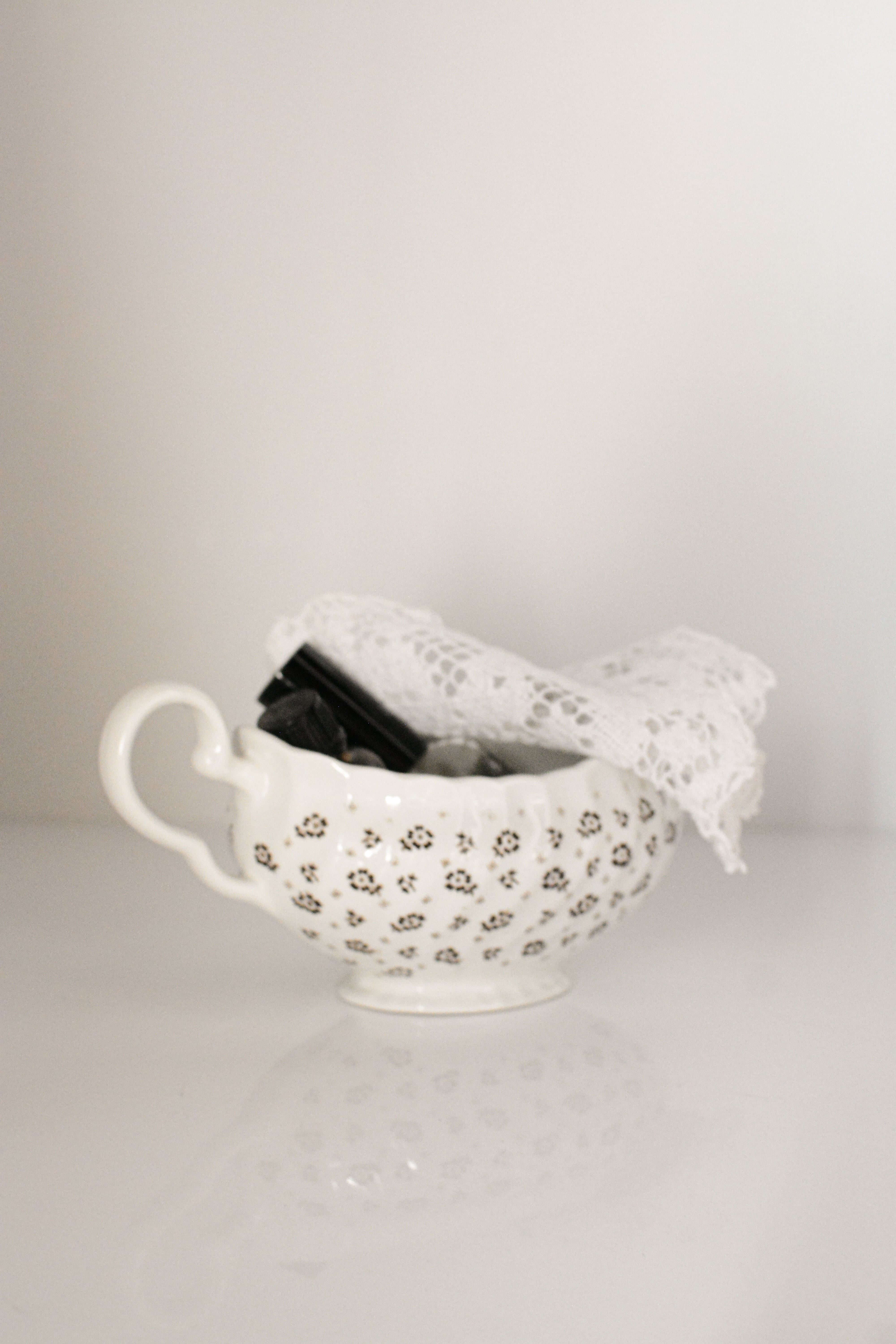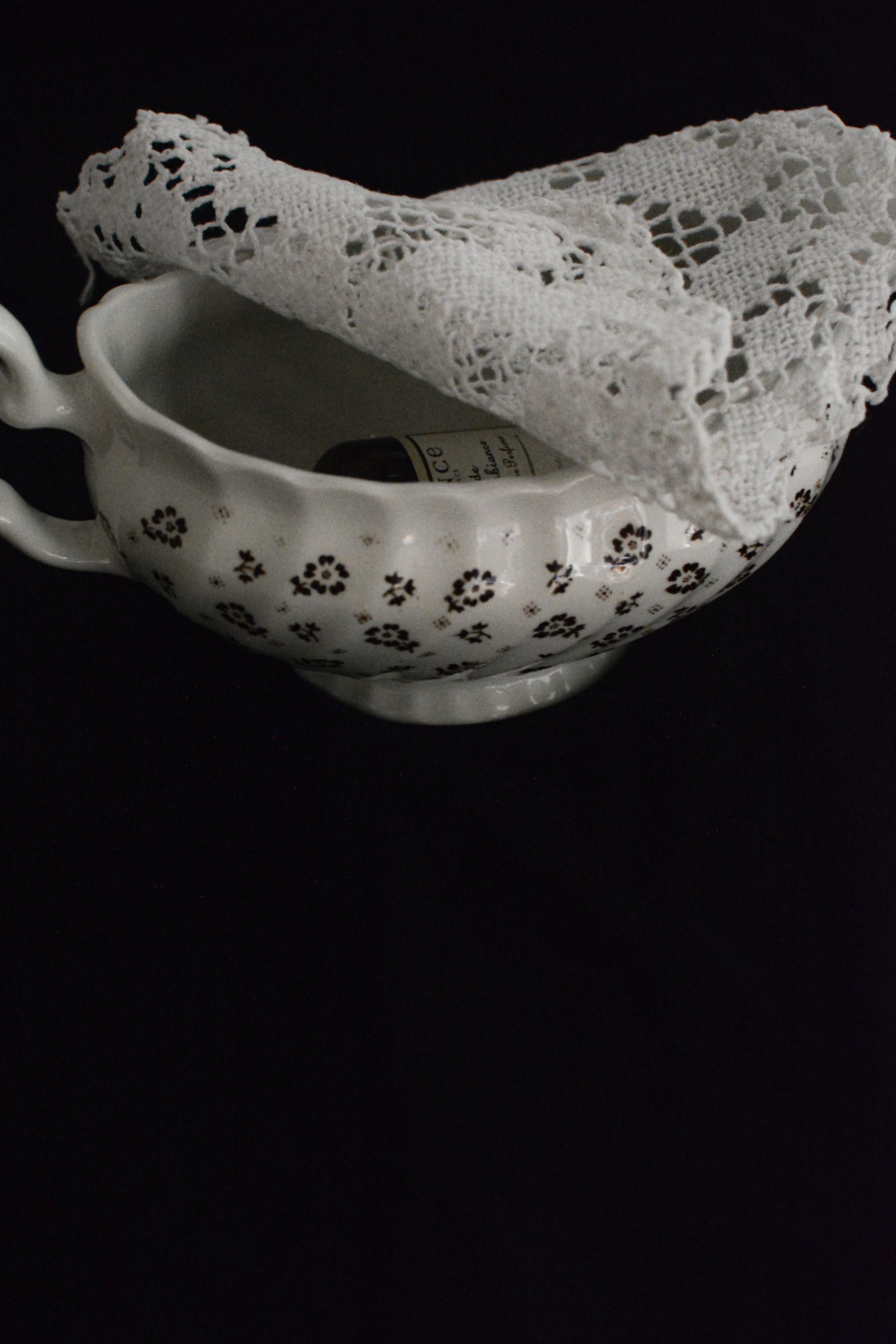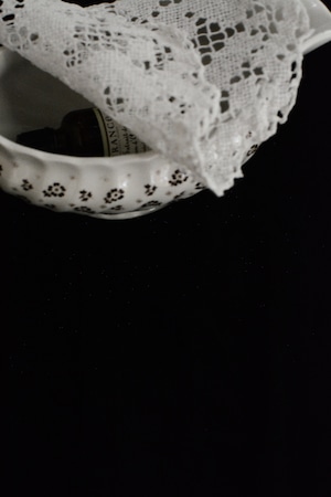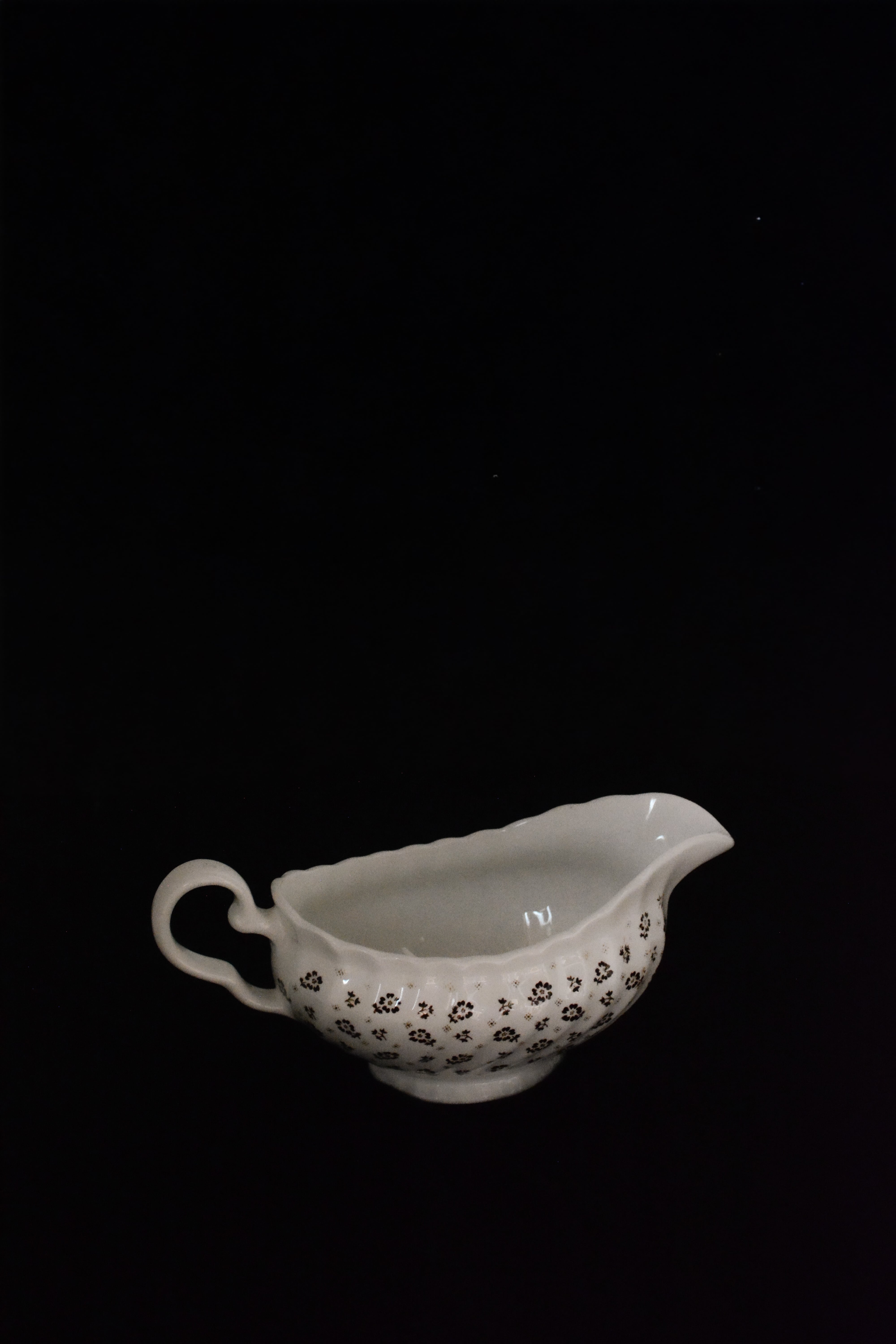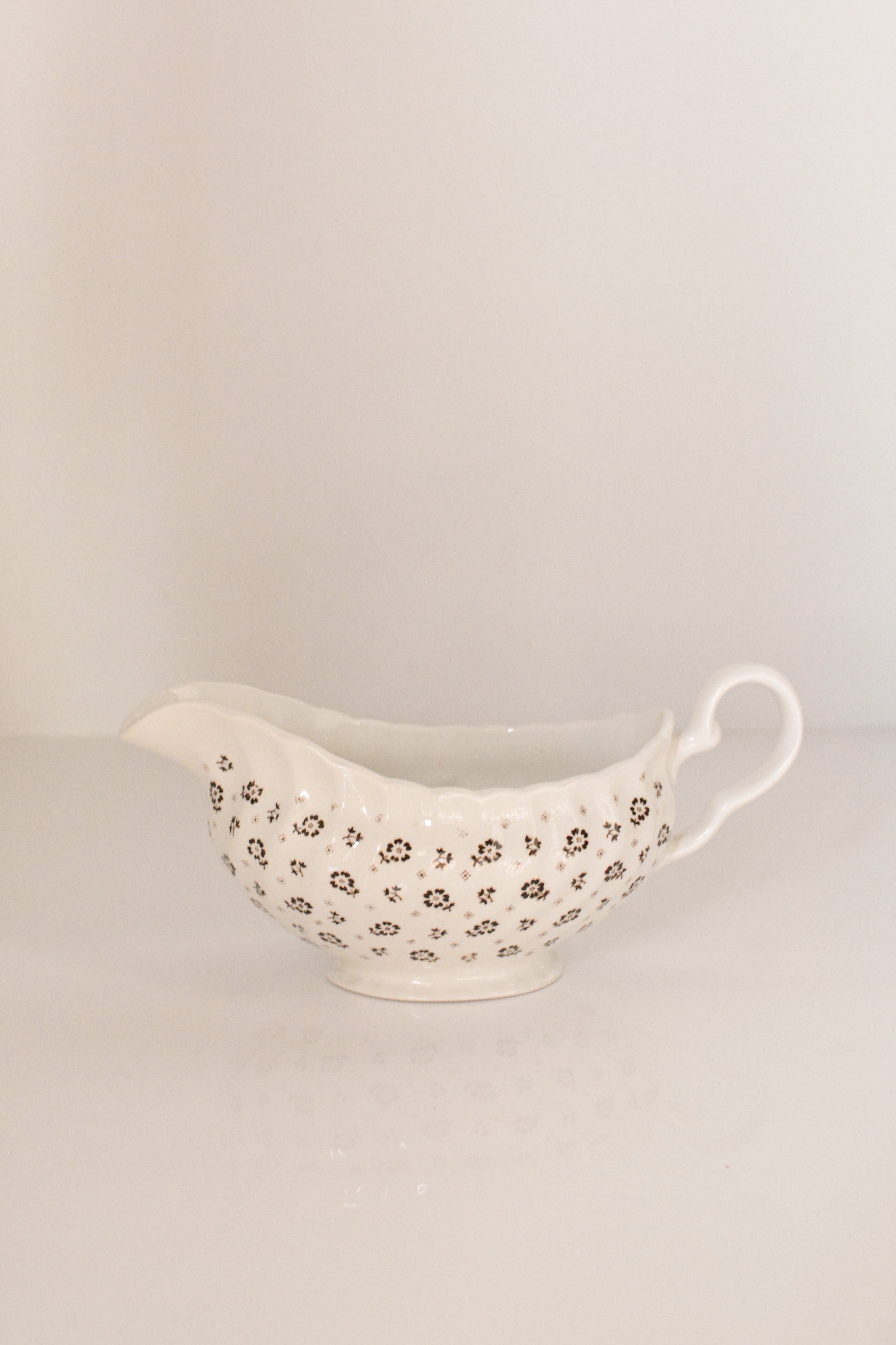 イギリスヴィンテージのソースボート。やわらかなクリームホワイトの地に、小さなブラウンの小花模様が散りばめられ、素朴さと可憐さをあわせ持ったデザイン。外側には繊細なレリーフ装飾、縁はゆるやかな波型になっており、さりげない華やかさを添えてくれます。ソースやドレッシングに使われていたかと思いますますが、お花をいけたり、キャンディやチョコレートを入れてテーブルコーディネートのアクセントとしても活躍します。春には球根植物や小さなグリーンを合わせたり、花器のように使うのもおすすめ。ポプリを入れて香りを楽しんだりとアレンジが楽しいお品です。