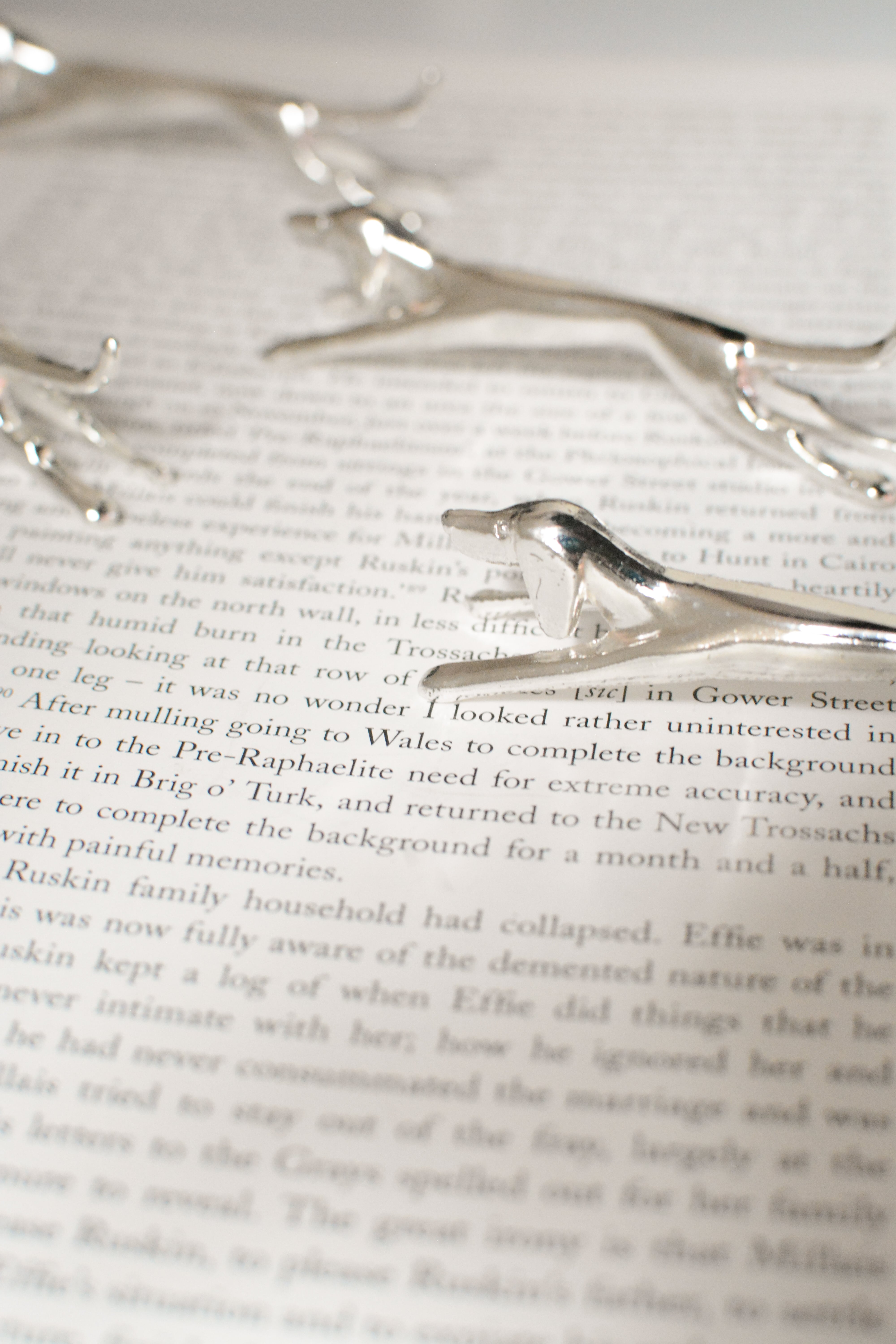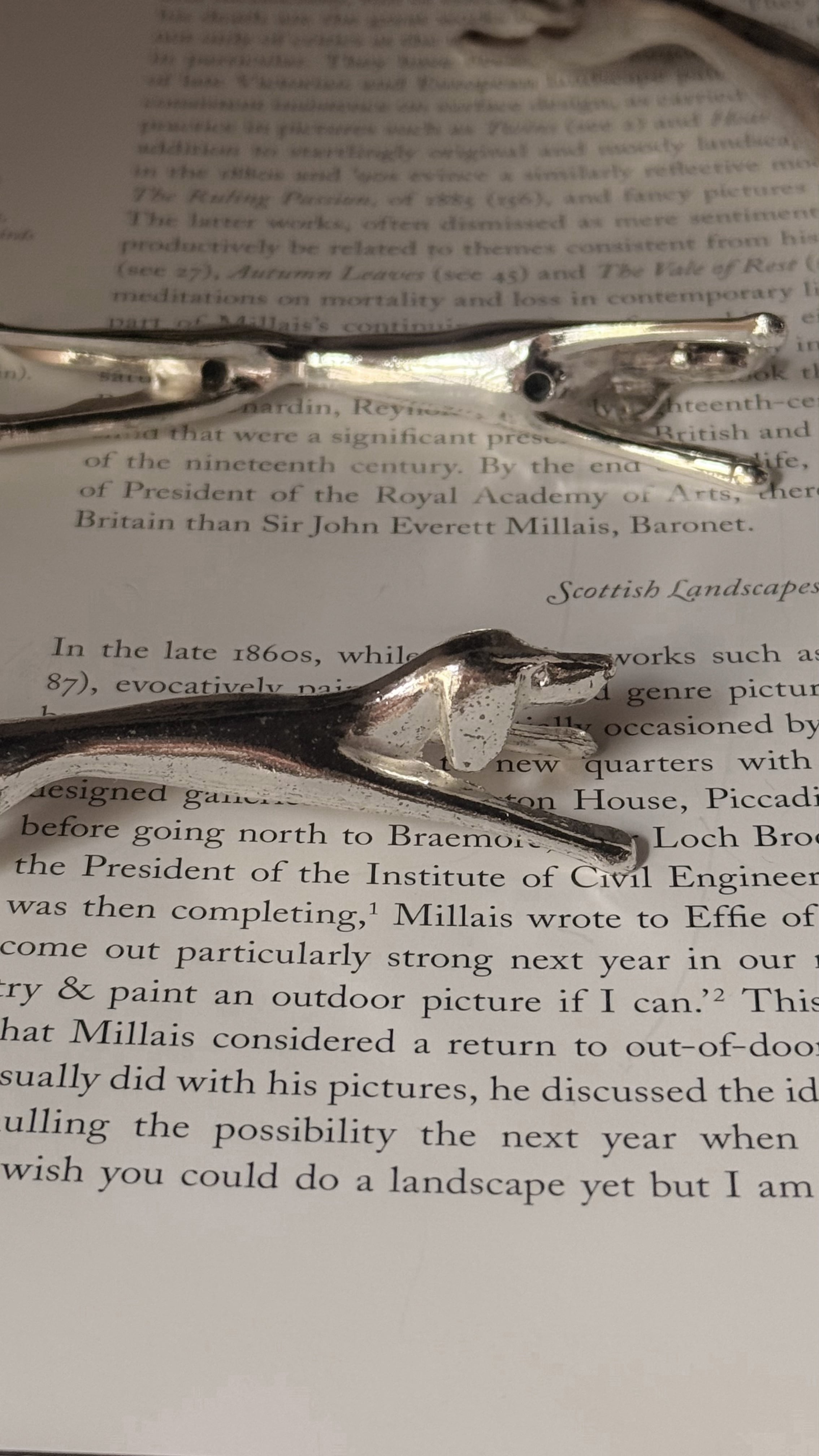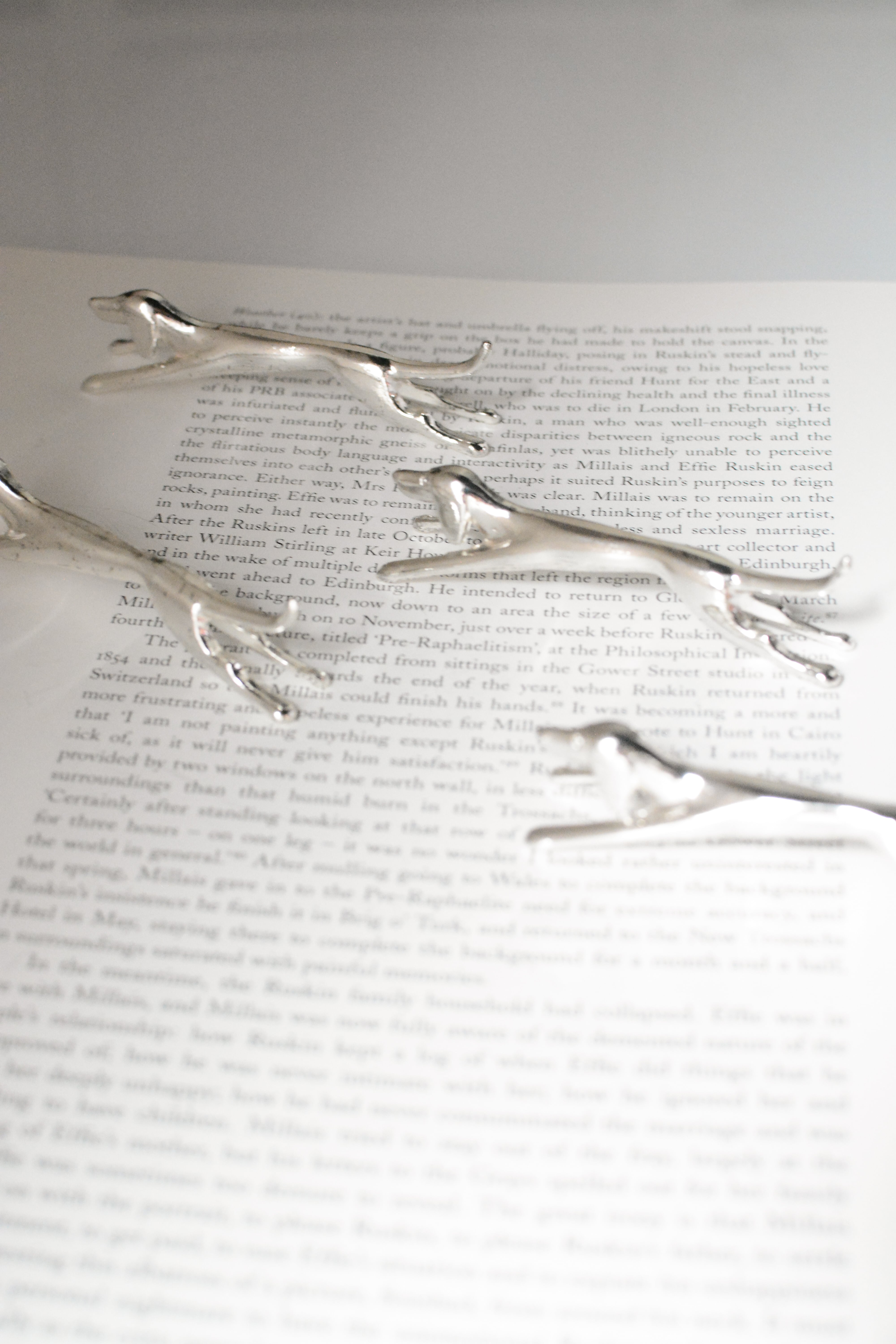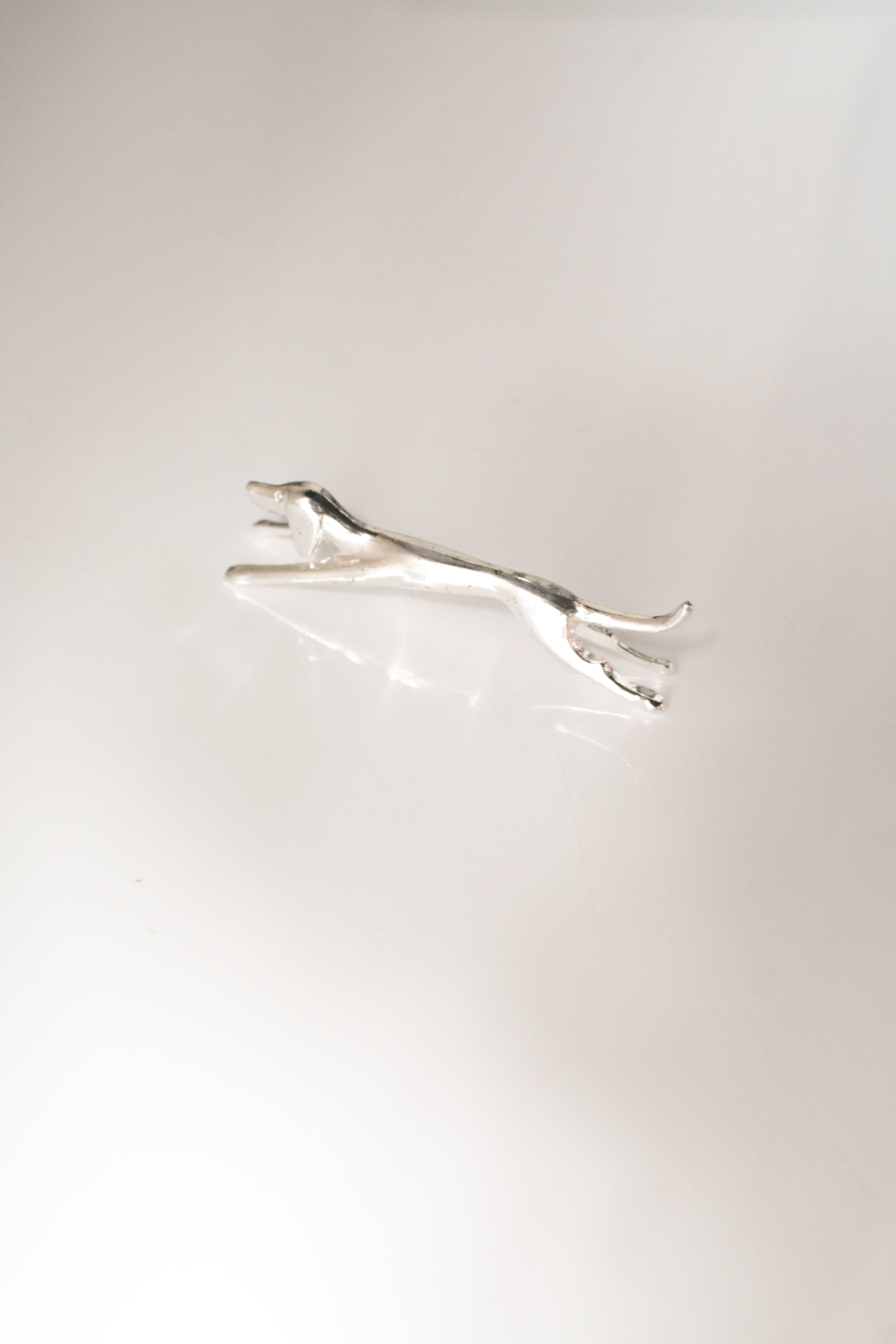 元気よく走っているような姿が愛らしすぎる、ドッグモチーフのカトラリーレストです。すっと伸びた体のラインや小さな耳の造形が可愛らしく、テーブルの上に置くだけで、どこか楽しげで軽やかな空気を添えてくれます。小さなオブジェのような存在感があり、使わない時間も眺めていたくなる佇まいですね。丁寧に鋳造されたつくりで、経年変化を経たシルバープレートならではのやわらかな光沢があります。経年変化による風合いも一つ一つに個性を与えていて、深みのある雰囲気です。複数個ございますので、セレクトしてのお届けとなります。