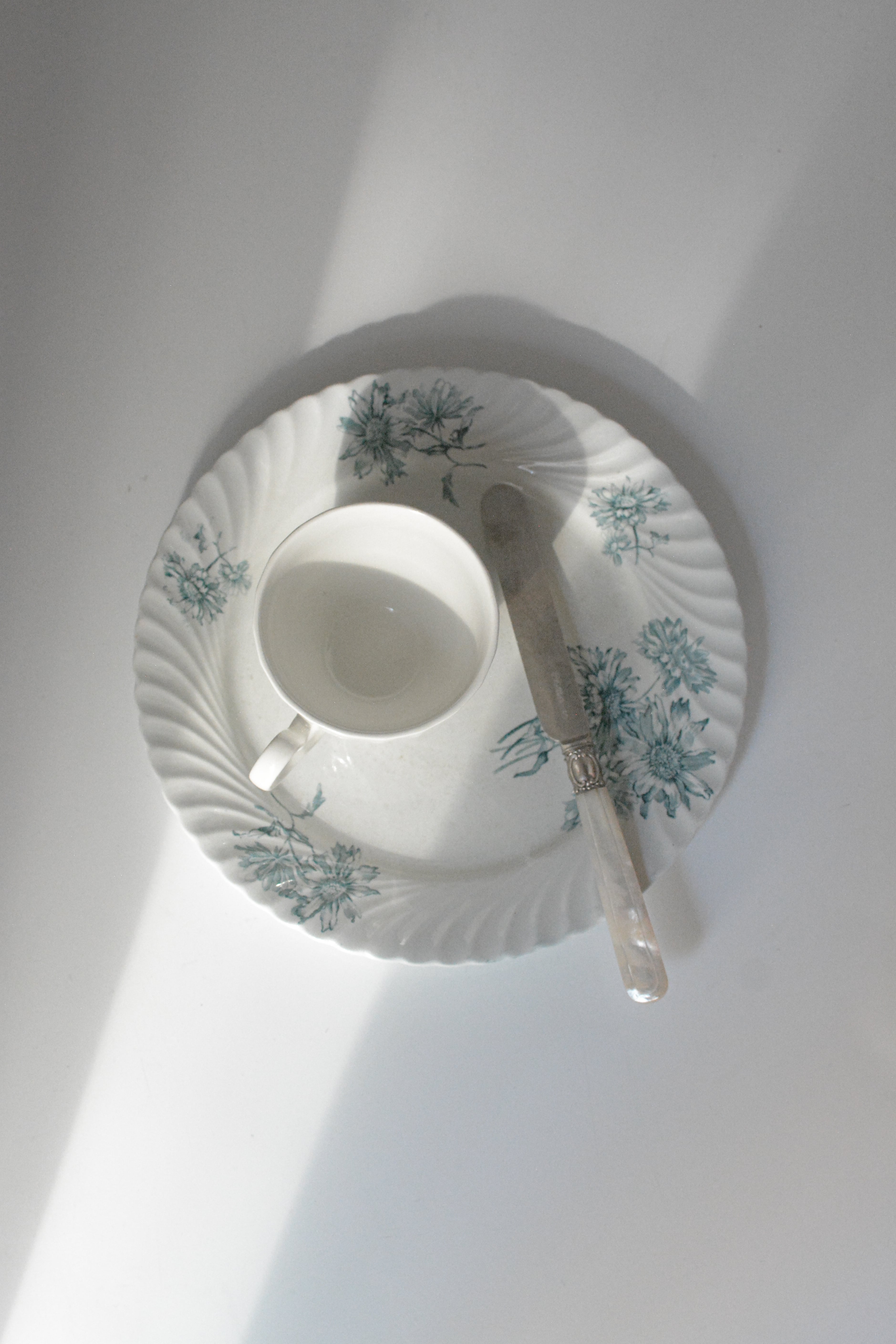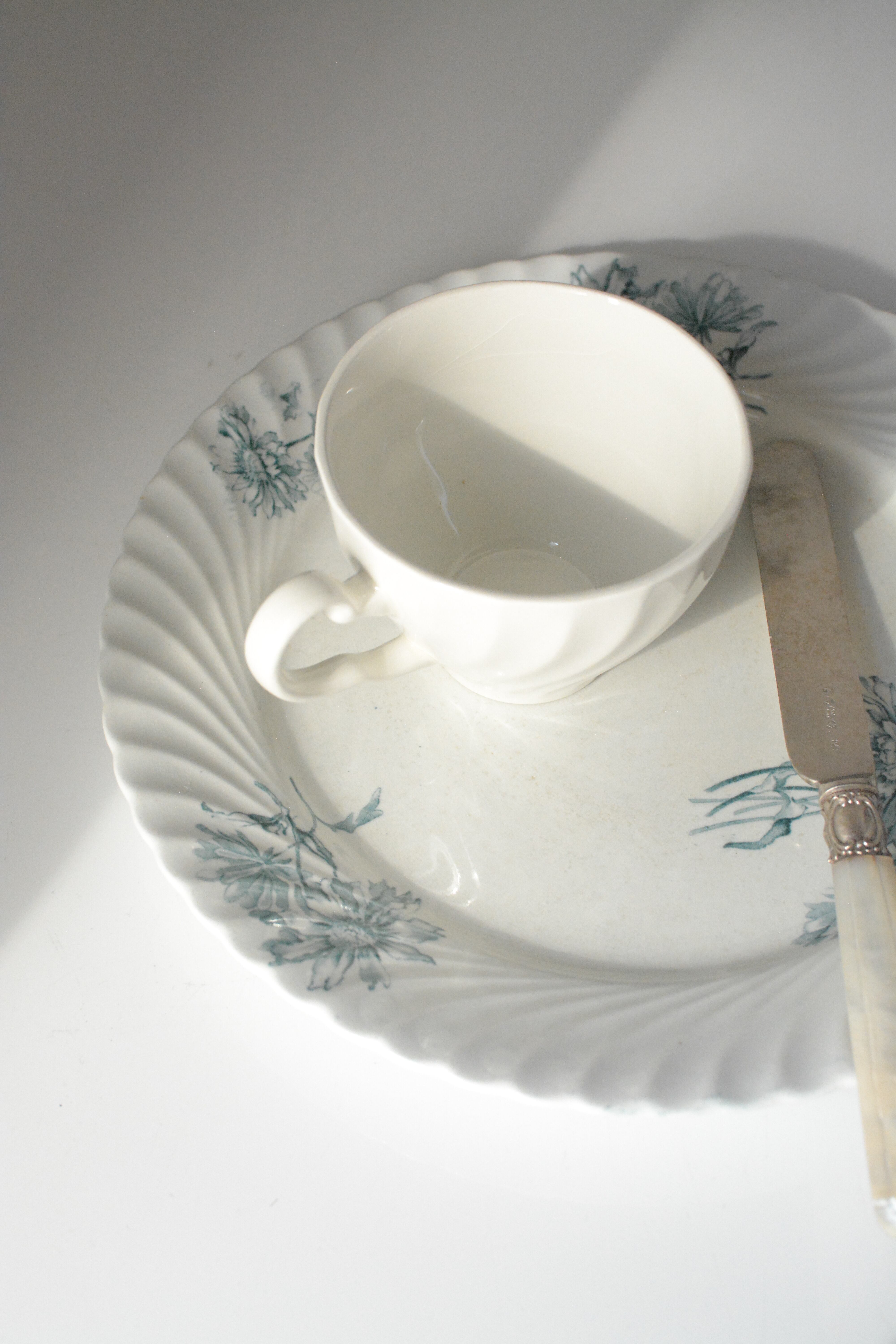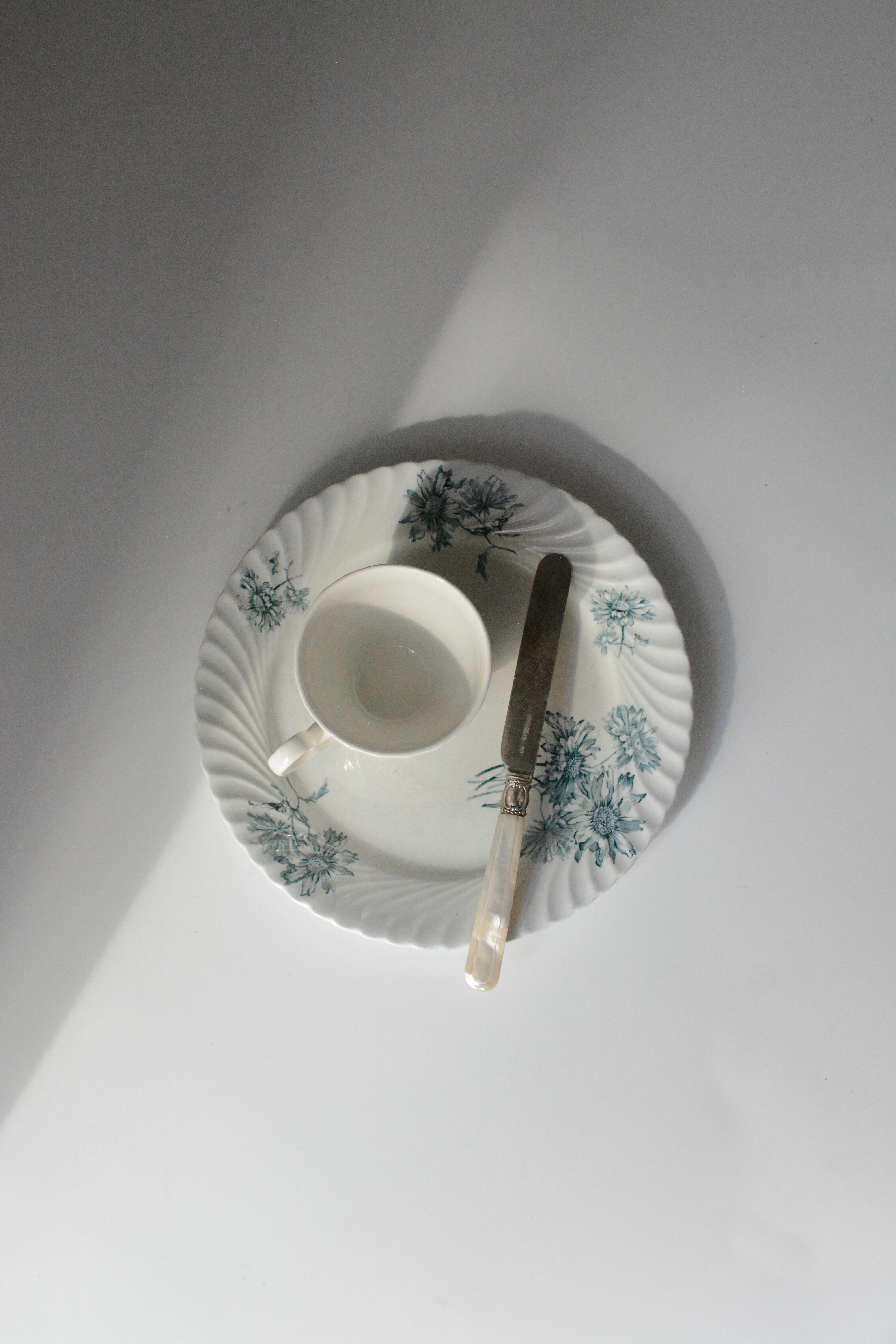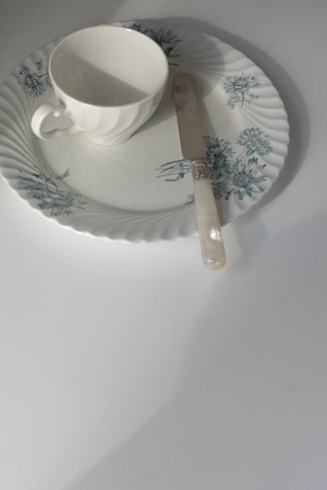 波打つように柔らかな縁取りに、やさしく咲く青い花々のブーケ。 シリーズ名にあるPINK STERBLOEM 春の野に可憐に咲く、カラフトナズナがモチーフだそうです。オランダ老舗窯元Petrus Regouのもので、貫入や色付きを含む白陶の表情が、年月を経たものにしか出せない静かな美しさを纏っています。