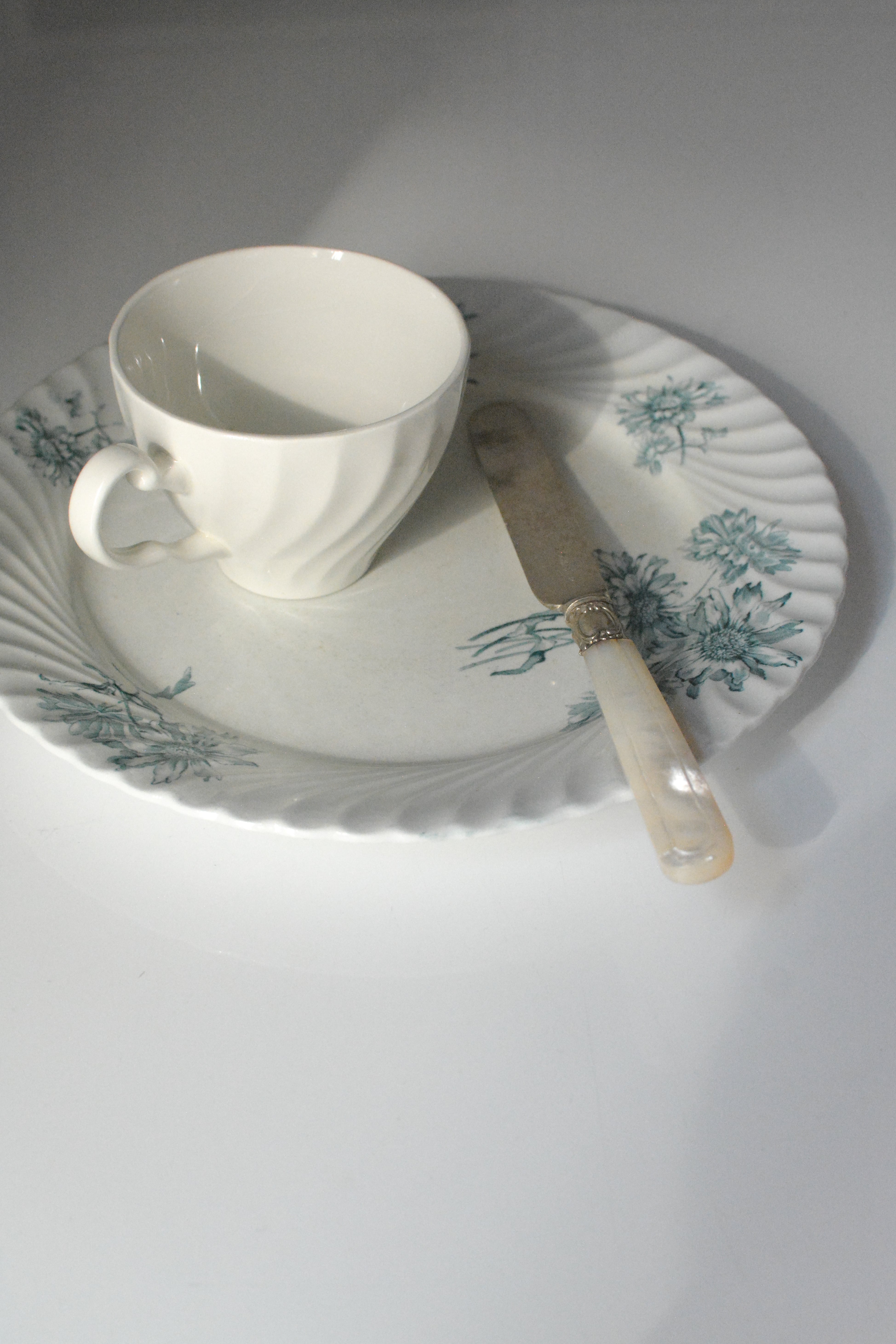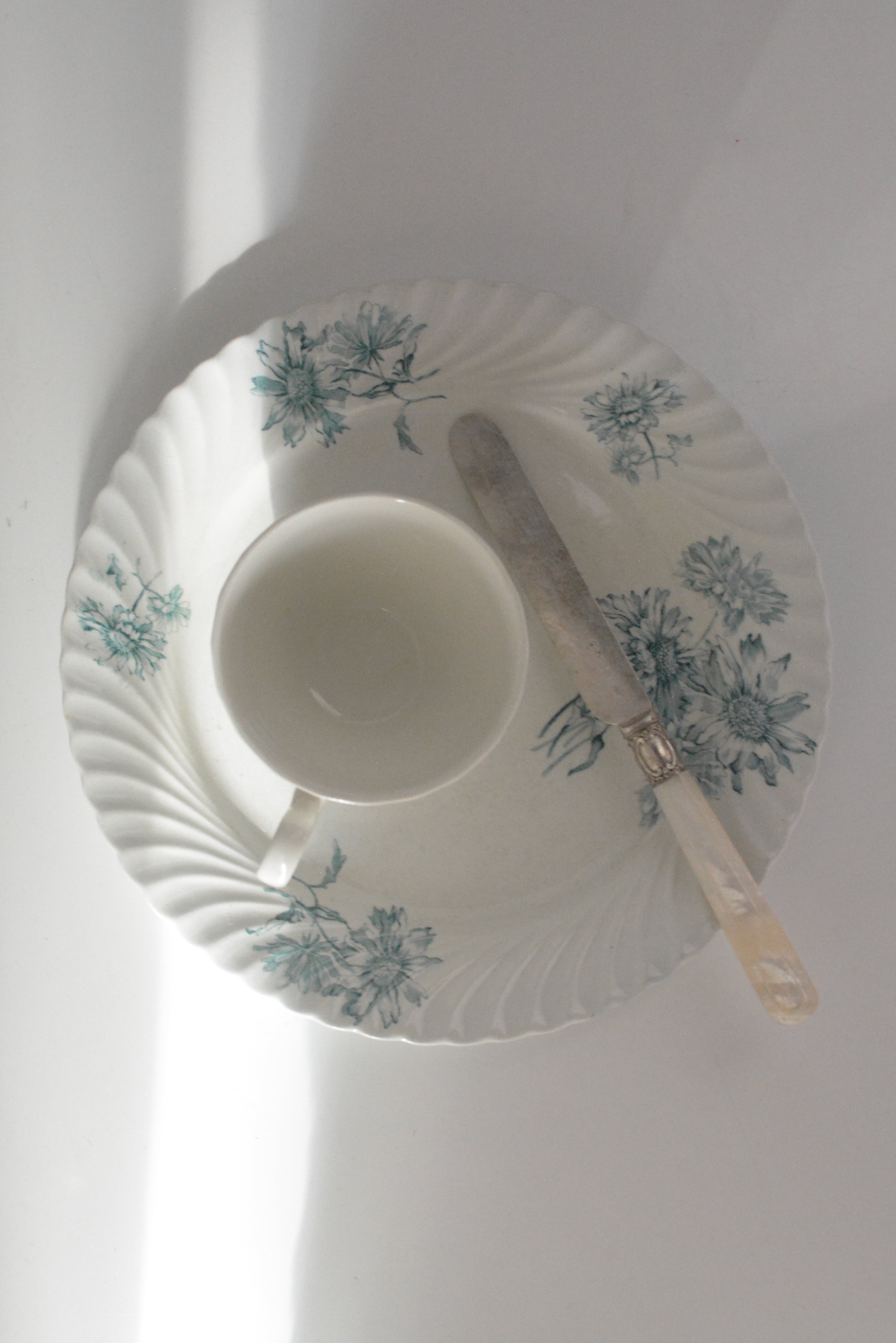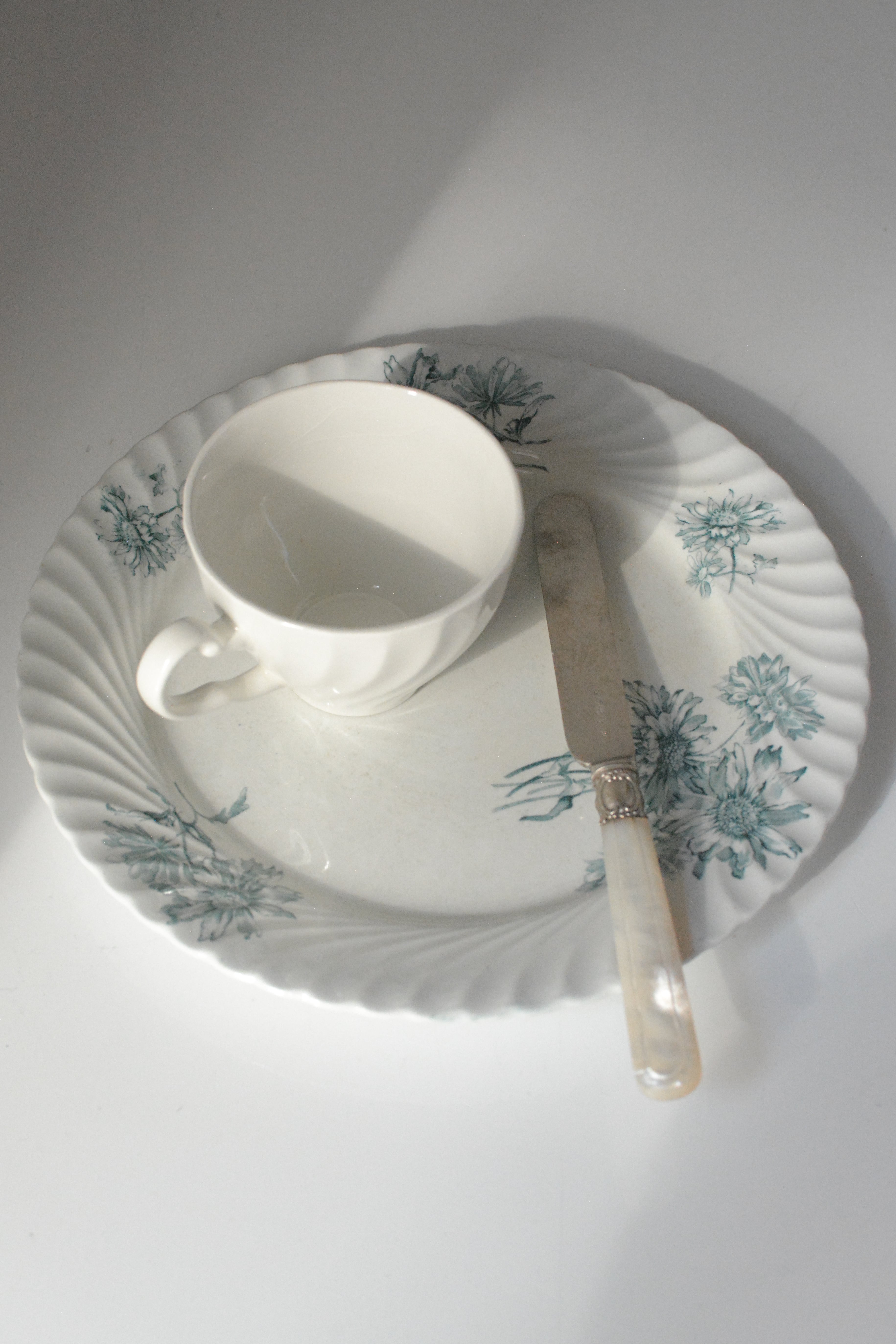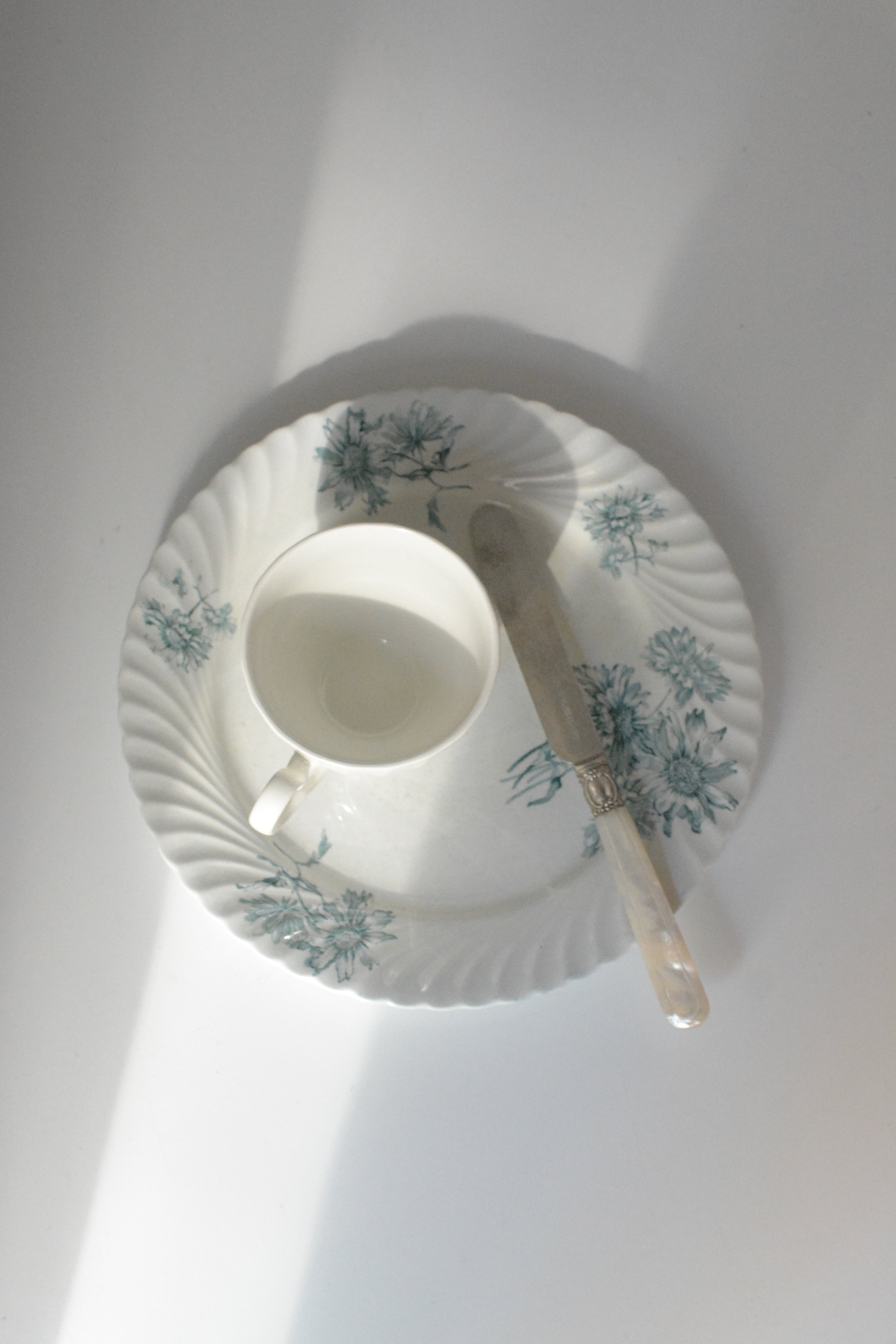 波打つように柔らかな縁取りに、やさしく咲く青い花々のブーケ。 シリーズ名にあるPINK STERBLOEM 春の野に可憐に咲く、カラフトナズナがモチーフだそうです。オランダ老舗窯元Petrus Regouのもので、貫入や色付きを含む白陶の表情が、年月を経たものにしか出せない静かな美しさを纏っています。