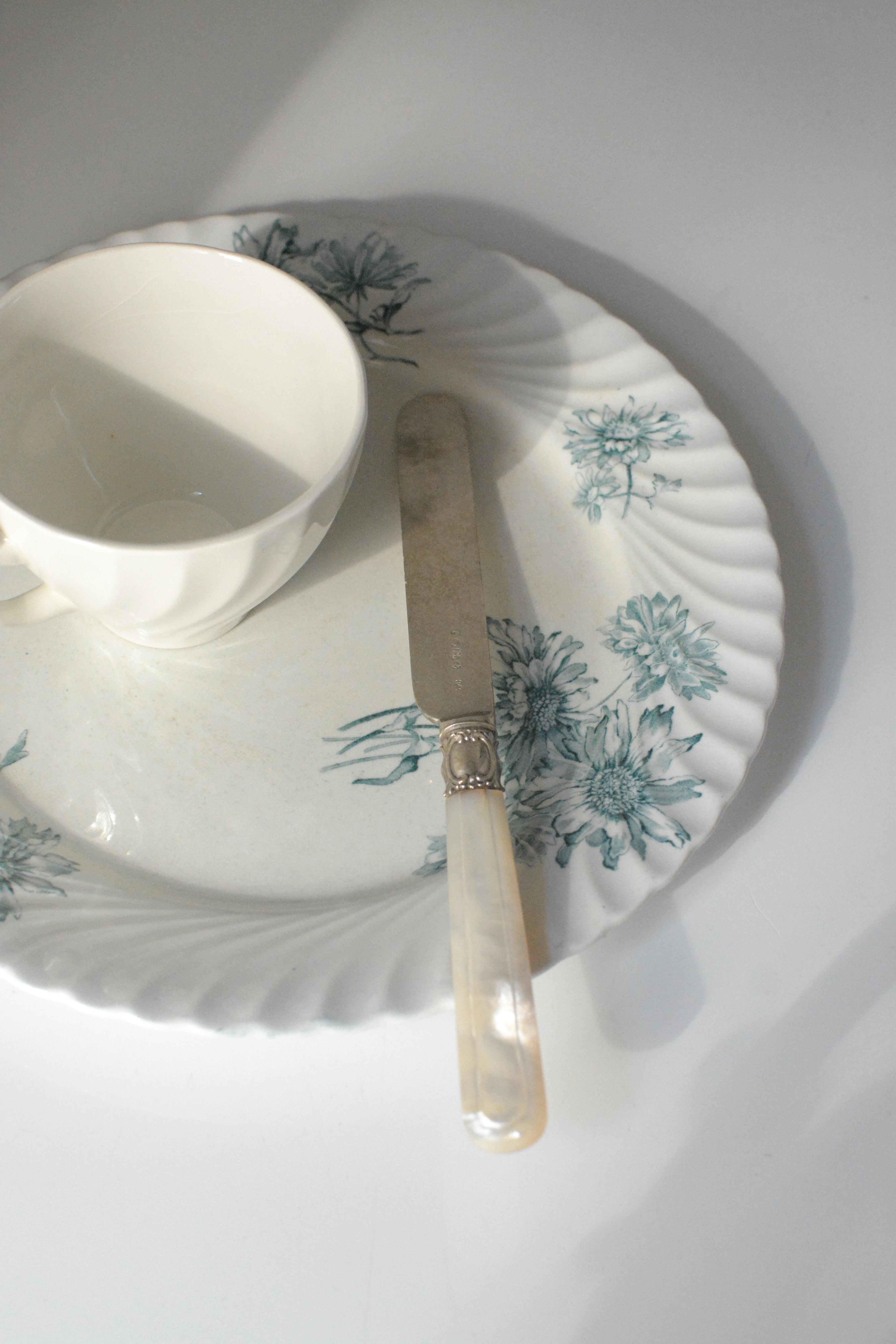 波打つように柔らかな縁取りに、やさしく咲く青い花々のブーケ。 シリーズ名にあるPINK STERBLOEM 春の野に可憐に咲く、カラフトナズナがモチーフだそうです。オランダ老舗窯元Petrus Regouのもので、貫入や色付きを含む白陶の表情が、年月を経たものにしか出せない静かな美しさを纏っています。