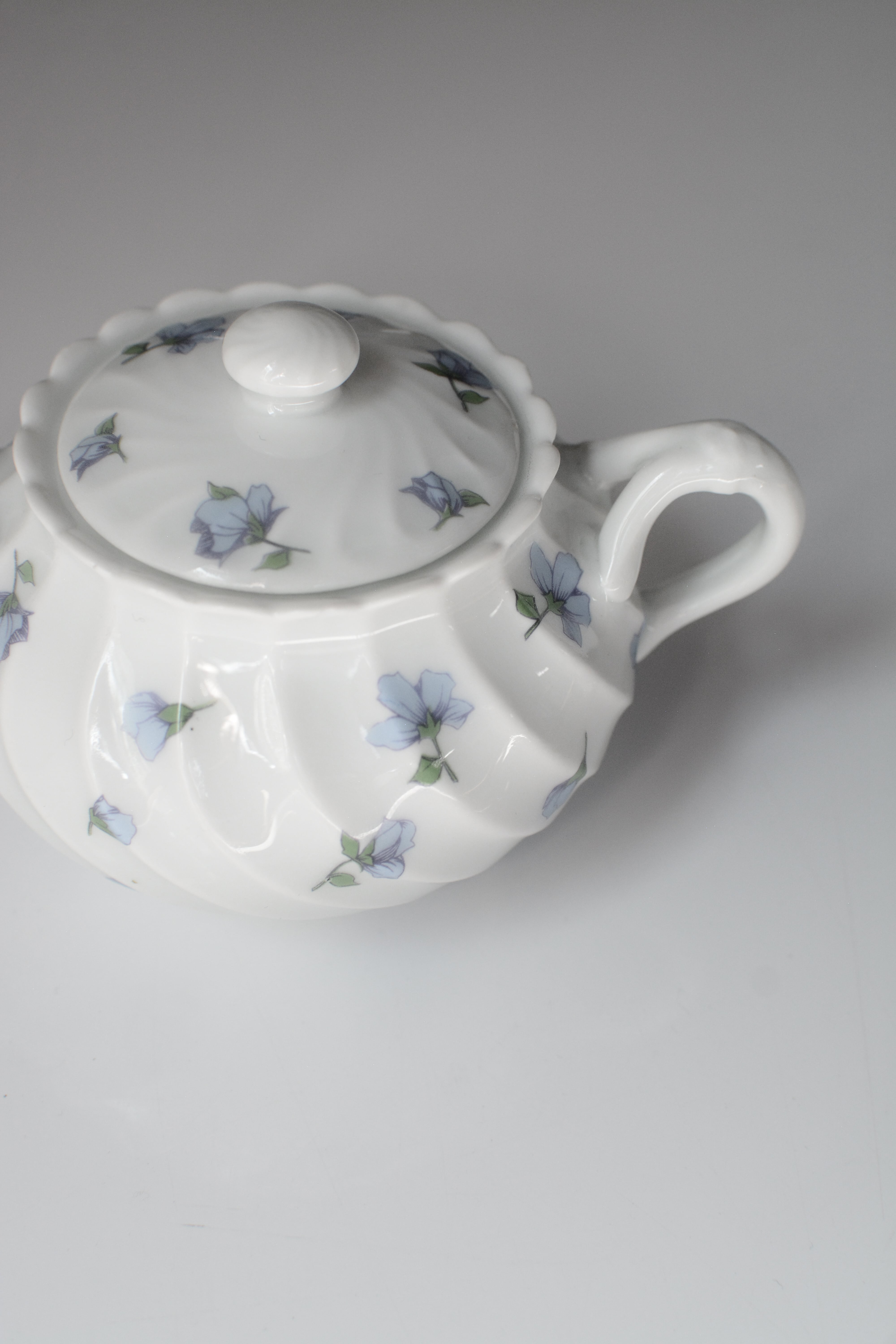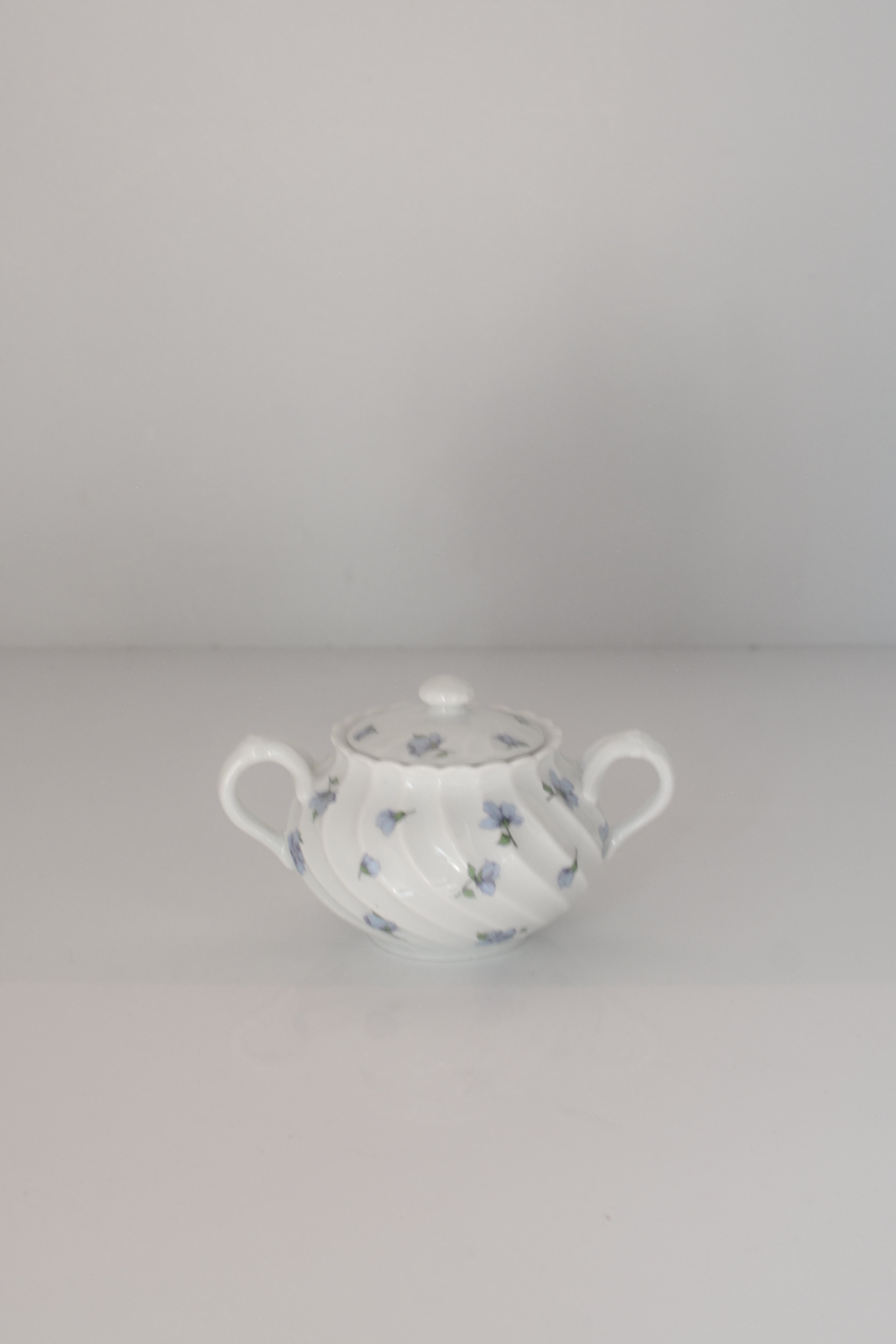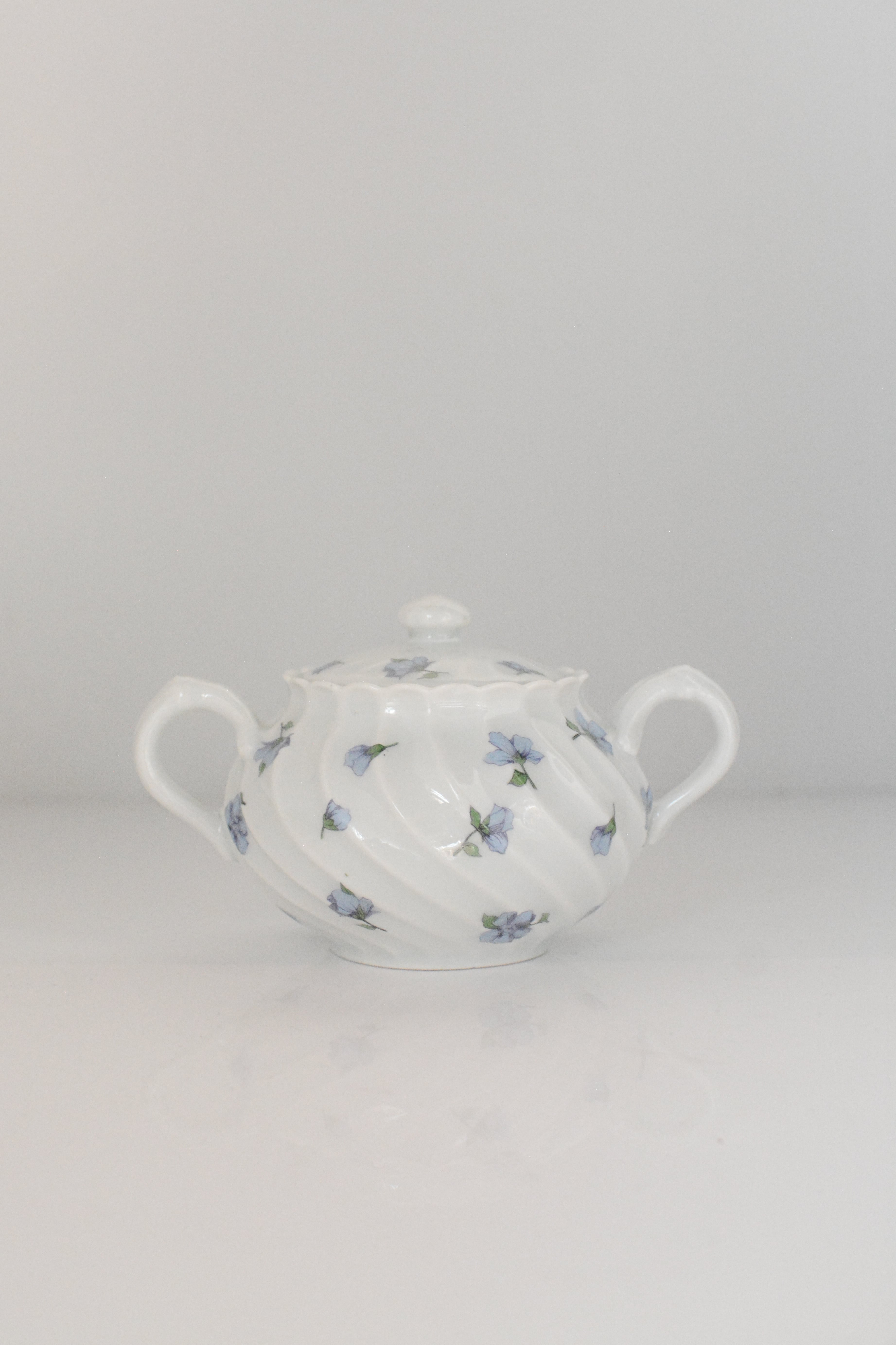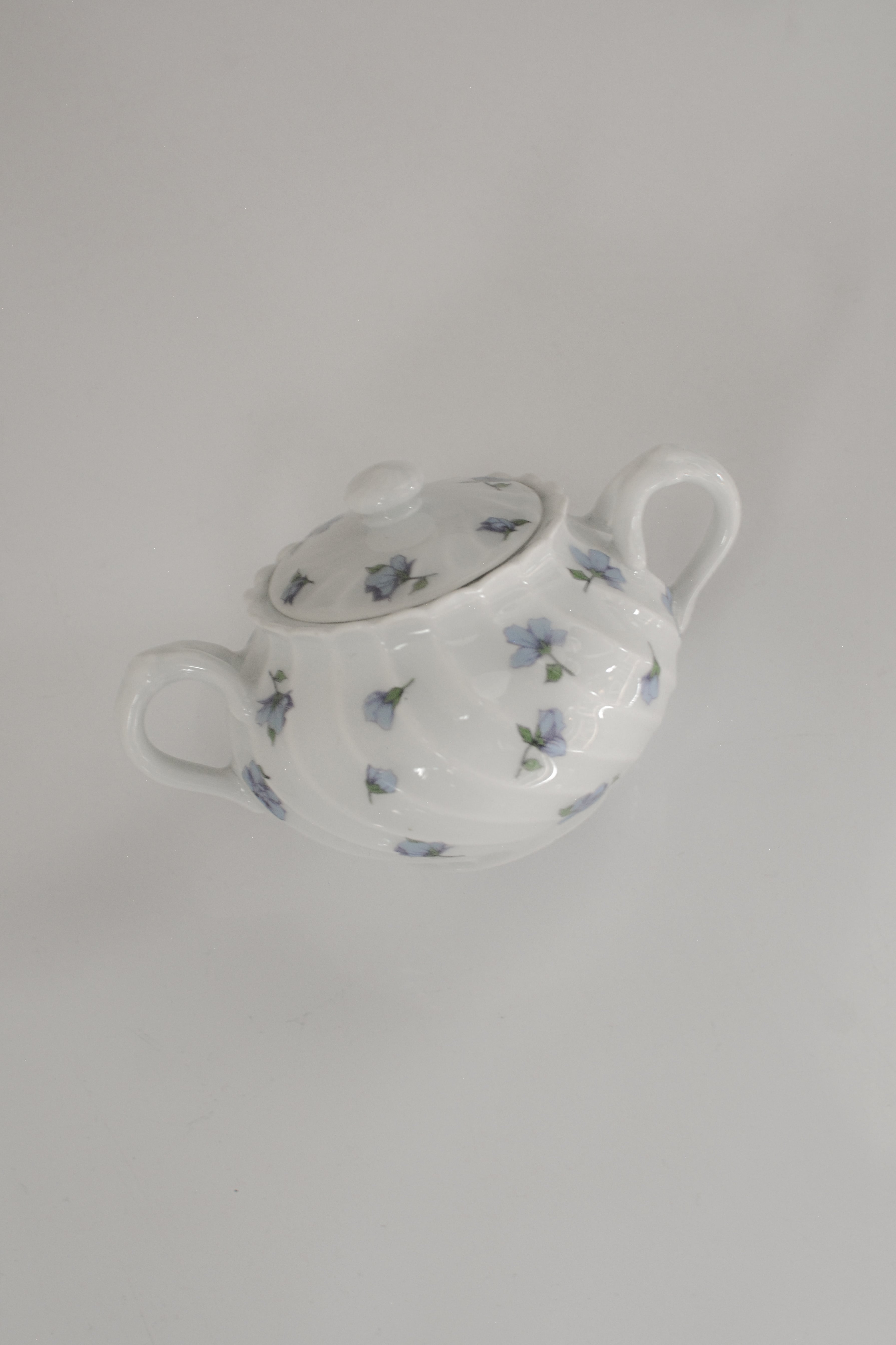 やわらかな白磁に、静かに咲くブルーの小花。リモージュ磁器らしい、端正でありながらどこか優しい空気をまとったシュガーボウルです。ボディにはゆるやかなスワールレリーフ。光が当たると陰影が生まれ、白の美しさがいっそう引き立ちます。砂糖を入れてティータイムに使われていたかと思いますが、キャンディやチョコレートを入れてテーブルに置いておいたりしても素敵ですね。