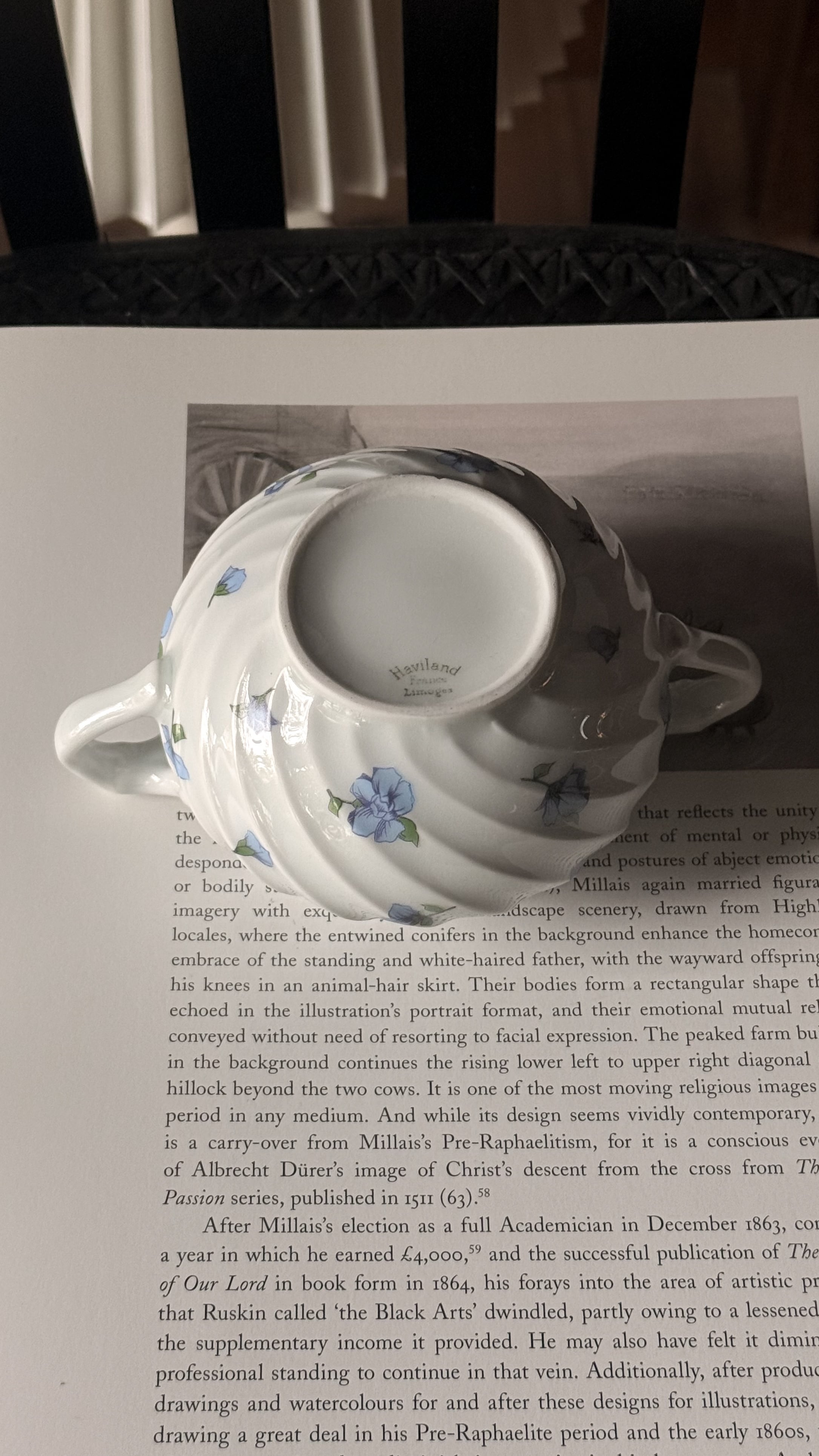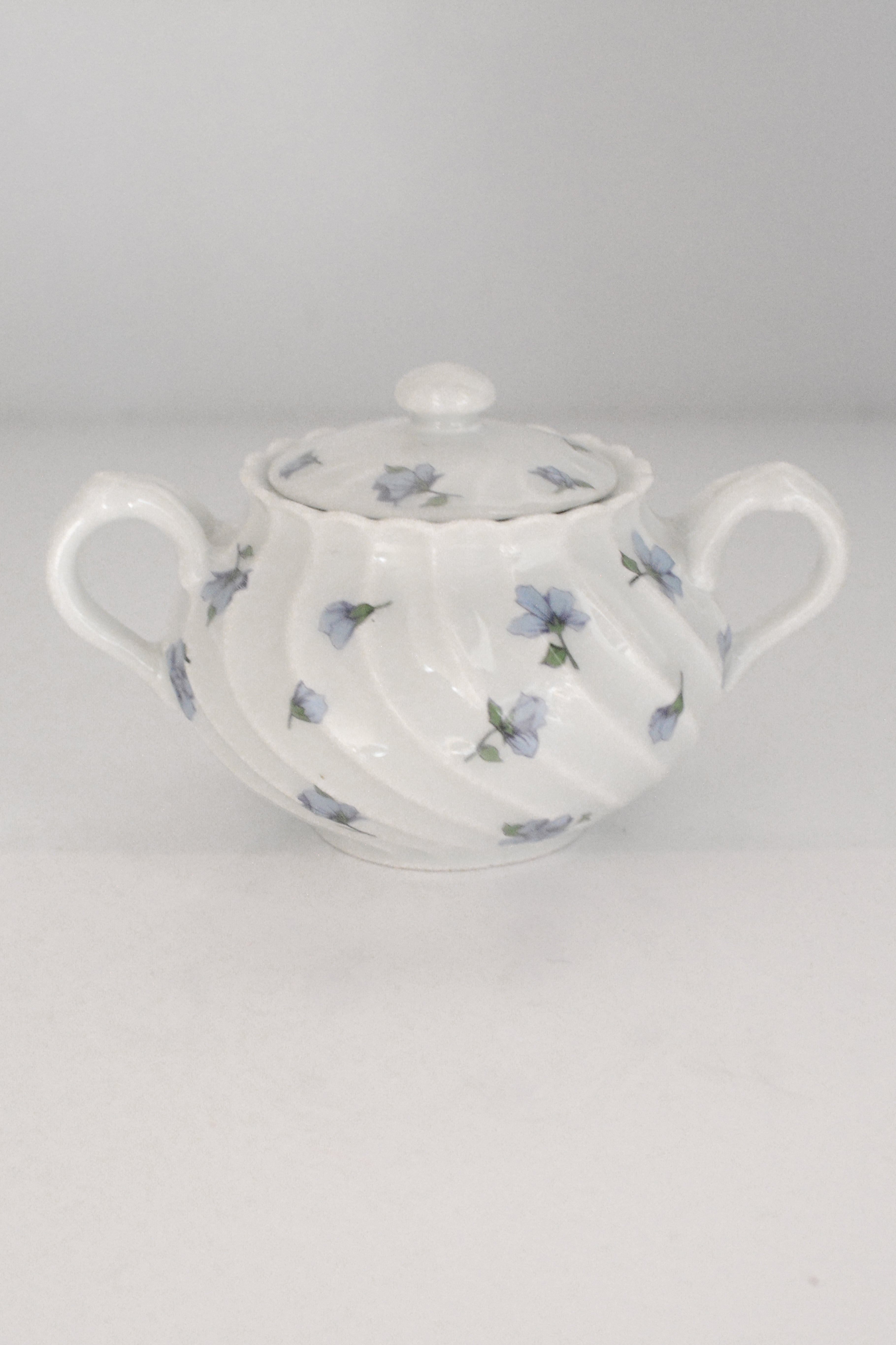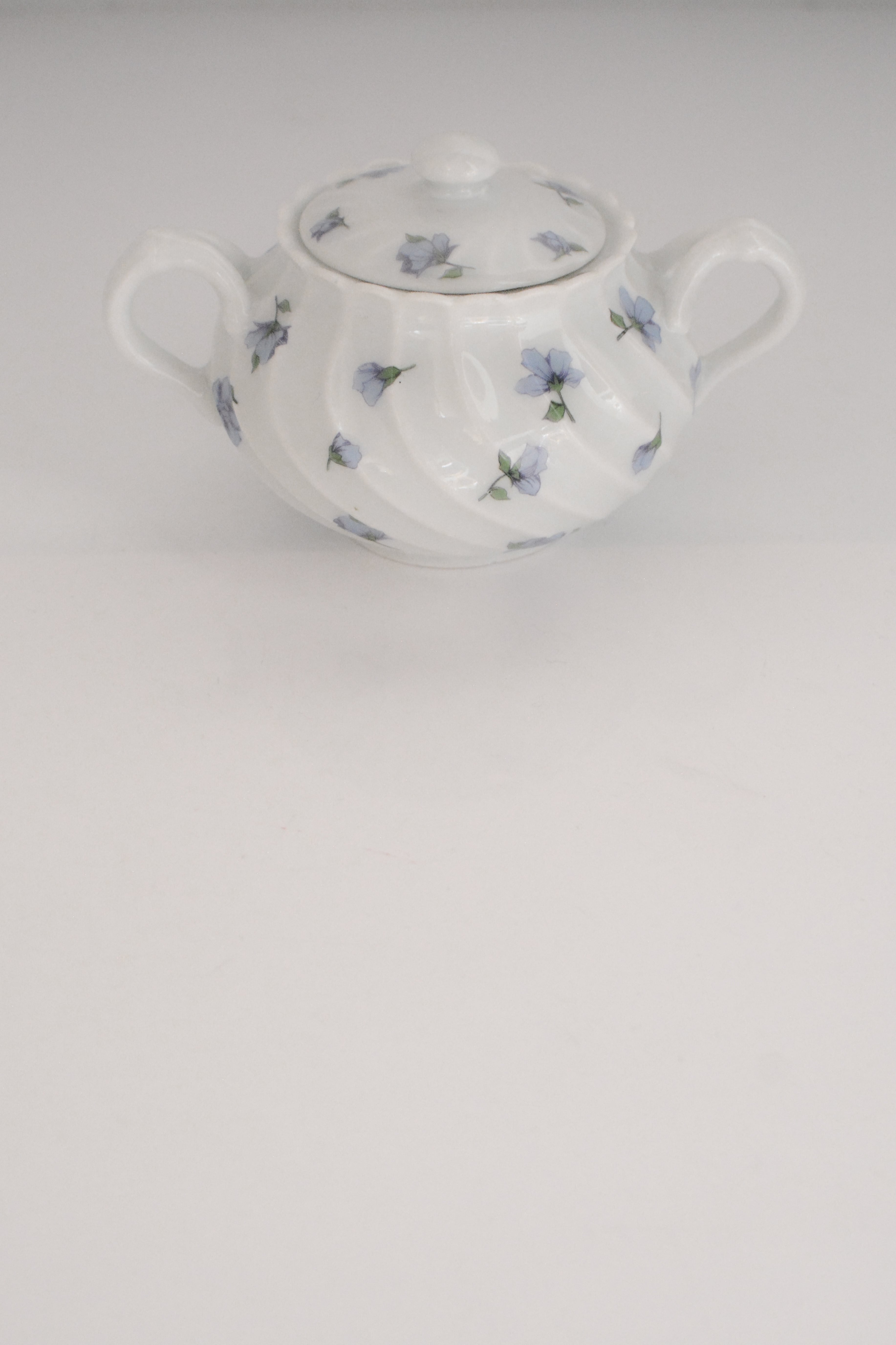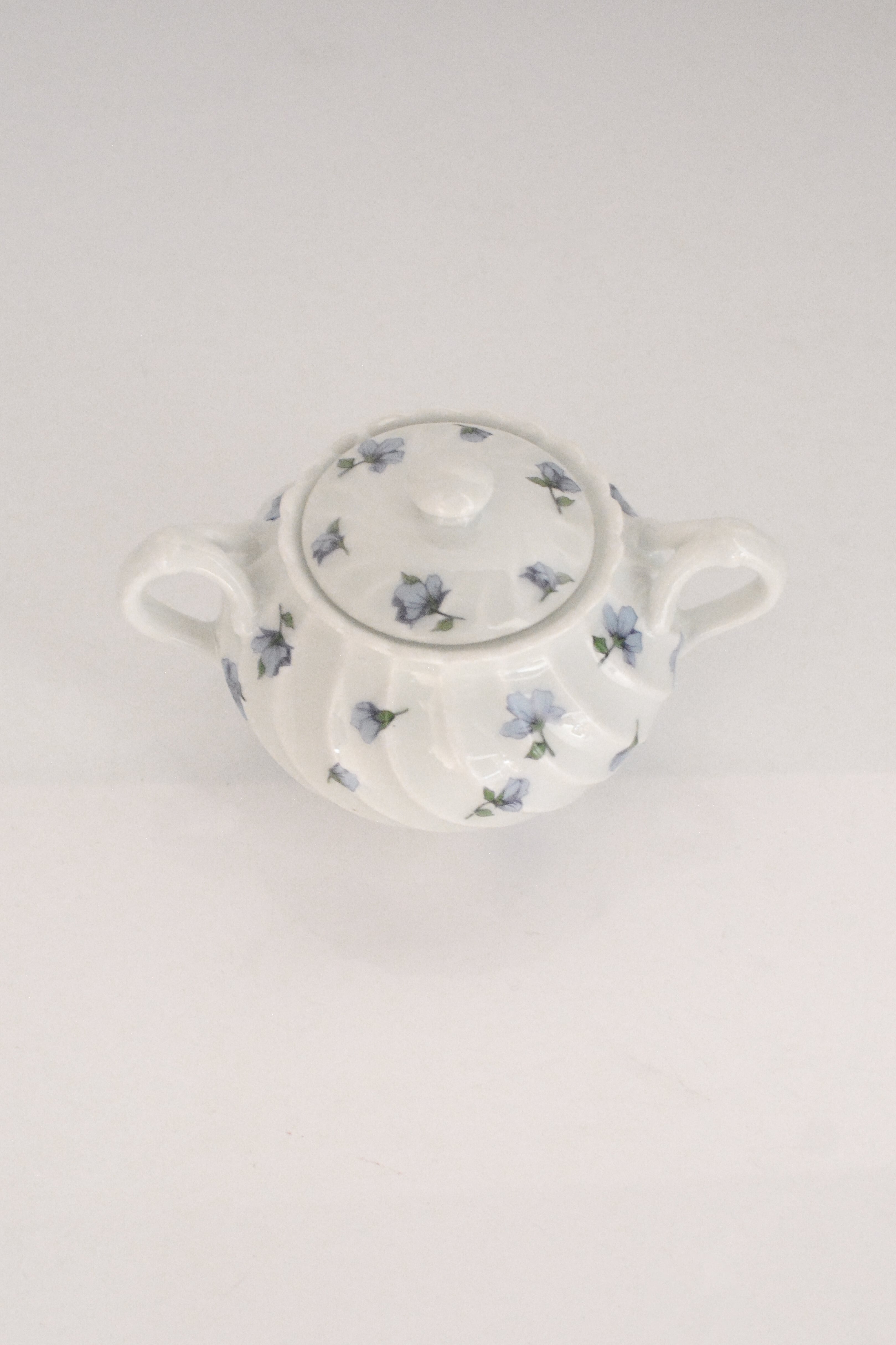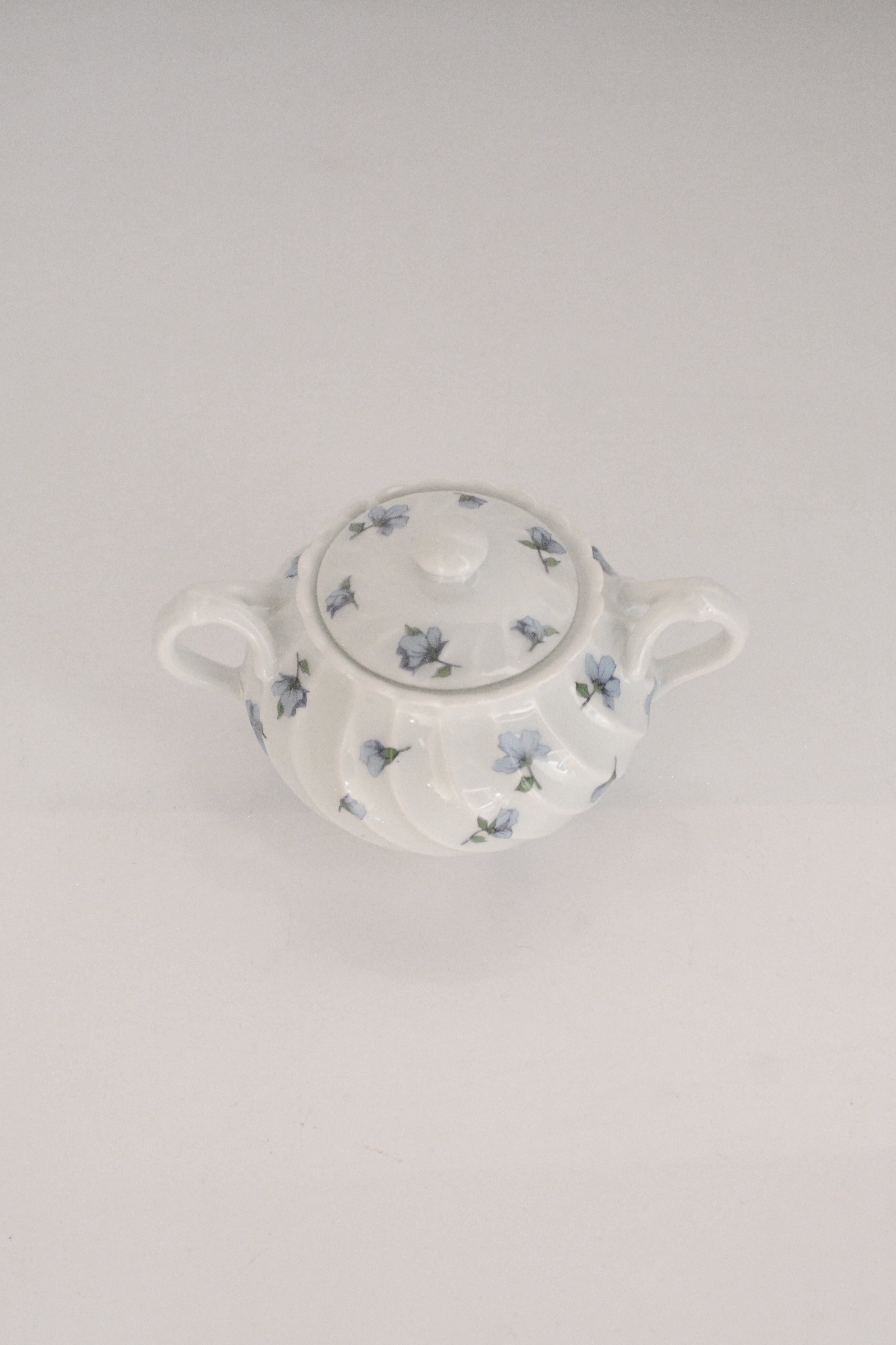 やわらかな白磁に、静かに咲くブルーの小花。リモージュ磁器らしい、端正でありながらどこか優しい空気をまとったシュガーボウルです。ボディにはゆるやかなスワールレリーフ。光が当たると陰影が生まれ、白の美しさがいっそう引き立ちます。砂糖を入れてティータイムに使われていたかと思いますが、キャンディやチョコレートを入れてテーブルに置いておいたりしても素敵ですね。