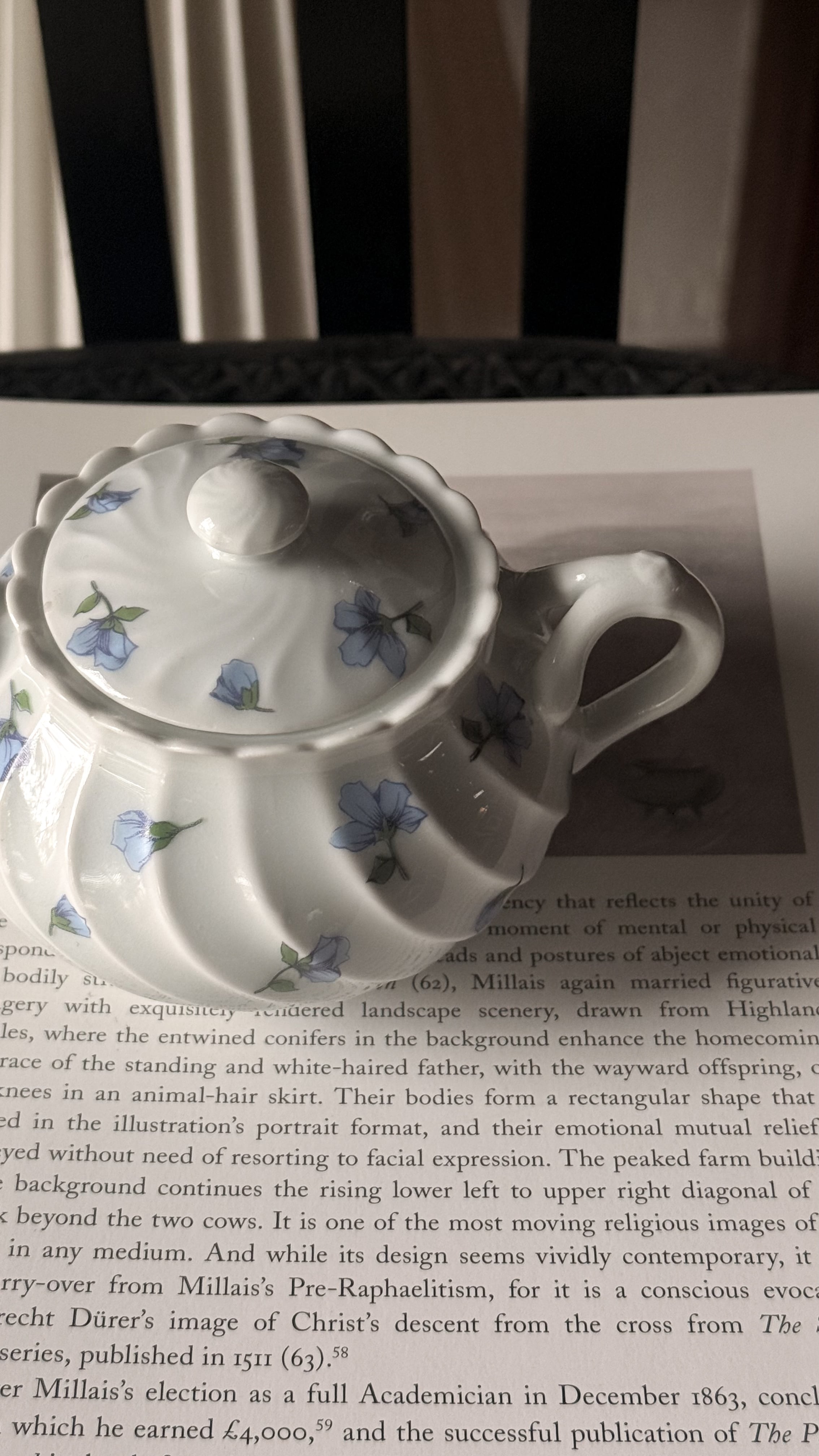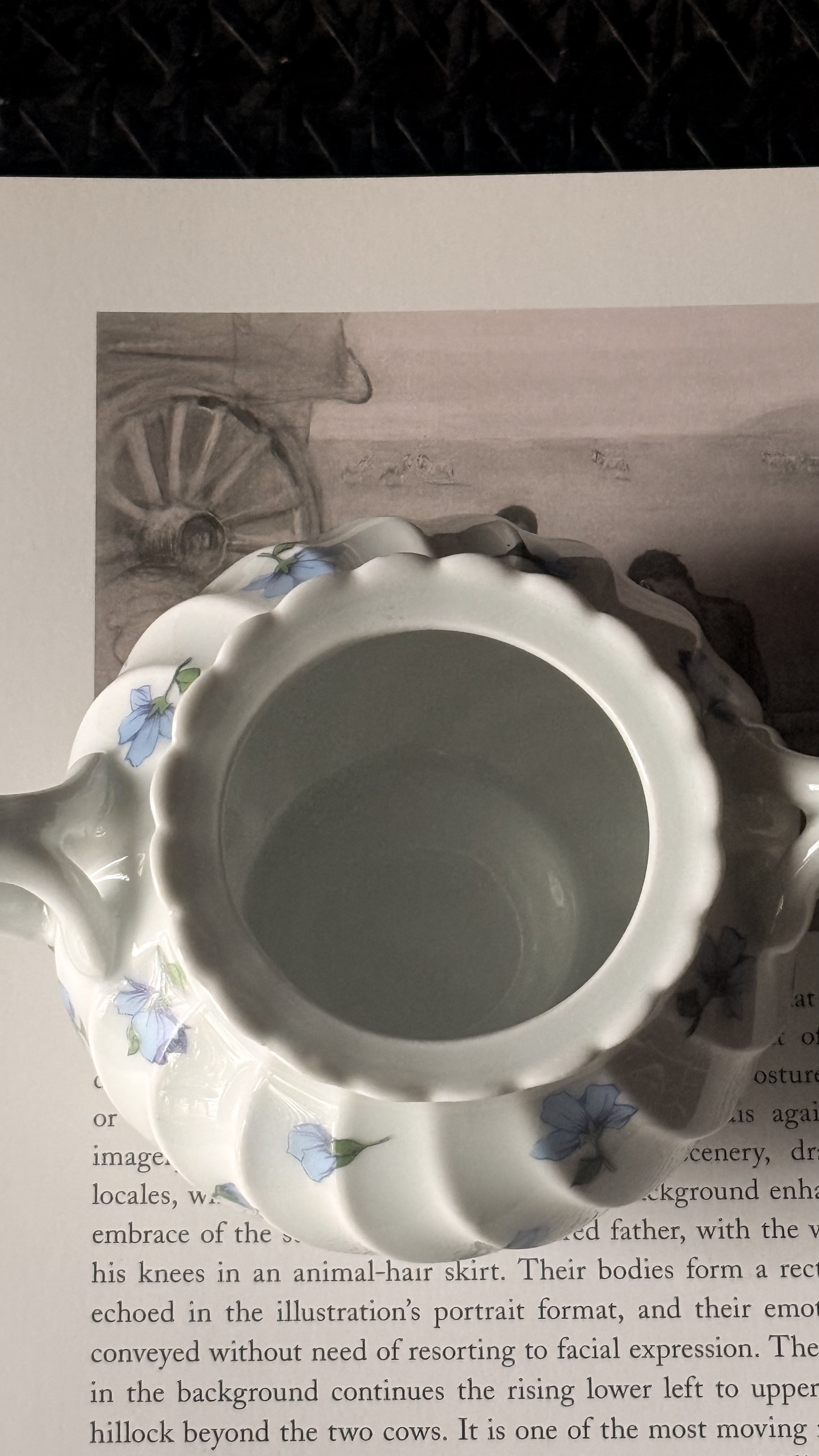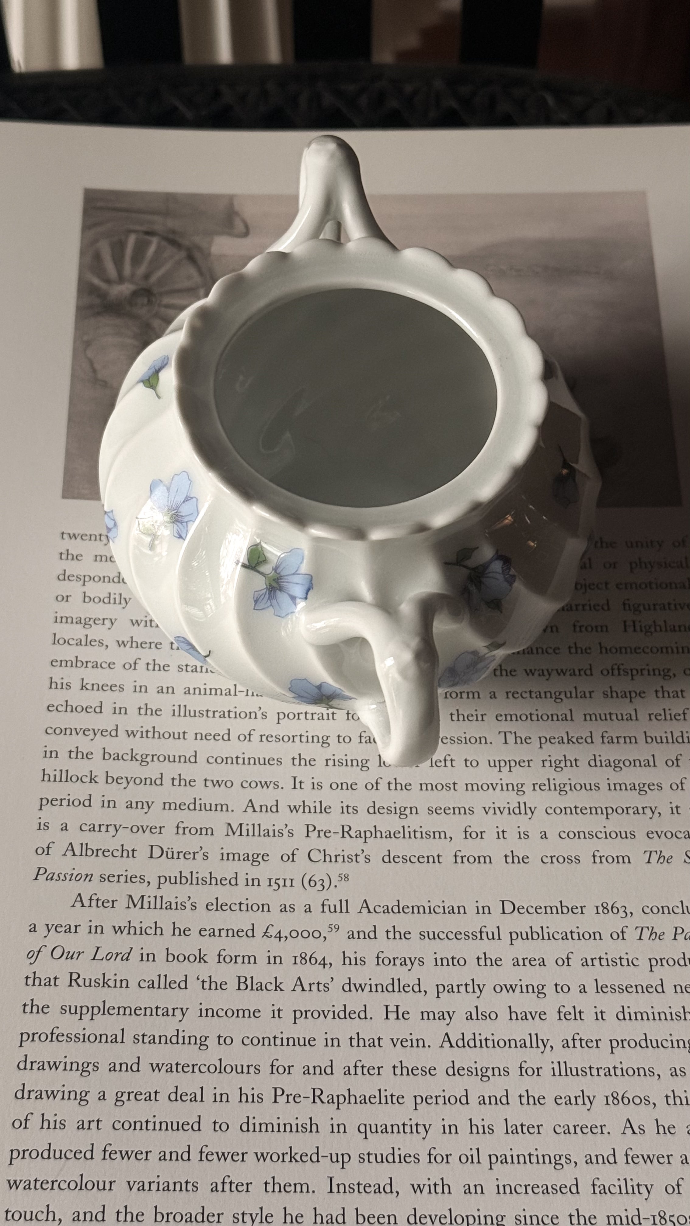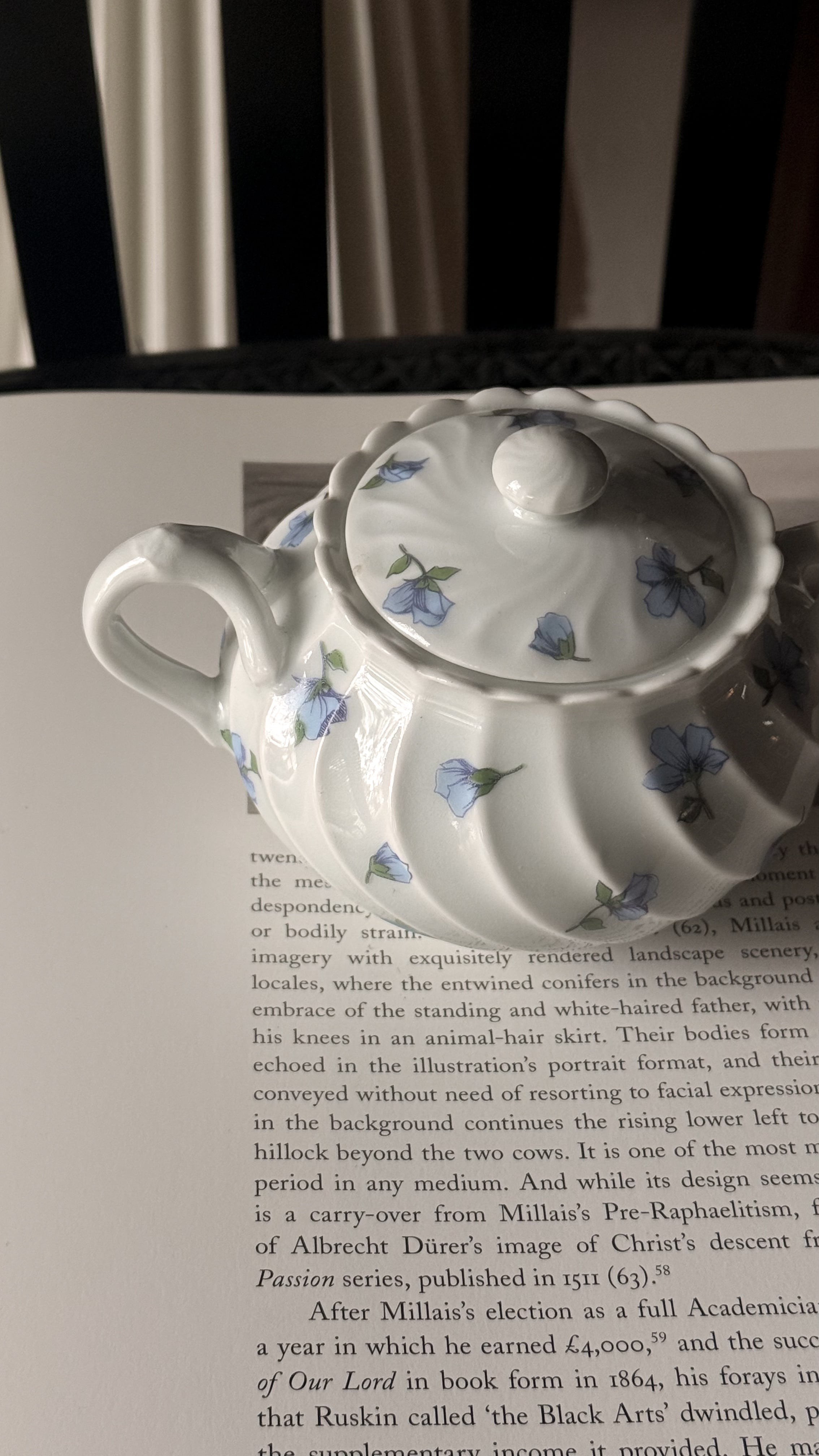 やわらかな白磁に、静かに咲くブルーの小花。リモージュ磁器らしい、端正でありながらどこか優しい空気をまとったシュガーボウルです。ボディにはゆるやかなスワールレリーフ。光が当たると陰影が生まれ、白の美しさがいっそう引き立ちます。砂糖を入れてティータイムに使われていたかと思いますが、キャンディやチョコレートを入れてテーブルに置いておいたりしても素敵ですね。