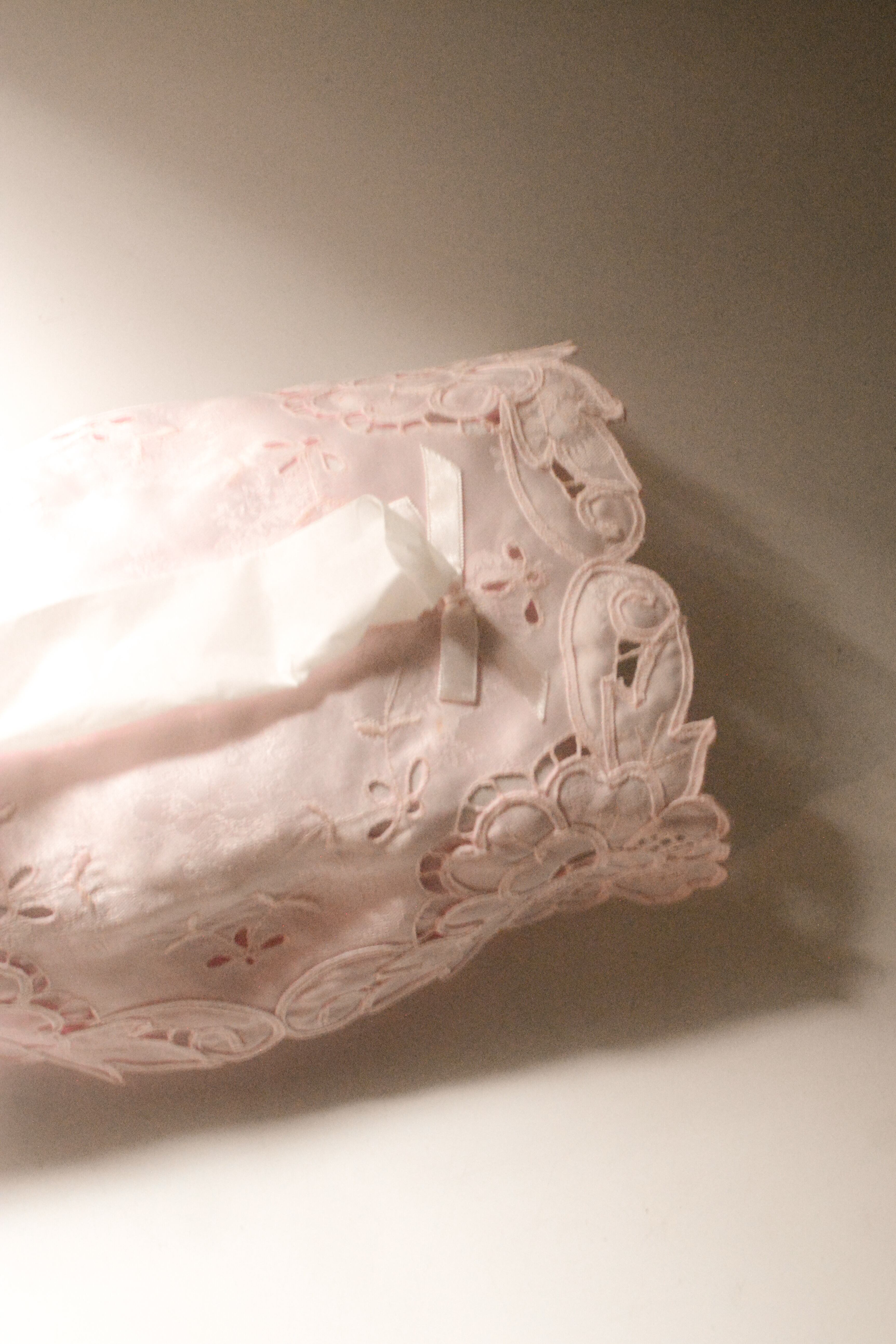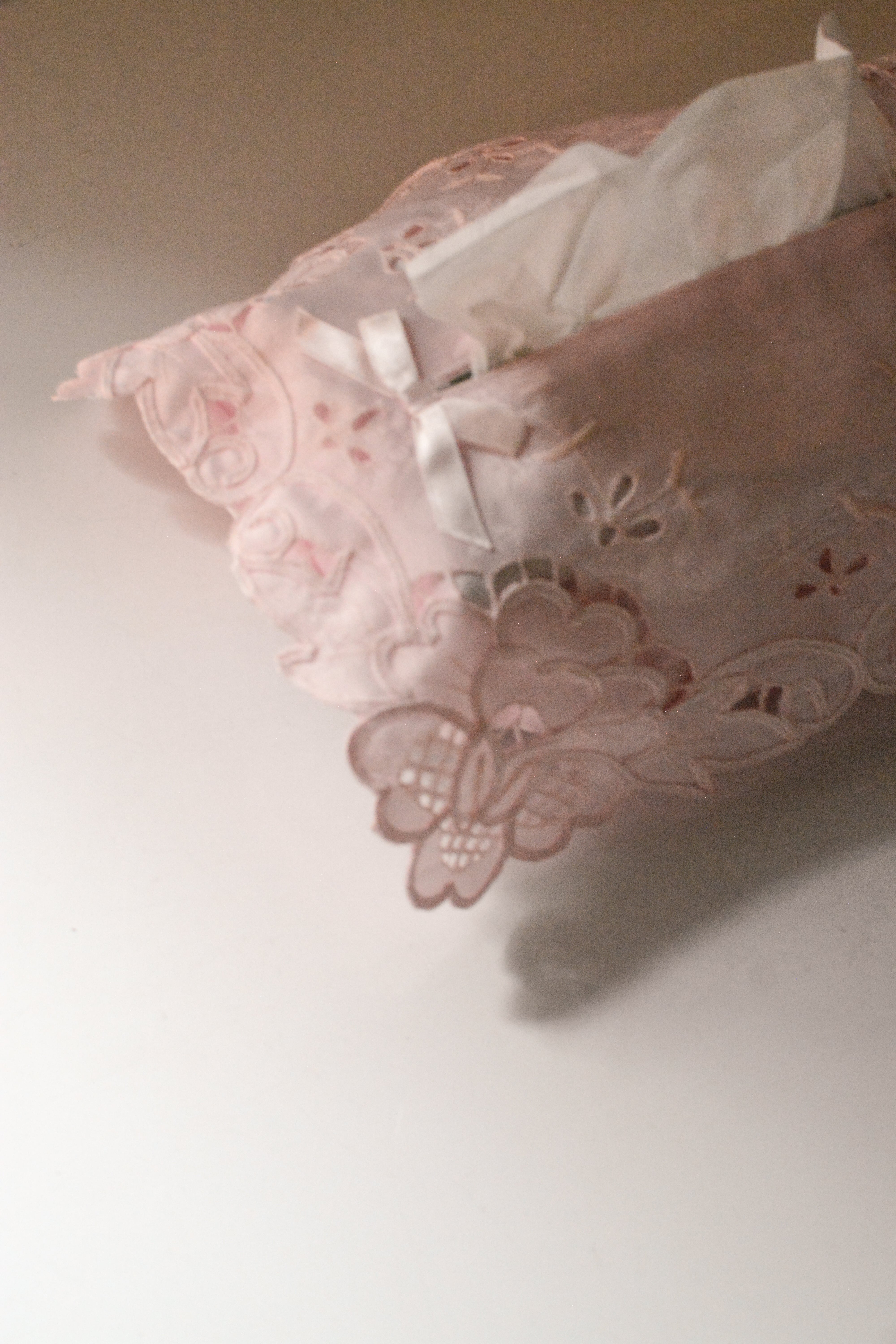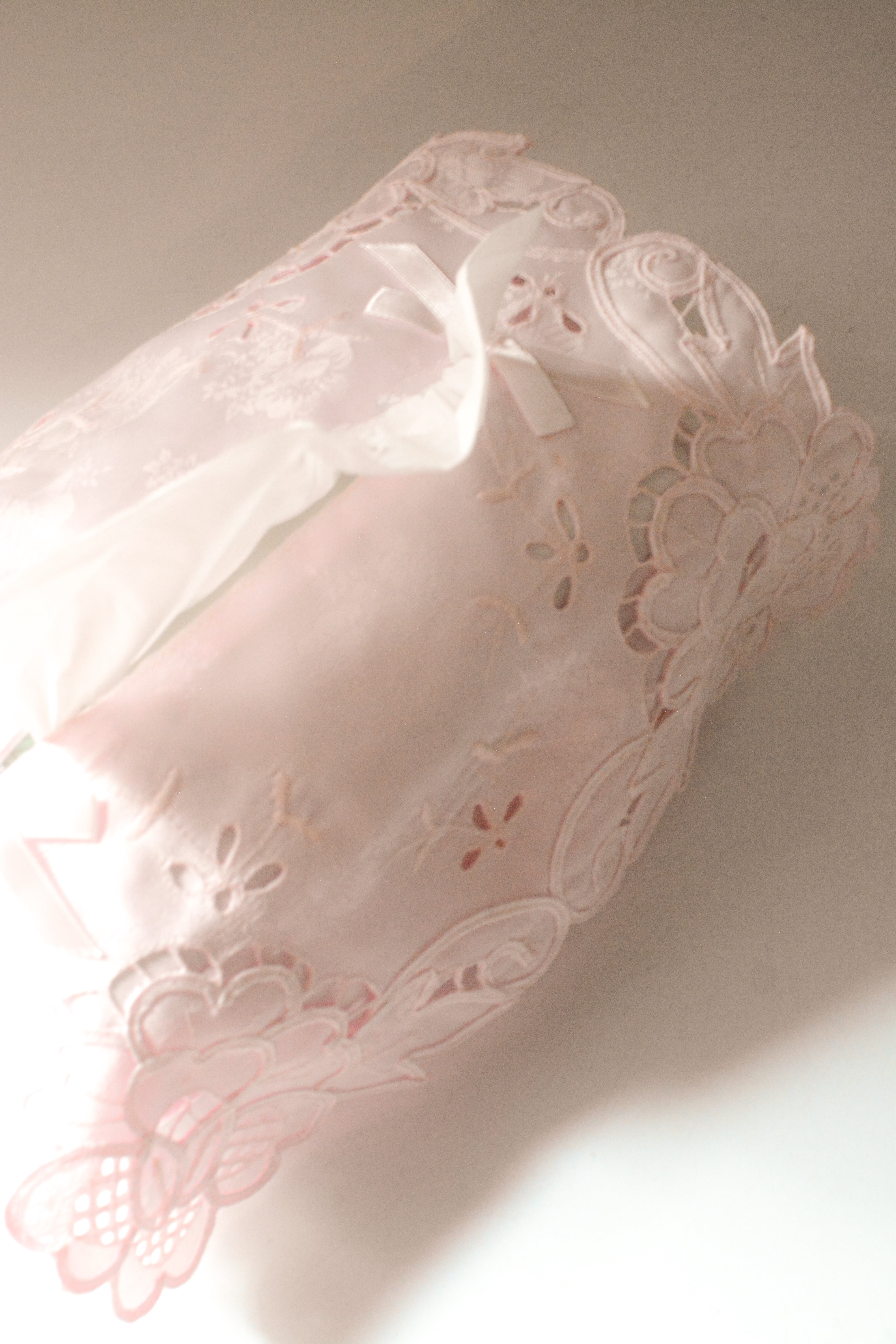 やわらかなロリーピンクが、空間にそっと甘さを添えるヴィンテージのティッシュボックスカバー。軽やかな生地に施されたのは、繊細なマデイラカットワーク刺繍。透かしのリズムとやさしい立体感が、どこか懐かしく、ロマンティックな雰囲気を漂わせます。一般的なサイズのティッシュボックスに対応し、日常の中でさりげなく美しさを添えてくれる存在。生活感が出やすいアイテムだからこそ、ほんの少しの美しさを添えることで、空間の空気が変わる。そんな感覚を楽しんでいただけたら嬉しい一点です。ヴィンテージ品のため、多少の歪みや経年による表情の変化が見られる場合がありますが、それもまた、歩んできた時間の一部としてお楽しみください。