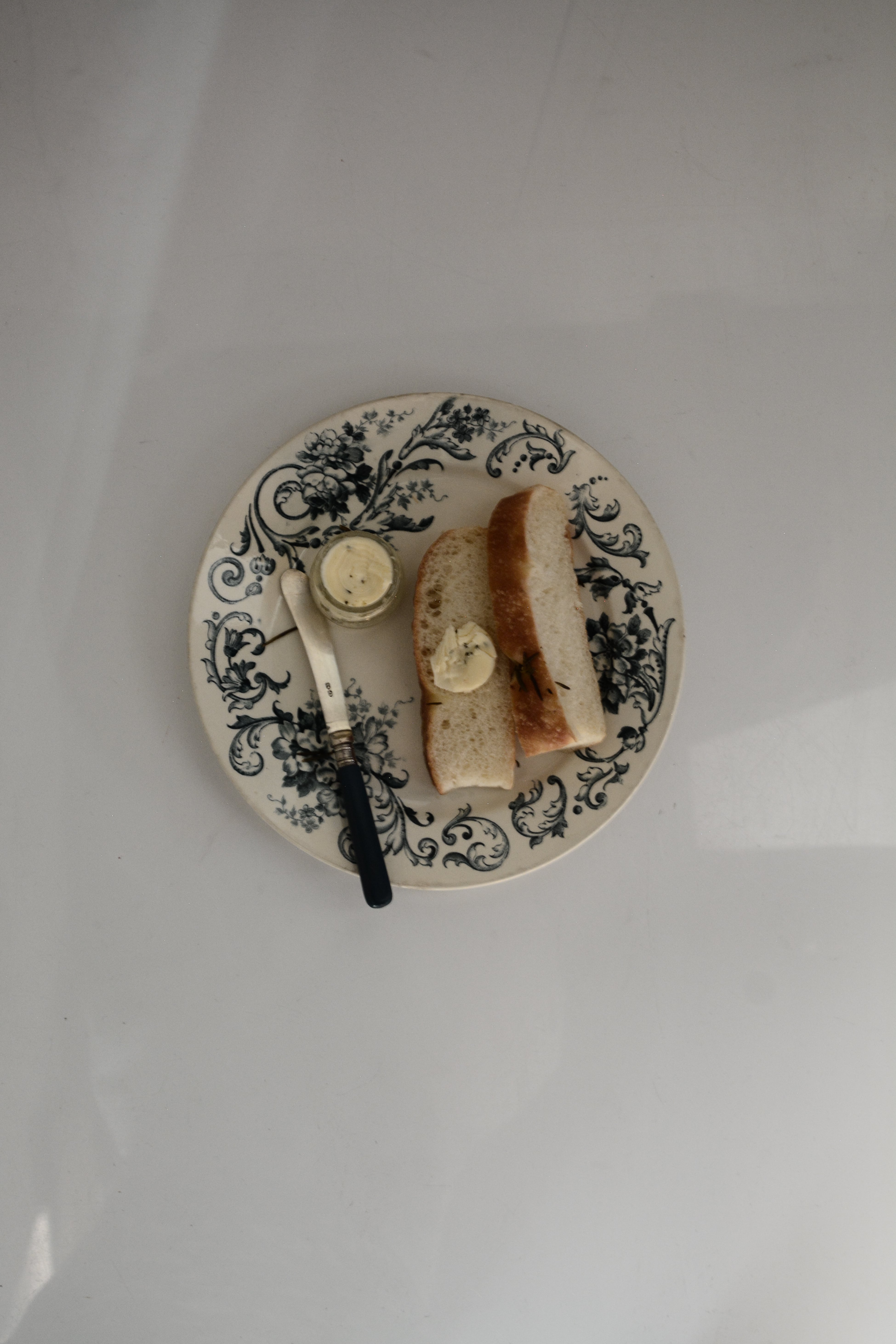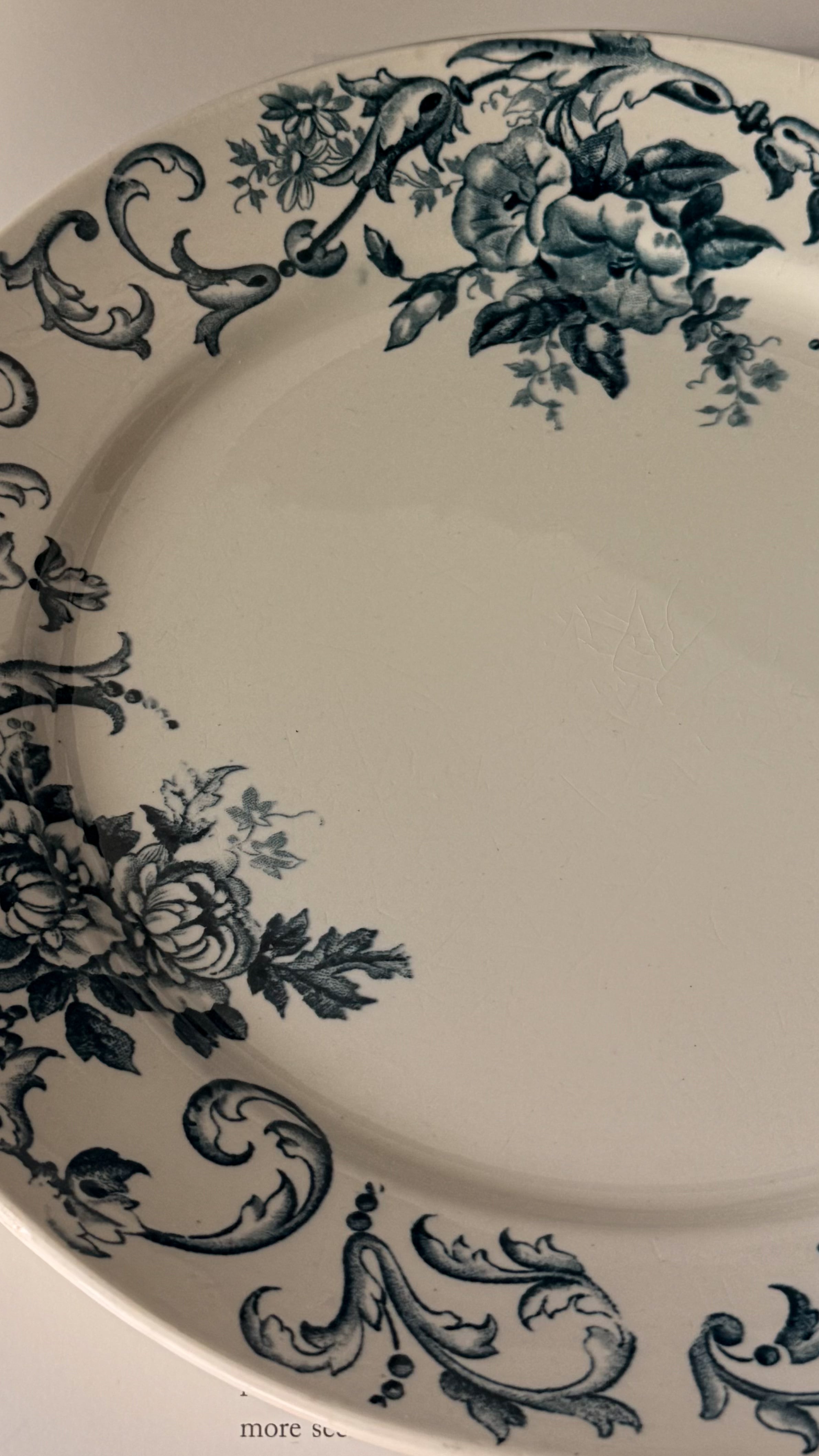 深いブルーで描かれた、伸びやかな植物模様。やわらかなアイボリーの地色に、クラシカルな装飾が静かに広がります。甘すぎず、凛とした佇まいで、のせるものをさりげなく引き立て、テーブルに奥行きを添えてくれる存在感。真っ白ではない、少しやわらいだ表情は長い年月の中で重ねられてきた時間が、うっすらと滲んでいるよう。これからの時間も、ゆっくりと重ねていただきたい一枚です。