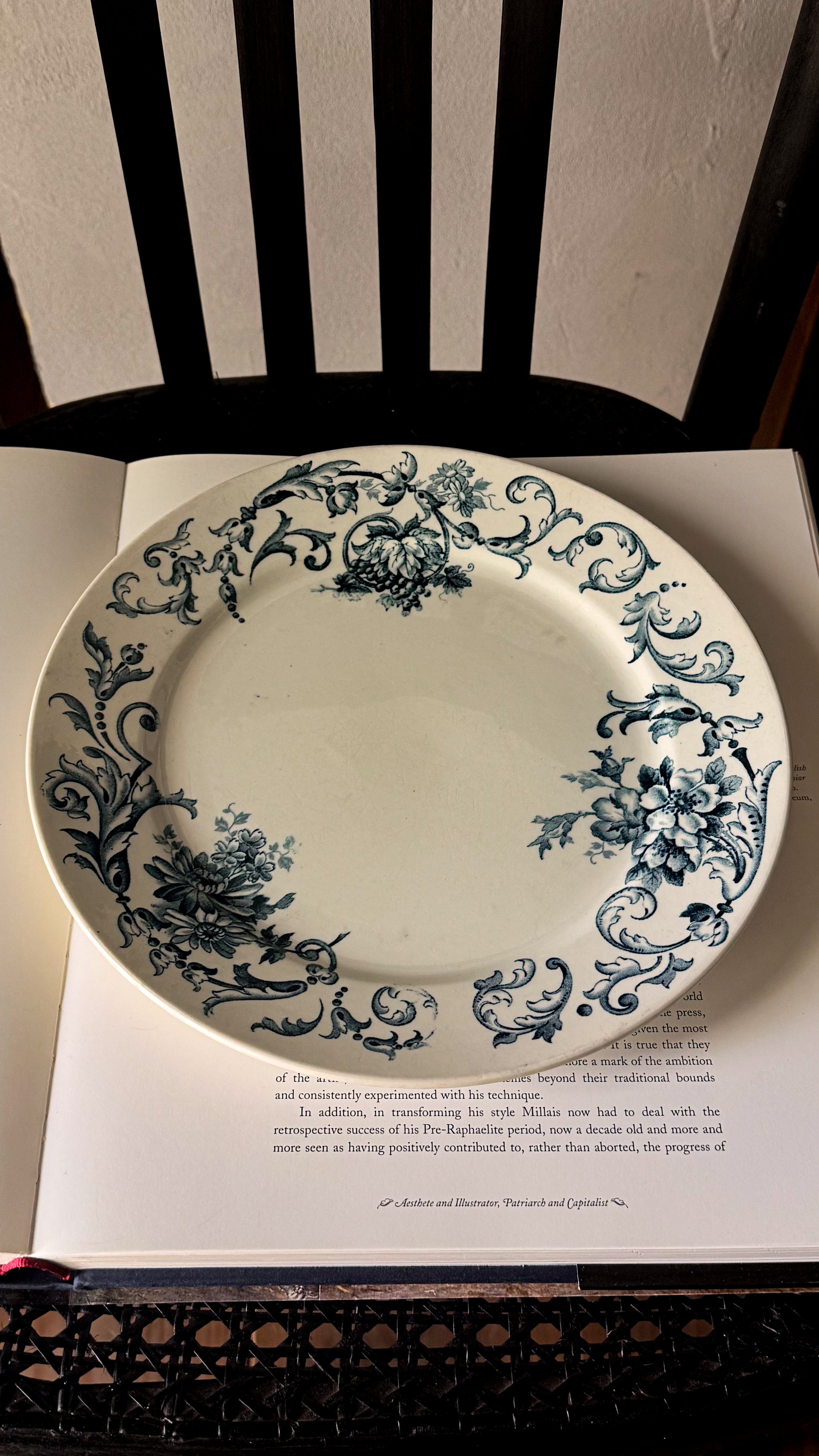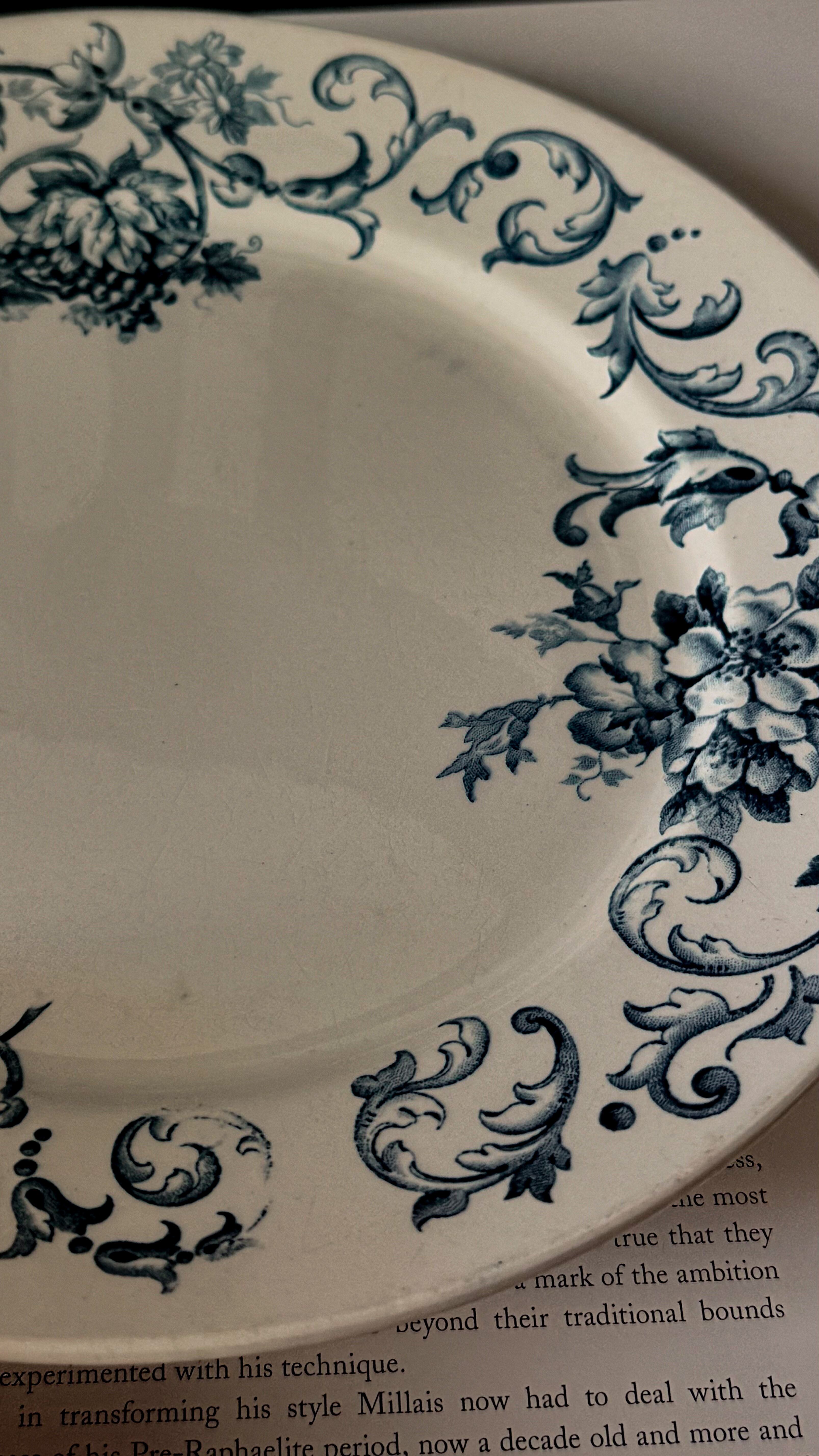 深いブルーで描かれた、伸びやかな植物模様。やわらかなアイボリーの地色に、クラシカルな装飾が静かに広がります。甘すぎず、凛とした佇まいで、のせるものをさりげなく引き立て、テーブルに奥行きを添えてくれる存在感。真っ白ではない、少しやわらいだ表情は長い年月の中で重ねられてきた時間が、うっすらと滲んでいるよう。これからの時間も、ゆっくりと重ねていただきたい一枚です。