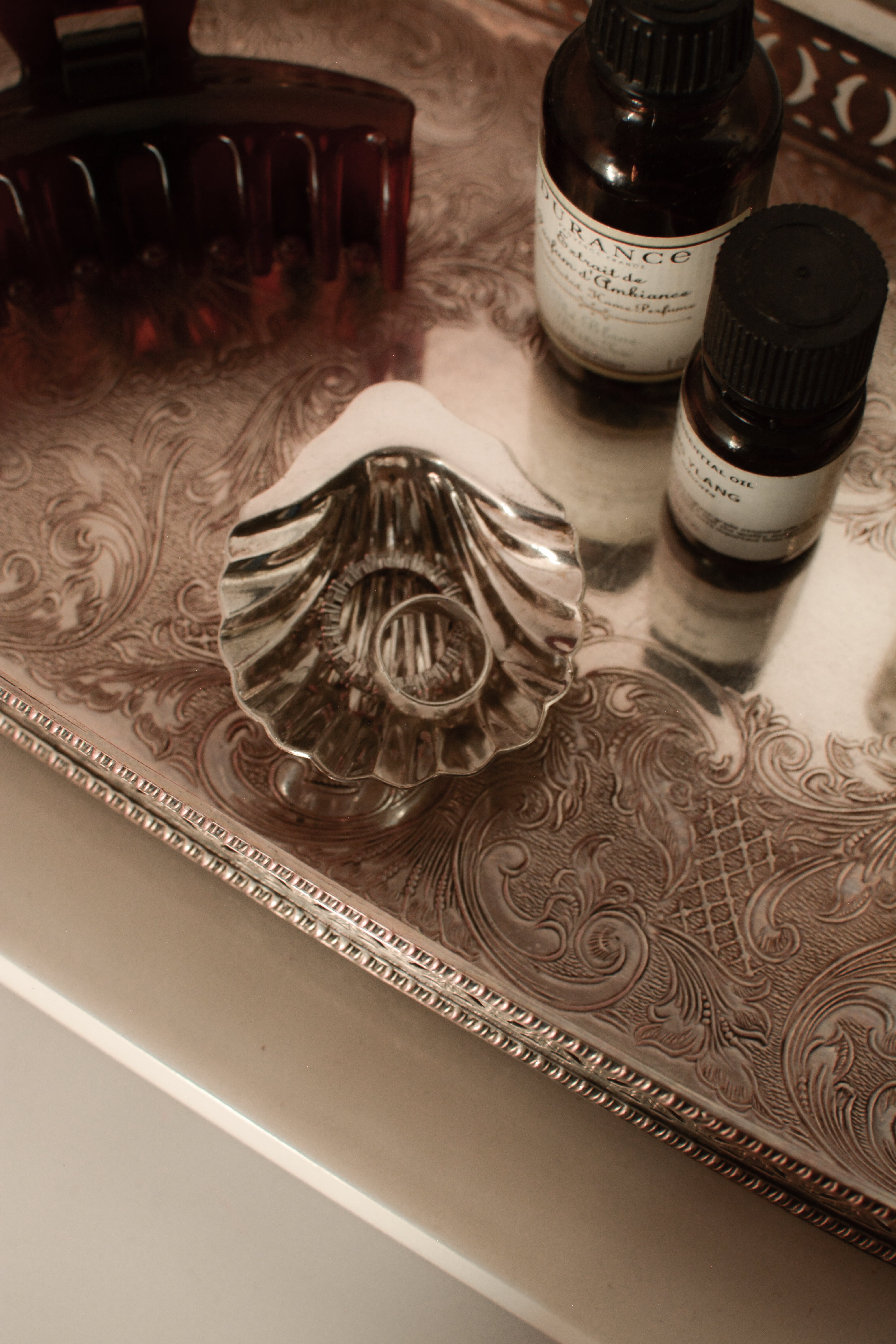 貝殻のような繊細なフォルムと、上質なシルバープレート、流れるようなラインが印象的な一品。 20世紀初頭のイギリスで作られたもので、裏面には「RF E & Co L」のメーカーズマークが刻まれています。もともとは食卓でソルトディッシュとして使われていたものだそうです。小さなフォルムがまた特別な可愛さを感じますね。指輪やピアスをそっと置いておいたりしても素敵だと思います。脚部分は愛らしい巻貝のデザイン、細部まで美しく仕上げられており経年による風合いは見られますが、全体的にコンディションは良好です。 複数在庫ございますので、セレクトしてのお届けとなります。