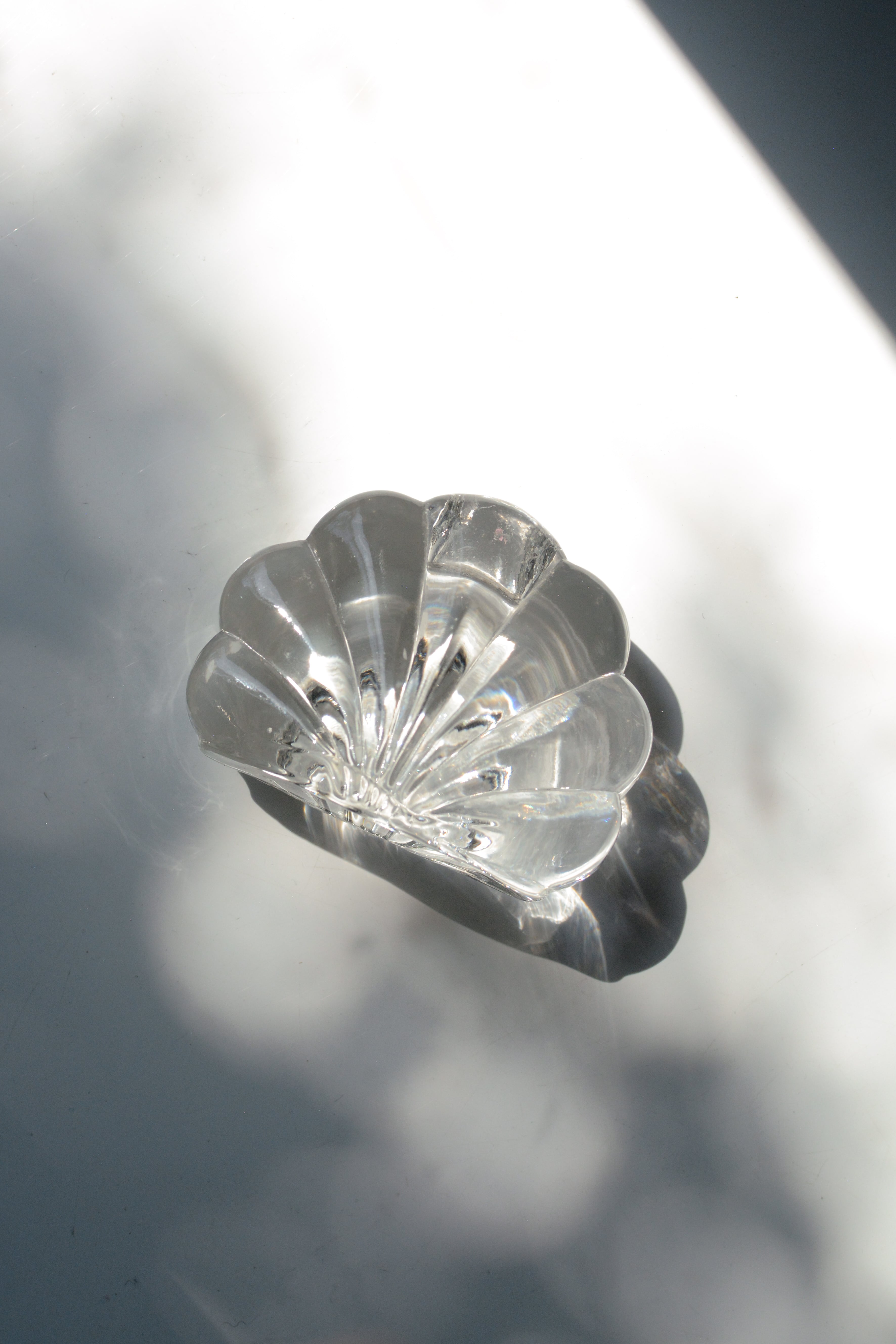 静かな光を受けて、やわらかく輪郭を浮かび上がらせるガラスのシェル。光を通すたびに、まるで水面のゆらぎのような影を落とし、空間にそっと余白をつくります。ミッドセンチュリーらしいシンプルさと、貝殻モチーフのやわらかな曲線が重なり合い、今の暮らしにも自然に馴染む佇まい。