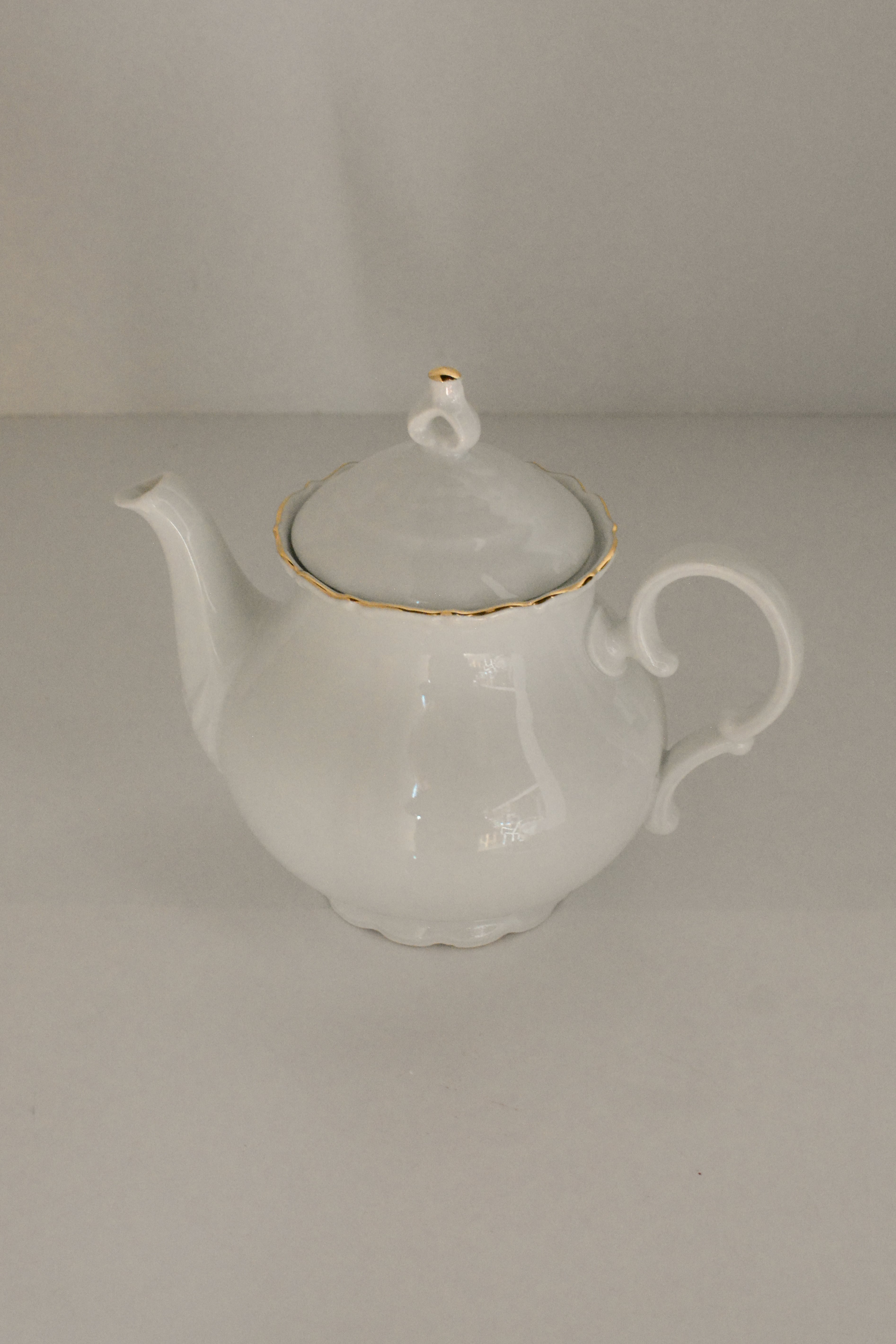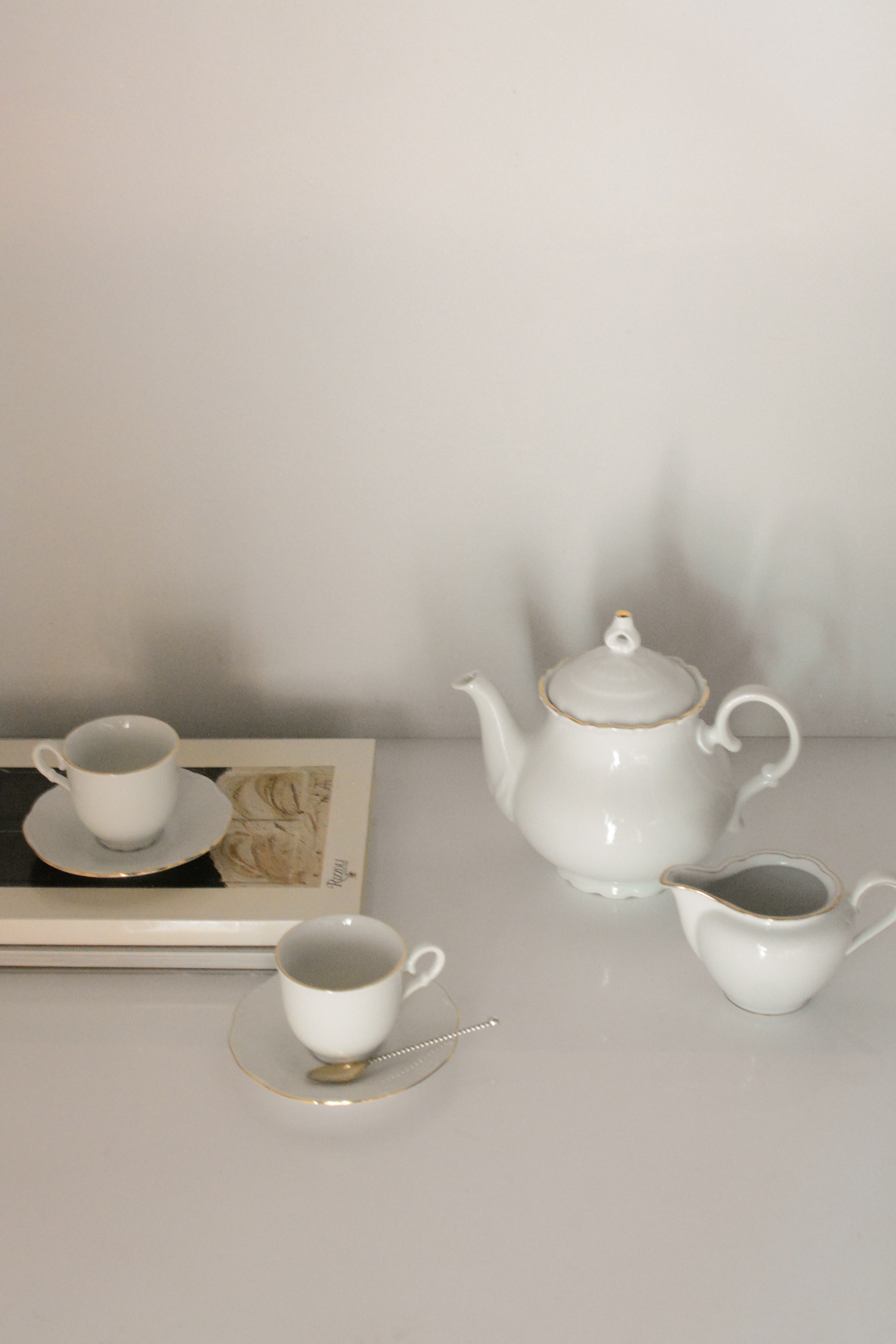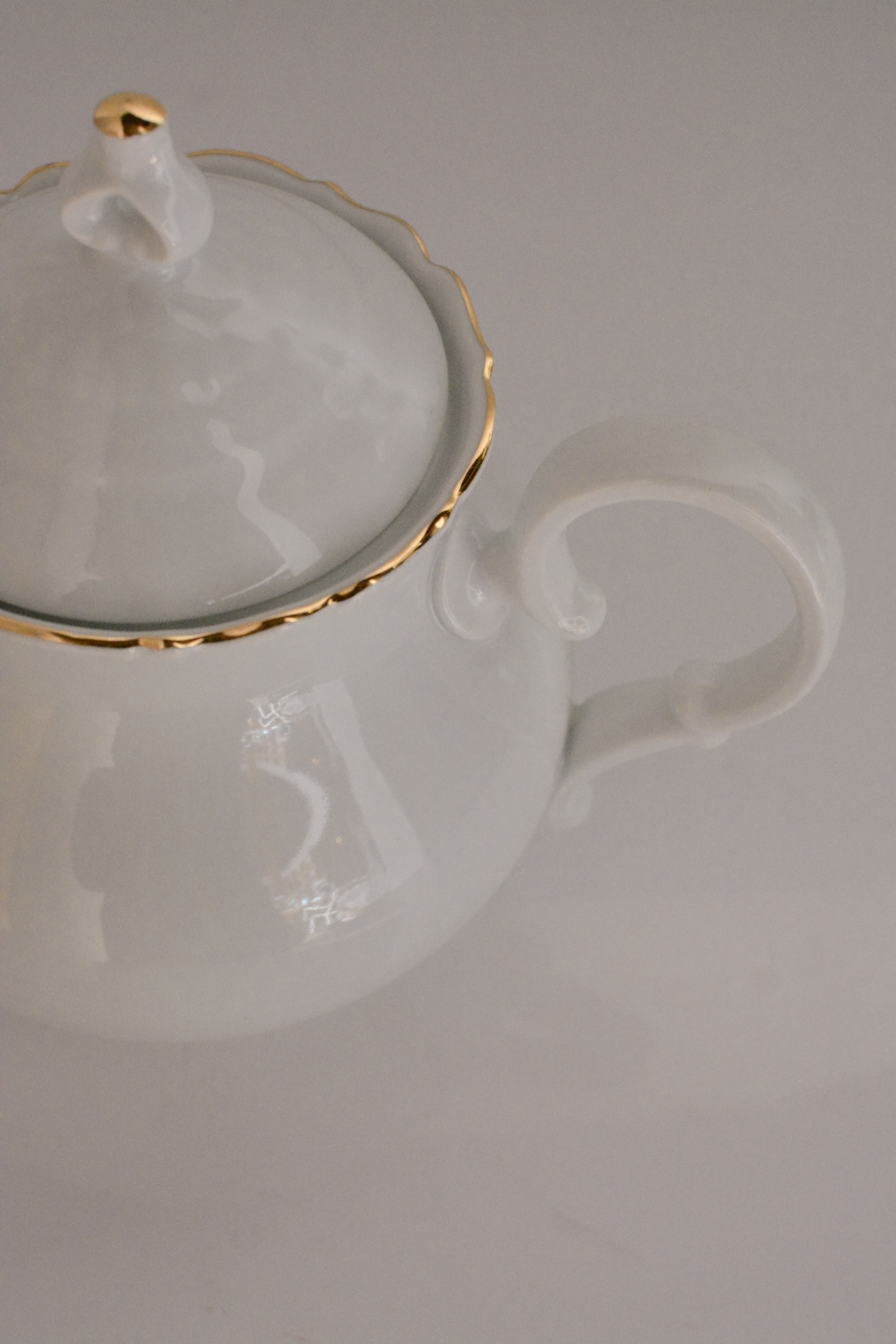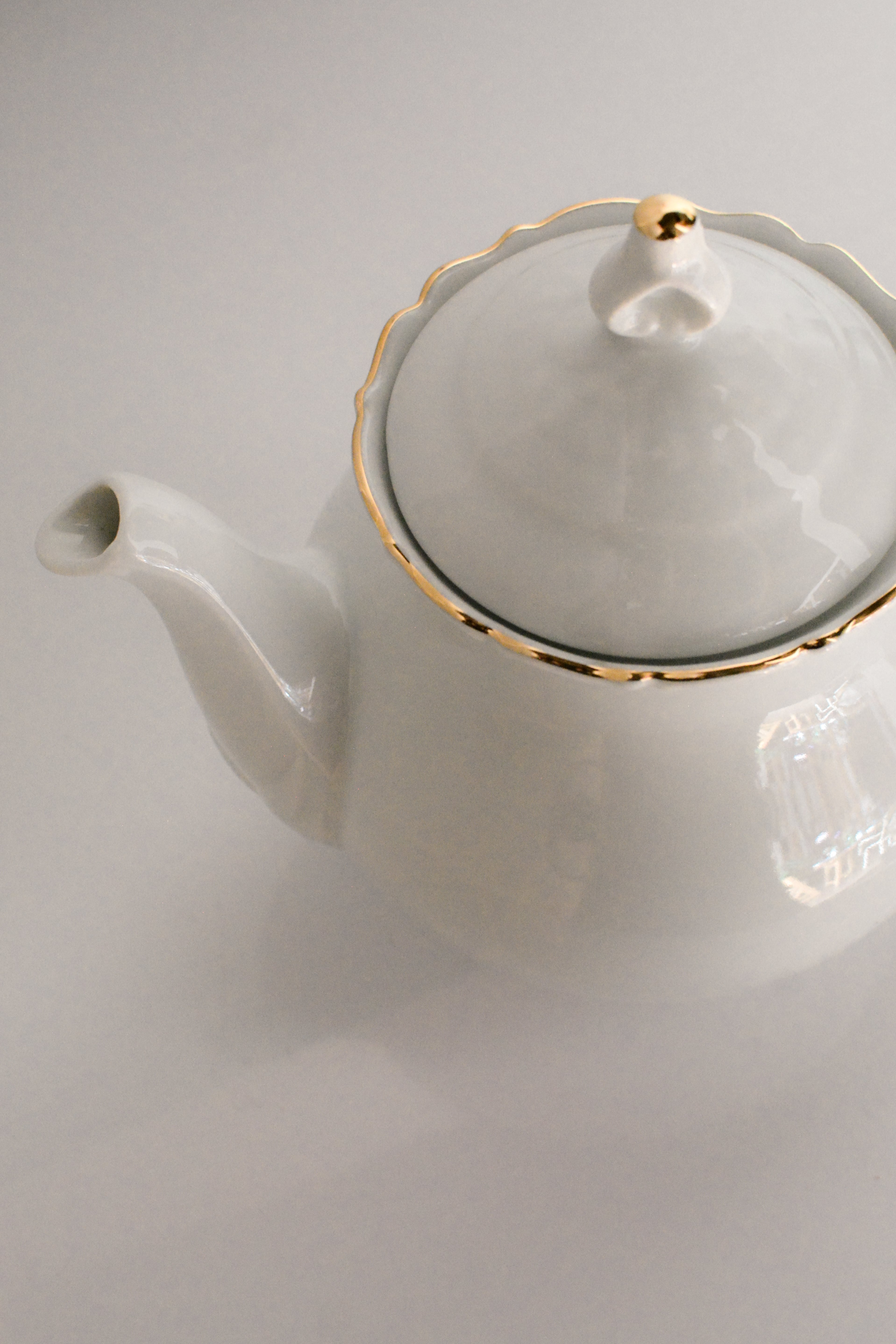 やわらかな曲線でかたどられたフォルムに、縁取るようにあしらわれた繊細なゴールド。ふっくらとしたボディと優雅に伸びる注ぎ口、手に馴染むハンドルのバランスもとても美しいですね。