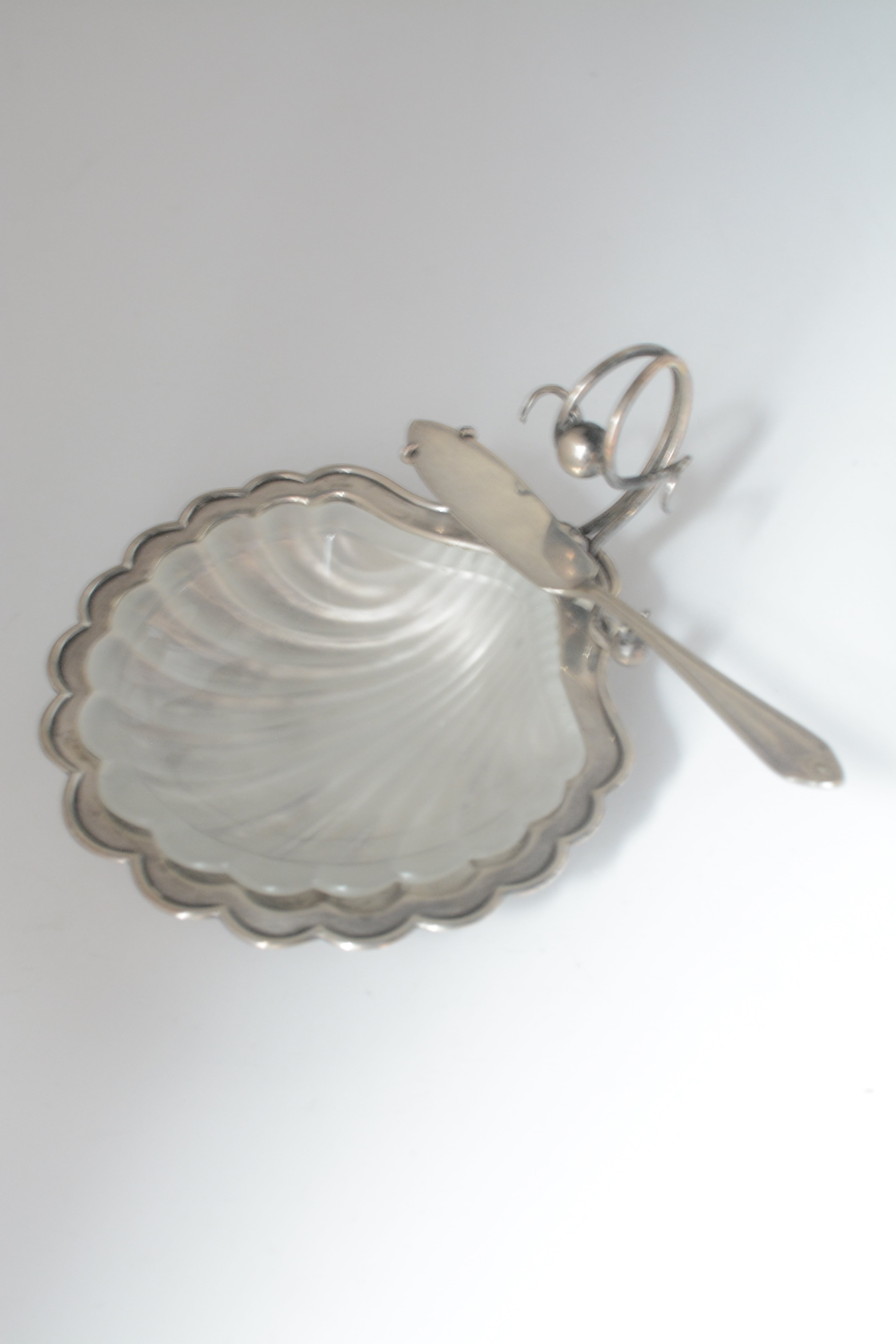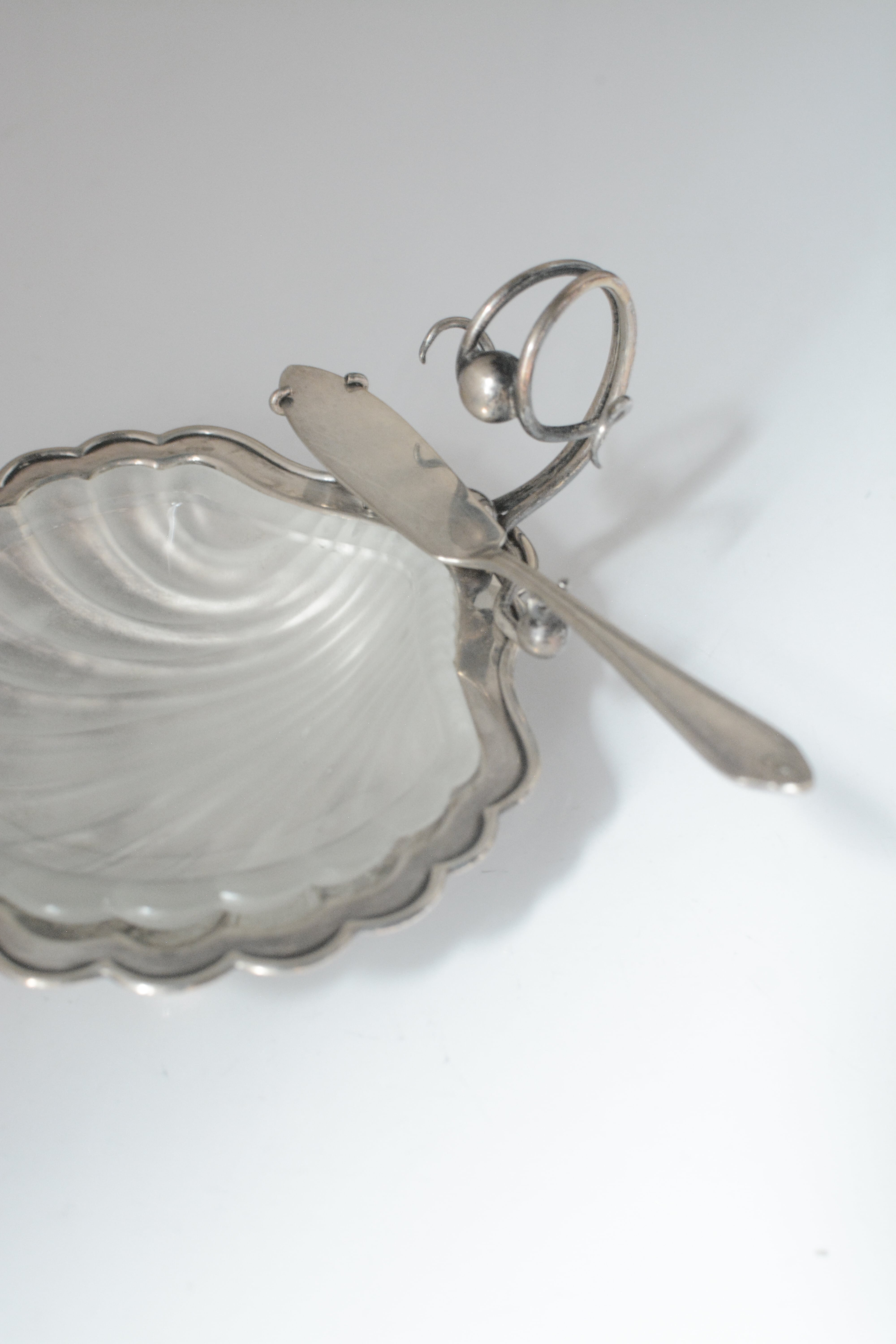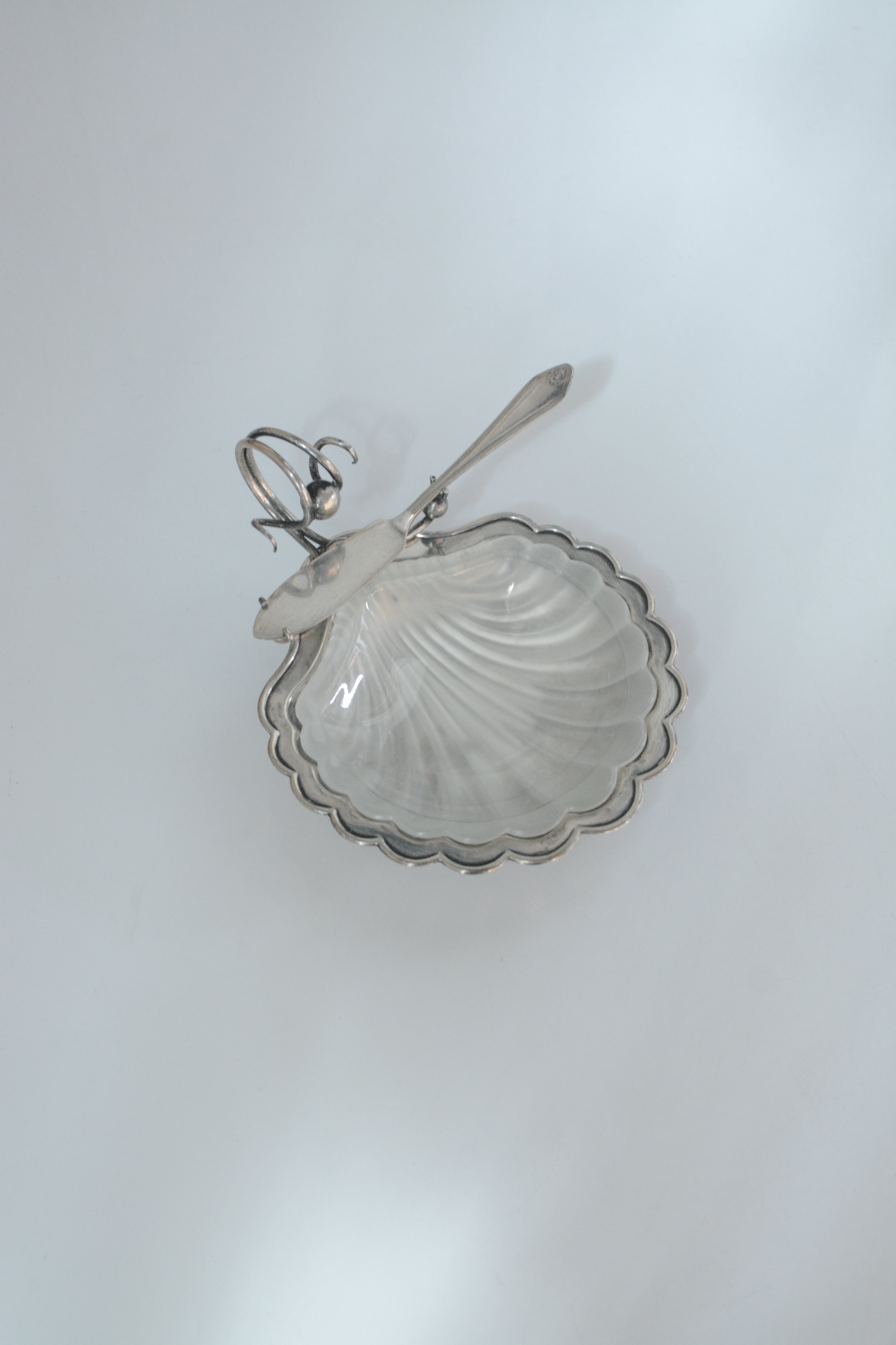 やわらかな曲線を描くガラスと、静かに艶を落としたシルバープレート。静かな佇まいでありながら特別な空気を醸し出しているバターディッシュです。1930年代頃のイギリス製、テーブルにあるだけでときめき、ナイフを添える一瞬、一つ一つの所作が楽しく美しいアイテム。磨きながら、手をかけながら、時間とともに育てていく楽しみもありますね。