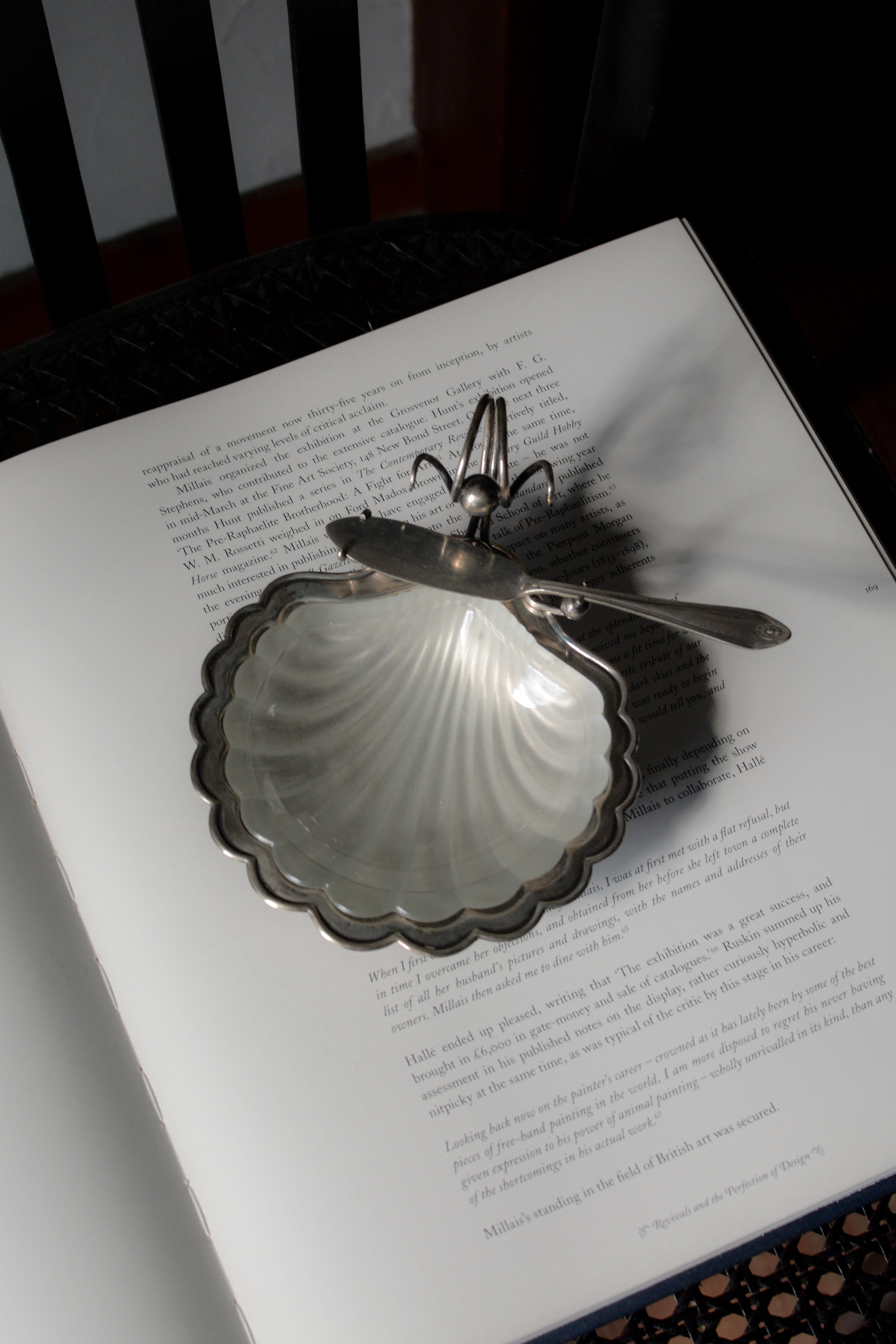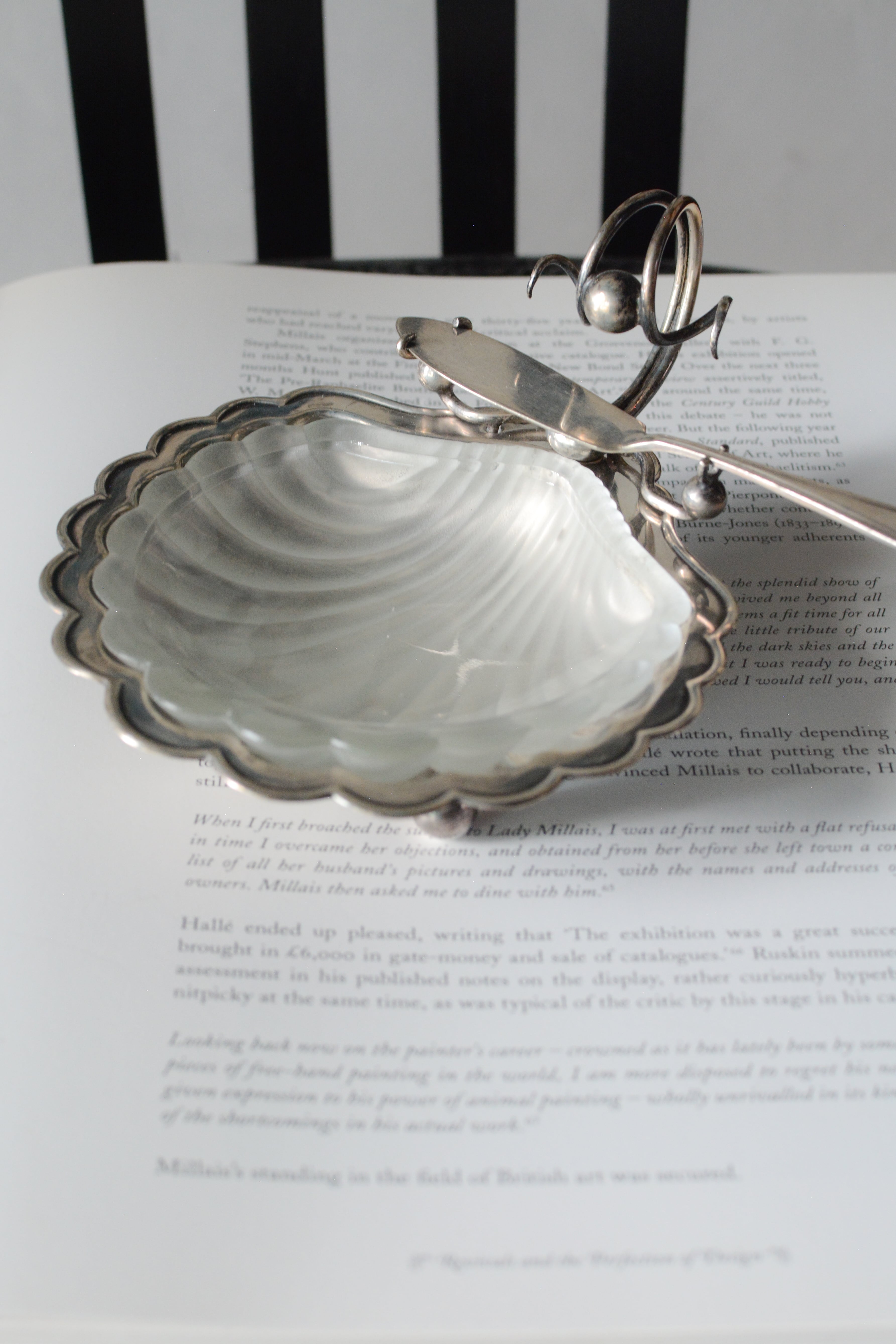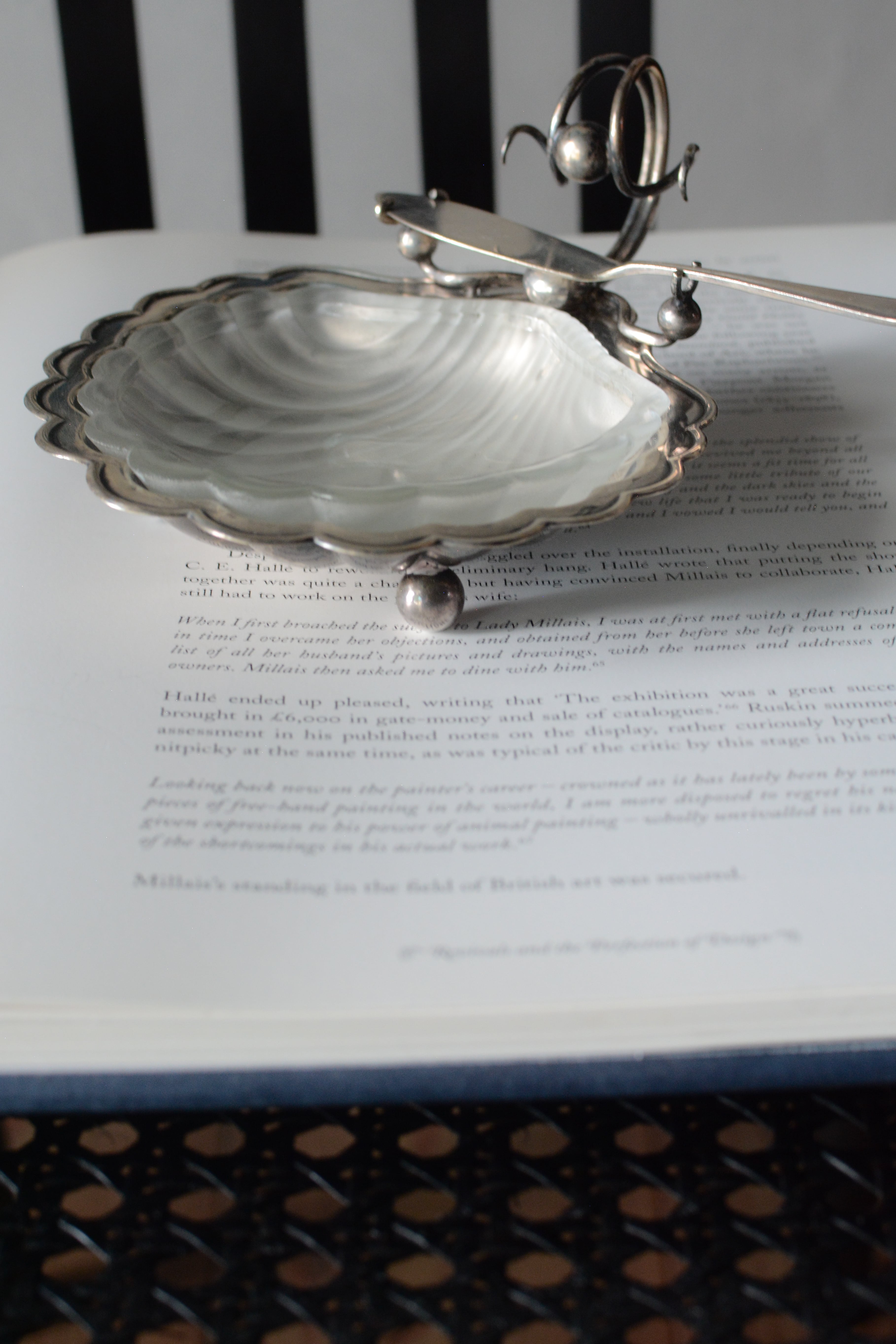 やわらかな曲線を描くガラスと、静かに艶を落としたシルバープレート。静かな佇まいでありながら特別な空気を醸し出しているバターディッシュです。1930年代頃のイギリス製、テーブルにあるだけでときめき、ナイフを添える一瞬、一つ一つの所作が楽しく美しいアイテム。磨きながら、手をかけながら、時間とともに育てていく楽しみもありますね。