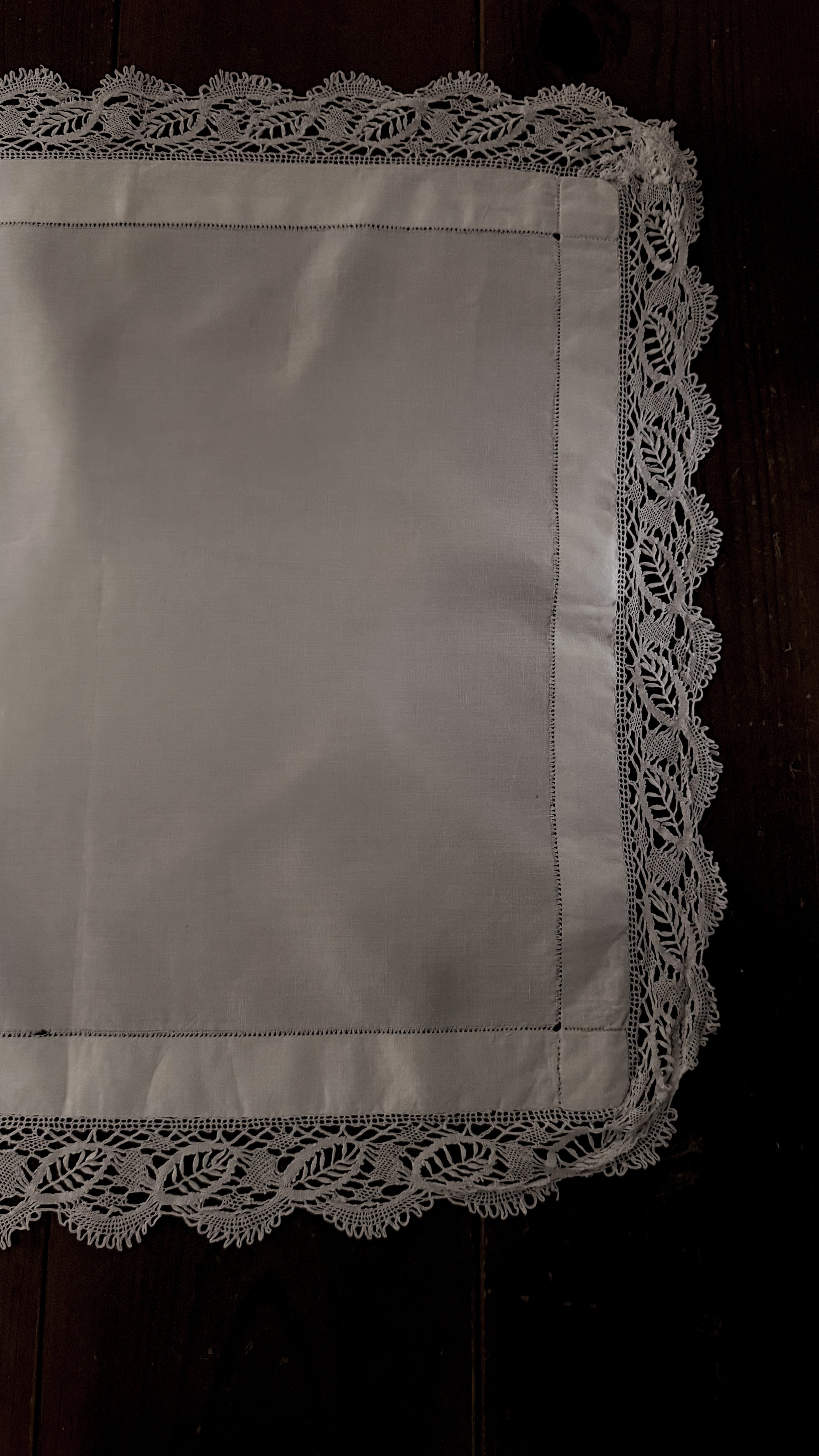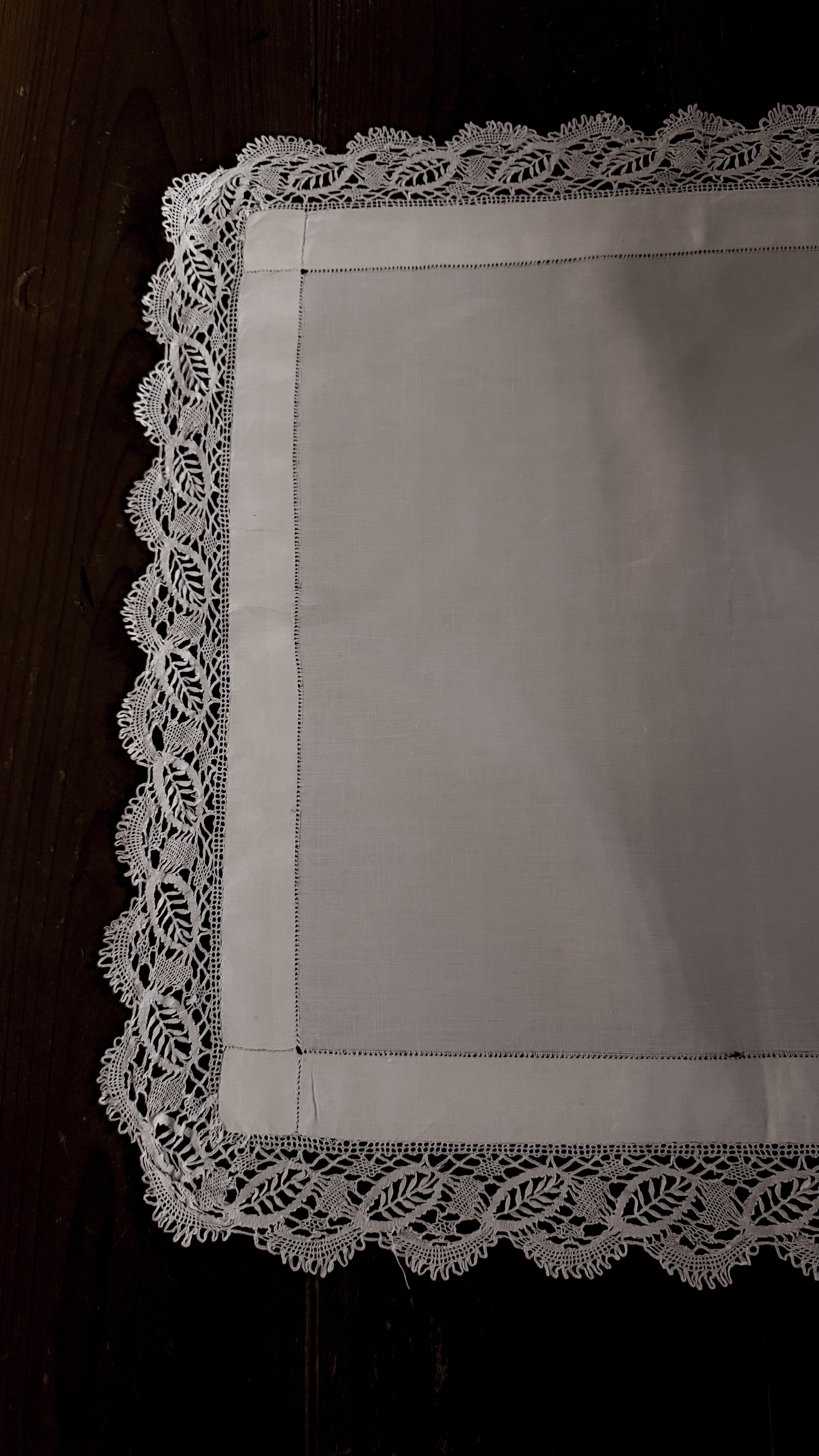 やわらかなコットン地に、繊細なレースの縁取りが施されたヴィンテージのテーブルセンター。規則正しく並ぶレース模様は、どこか素朴で、長い時間を経てきた布ならではのやさしさを感じさせます。テーブルやチェストの上に一枚添えるだけで、光の陰影とともに空間に奥行きが生まれ空気を整えてくれるよう。器や花を引き立てながら、主張しすぎず、日常の中にそっと溶け込みます。テーブルセンターとしてはもちろん、チェストやサイドテーブルに掛けたり、バスケットにふわりとかけて収納の目隠しに使ったり。時を経たものならではの風合いを楽しみながら、暮らしの中で少しずつ馴染ませていただけそうな一枚です。ヴィンテージ品のため、糸の風合いや変化がございます。長い時間を経てきたものならではの表情として、お楽しみください。