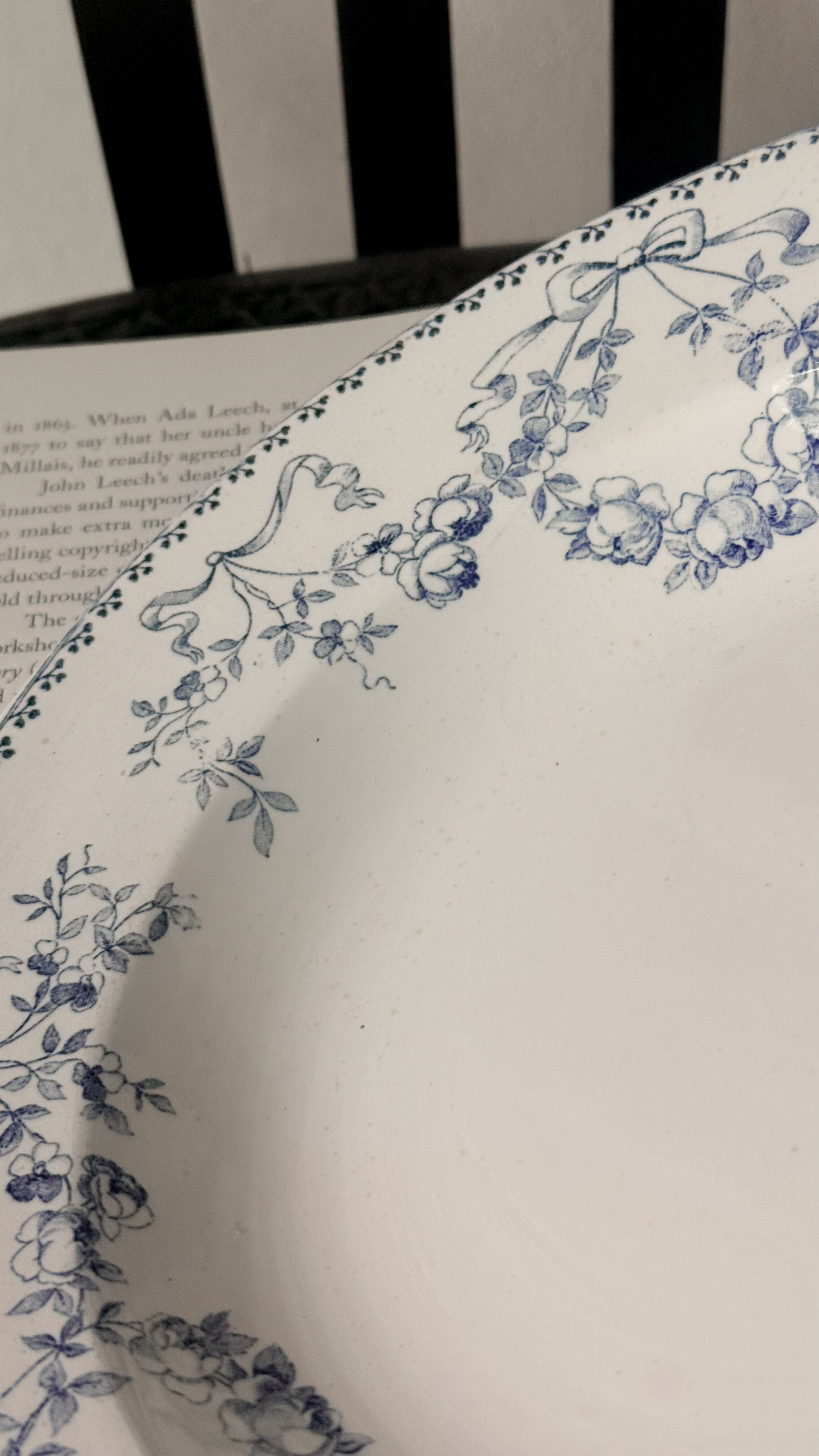 やわらかな白地に、繊細なブルーの花とギルランドが静かに巡る一枚。フランスSarreguemines U&C時代に作られたMozartシリーズの深皿です。リボンのように連なる草花の装飾は、主張しすぎず、それでいてテーブルに上品なリズムを添えてくれます。スープやパスタ、サラダなどに使われていたのでしょうか使いやすい深さがあり、実用美を備えています。静かに寄り添いながら、いつものテーブルを特別にしてくれる一枚ですね。