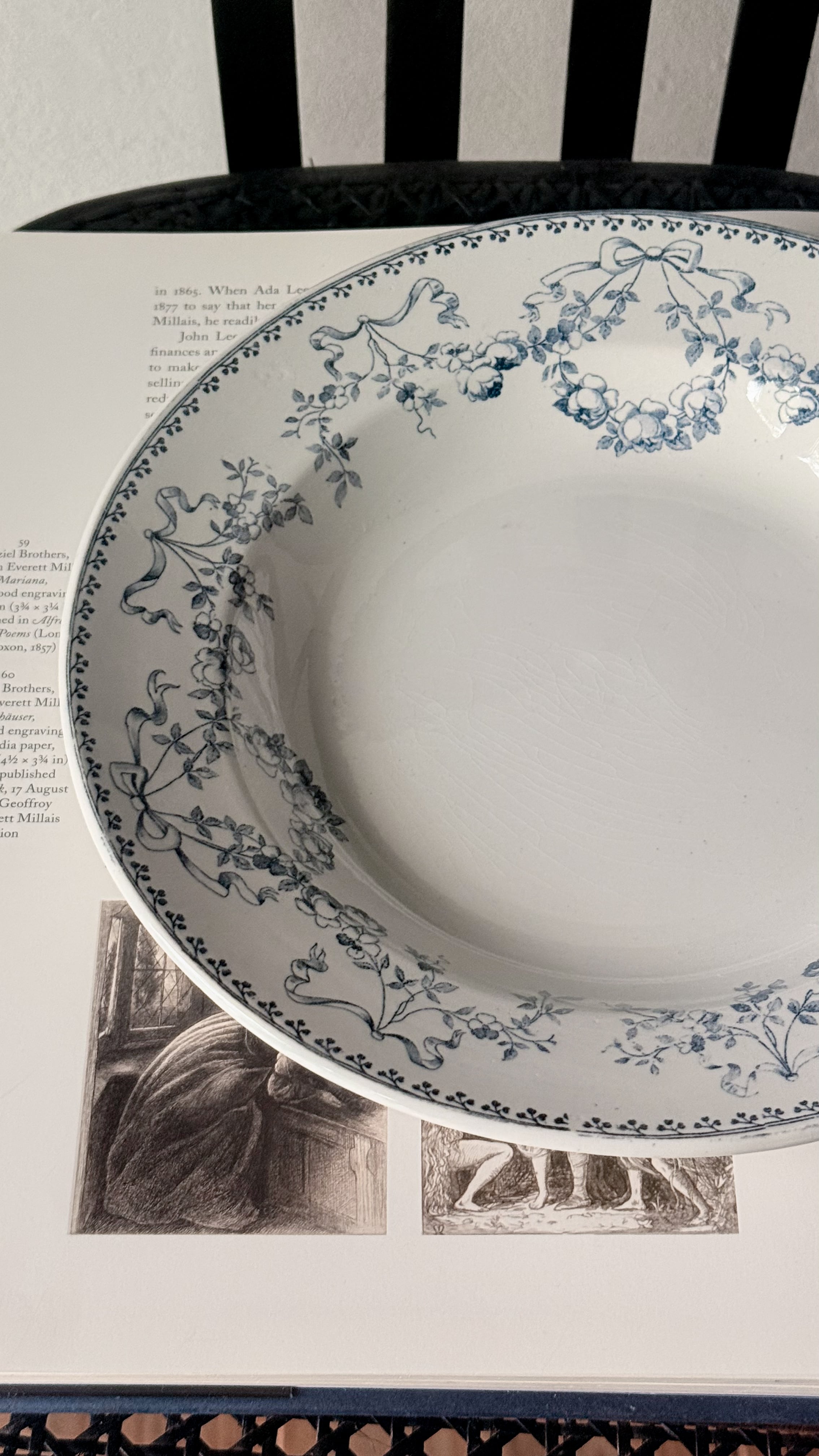 やわらかな白地に、繊細なブルーの花とギルランドが静かに巡る一枚。フランスSarreguemines U&C時代に作られたMozartシリーズの深皿です。リボンのように連なる草花の装飾は、主張しすぎず、それでいてテーブルに上品なリズムを添えてくれます。スープやパスタ、サラダなどに使われていたのでしょうか使いやすい深さがあり、実用美を備えています。静かに寄り添いながら、いつものテーブルを特別にしてくれる一枚ですね。
