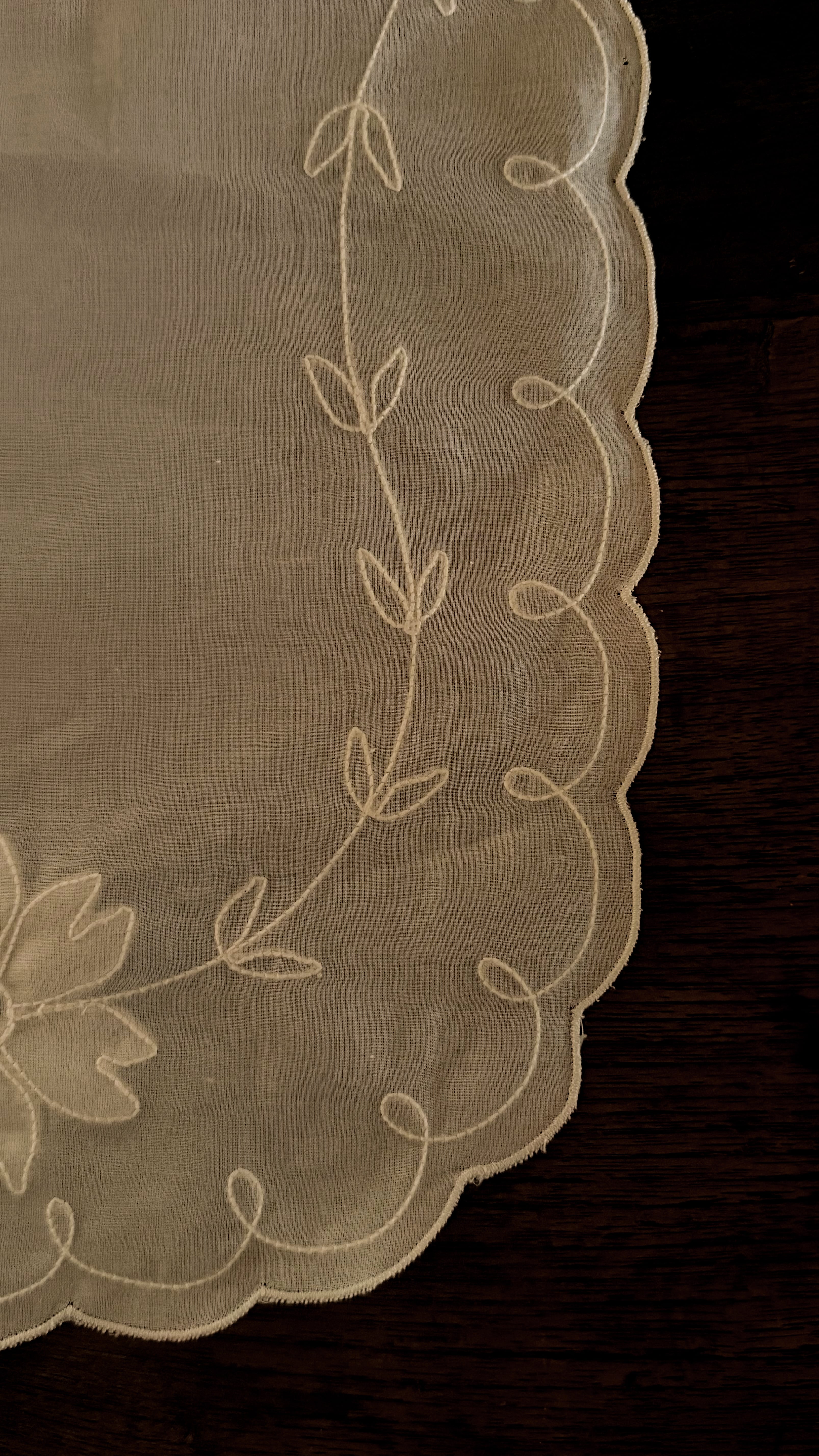 やわらかな光を受けて、静かに浮かび上がる刺繍の輪郭。薄く透けるオーガンジーに描かれたやさしい植物模様。少し揺らぎを感じるラインがまた魅力的に映ります。器や花器の下に敷いたり、夜、外した指輪やブレスレットをそっと預ける場所にしたりしても素敵ですね。古い暮らしの中で、誰かの日々に寄り添っていたであろう布。いまはまた別の時間へと渡り、新しくどなたかの空間の一部として息づいてくれるかと思います。ヴィンテージ品のため、多少の歪みや経年による表情の変化が見られる場合がありますが、それもまた、歩んできた時間の一部としてお楽しみください。複数在庫ございますので、セレクトしてのお届けとなります。