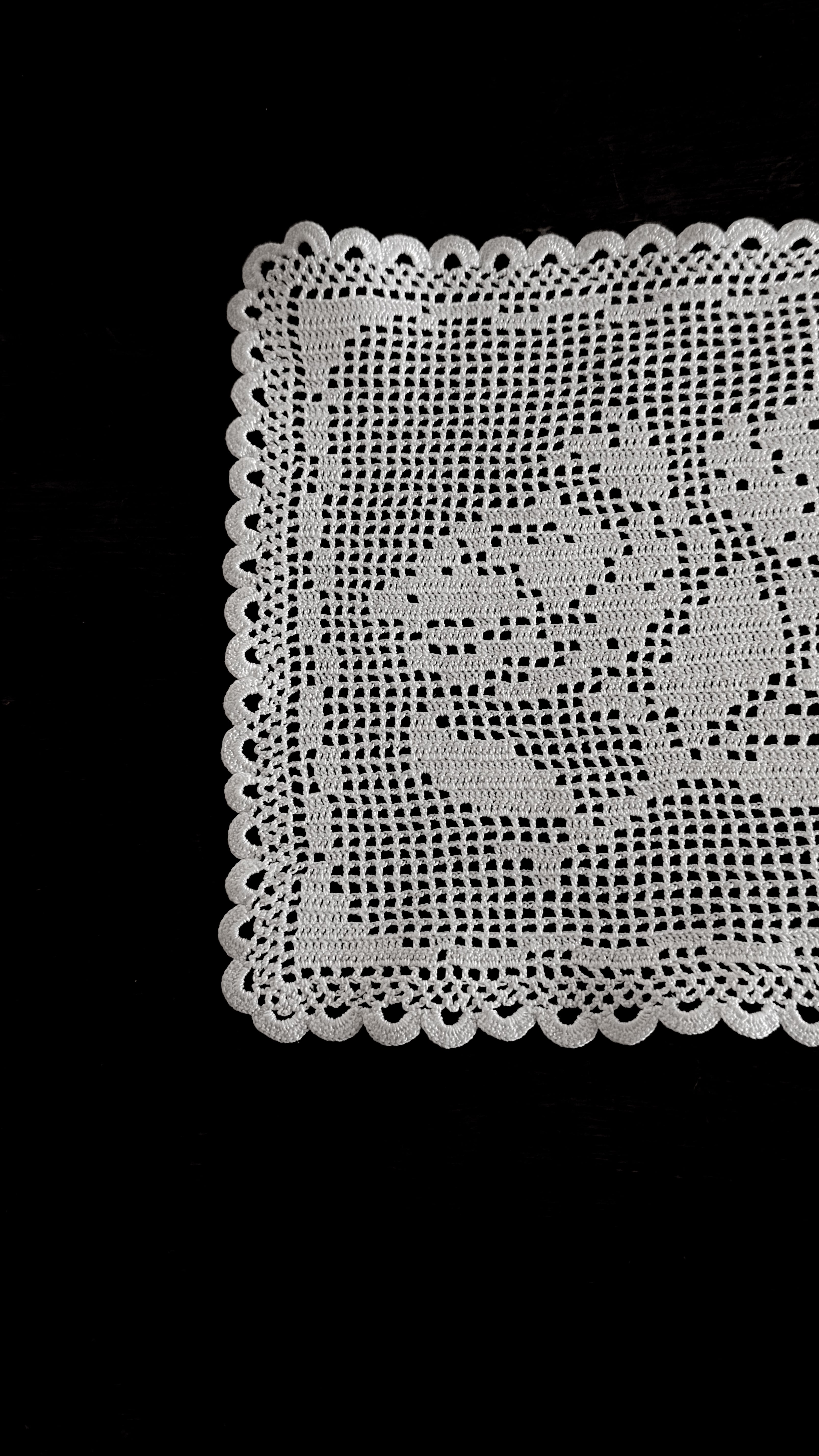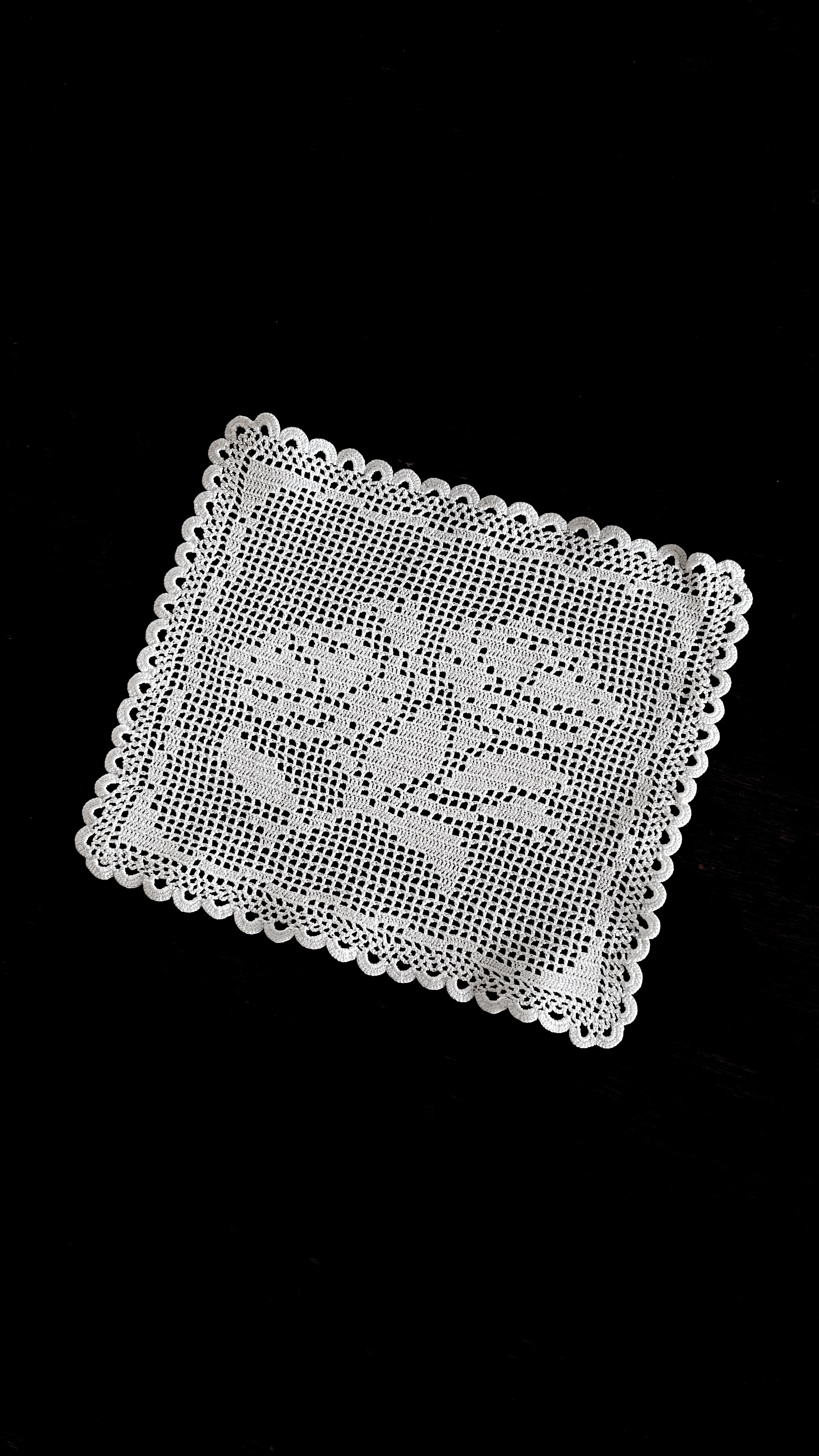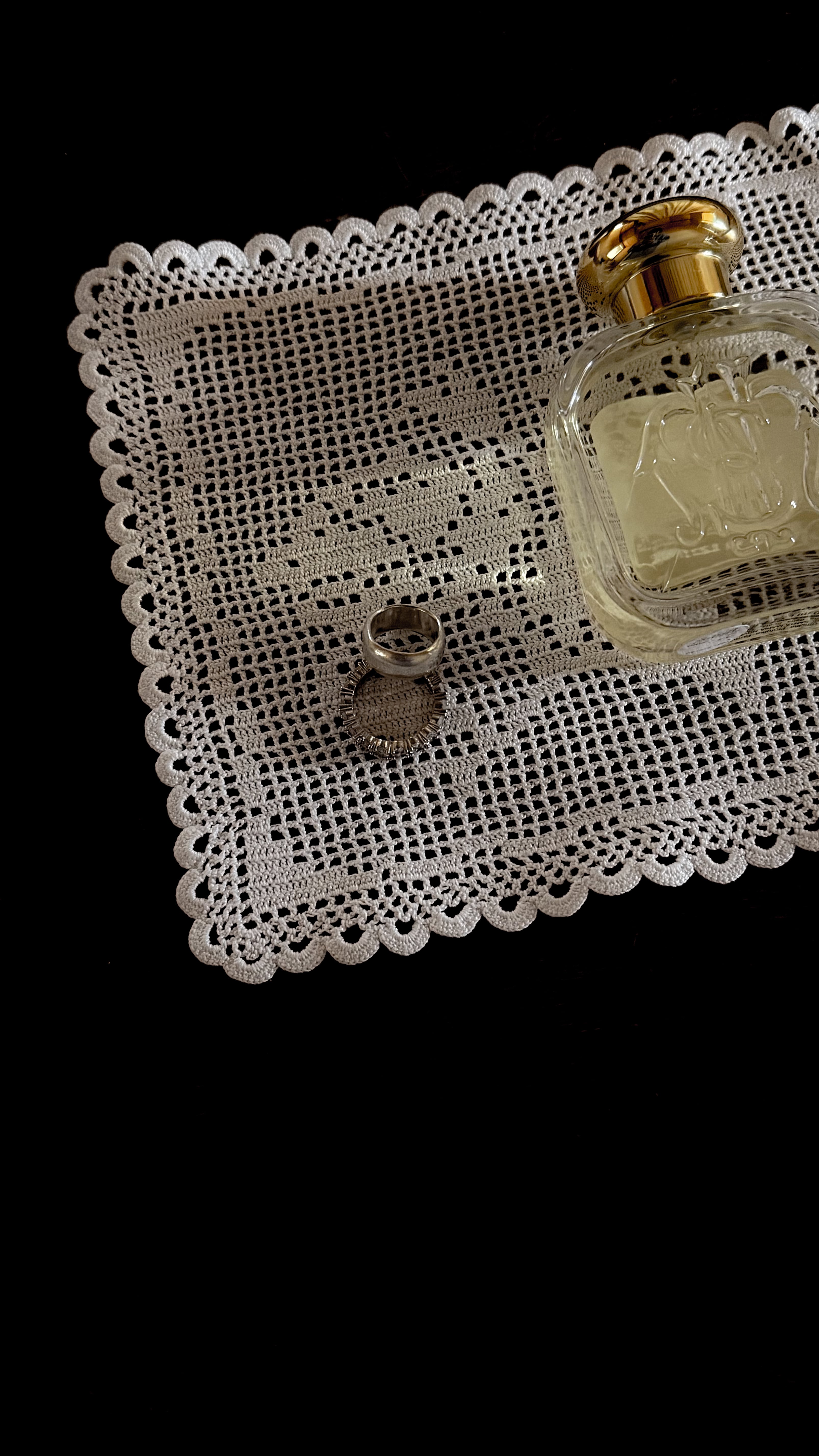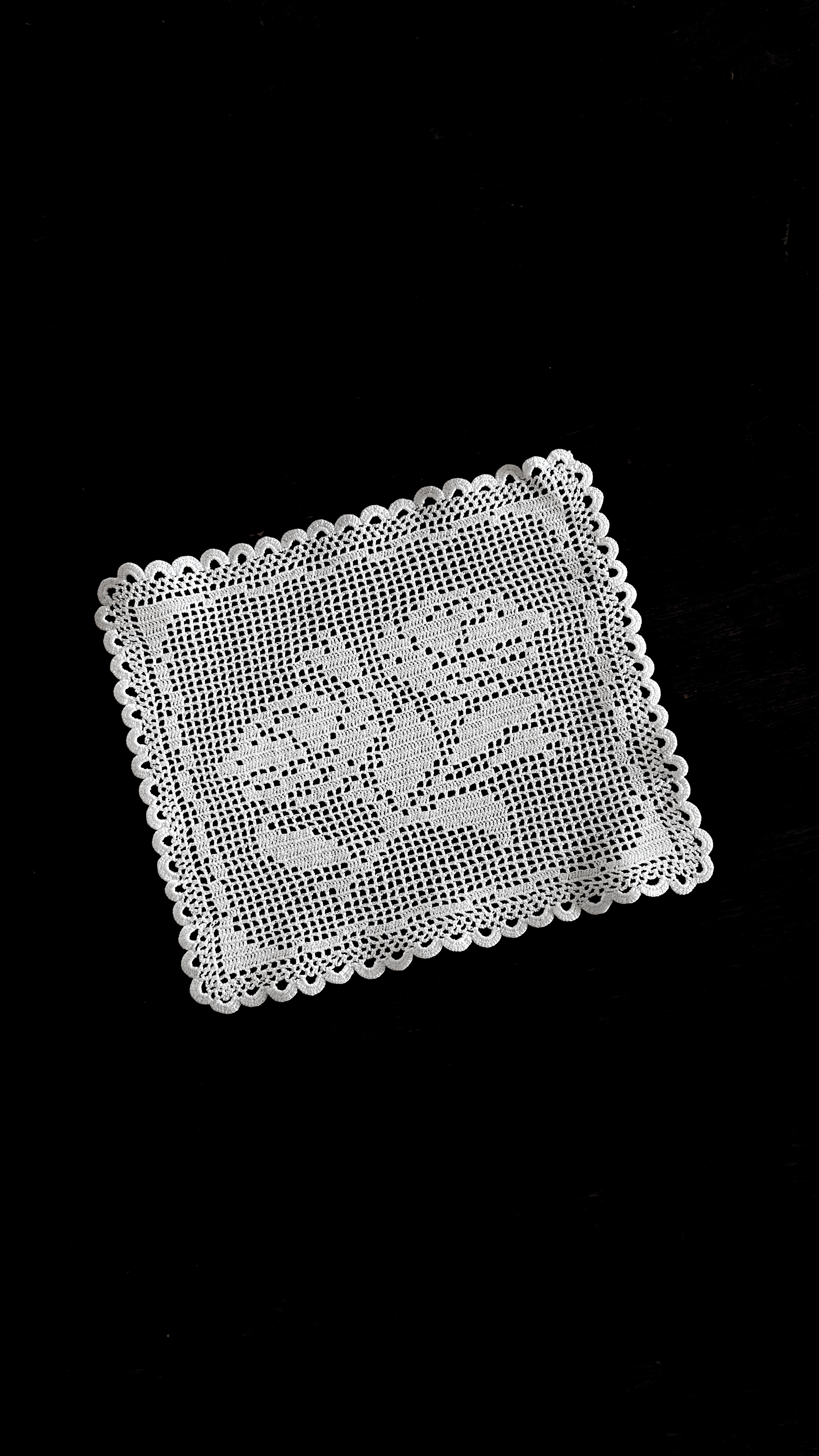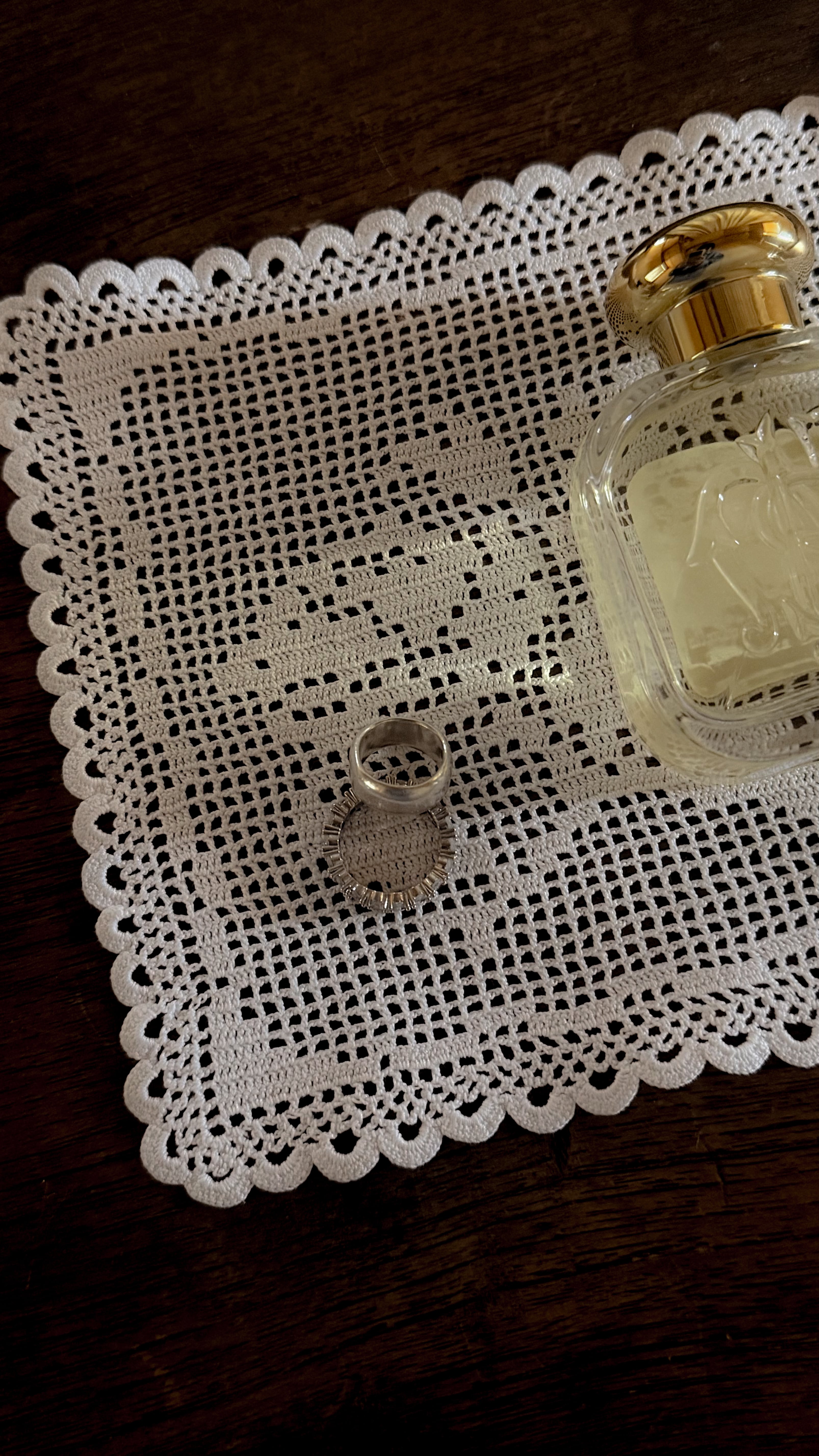 やわらかな時間をそっと切り取ったような、レースドイリー。野に咲くワイルドフラワーをモチーフに、繊細に編み上げられたフィレレース。規則正しさの中に、どこか素朴であたたかみのある表情が宿っています。ガラスの小皿やアクセサリーの下に添えたり、ヴィンテージの器と重ねて飾ったりと、日常の中にさりげない余白を生み出してくれそうな一枚。ヴィンテージ品のため、多少の歪みや経年による表情の変化が見られる場合がありますが、それもまた、このドイリーが歩んできた時間の一部としてお楽しみください。