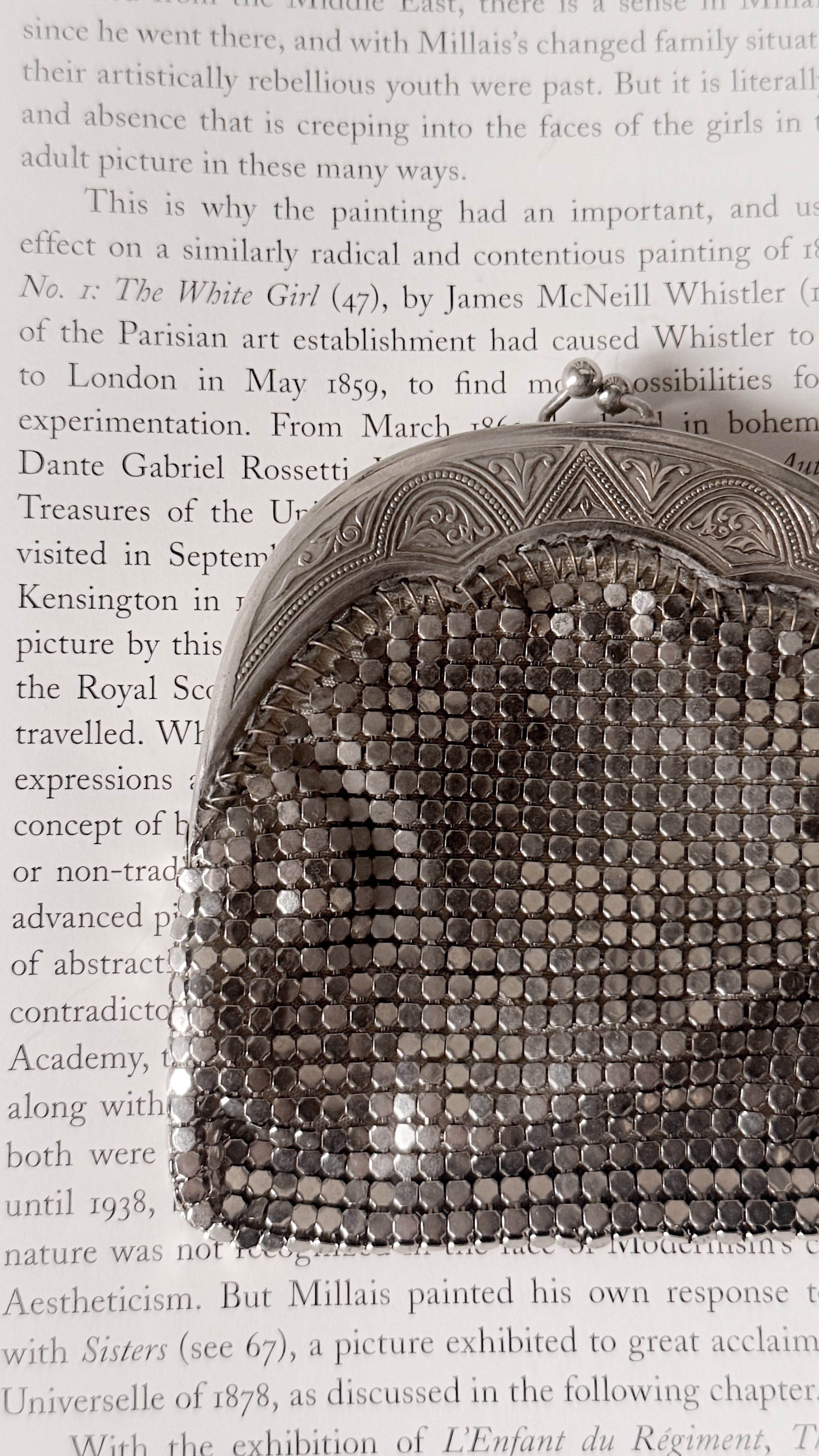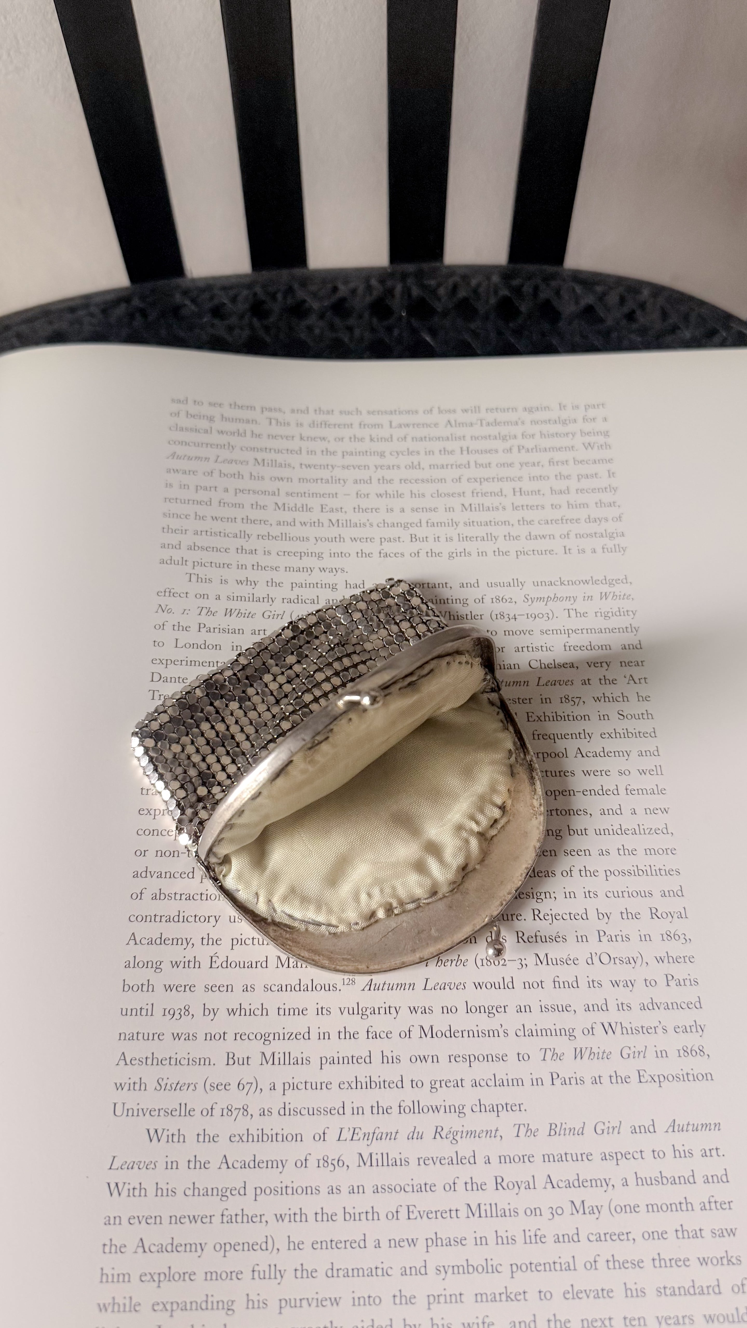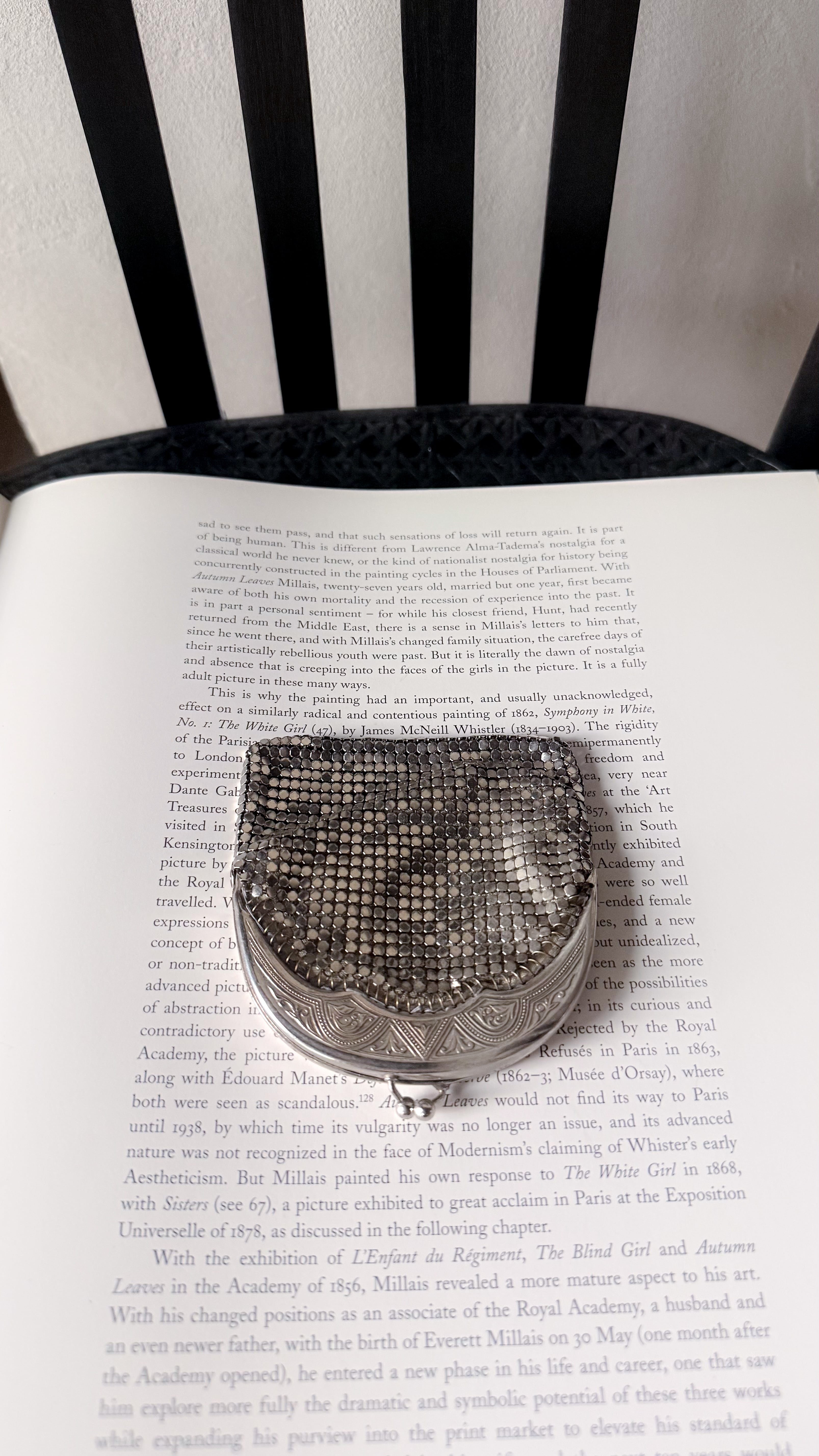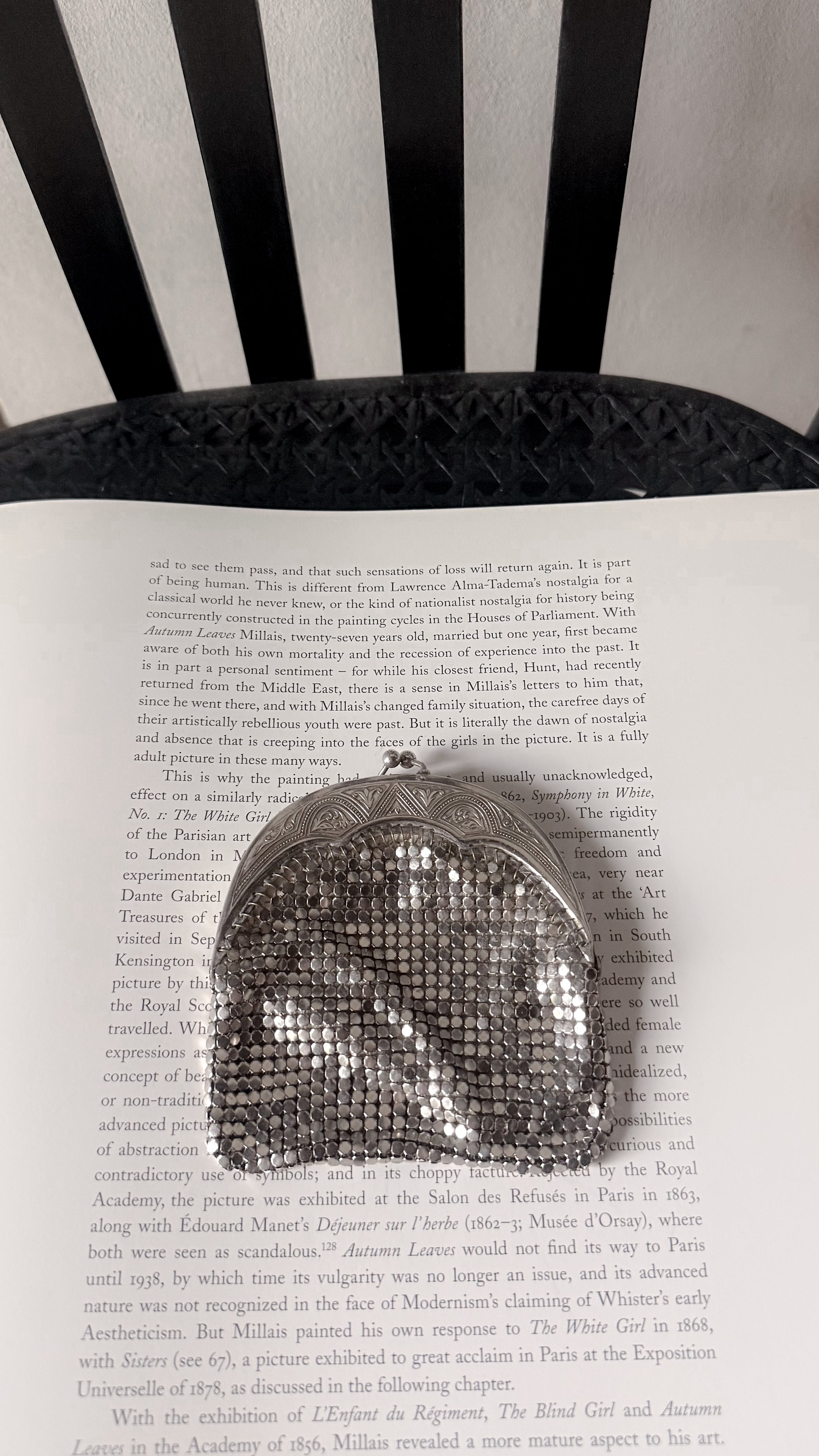 細やかな金属の編みがつくる、やわらかな光の陰影。金属の粒が連なり、 光を受けては、静かに呼吸するように揺れる美しいきらめき。使い込まれてきた風合いと、時を重ねた金属ならではの落ち着いた色味。時間を経たからこそ生まれる、美しさがあります。アクセサリーや小さな宝物を入れたり、バッグの中のひとつの景色として忍ばせたり。日々の中に、そっと物語を添えてくれる一点です。小傷等ございますがヴィンテージとしては比較的綺麗な状態です。