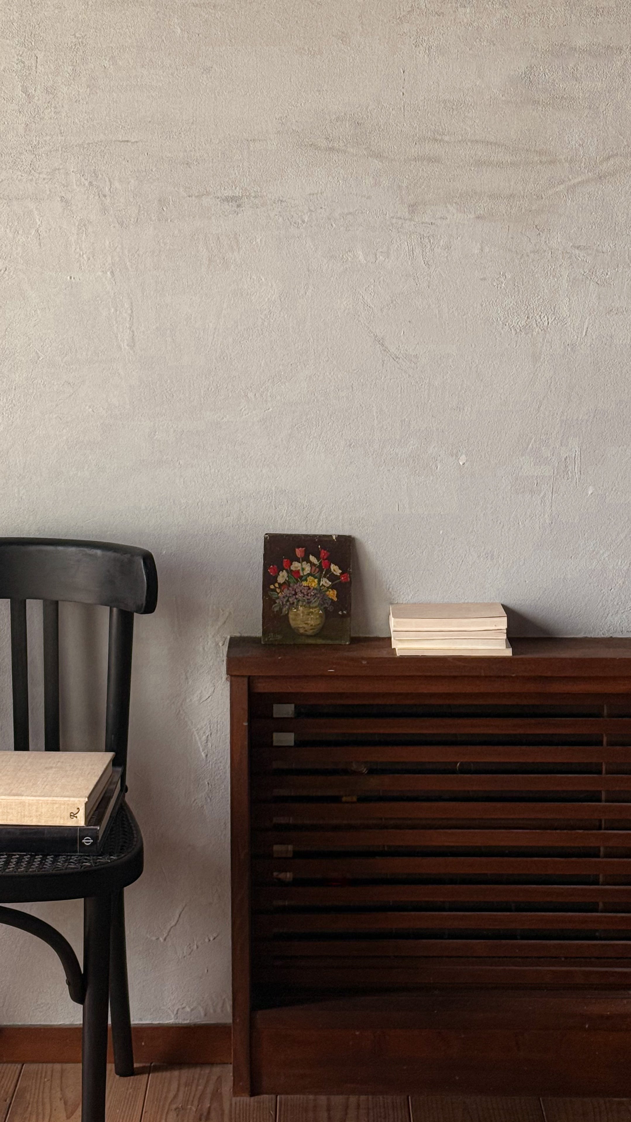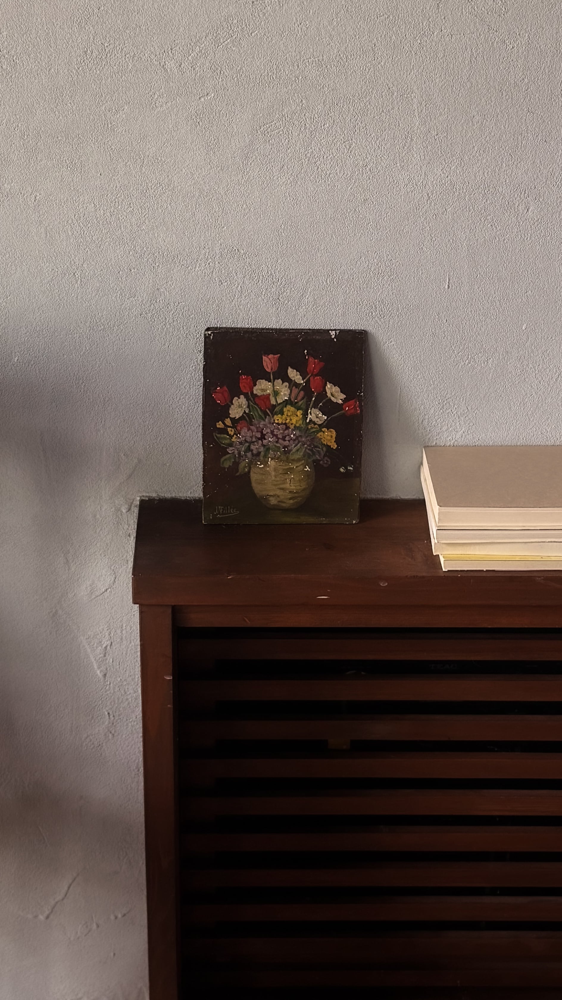 小さなパネルに描かれた、可憐なフラワーモチーフのヴィンテージペインティング。1950年代頃のものと思われる、あたたかみのある一点。深みのある背景の中に、赤や白、紫の花々がやわらかく浮かび上がり、どこか素朴で静かな時間を感じさせてくれます。経年による擦れや絵の具の剥がれなど、ヴィンテージならではの表情も魅力のひとつ。長い時間を経てきたからこその風合いが、空間に自然に馴染みます。そのまま立てかけて飾るのはもちろん、額装してもとても素敵だと思います。何気ないお部屋の一角をお気に入りの場所に変えてくれるようなヴィンテージピースです。