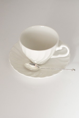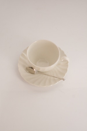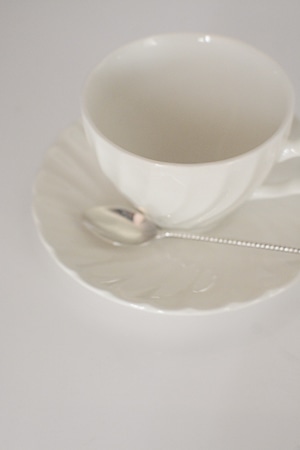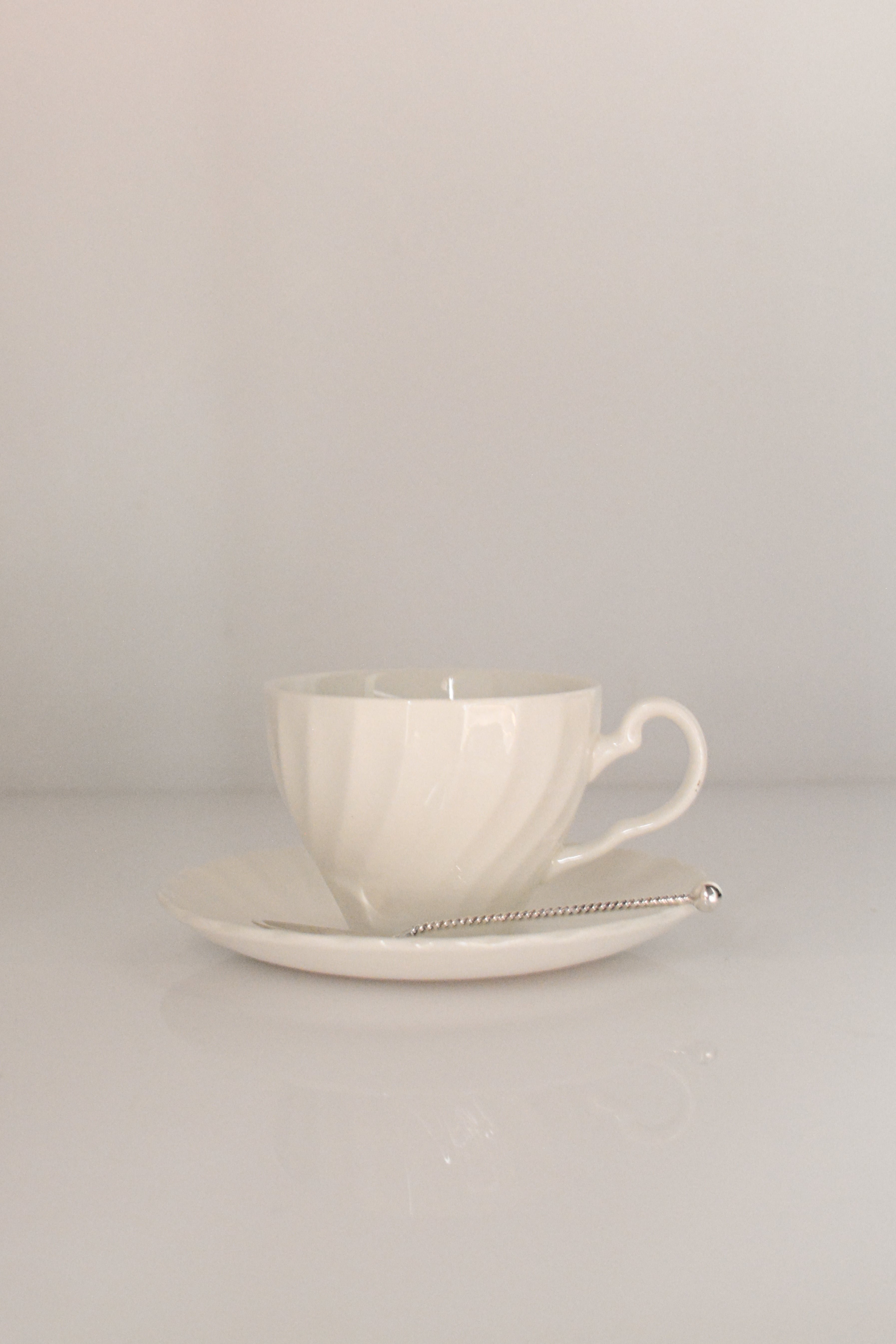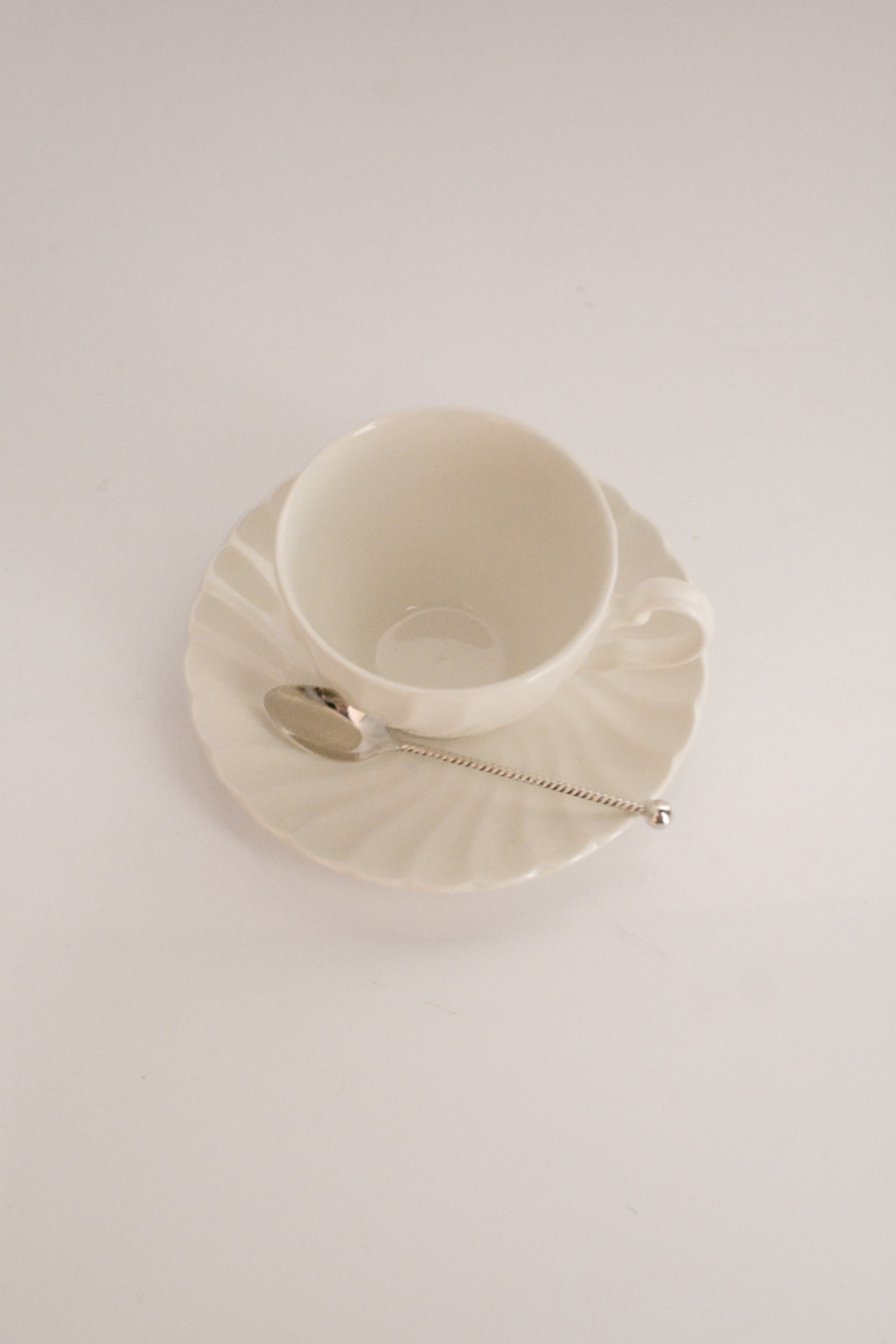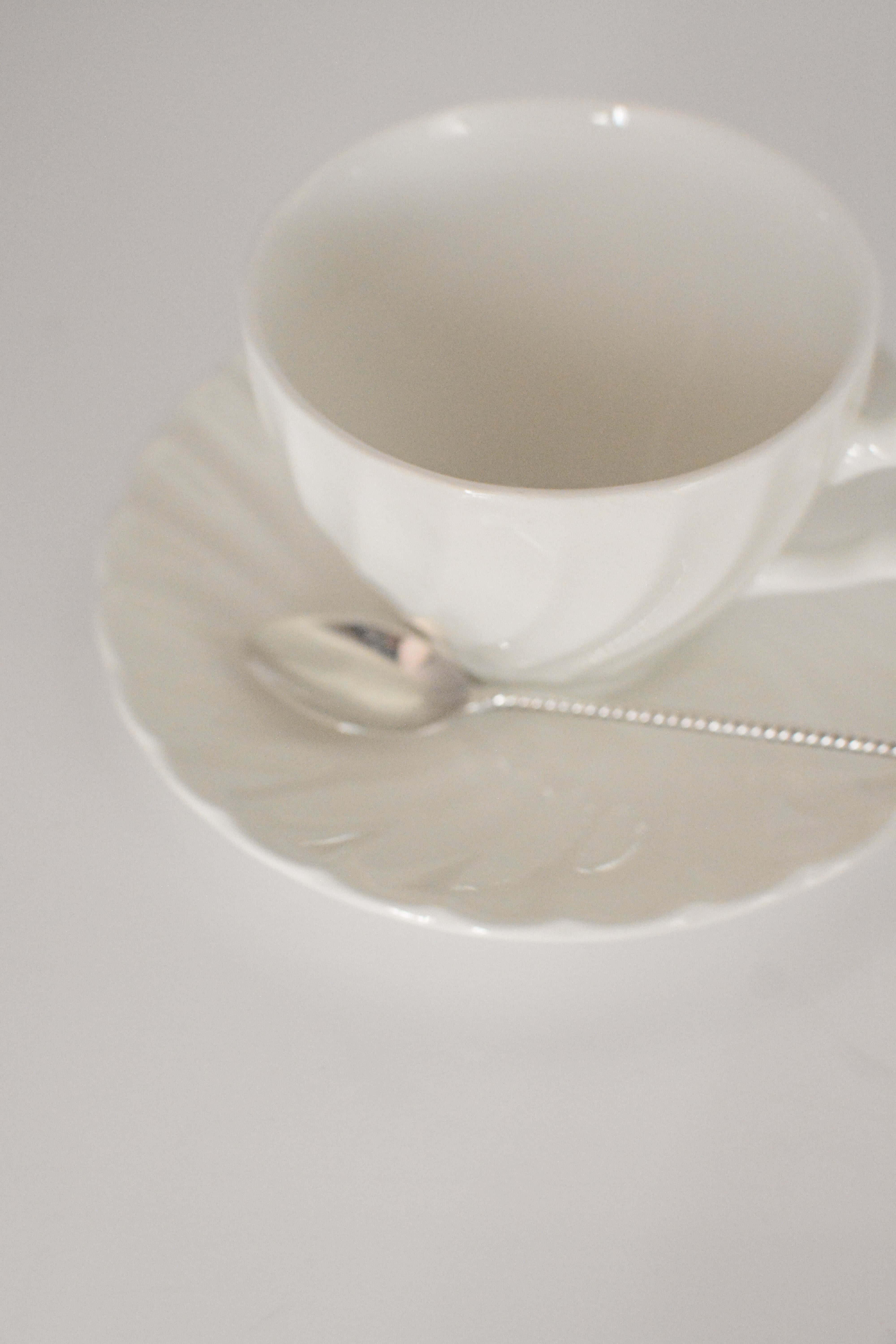やわらかなアイボリーホワイトの色合いと、ほどよい厚みのあるアイアンストーンならではの安心感のある手触り。カップ側面には控えめなレリーフの陰影が入り、シンプルながらも光の当たり方で表情が変わります。ソーサーの花びらのような緩やかなリムのラインも美しいですね。洗練された佇まいで、主張しすぎず、他の器やカトラリーとも合わせやすいため、テーブルコーディネートのベースとしても◎貫入などヴィンテージならではの落ち着いた風合いをお楽しみください。小傷等ございますがヴィンテージとしては比較的綺麗な状態です。複数在庫ございますので、セレクトしてのお届けとなります。