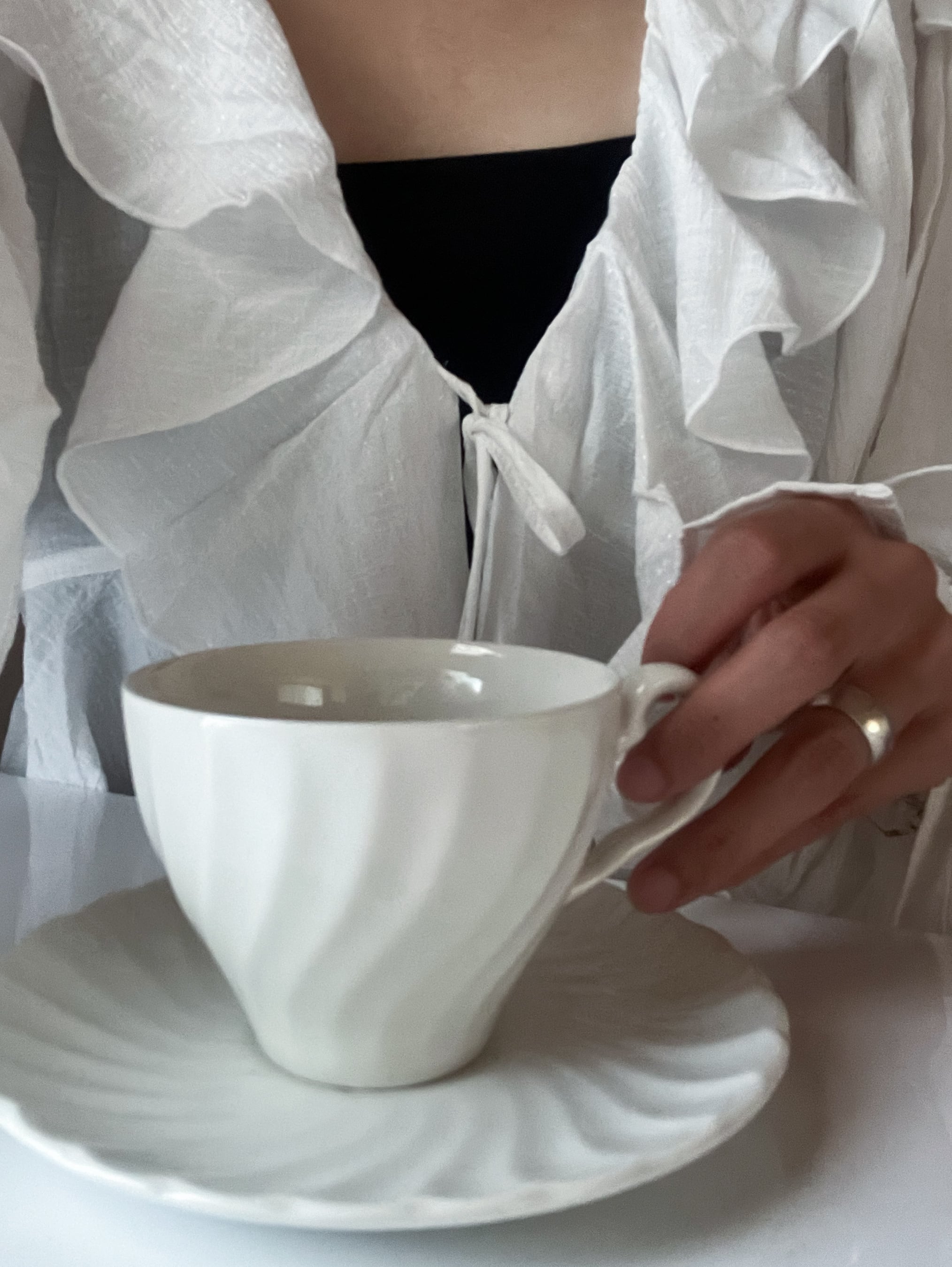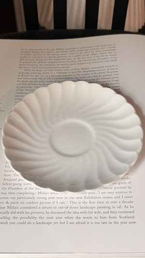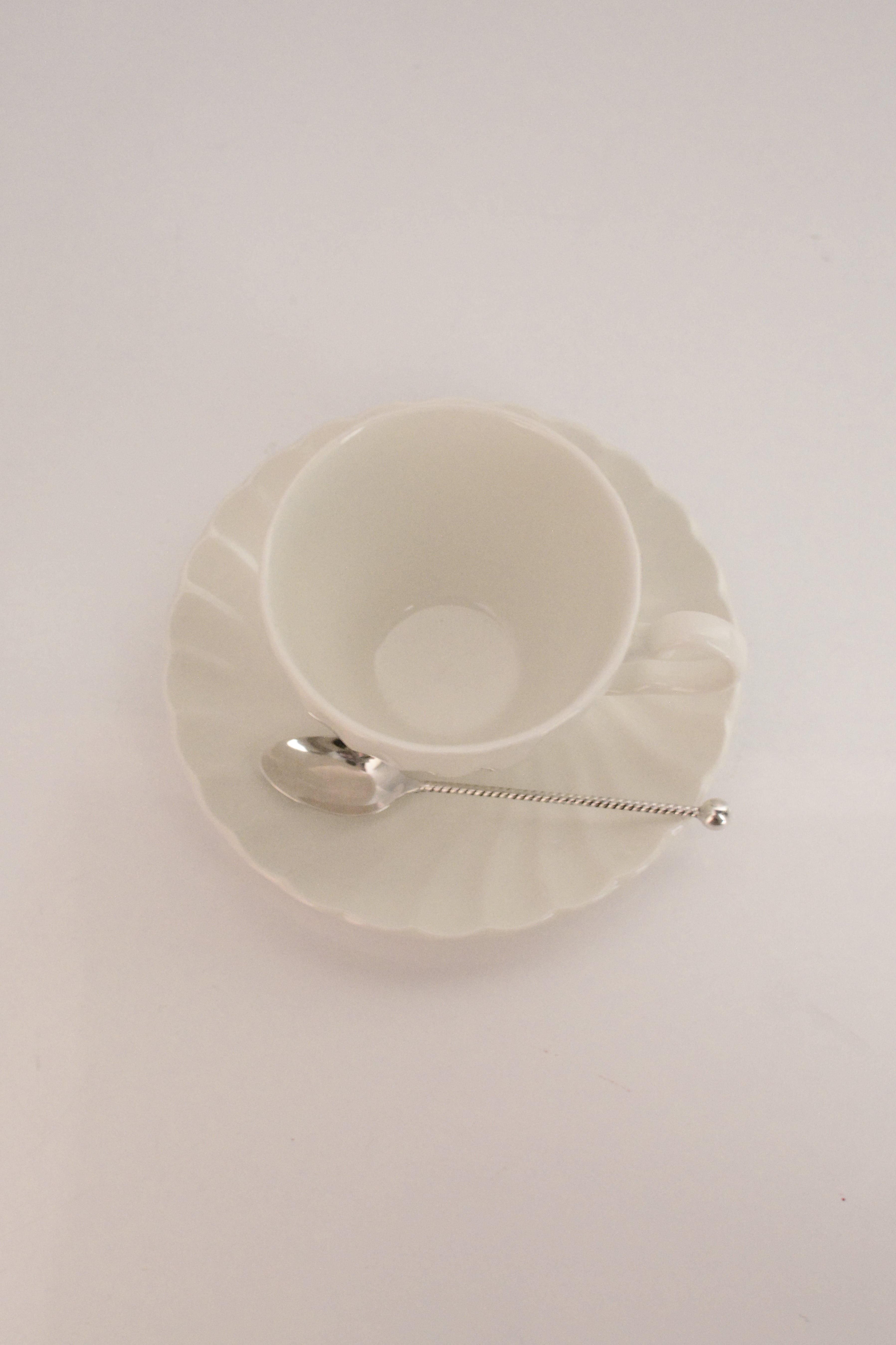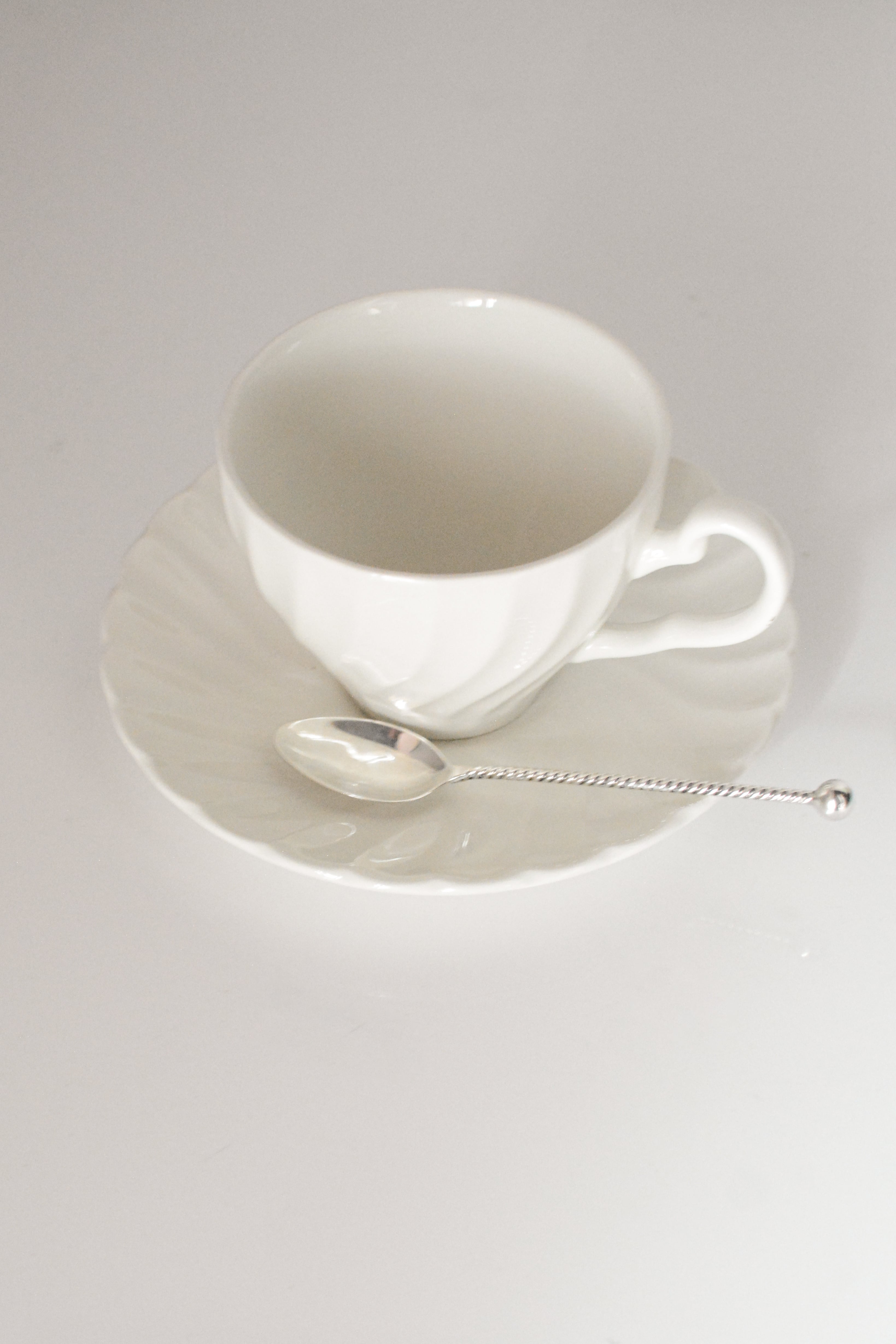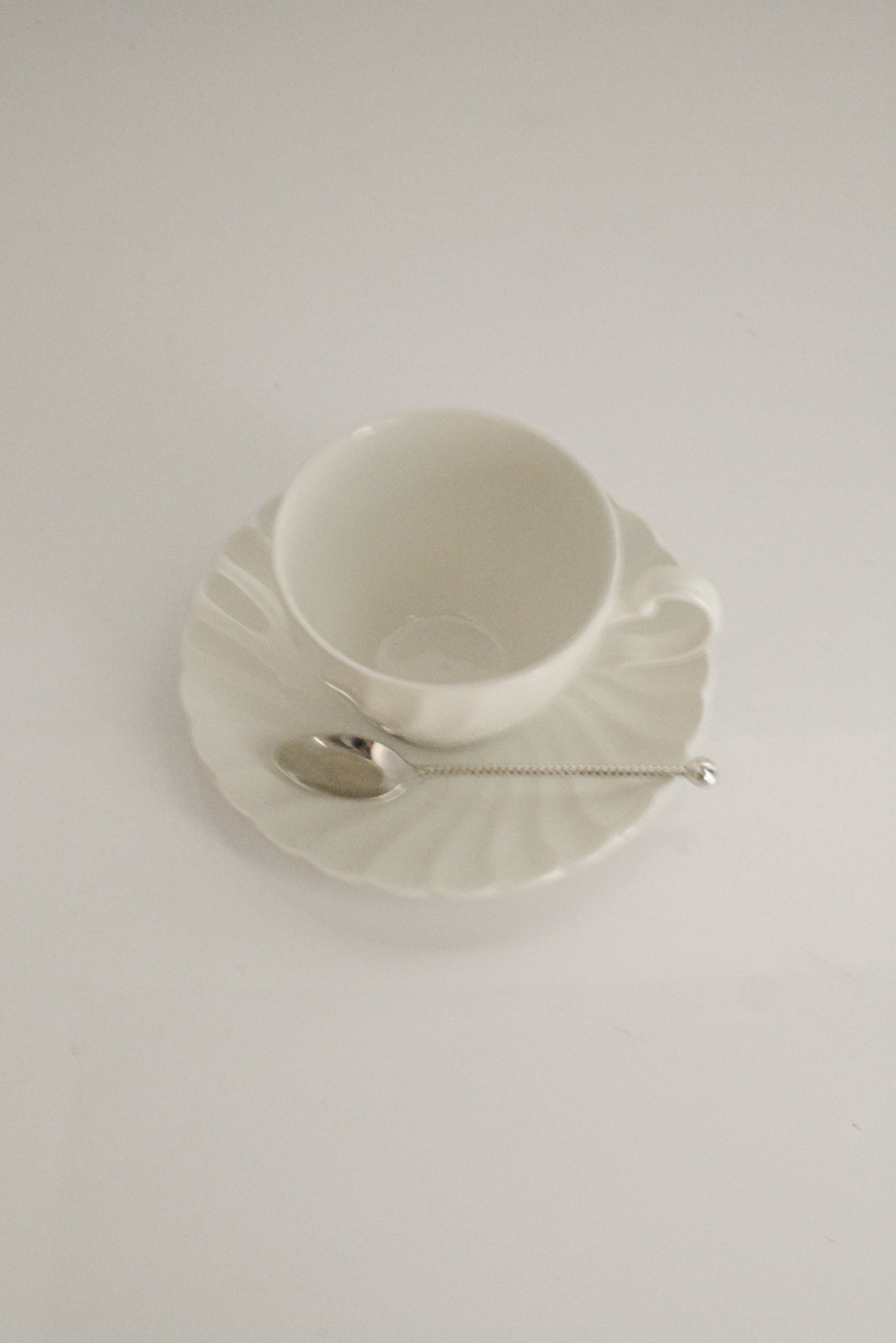 やわらかなアイボリーホワイトの色合いと、ほどよい厚みのあるアイアンストーンならではの安心感のある手触り。カップ側面には控えめなレリーフの陰影が入り、シンプルながらも光の当たり方で表情が変わります。ソーサーの花びらのような緩やかなリムのラインも美しいですね。洗練された佇まいで、主張しすぎず、他の器やカトラリーとも合わせやすいため、テーブルコーディネートのベースとしても◎貫入などヴィンテージならではの落ち着いた風合いをお楽しみください。小傷等ございますがヴィンテージとしては比較的綺麗な状態です。複数在庫ございますので、セレクトしてのお届けとなります。