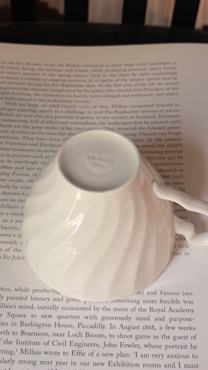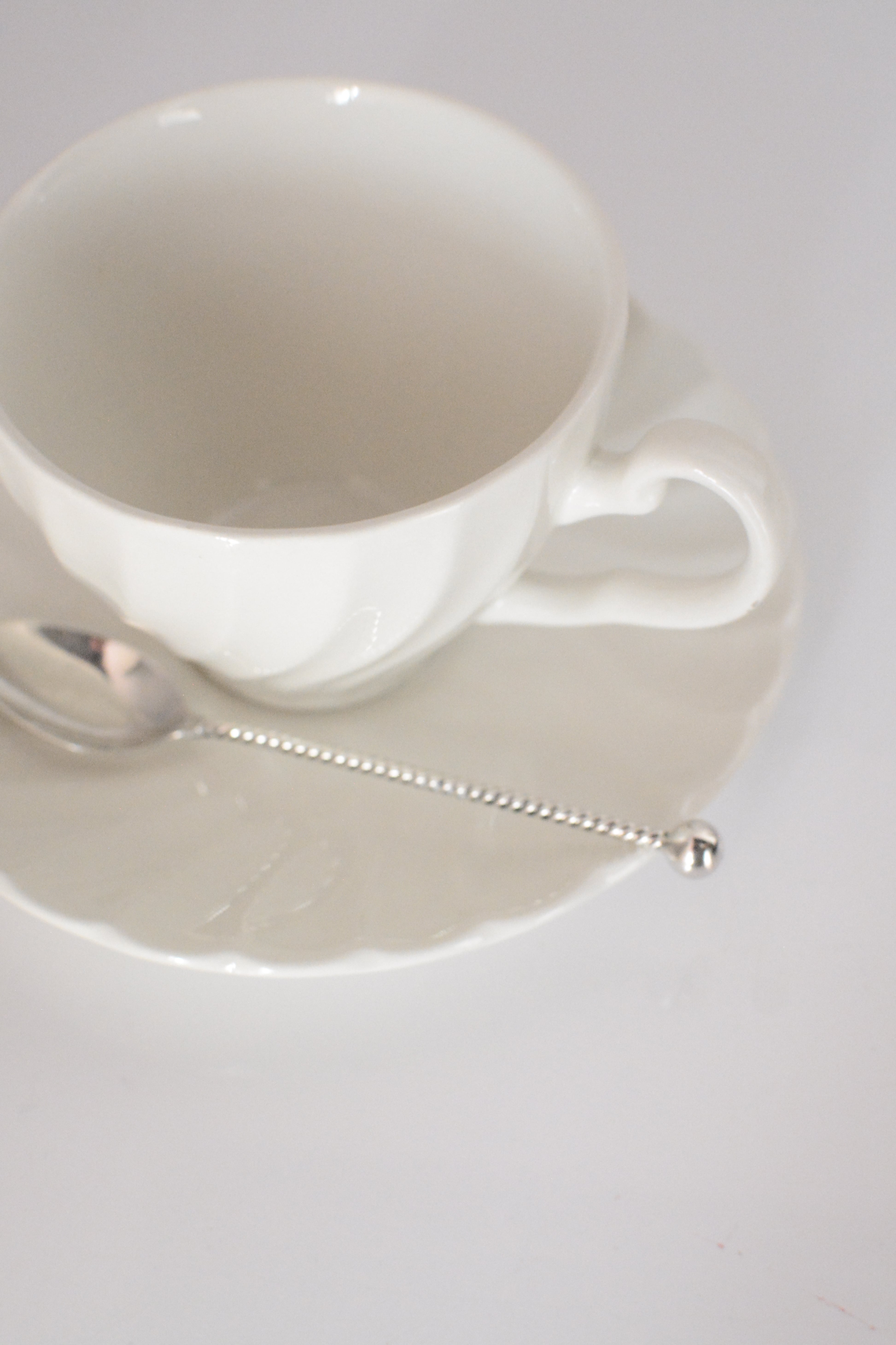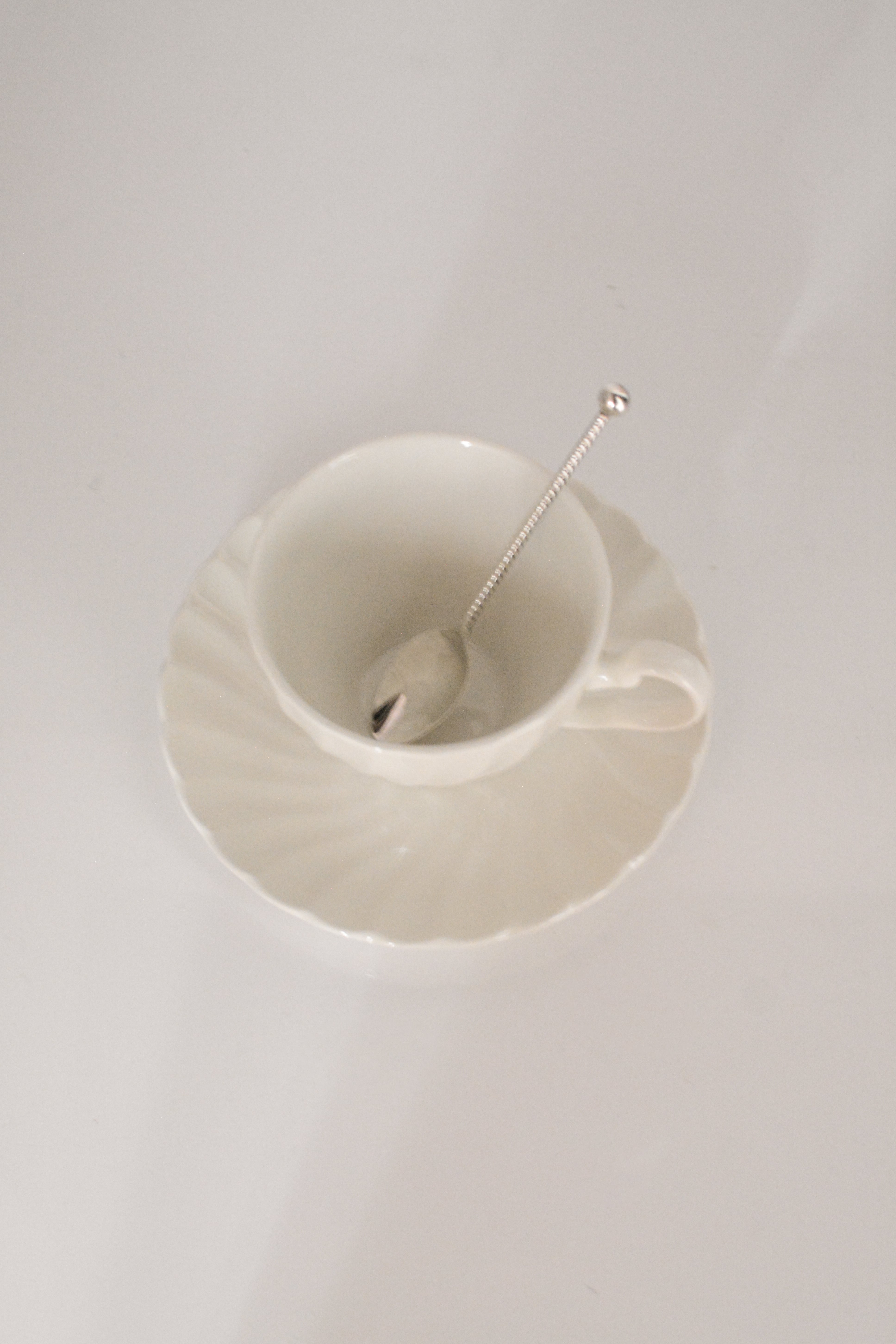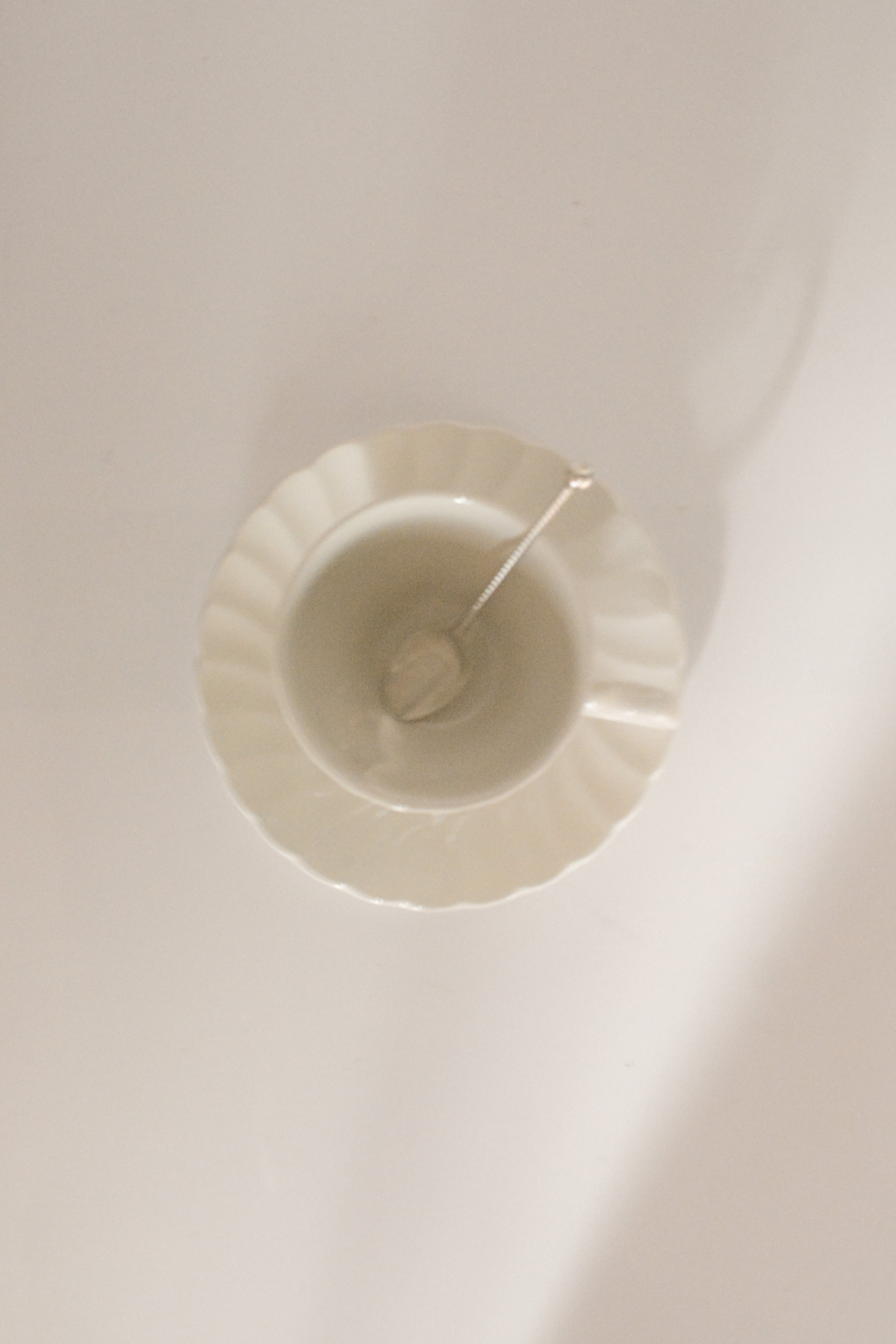 やわらかなアイボリーホワイトの色合いと、ほどよい厚みのあるアイアンストーンならではの安心感のある手触り。カップ側面には控えめなレリーフの陰影が入り、シンプルながらも光の当たり方で表情が変わります。ソーサーの花びらのような緩やかなリムのラインも美しいですね。洗練された佇まいで、主張しすぎず、他の器やカトラリーとも合わせやすいため、テーブルコーディネートのベースとしても◎貫入などヴィンテージならではの落ち着いた風合いをお楽しみください。小傷等ございますがヴィンテージとしては比較的綺麗な状態です。複数在庫ございますので、セレクトしてのお届けとなります。