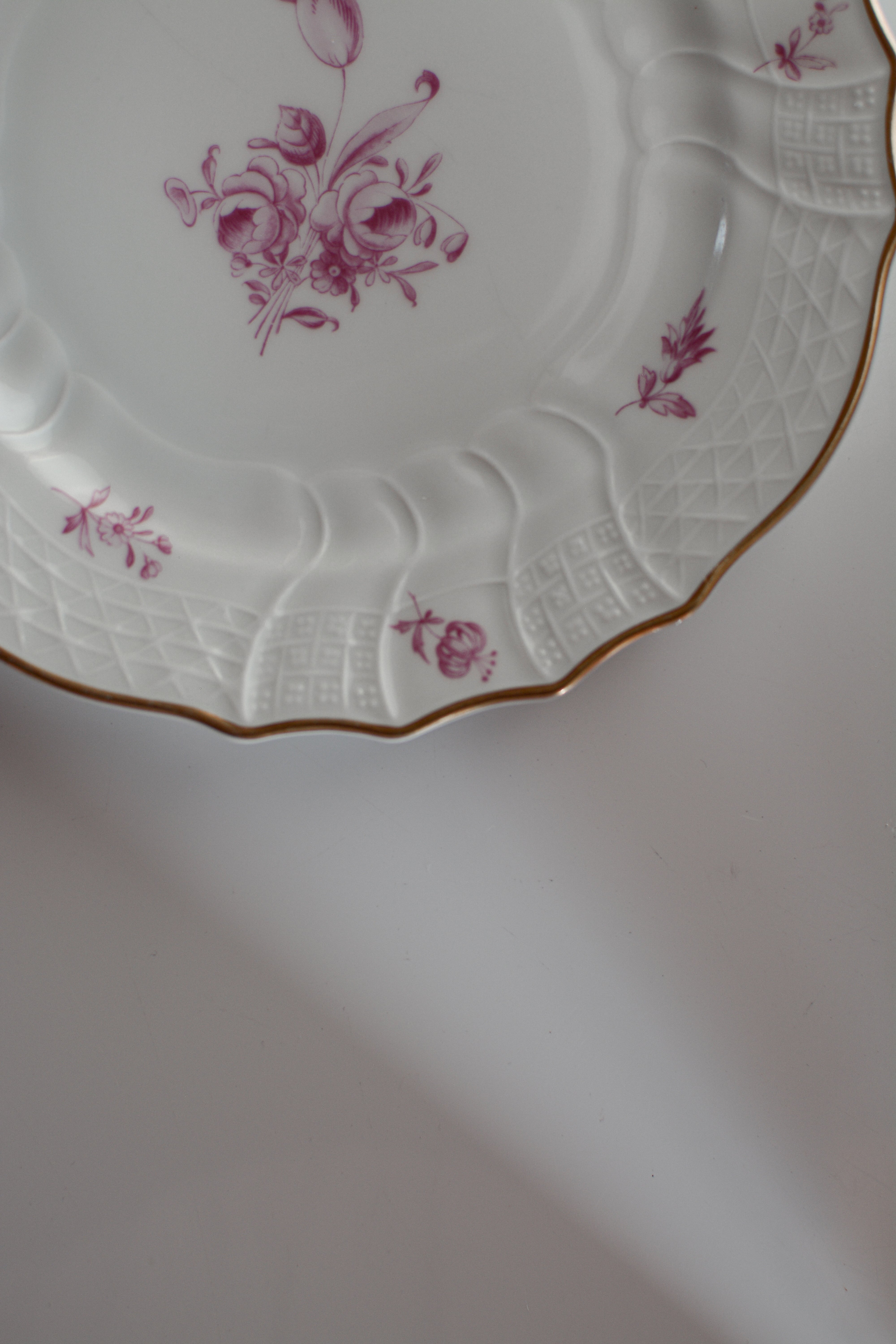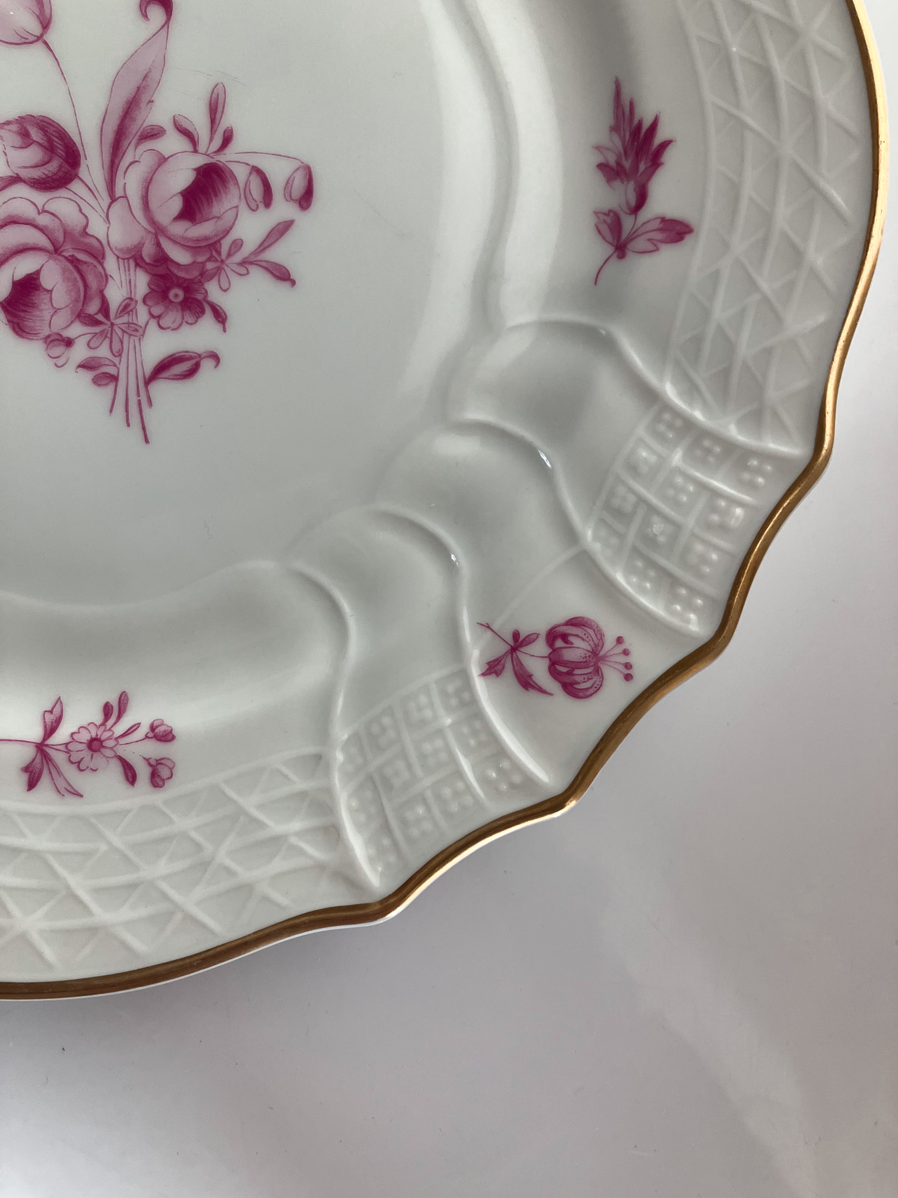 リムのレリーフが特徴的なHutschenreuther社のプレート。艶のある白磁に絶妙な色味のピンクの絵柄、とても美しい一枚です。経年変化による個体ごとの色味が少し異なりますので、お好みの一枚をお選び下さい。小傷等ございますが、比較的綺麗な状態です。(詳細写真7〜10)